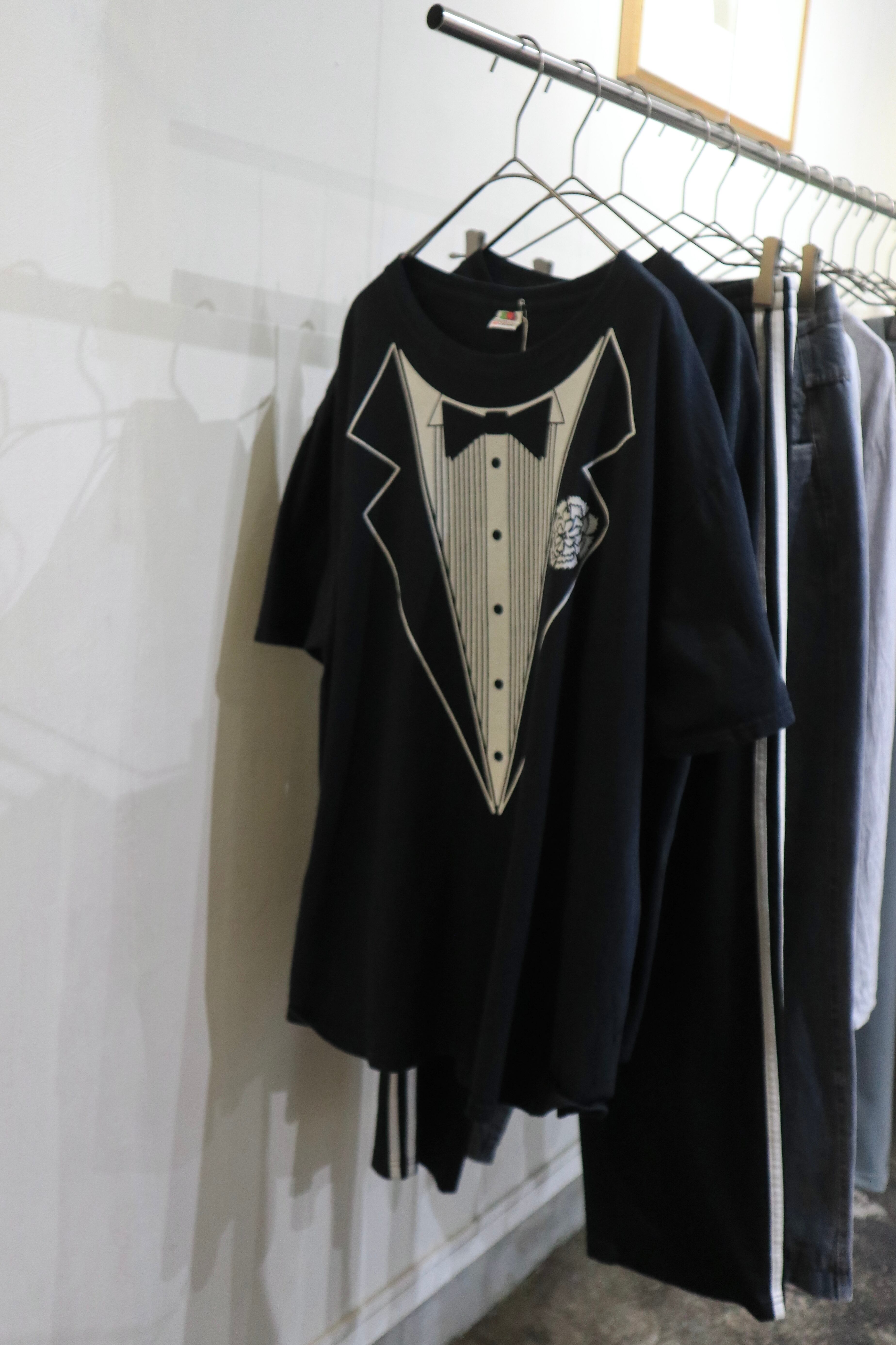 フロントにタキシード風のプリントが施されたTシャツ