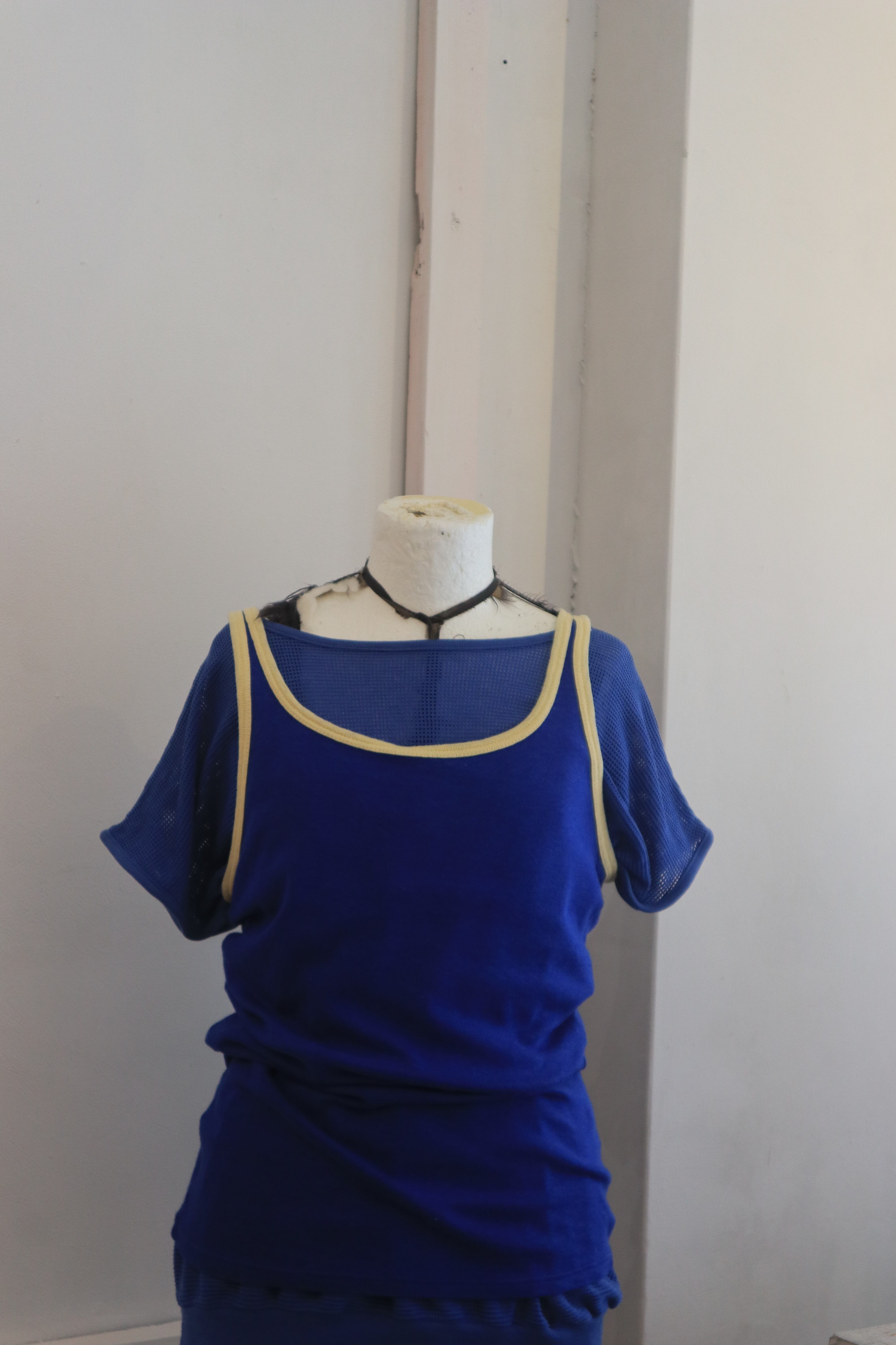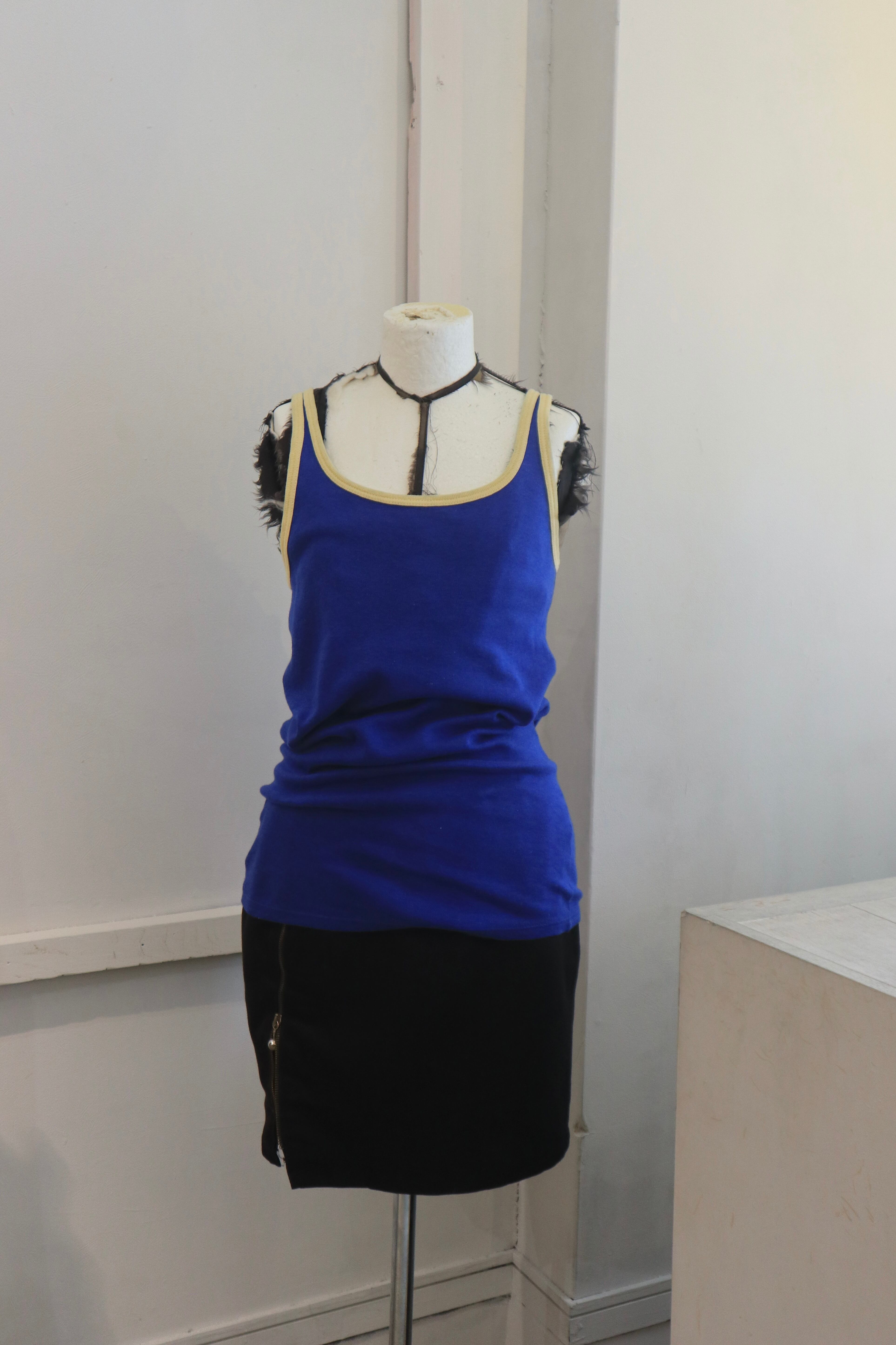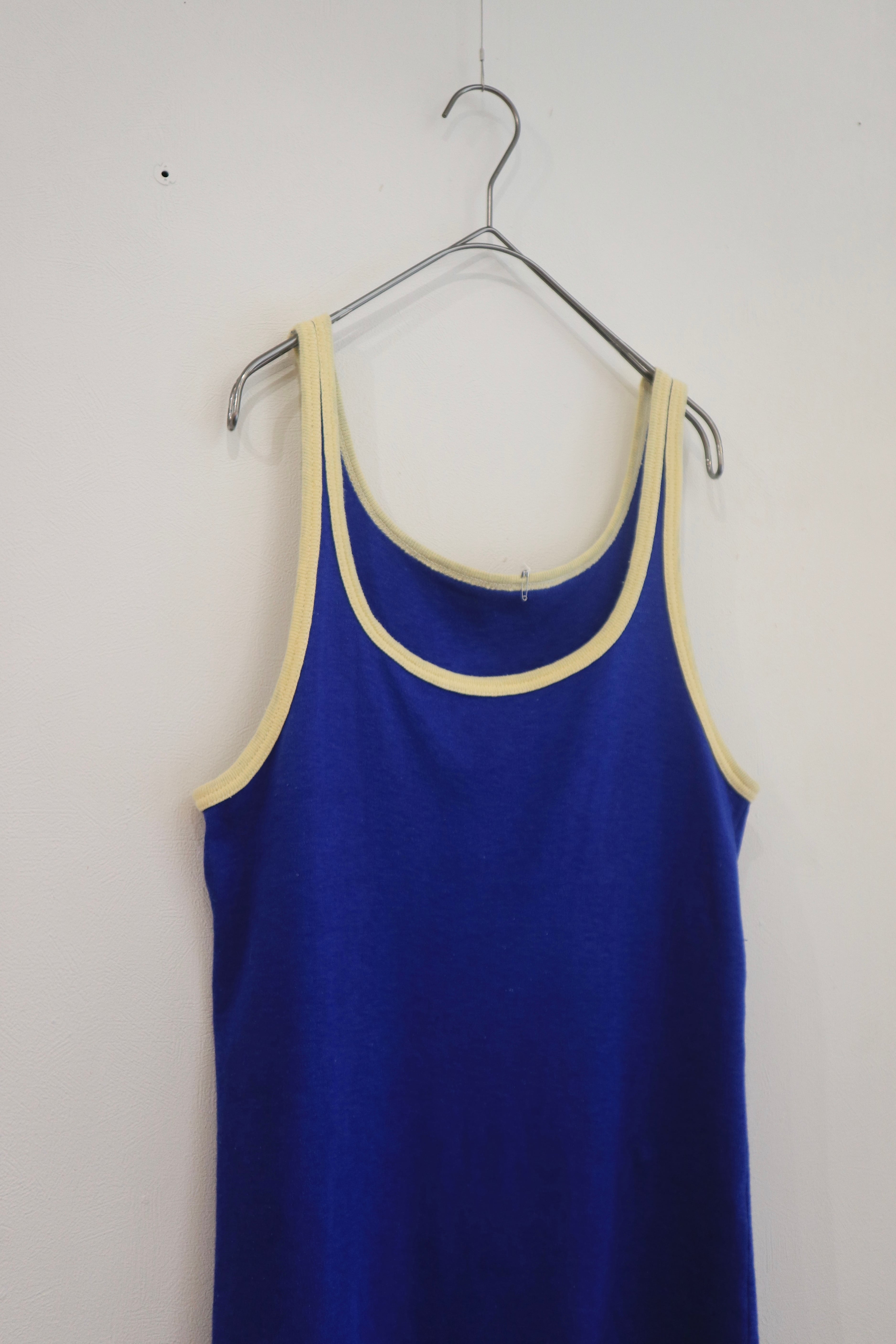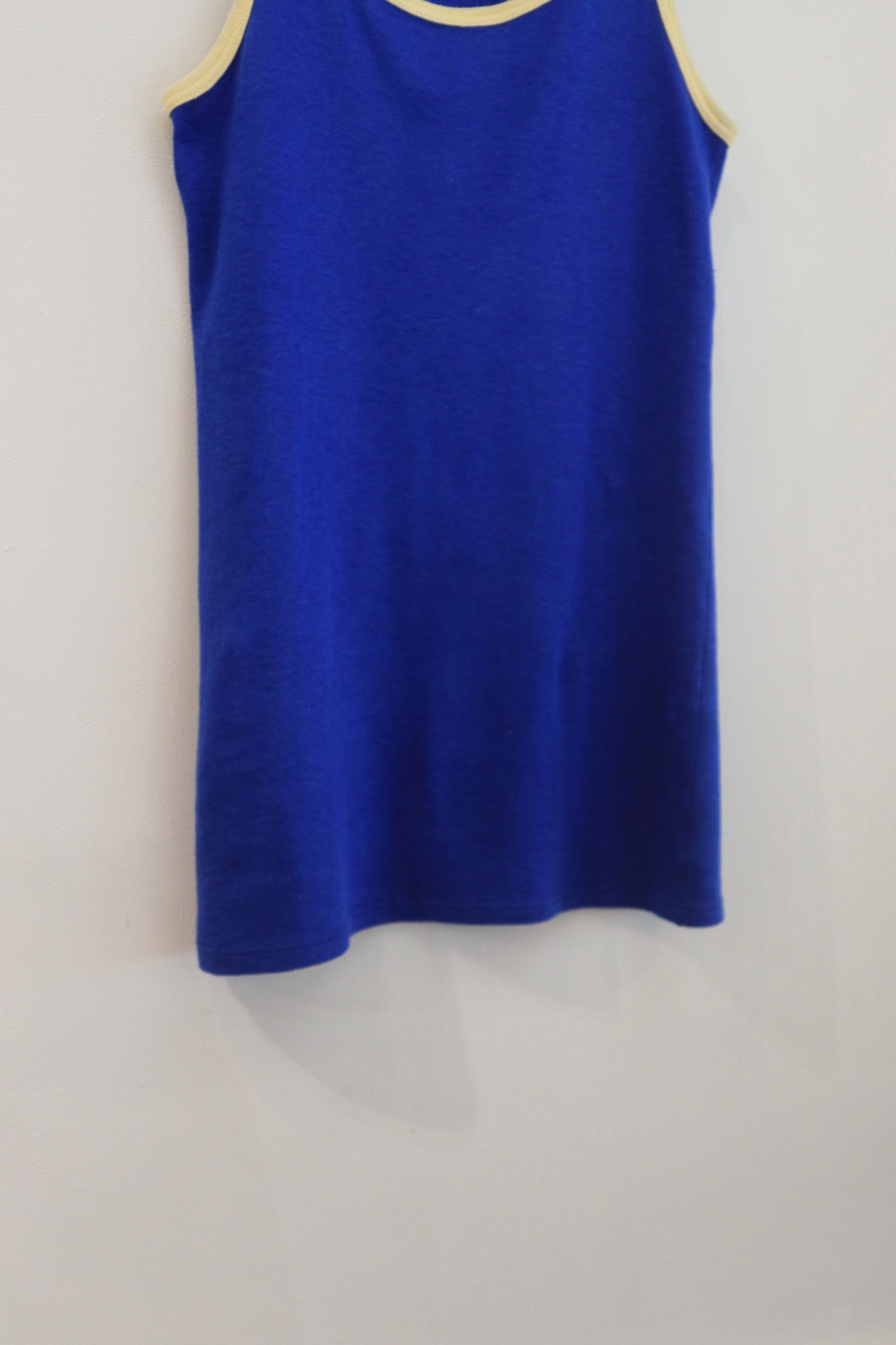 ぱっと目を惹く、ロイヤルブルーと淡いイエローのレトロスポーティなデザインのタンクトップ