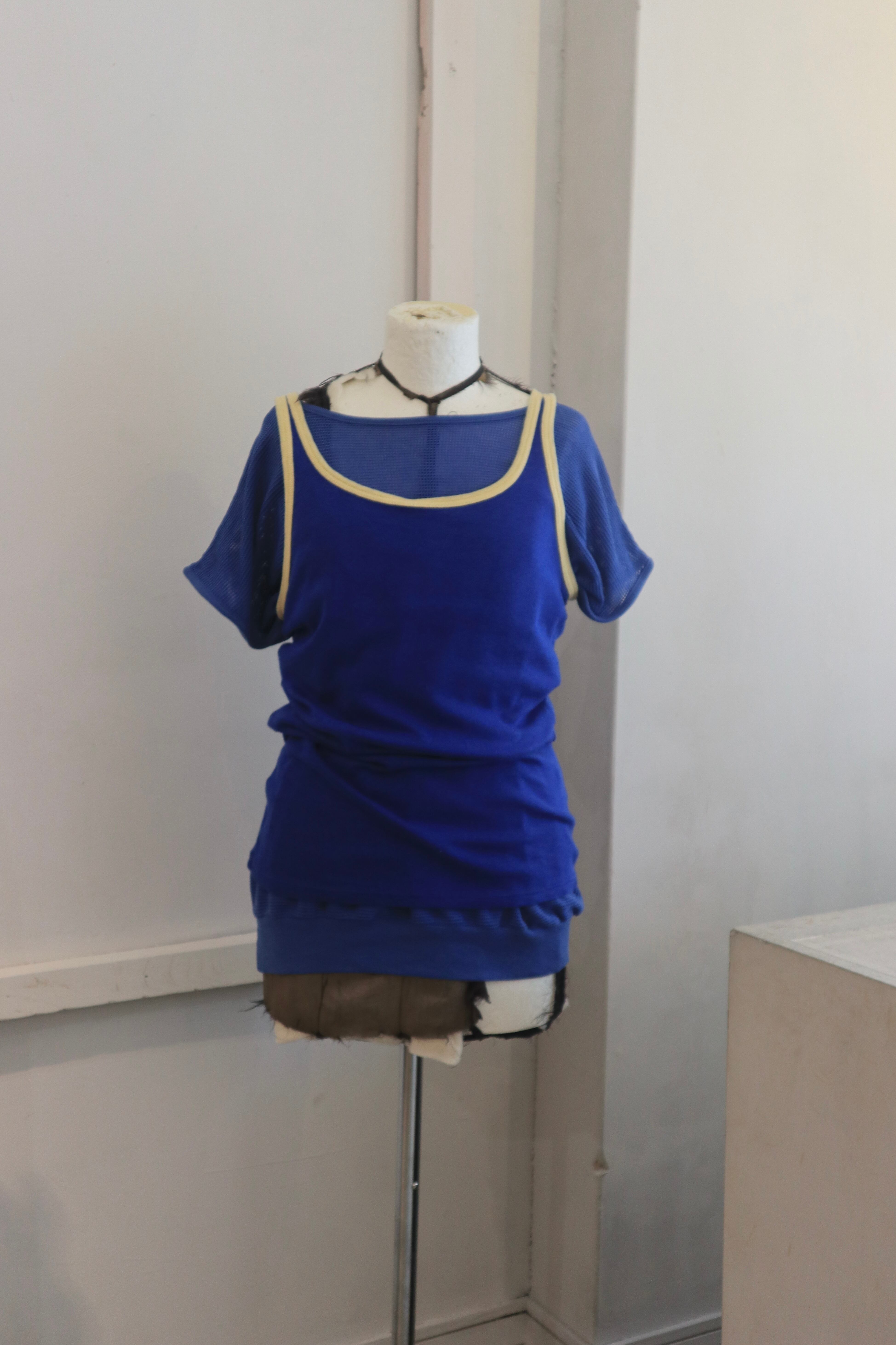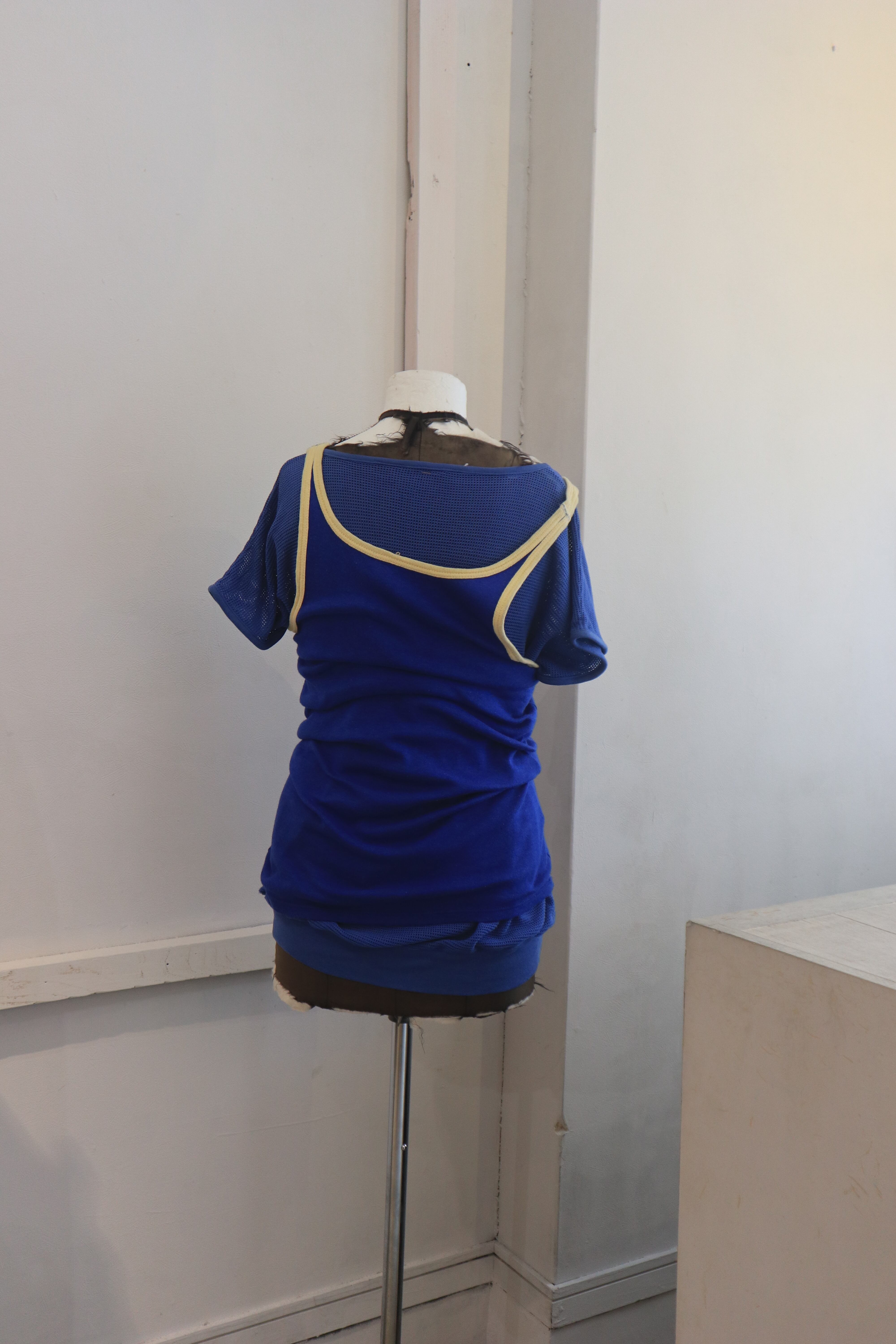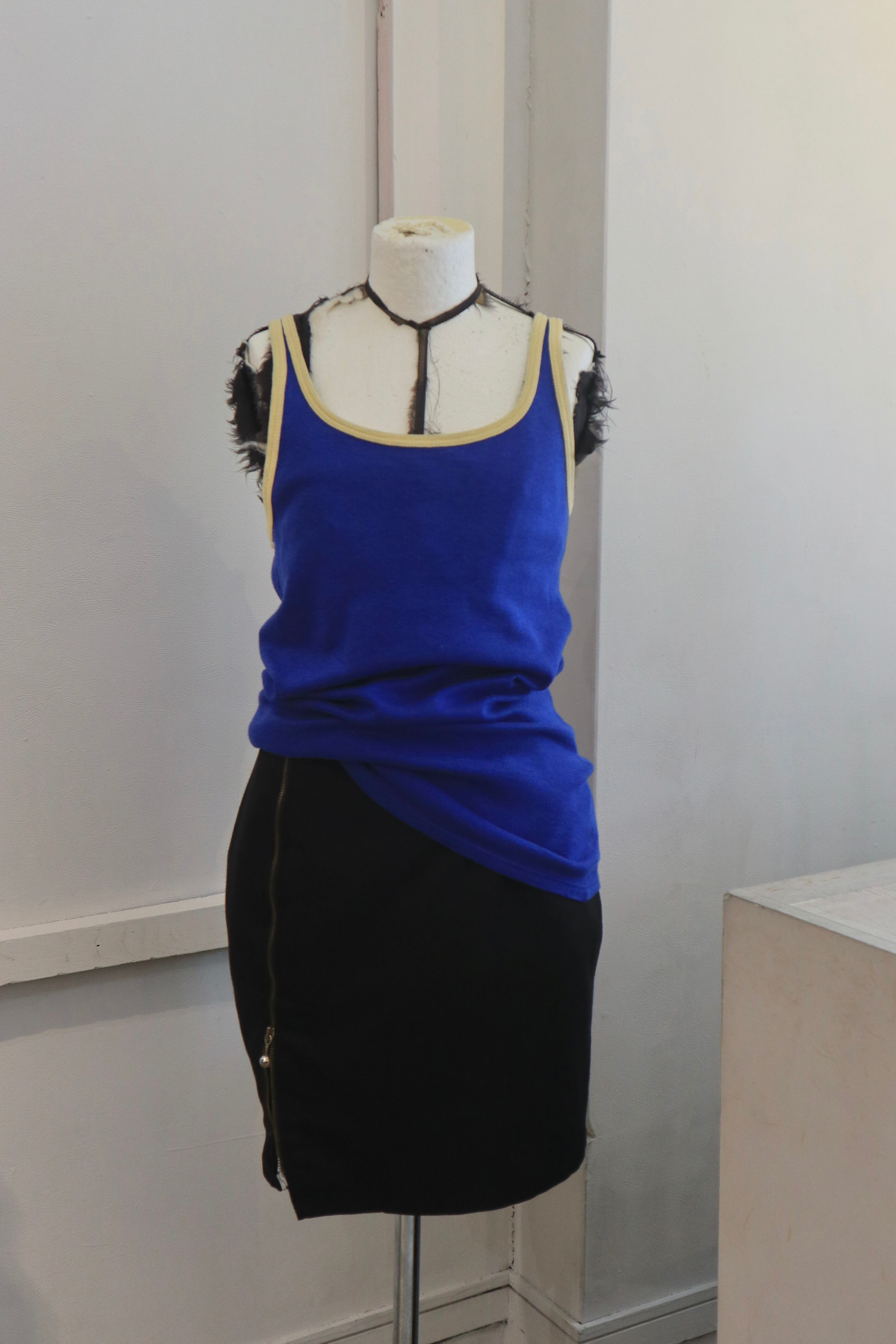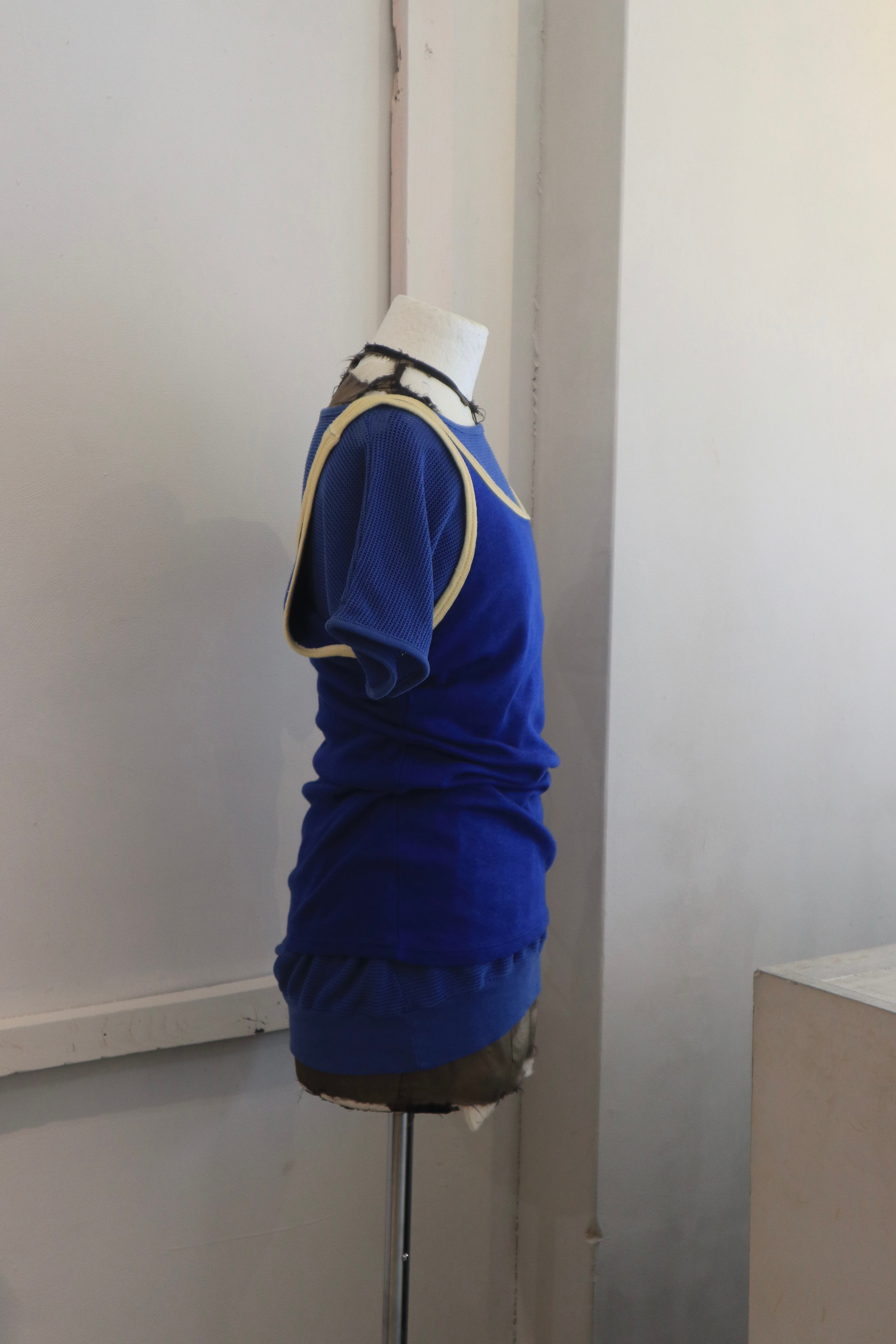 ぱっと目を惹く、ロイヤルブルーと淡いイエローのレトロスポーティなデザインのタンクトップ