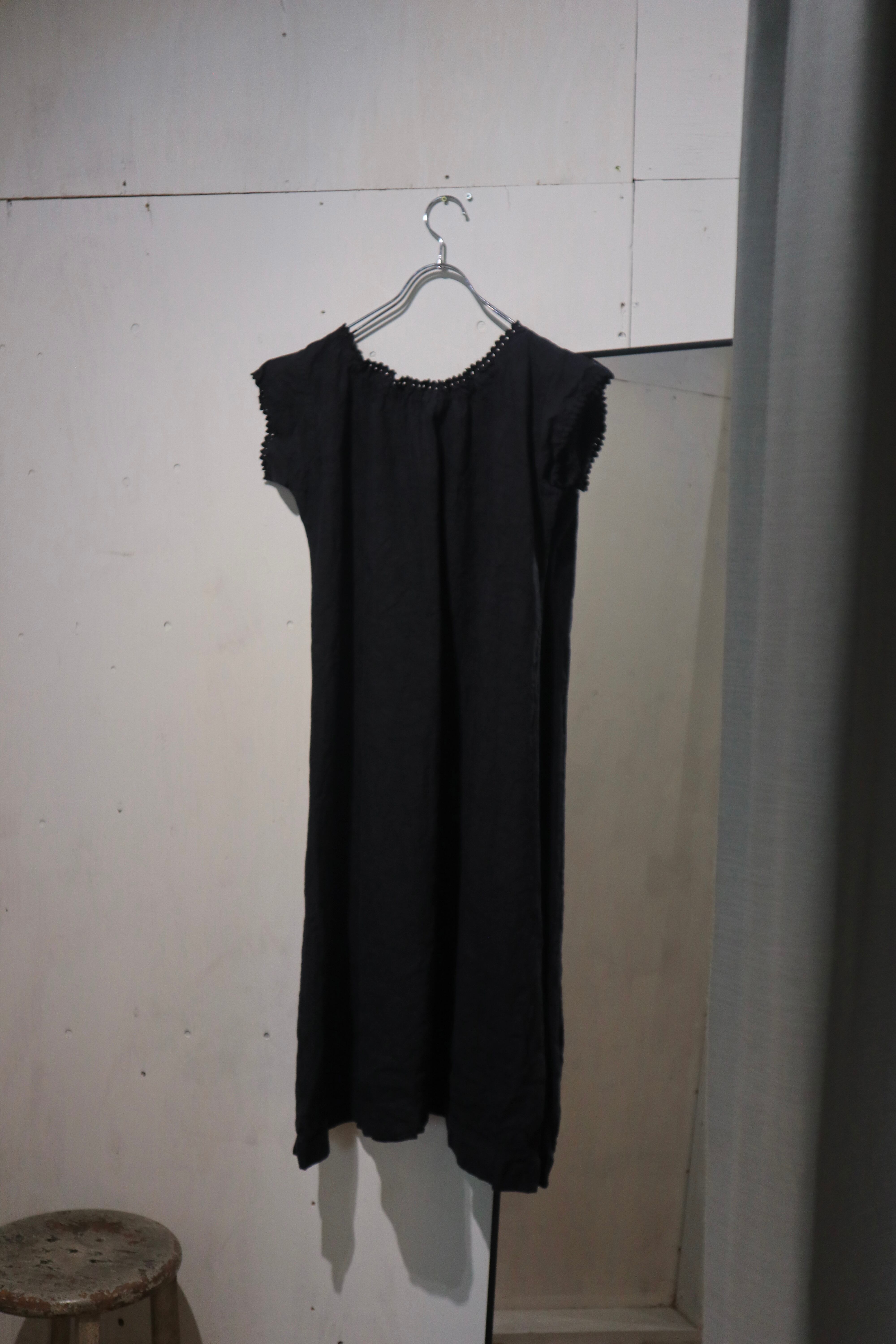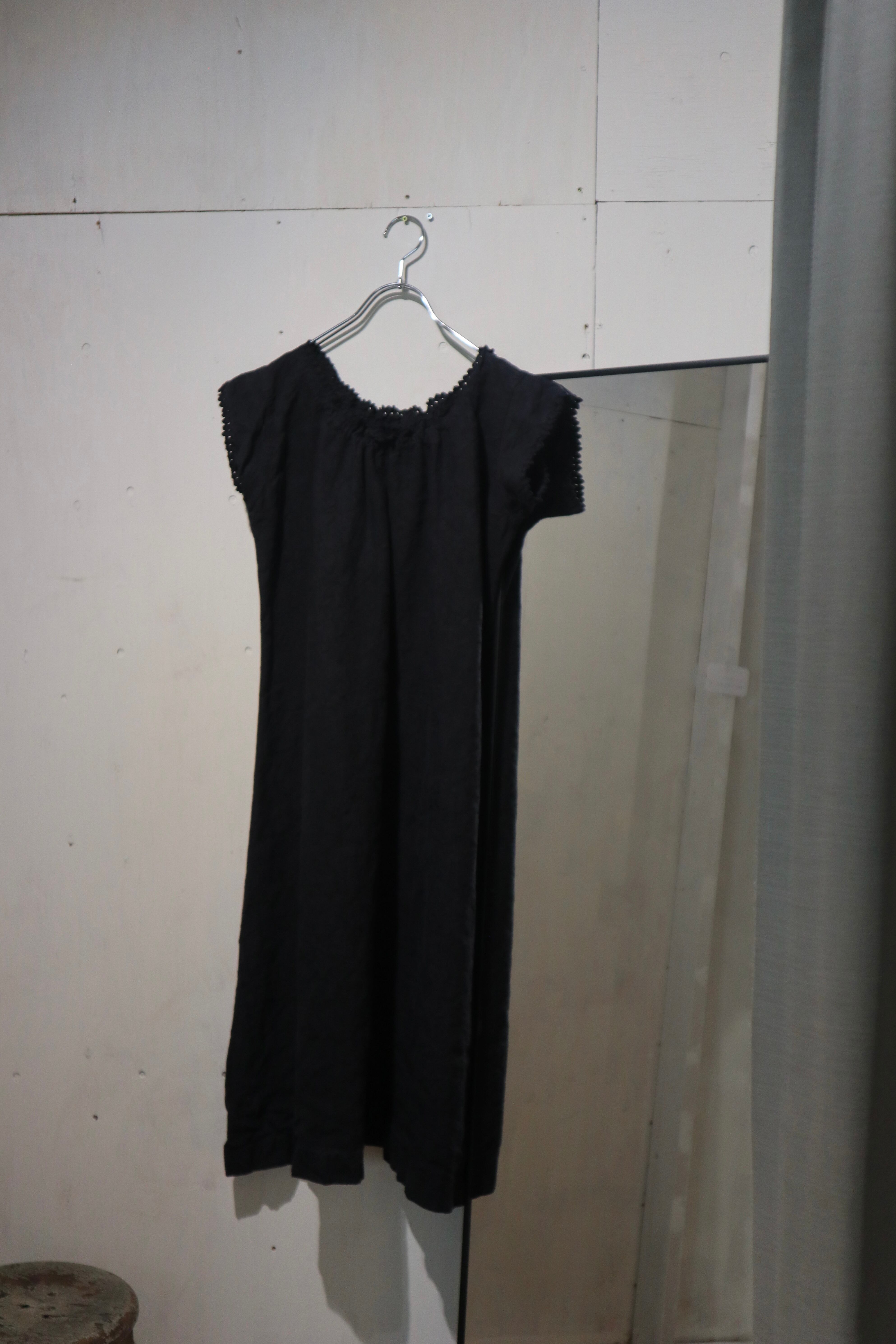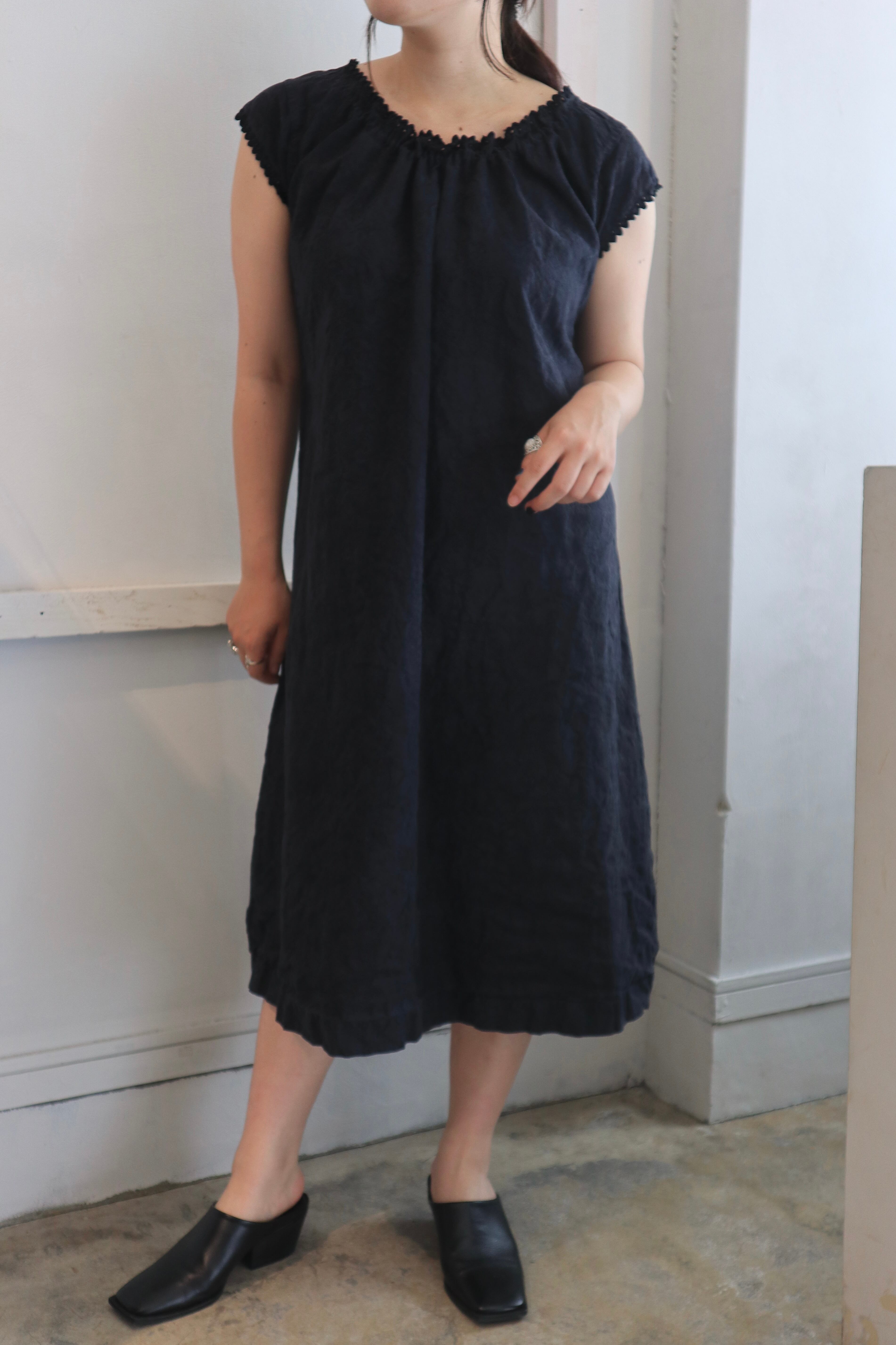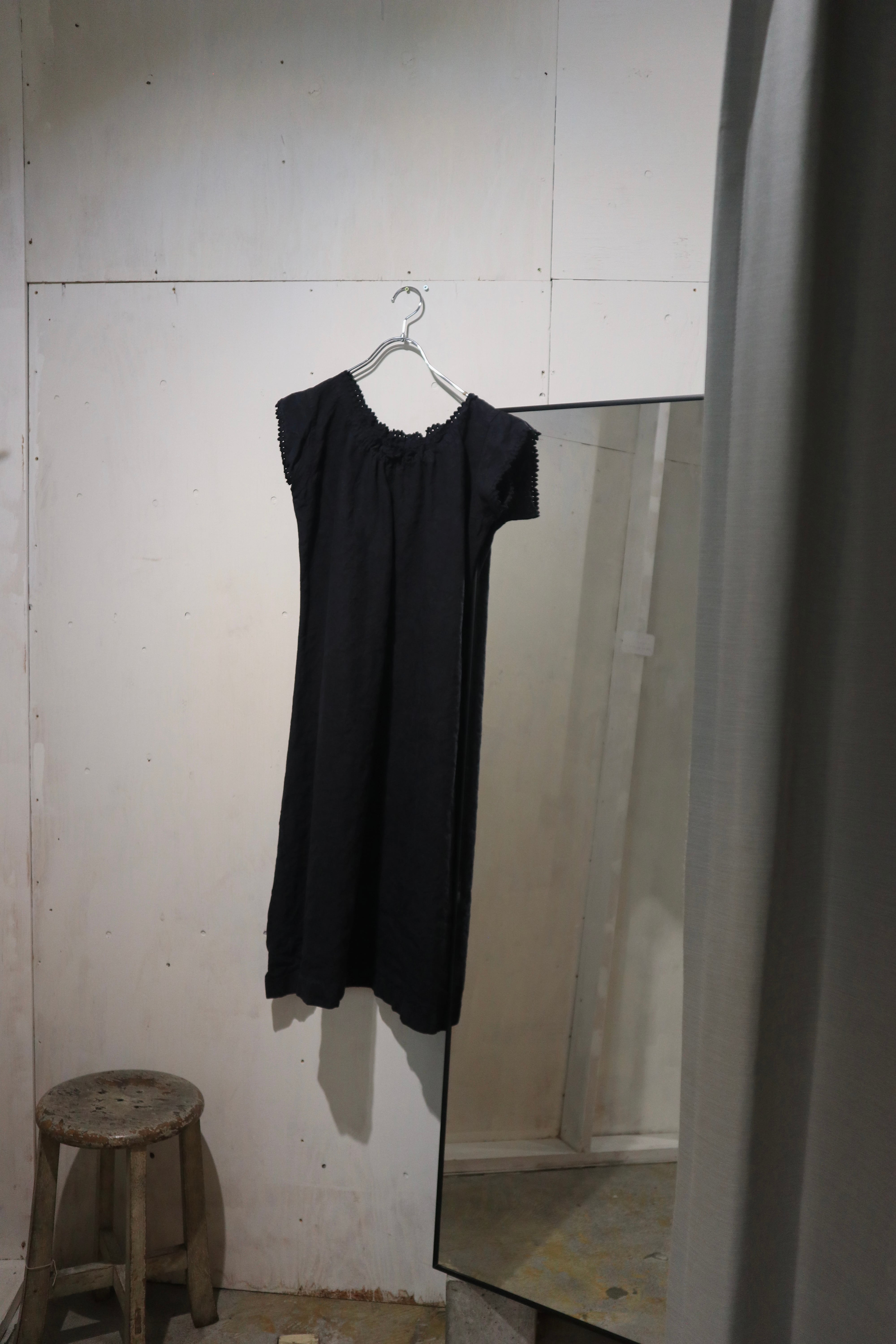 細やかなギャザーが寄せられたネックラインが印象的な、アンティークリネンワンピース。