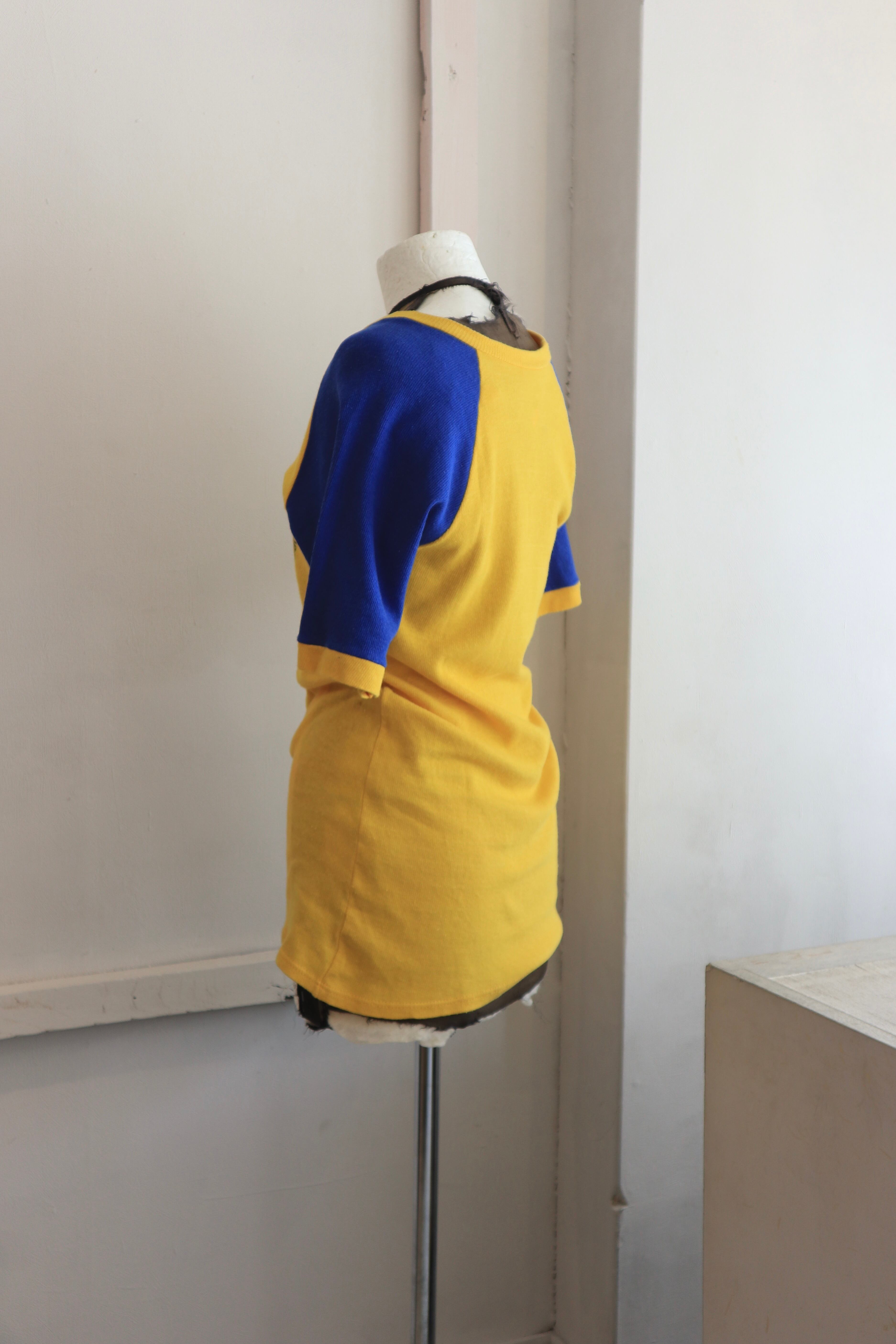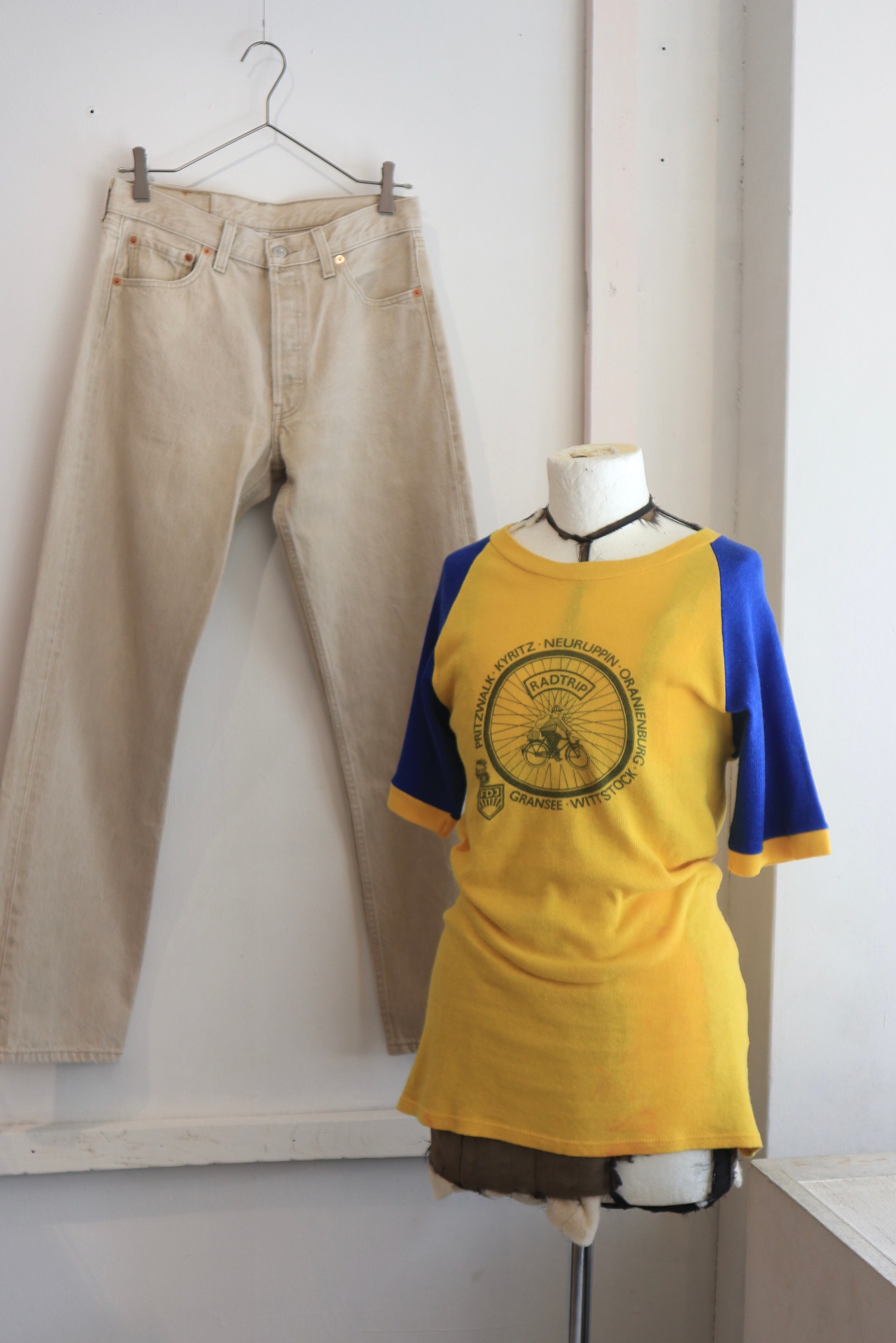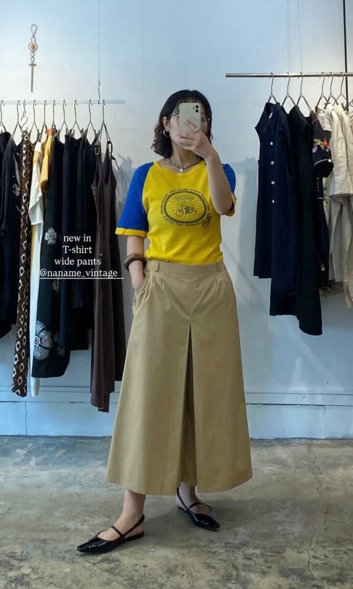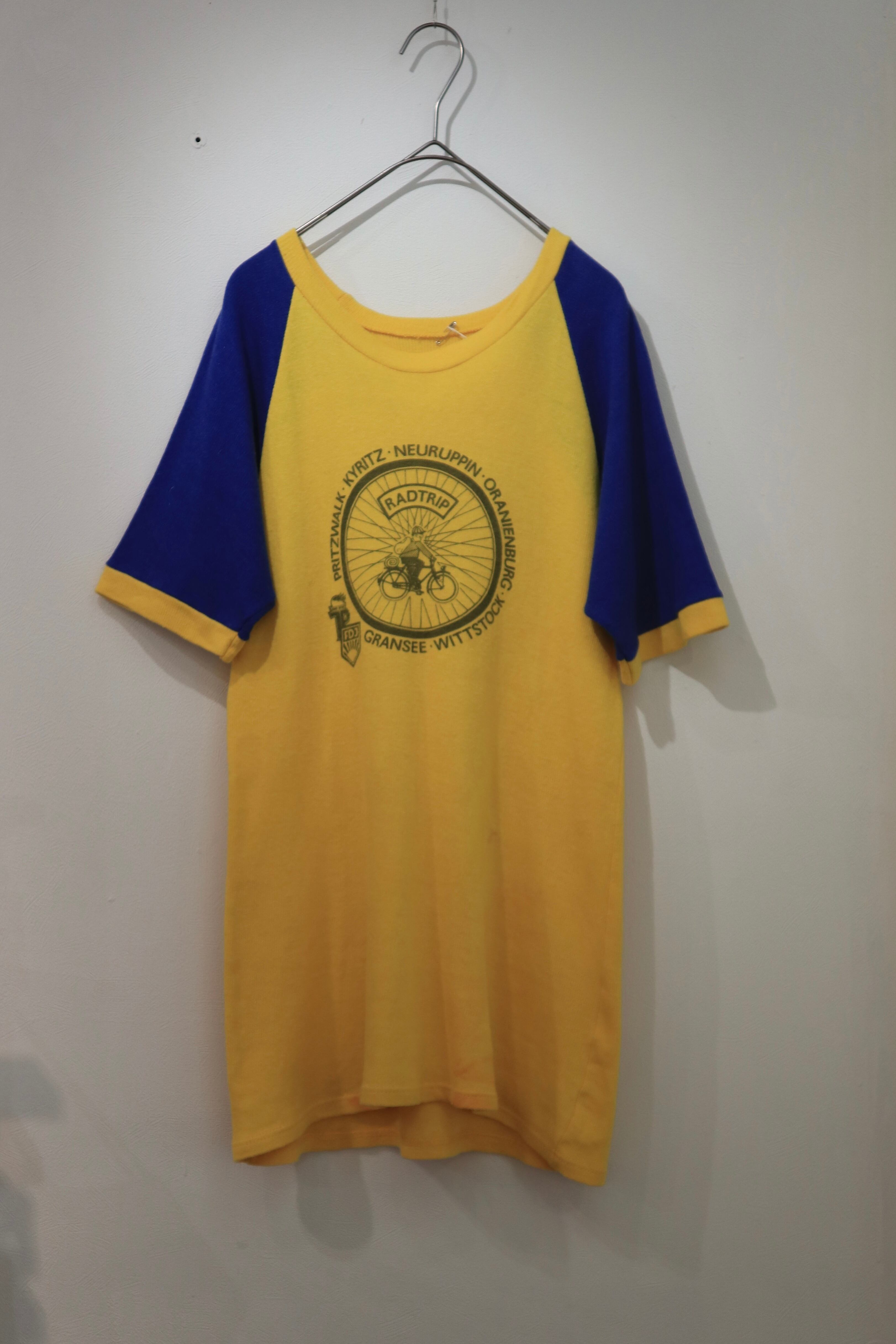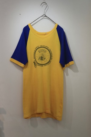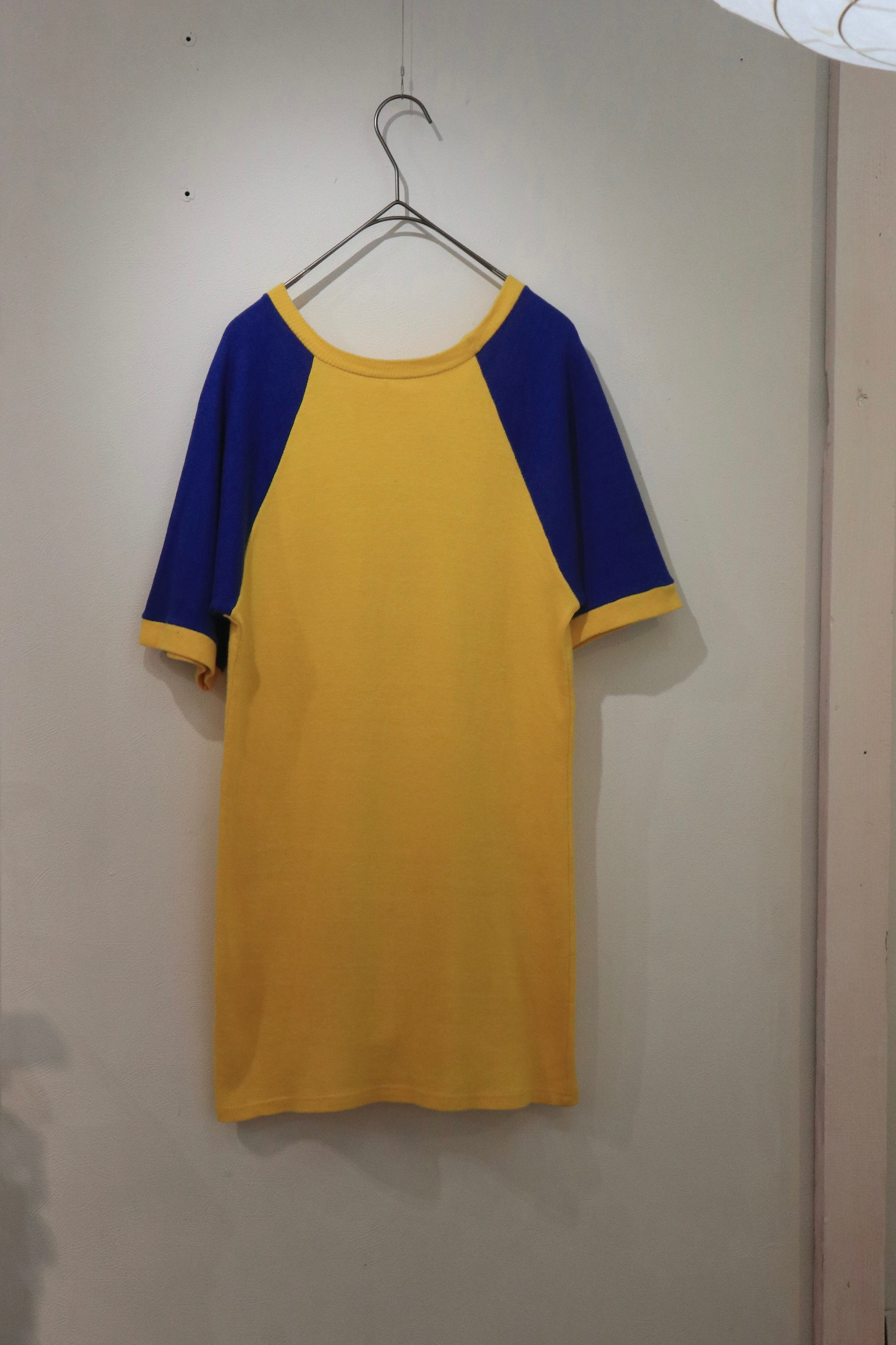 イエローのボディとブルーのラグランスリーブが特徴的なTシャツ