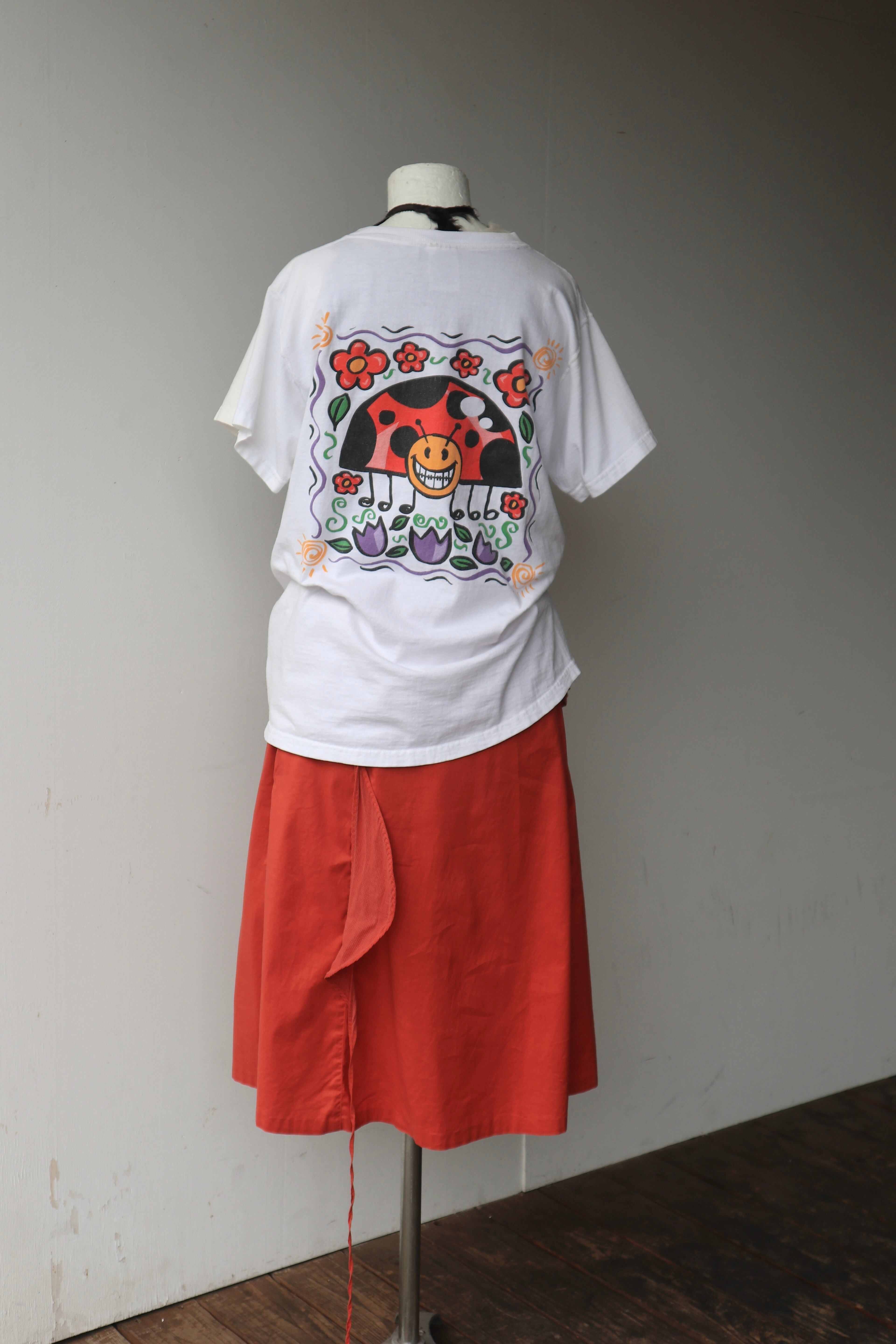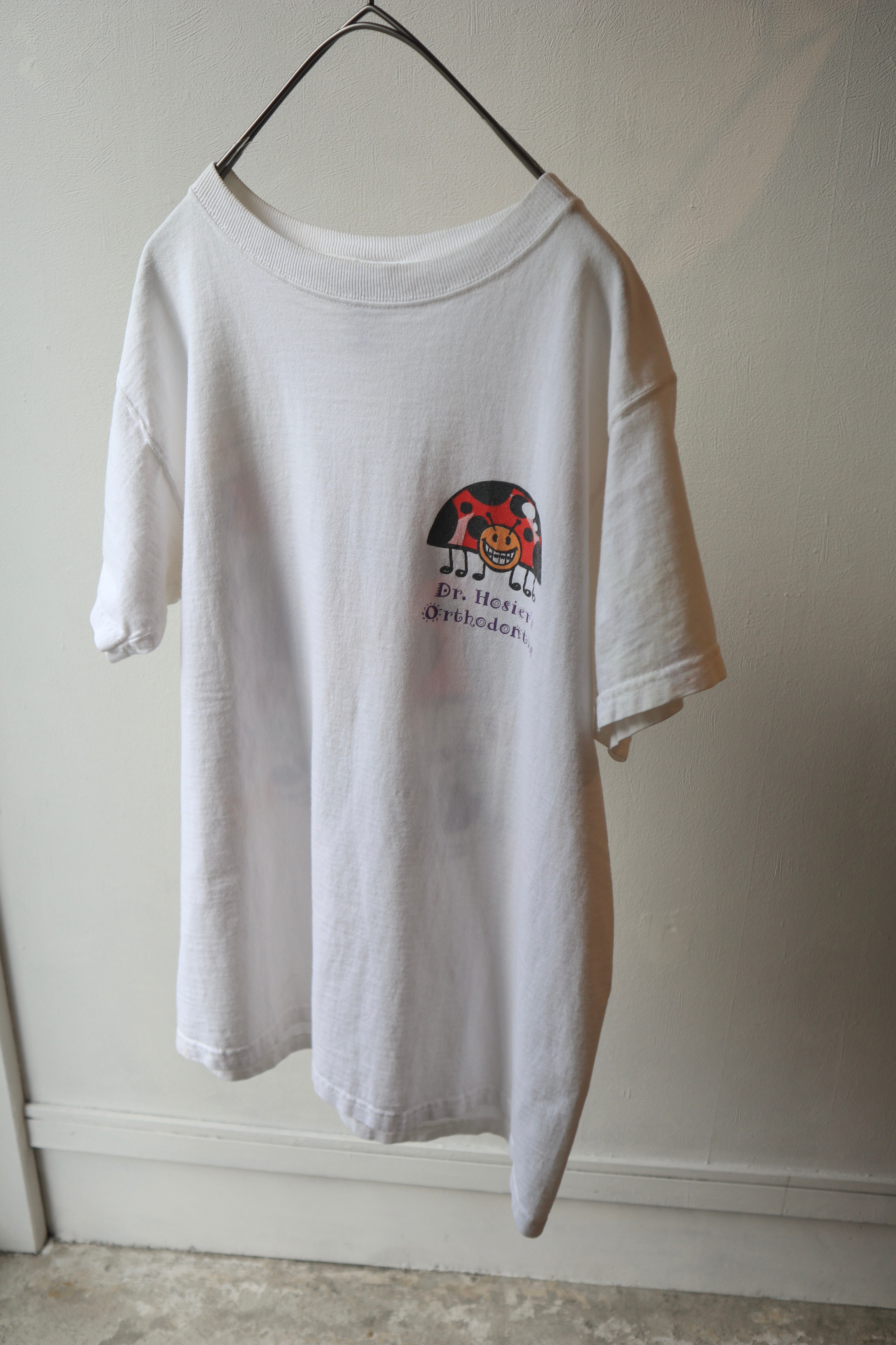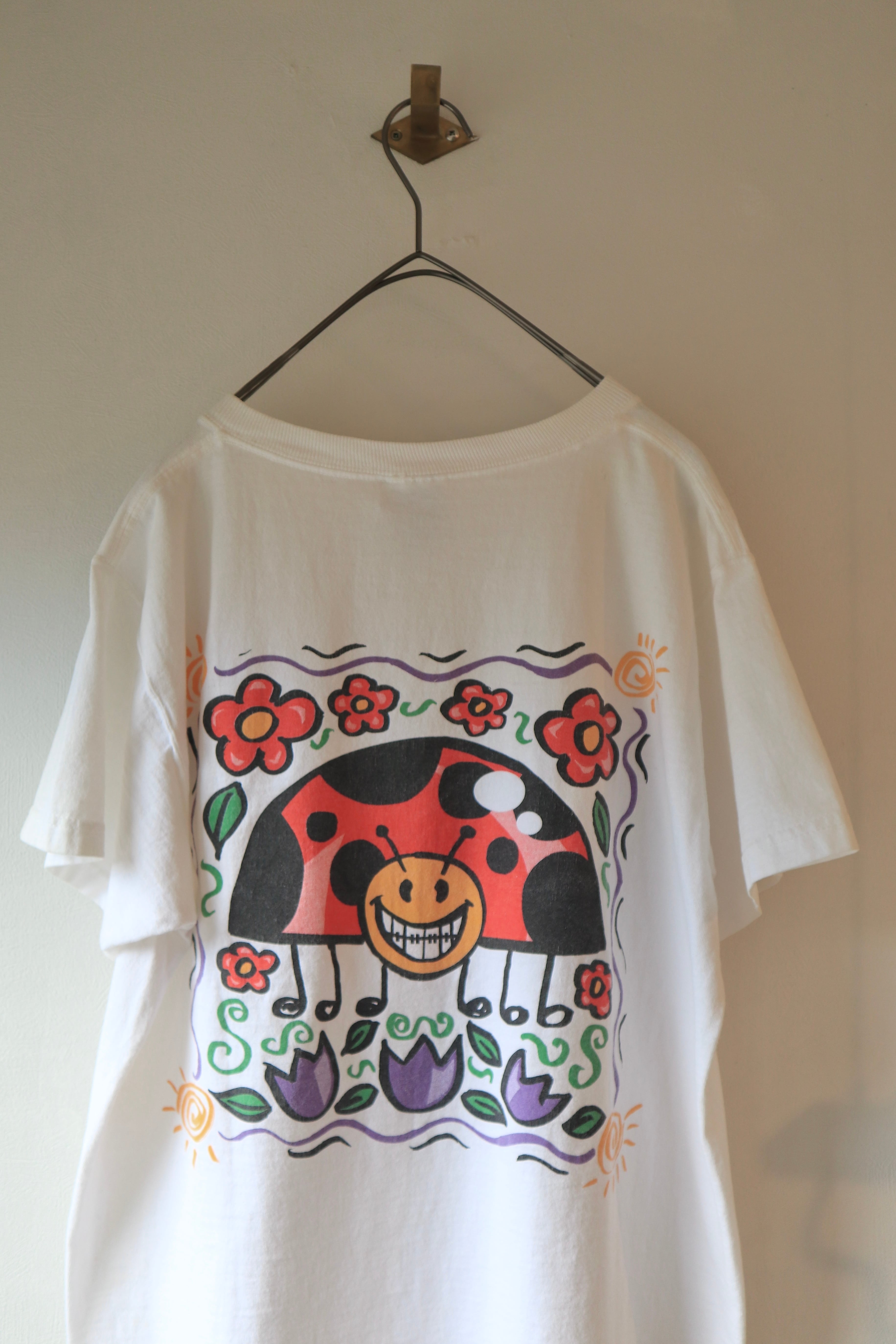 グラフィカルに描かれた歯科矯正をしているてんとう虫と花々が印象的な両面プリントTシャツ