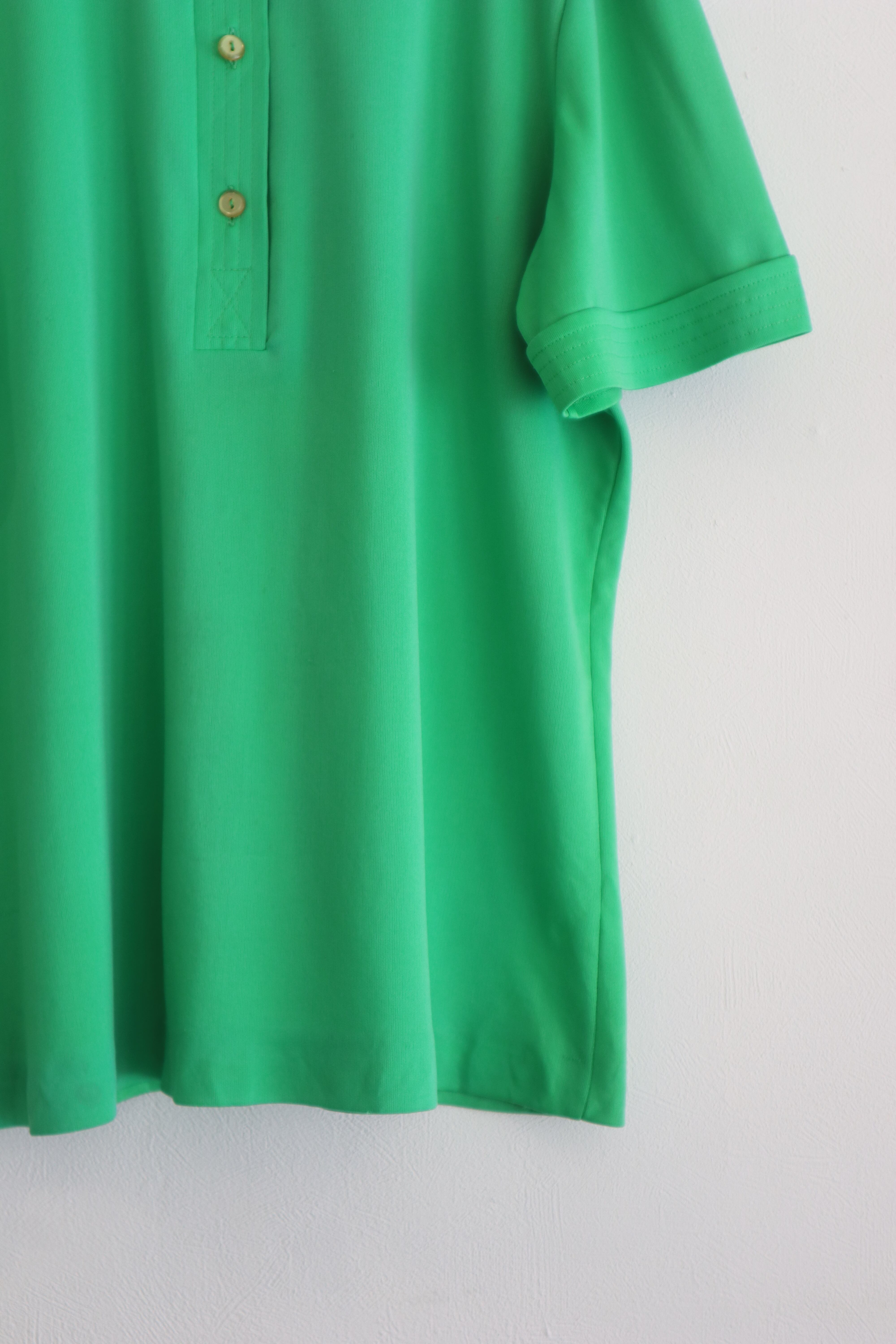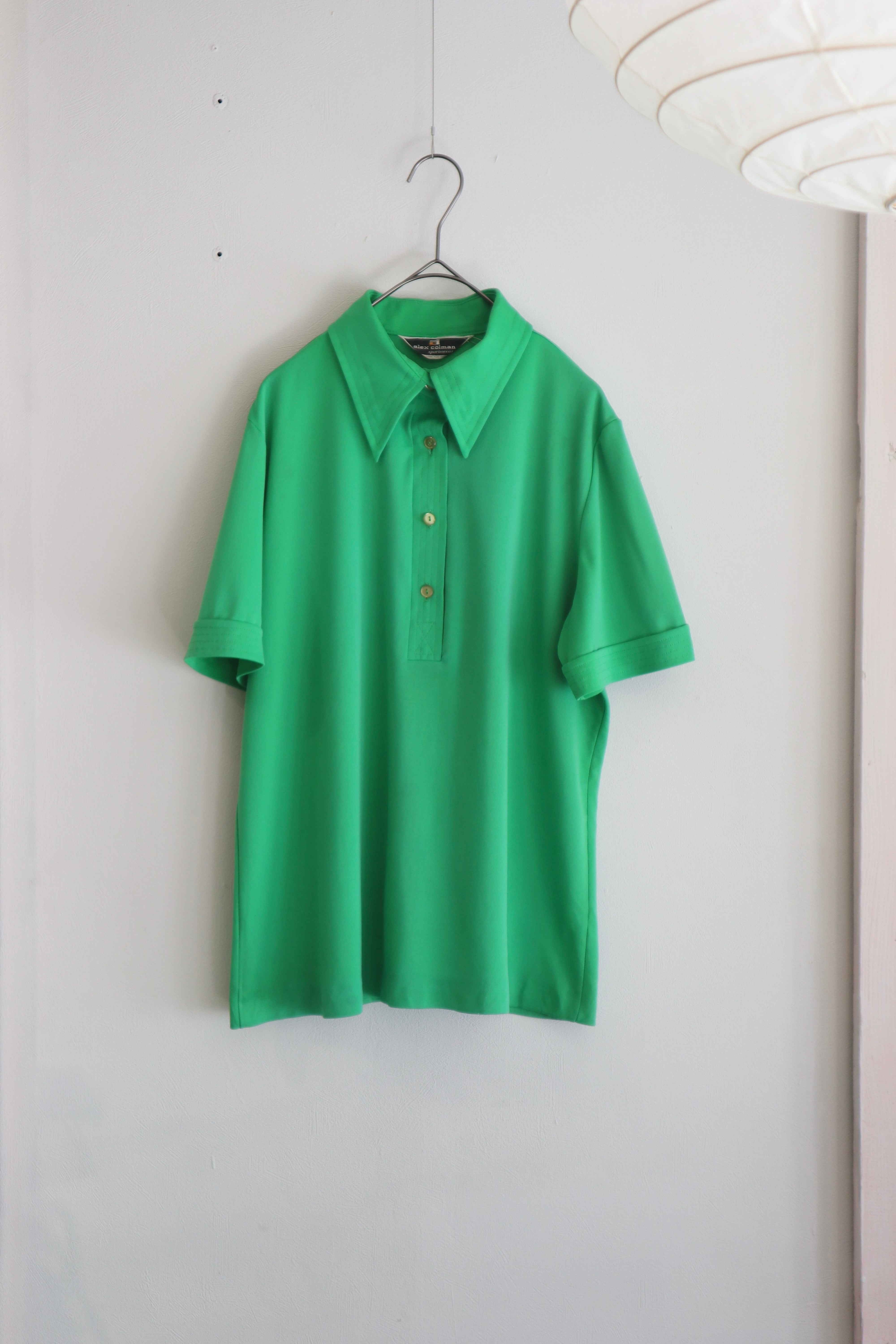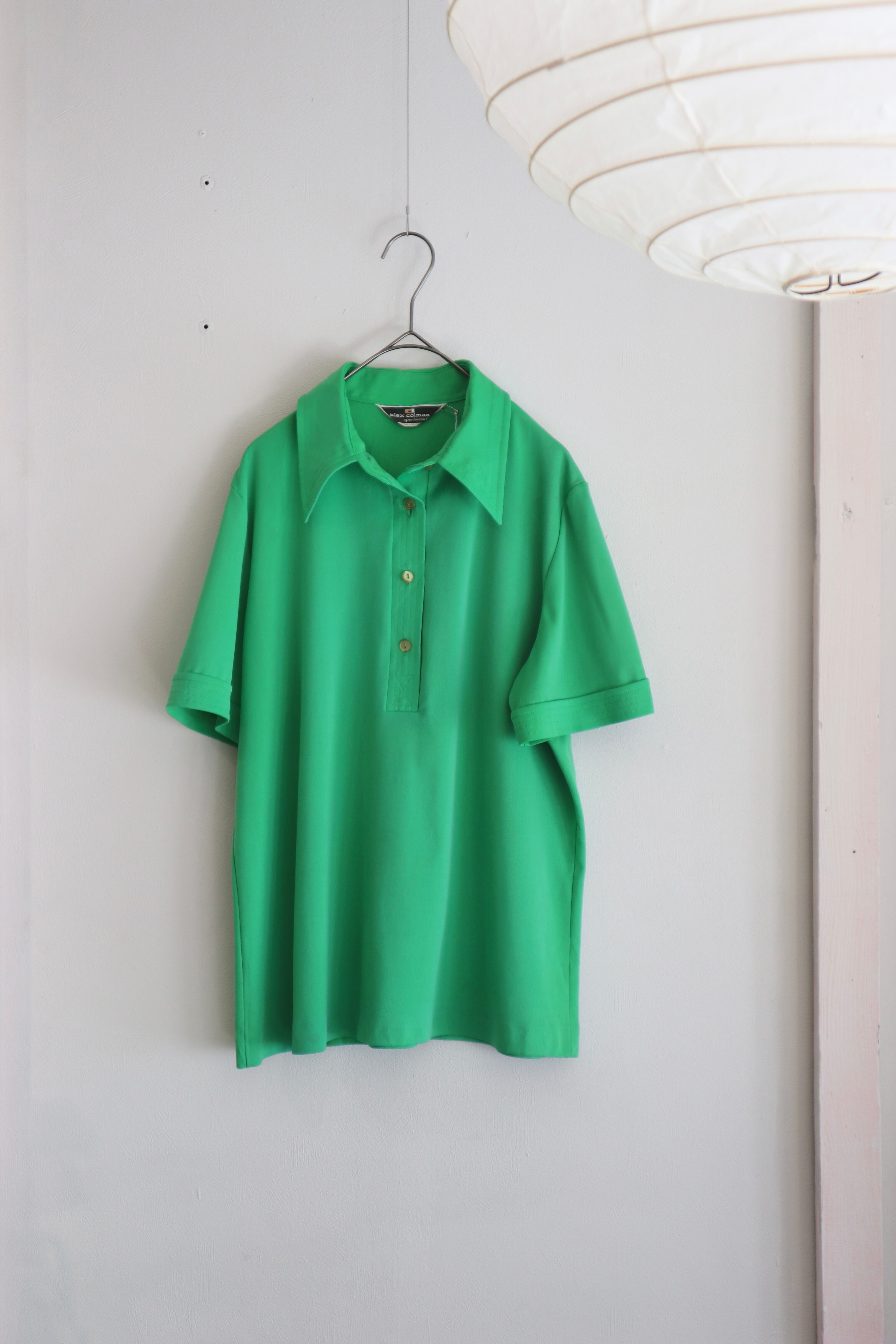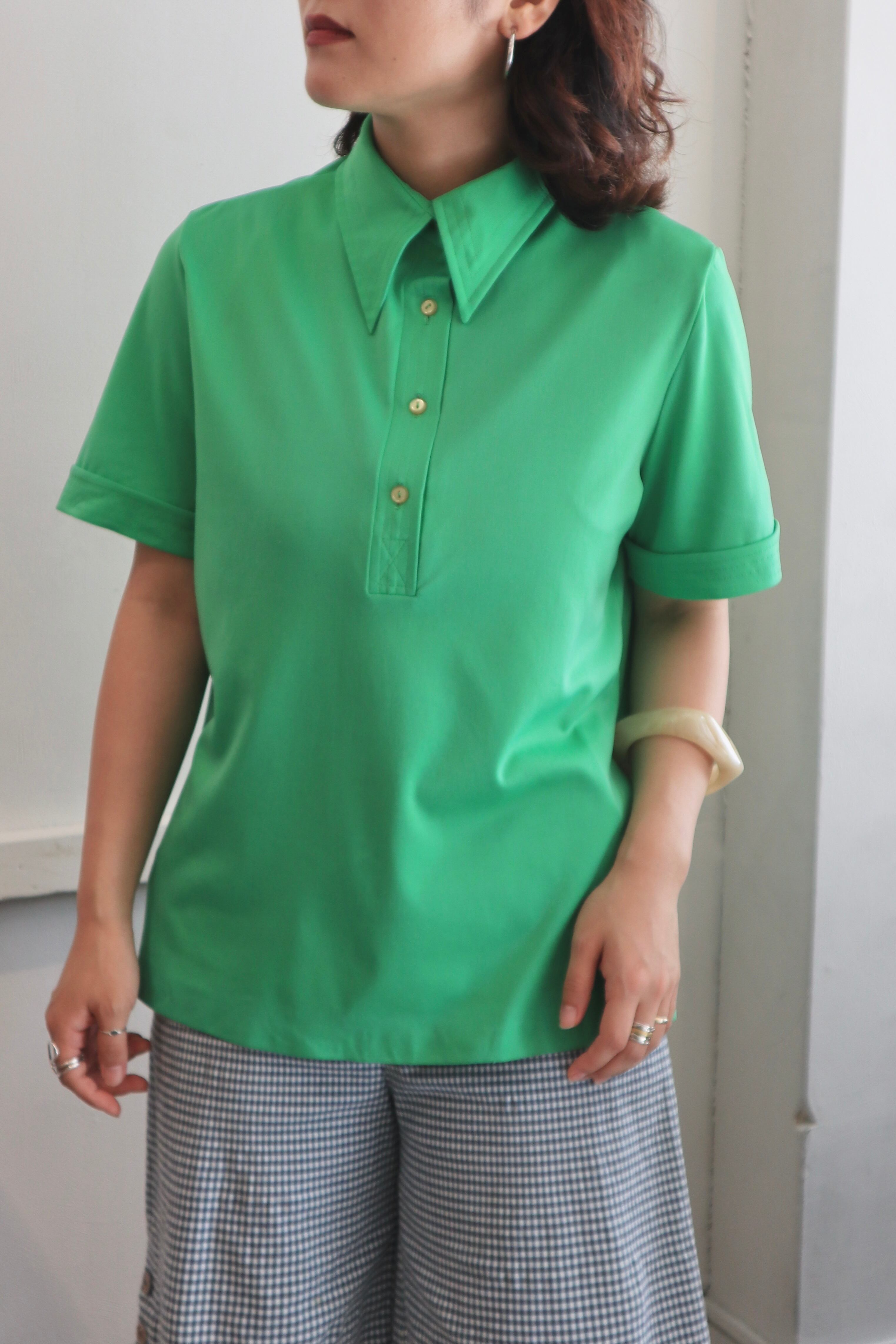 鮮やかなグリーンと、どこか懐かしさを感じる大きめの襟が印象的なポロシャツ