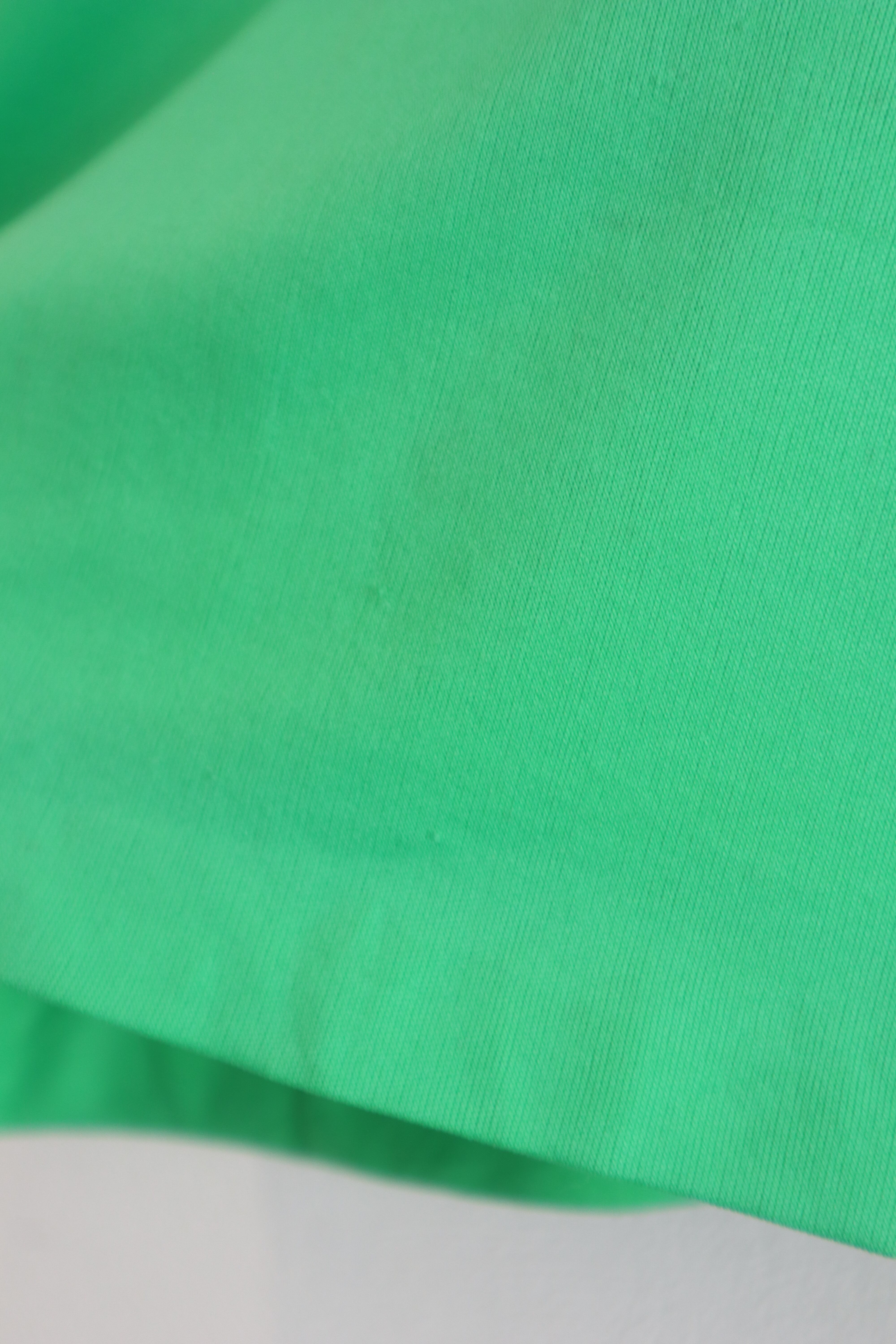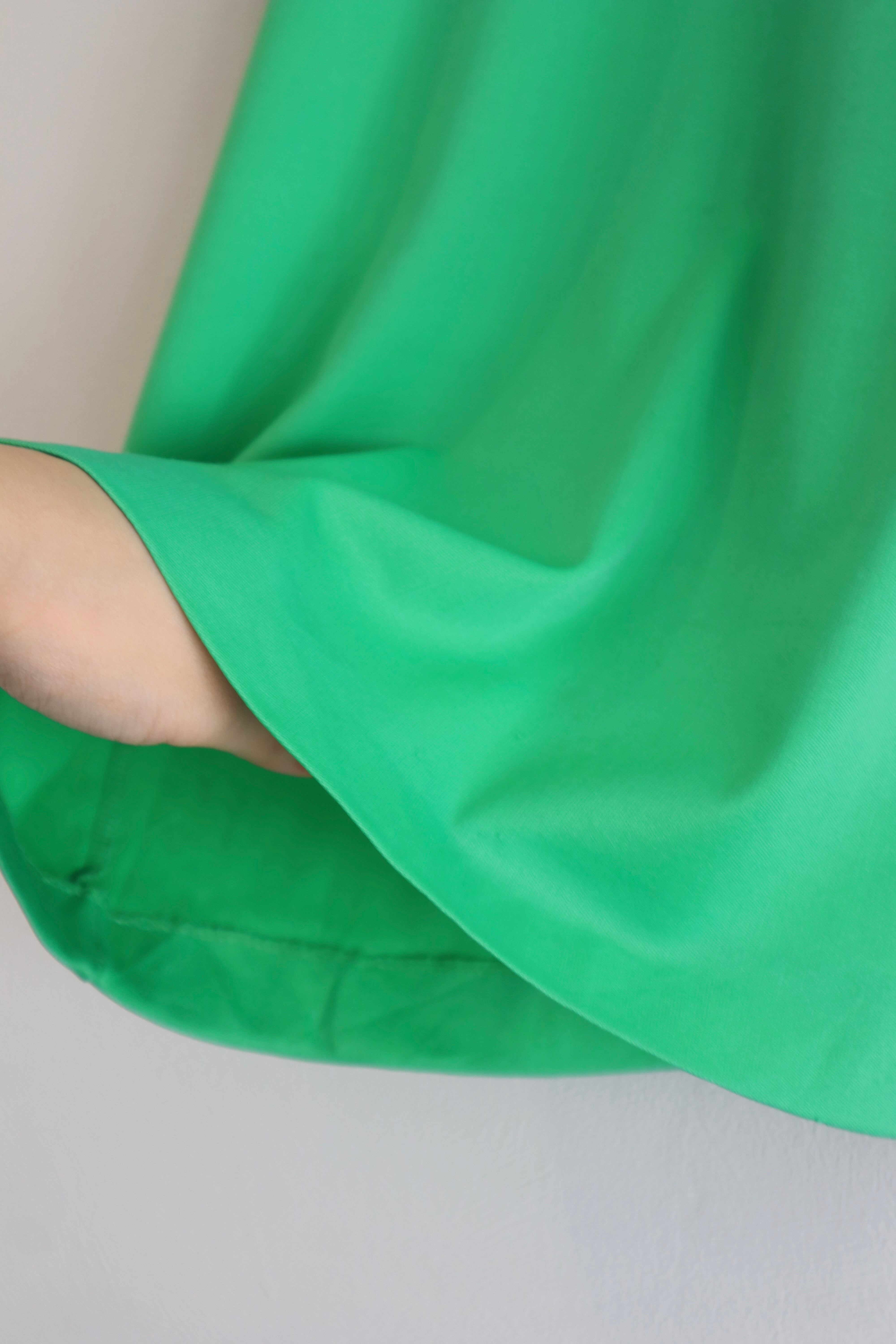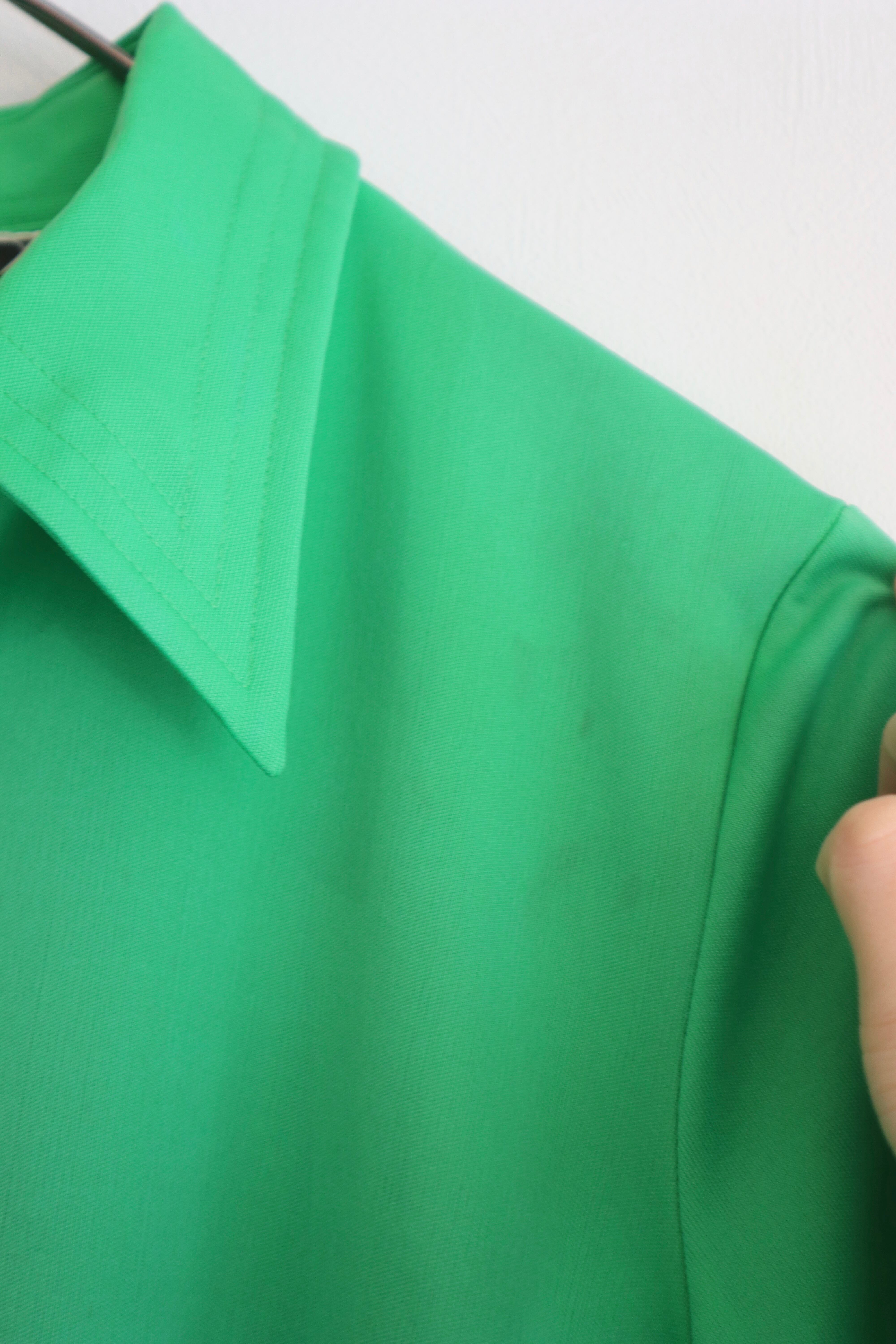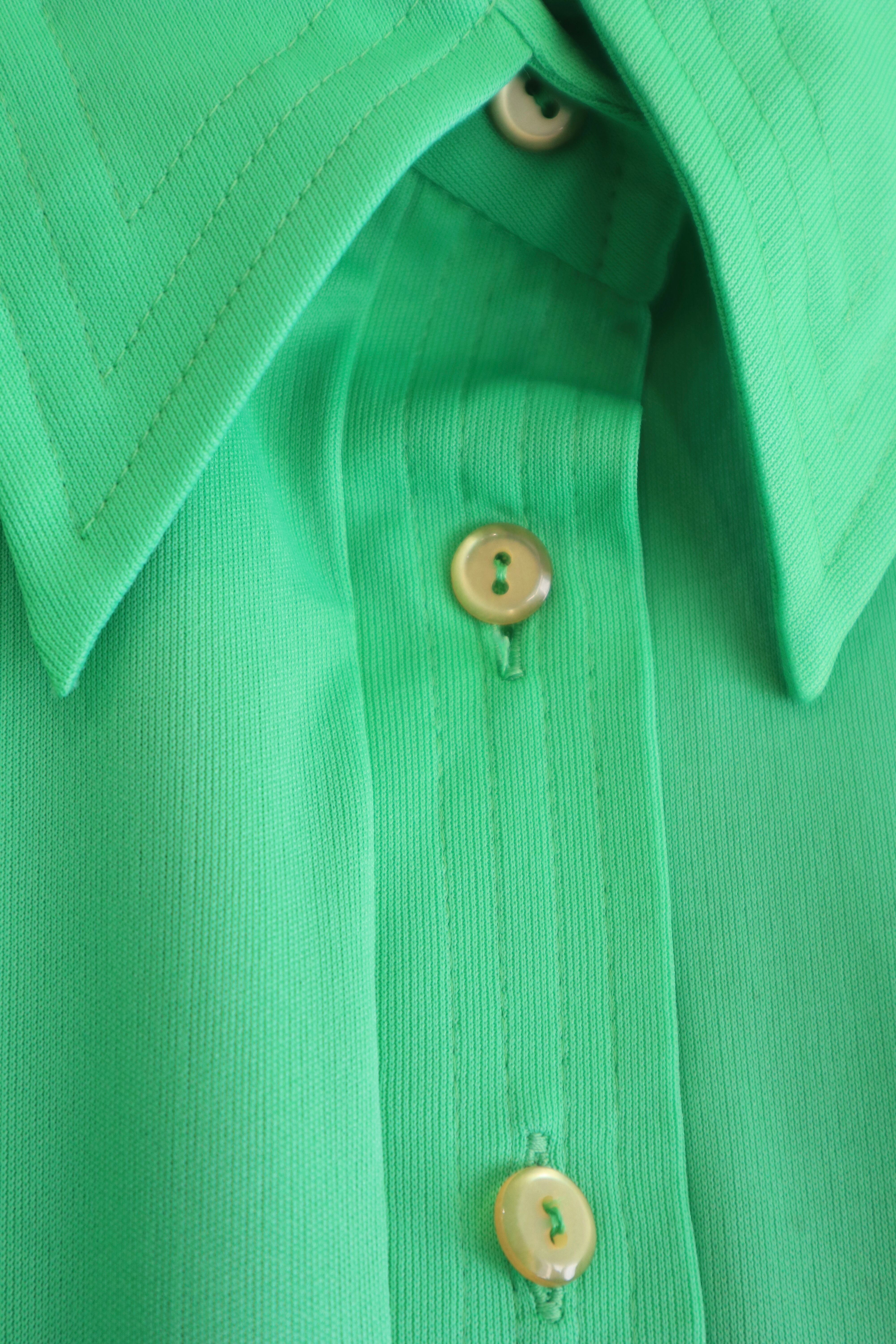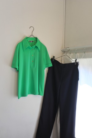 鮮やかなグリーンと、どこか懐かしさを感じる大きめの襟が印象的なポロシャツ