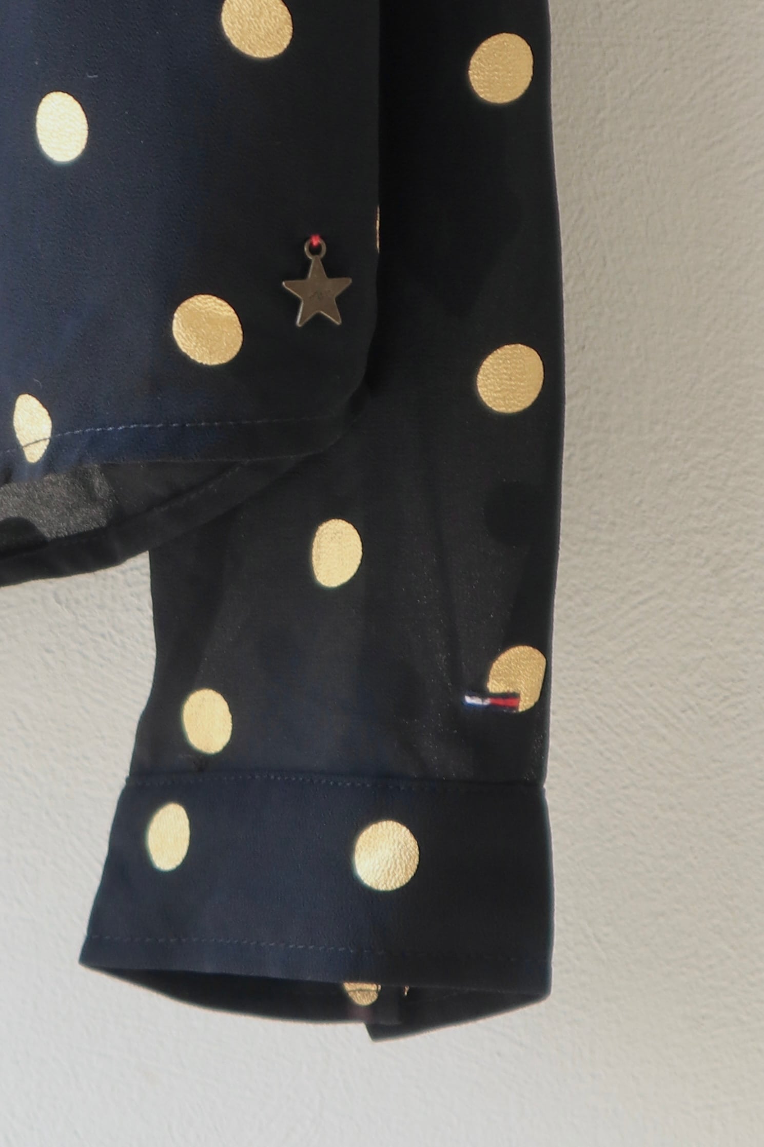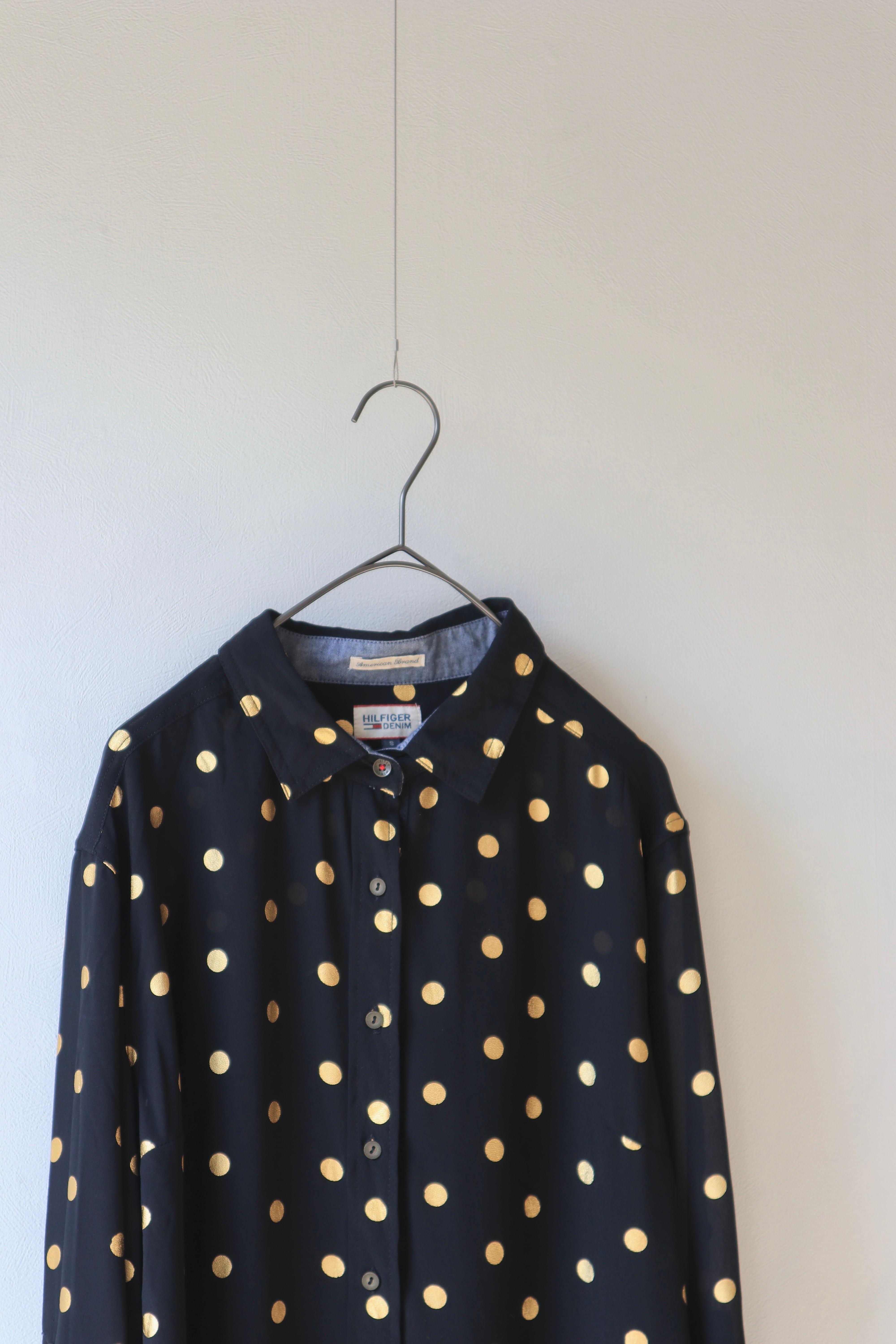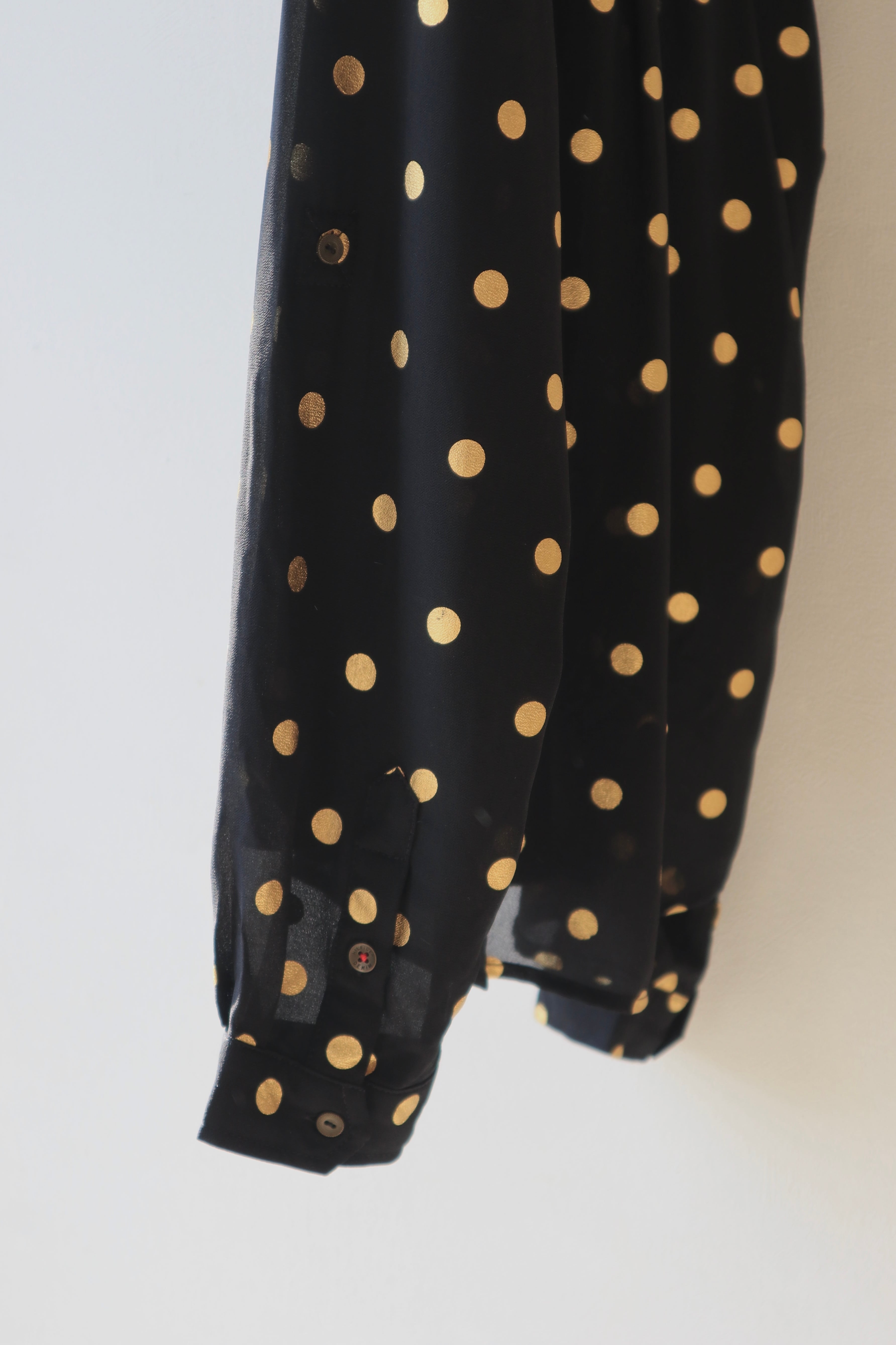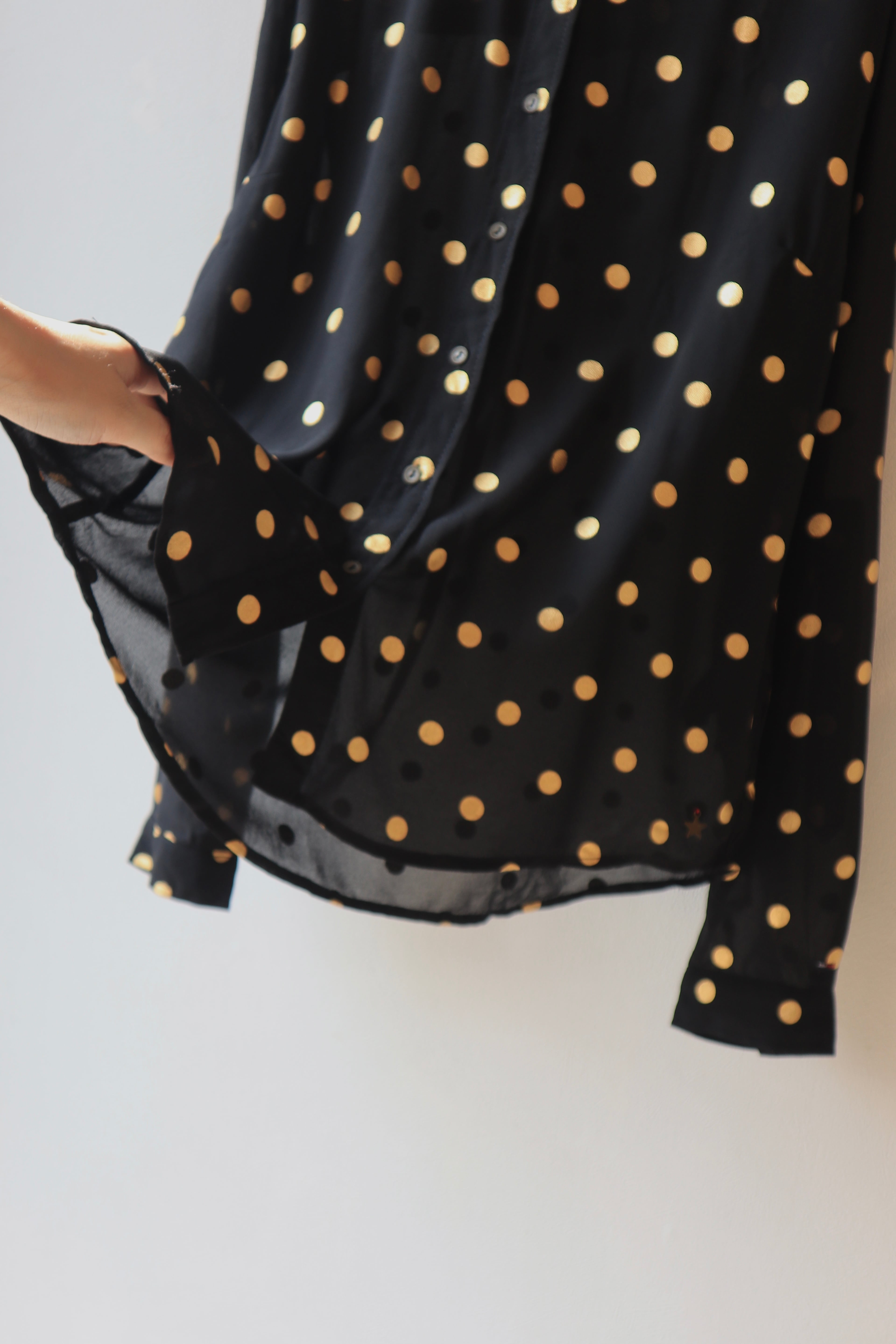軽やかな黒地に、華やかなゴールドのドットが散りばめられたトレンドライクなシャツ