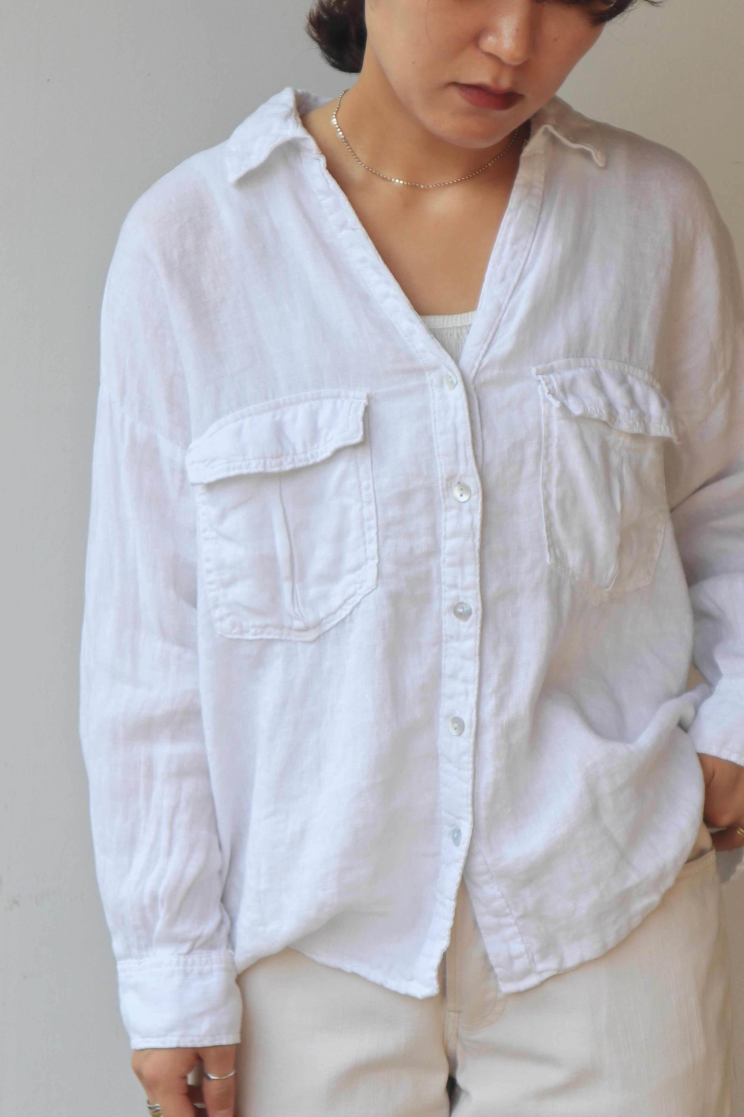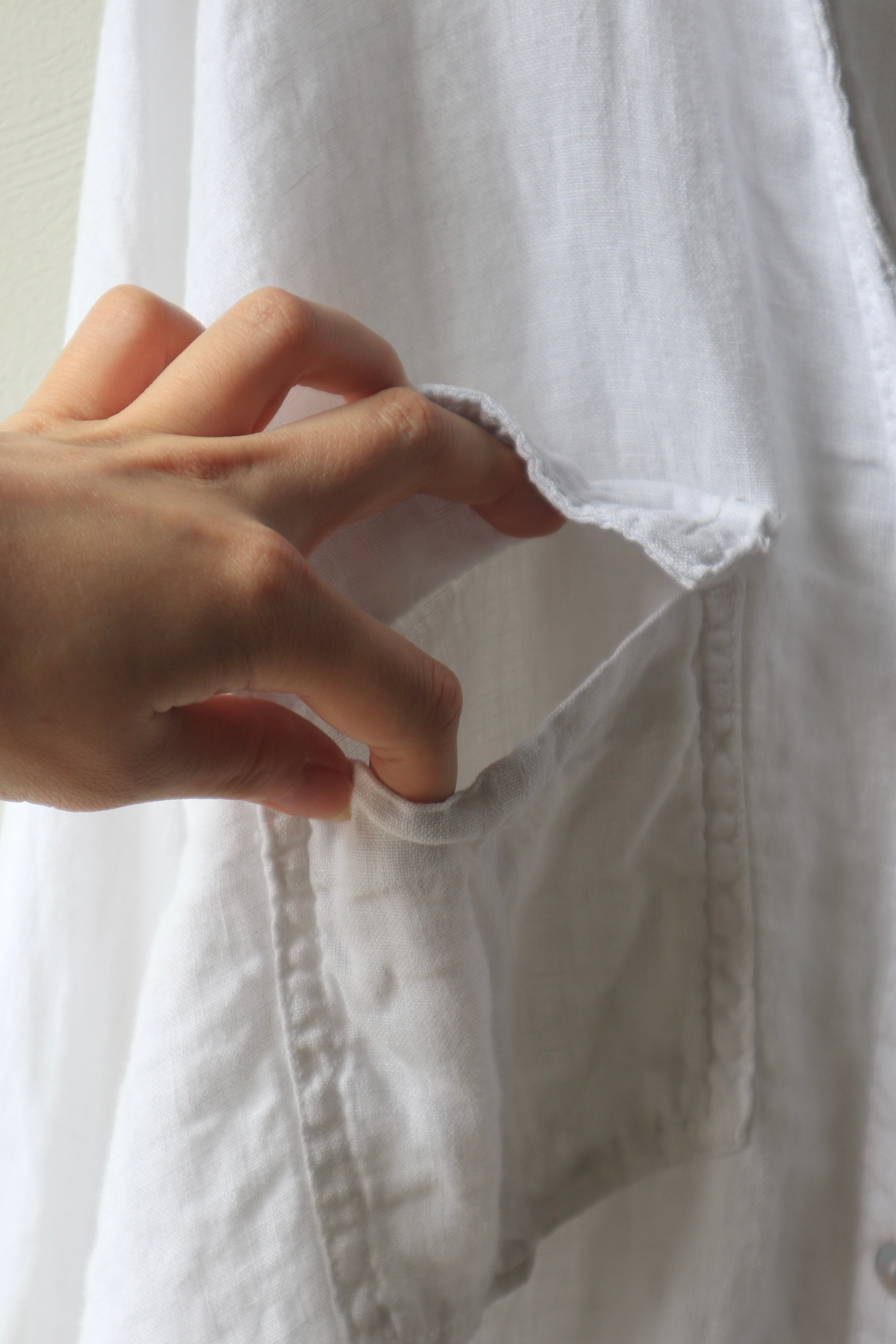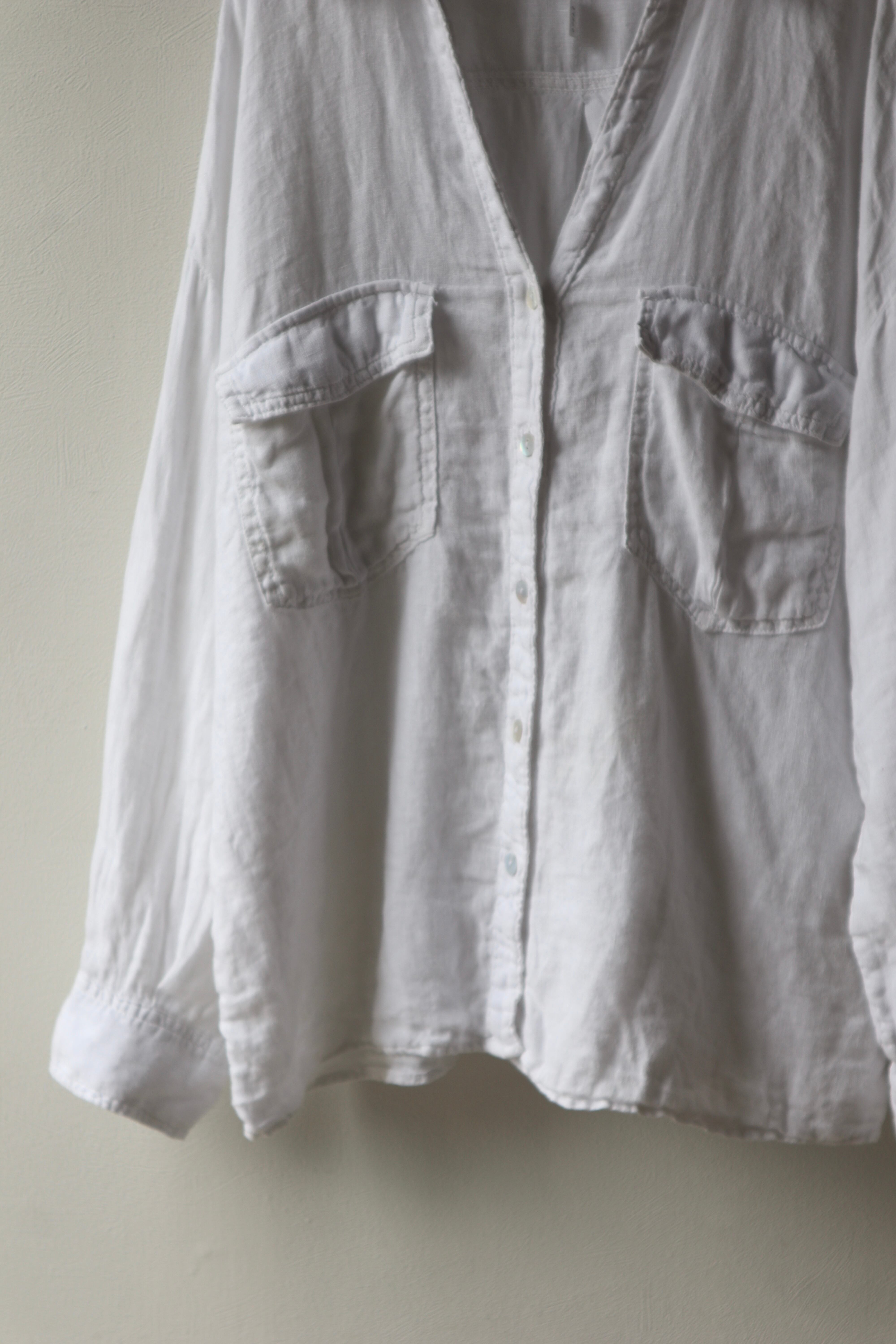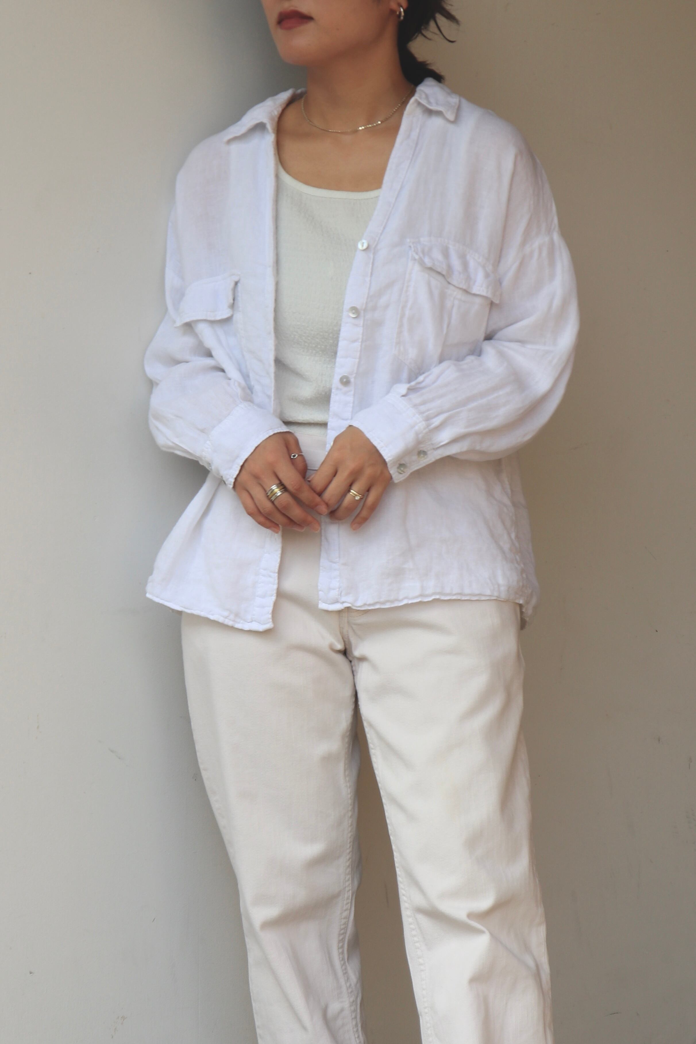顔周りを明るく見せてくれるホワイトカラーとざっくりとしたリネン素材が、こなれた雰囲気を演出