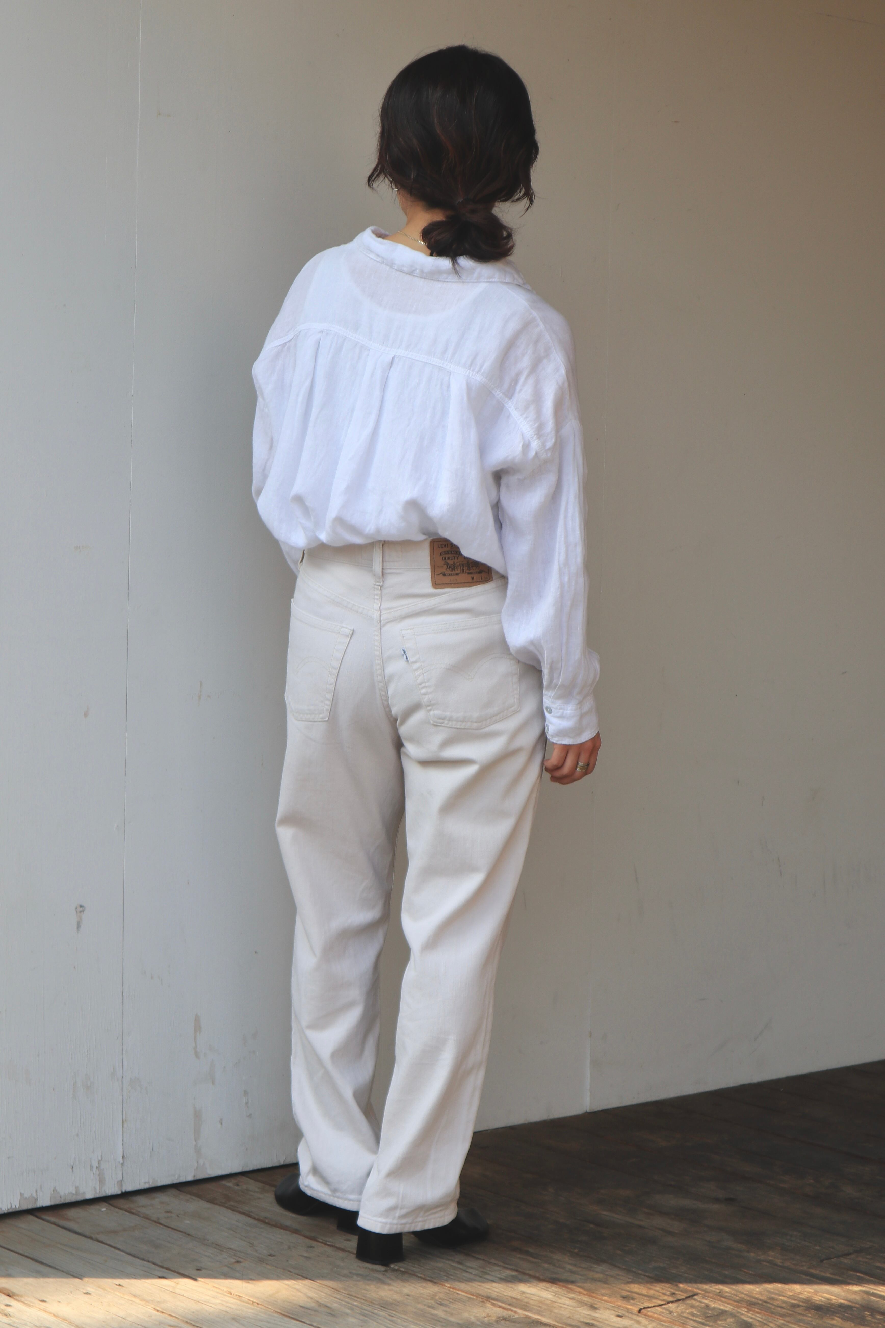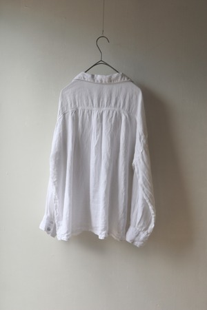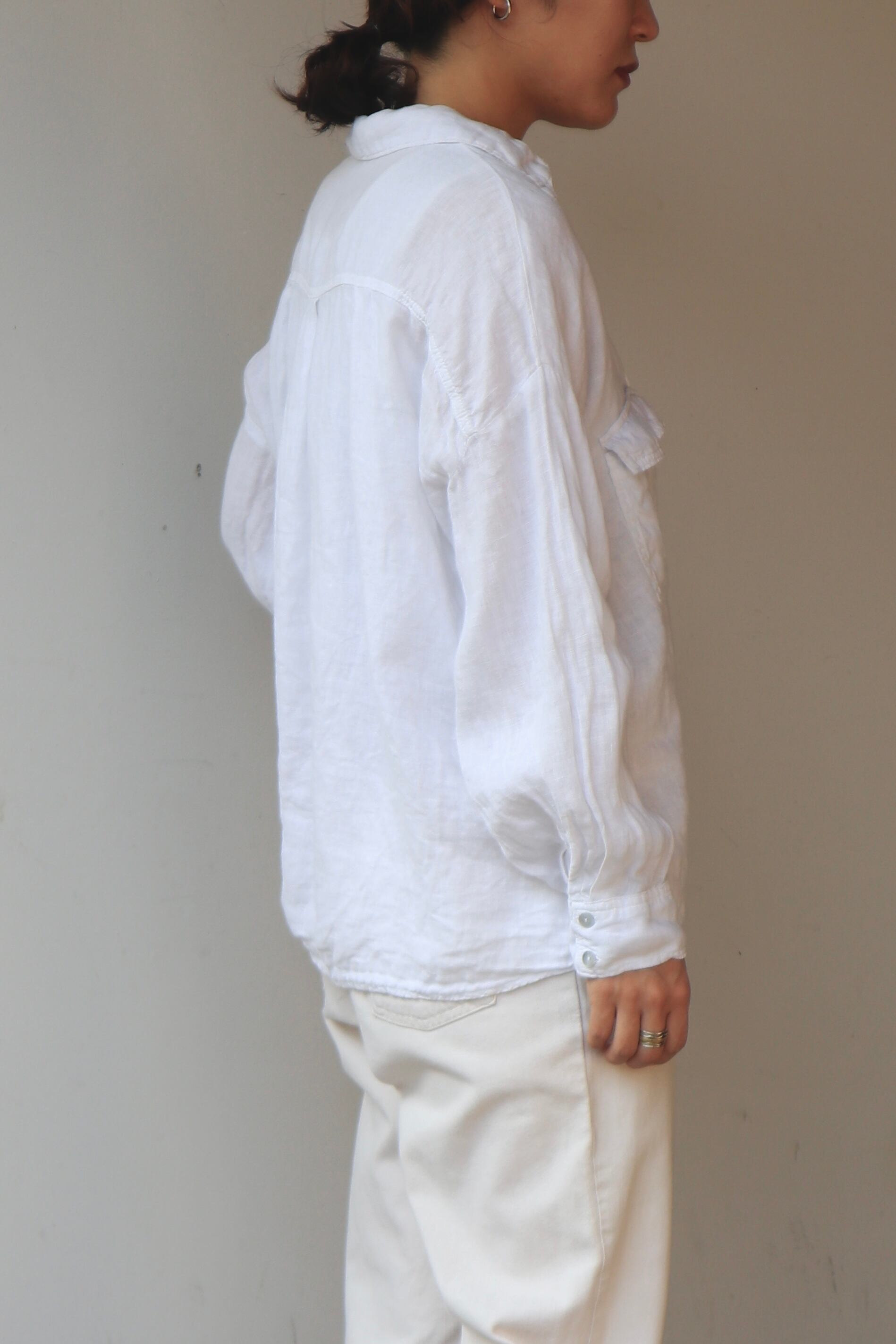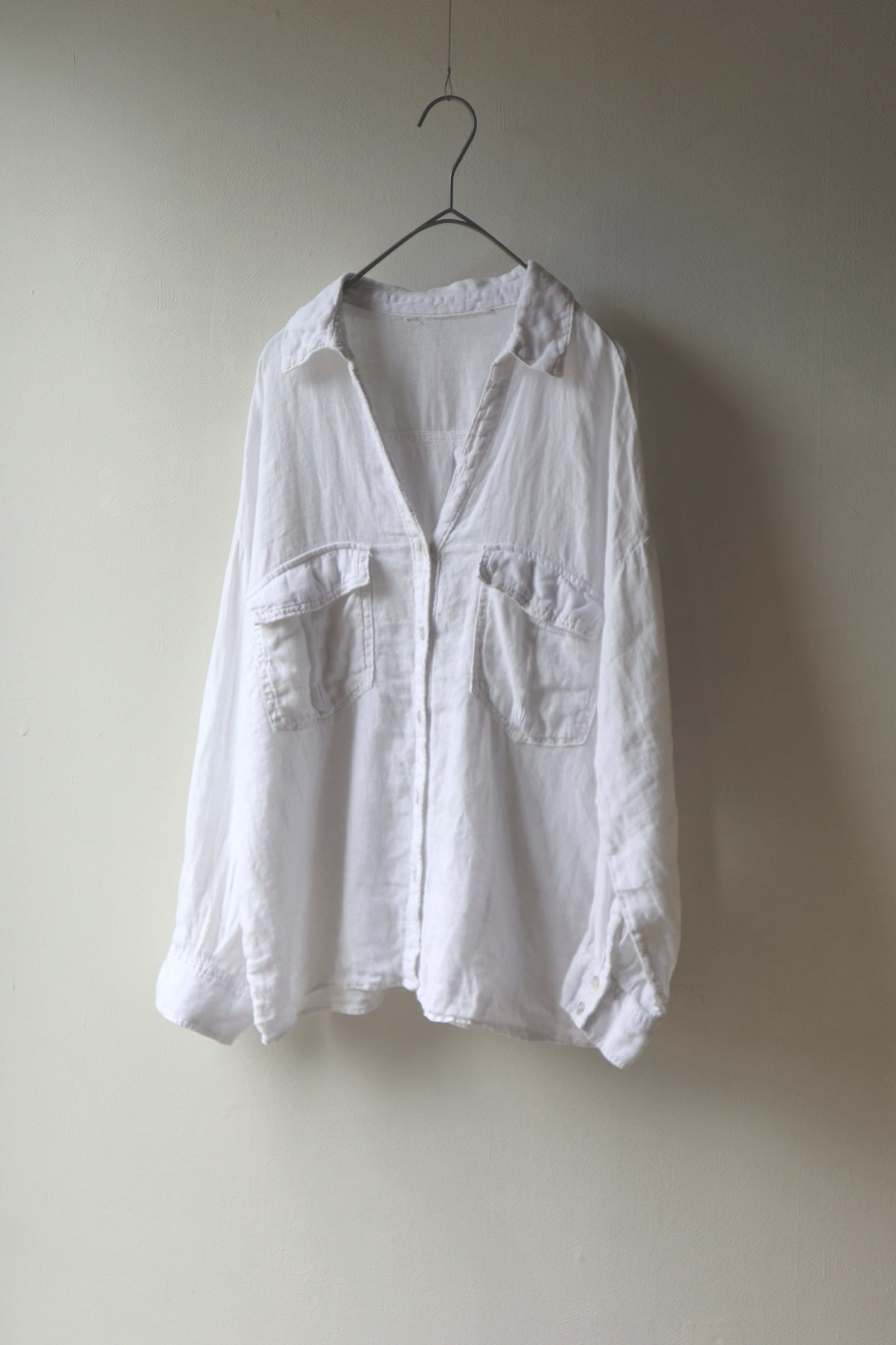 顔周りを明るく見せてくれるホワイトカラーとざっくりとしたリネン素材が、こなれた雰囲気を演出