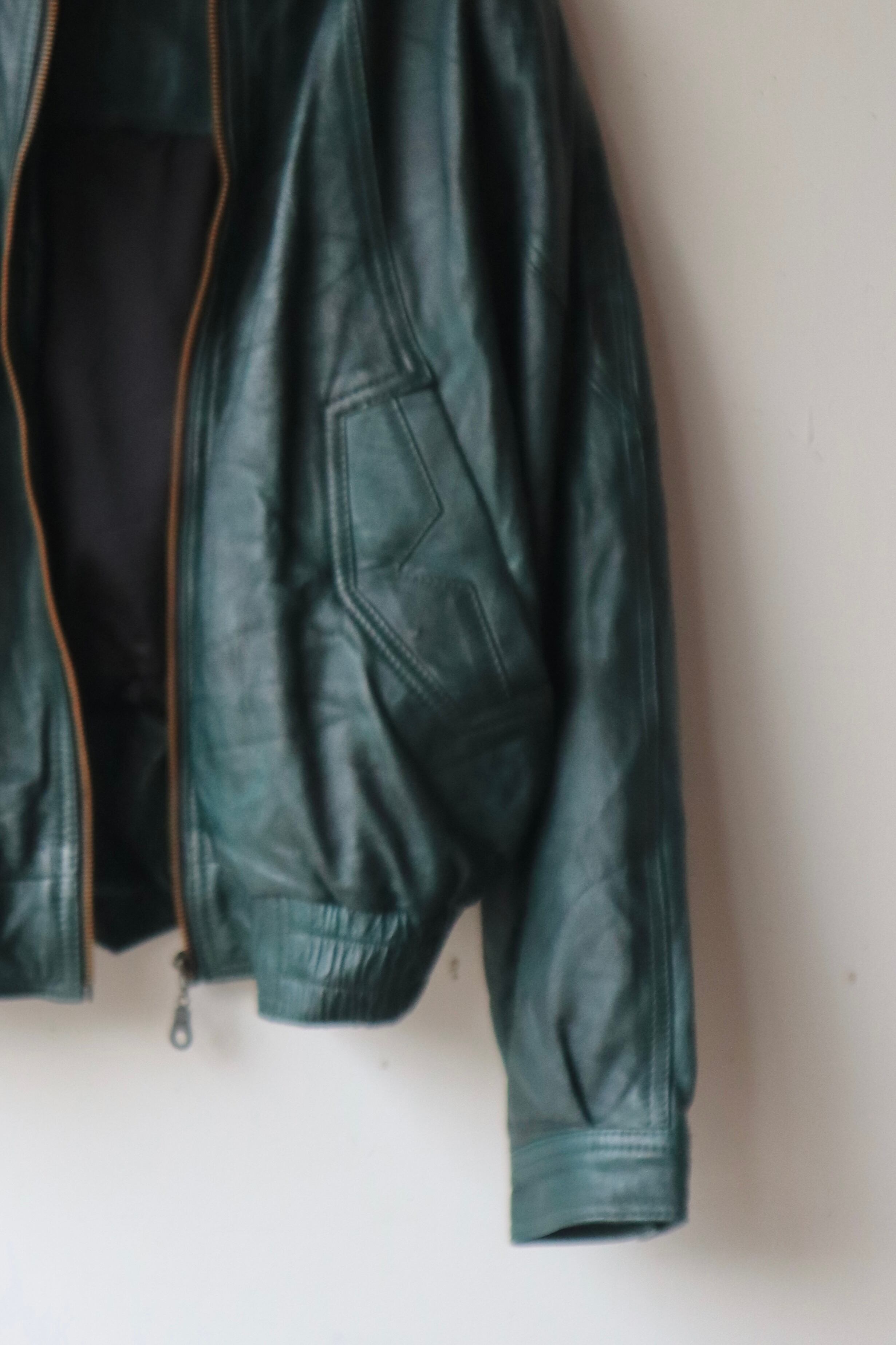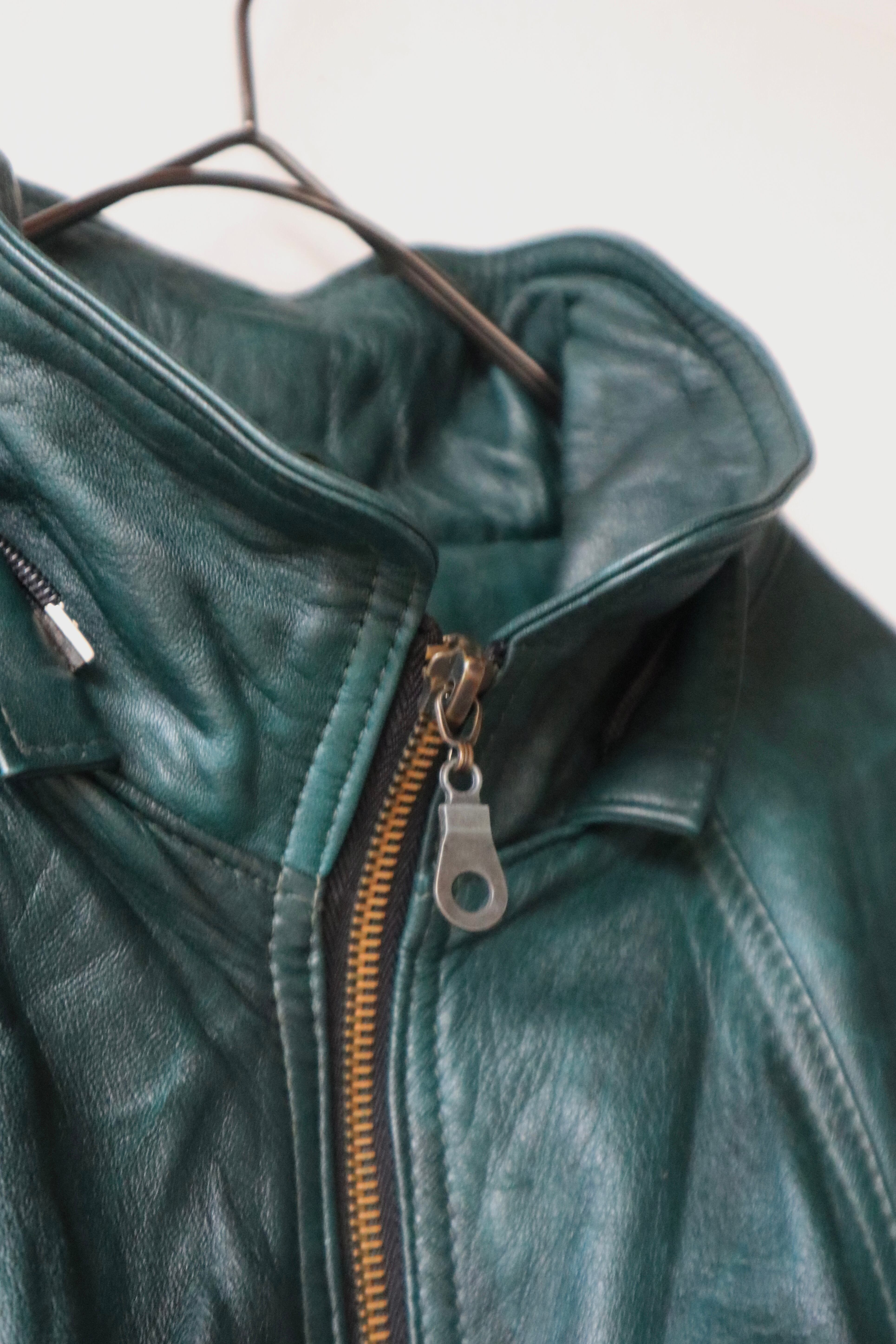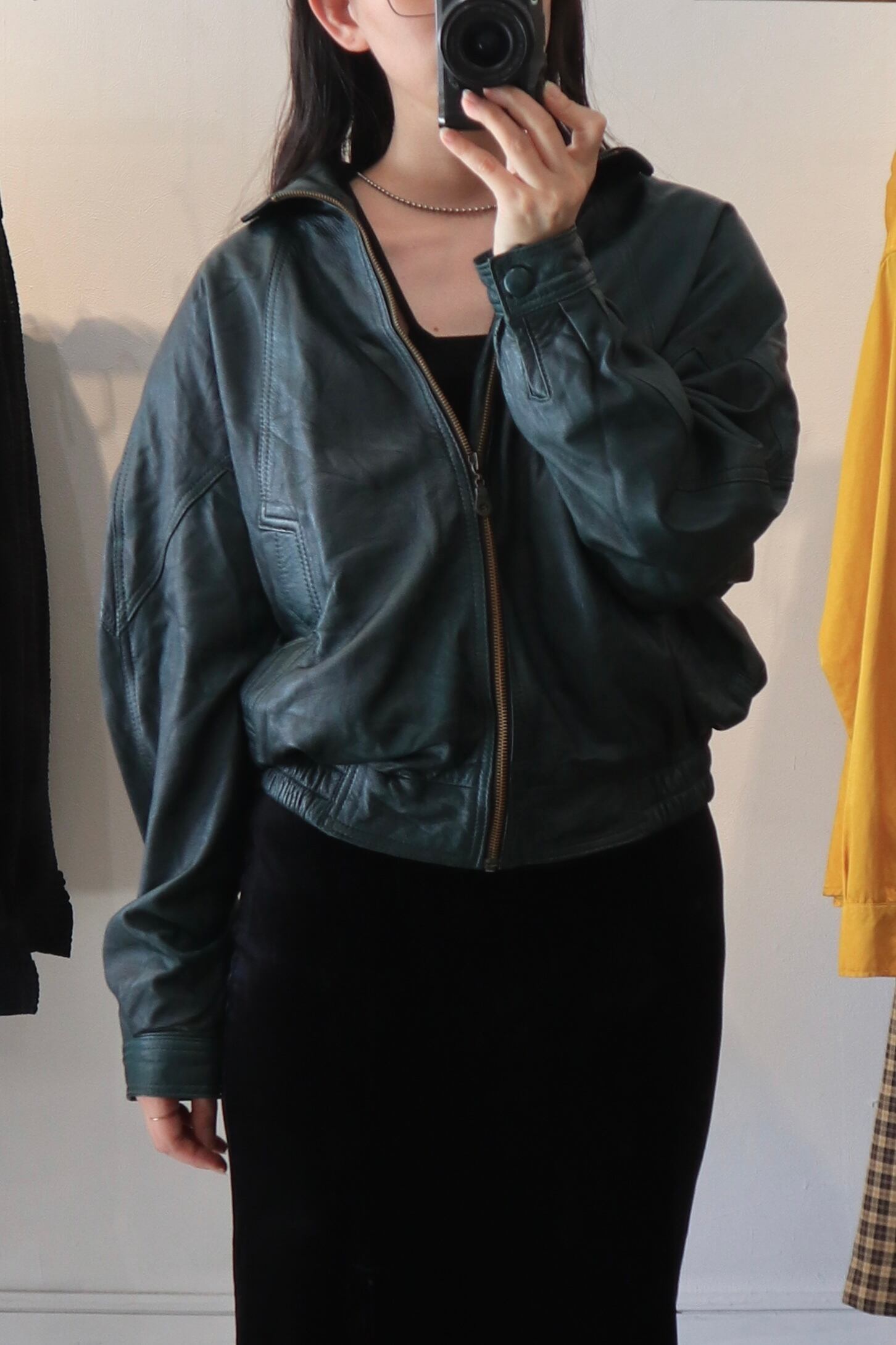 深みのあるグリーンカラーが目を惹くショート丈レザージャケット