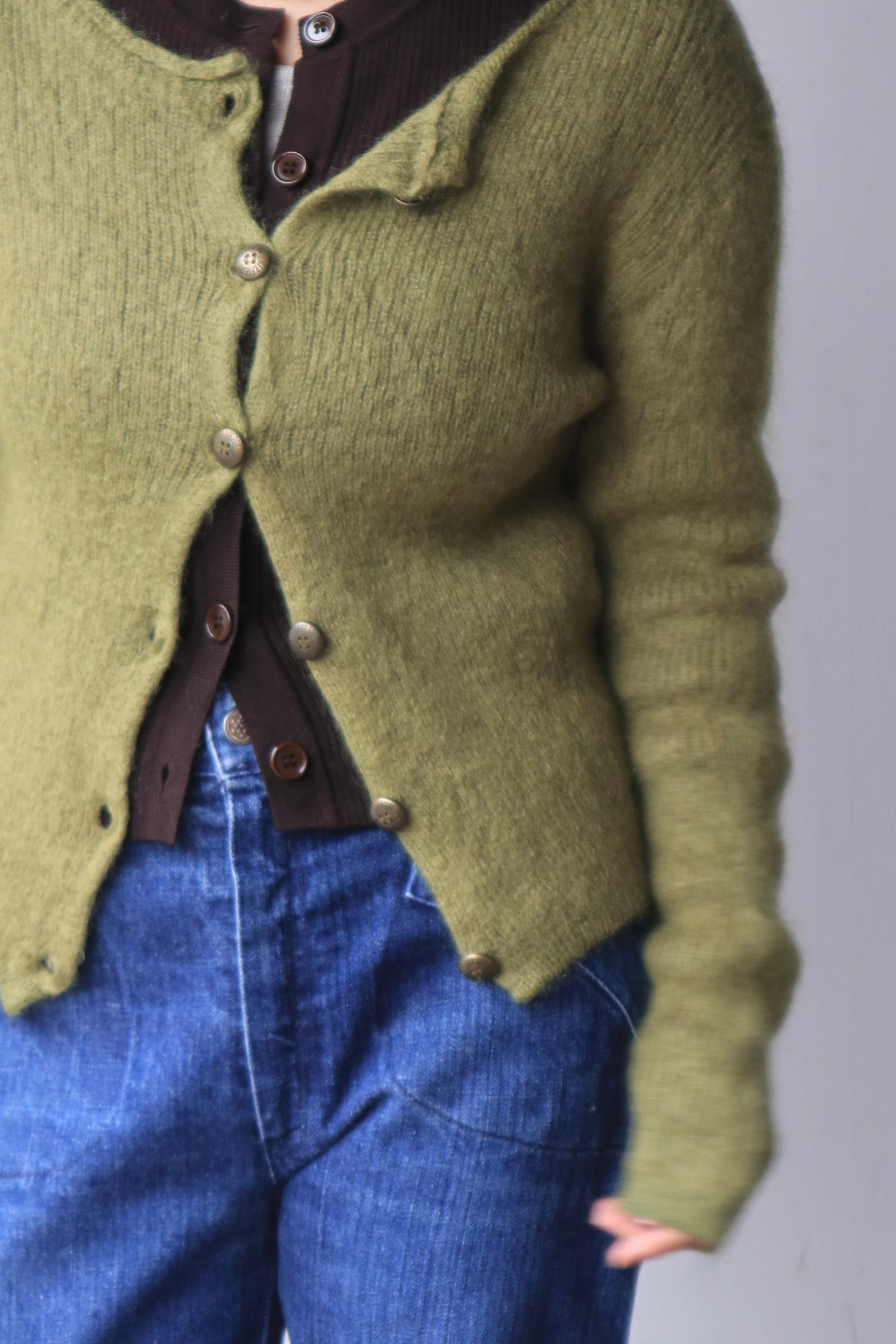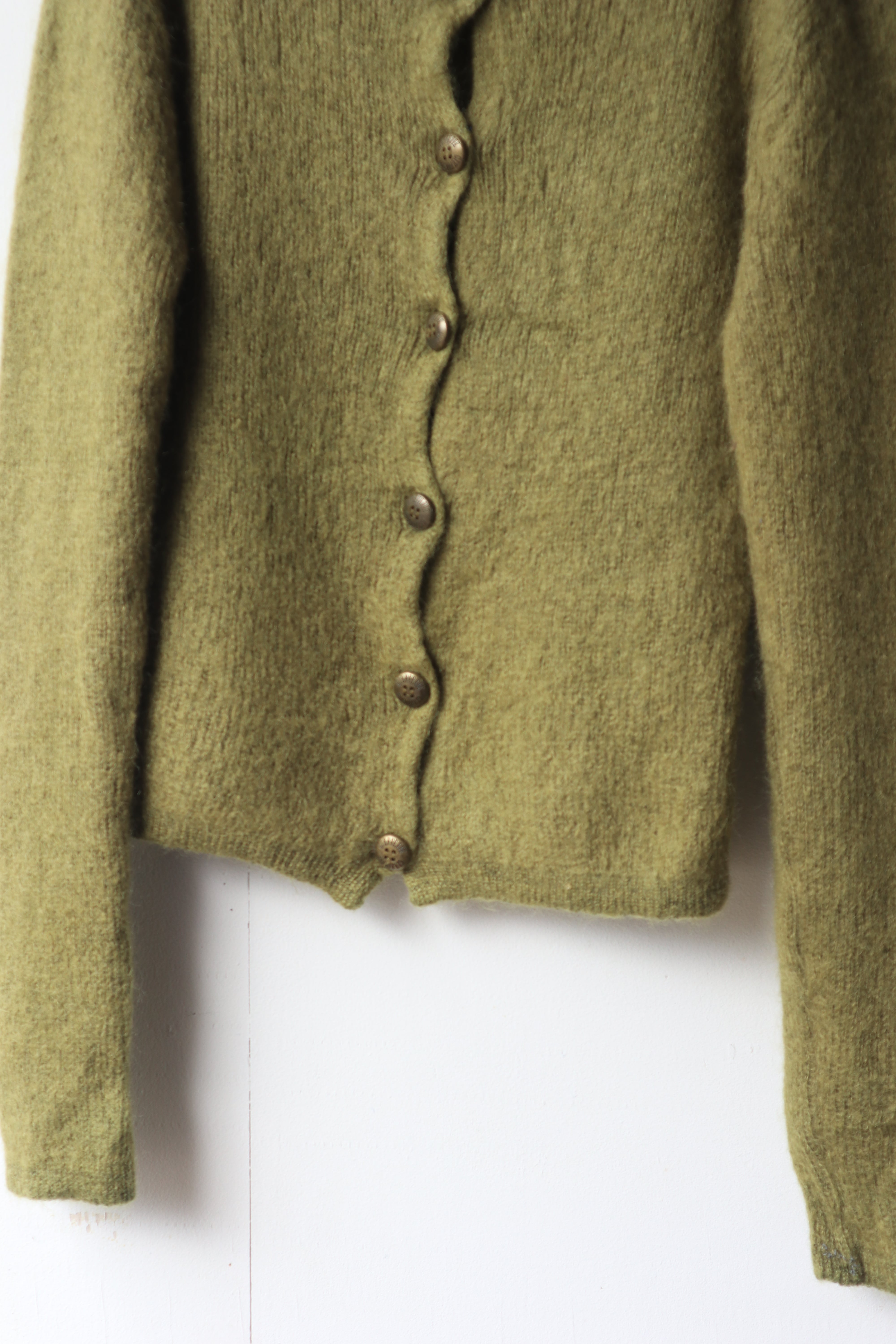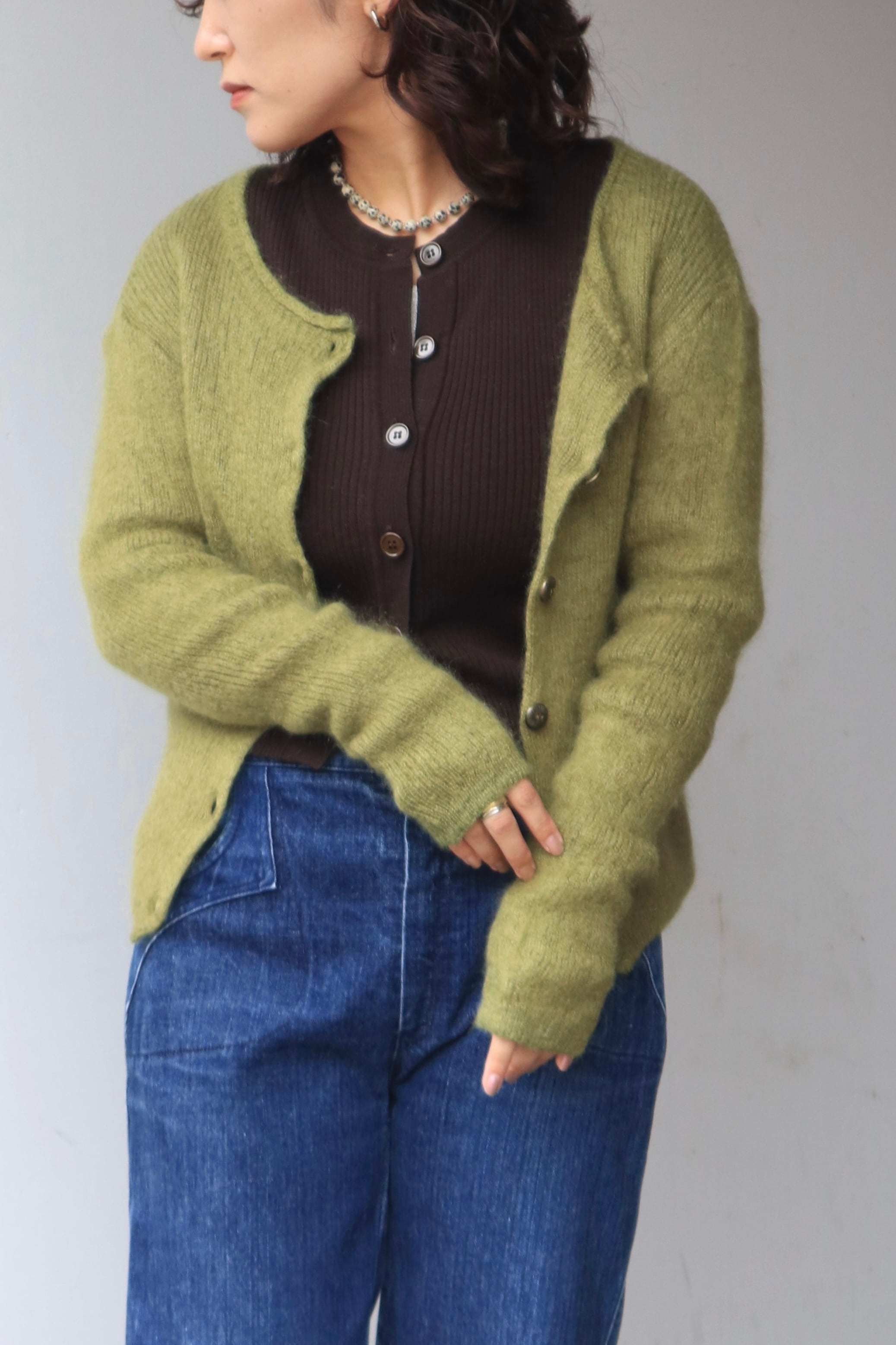 柔らかなモスグリーンの色合いと、毛足の長いモヘア素材が魅力のニットカーディガン