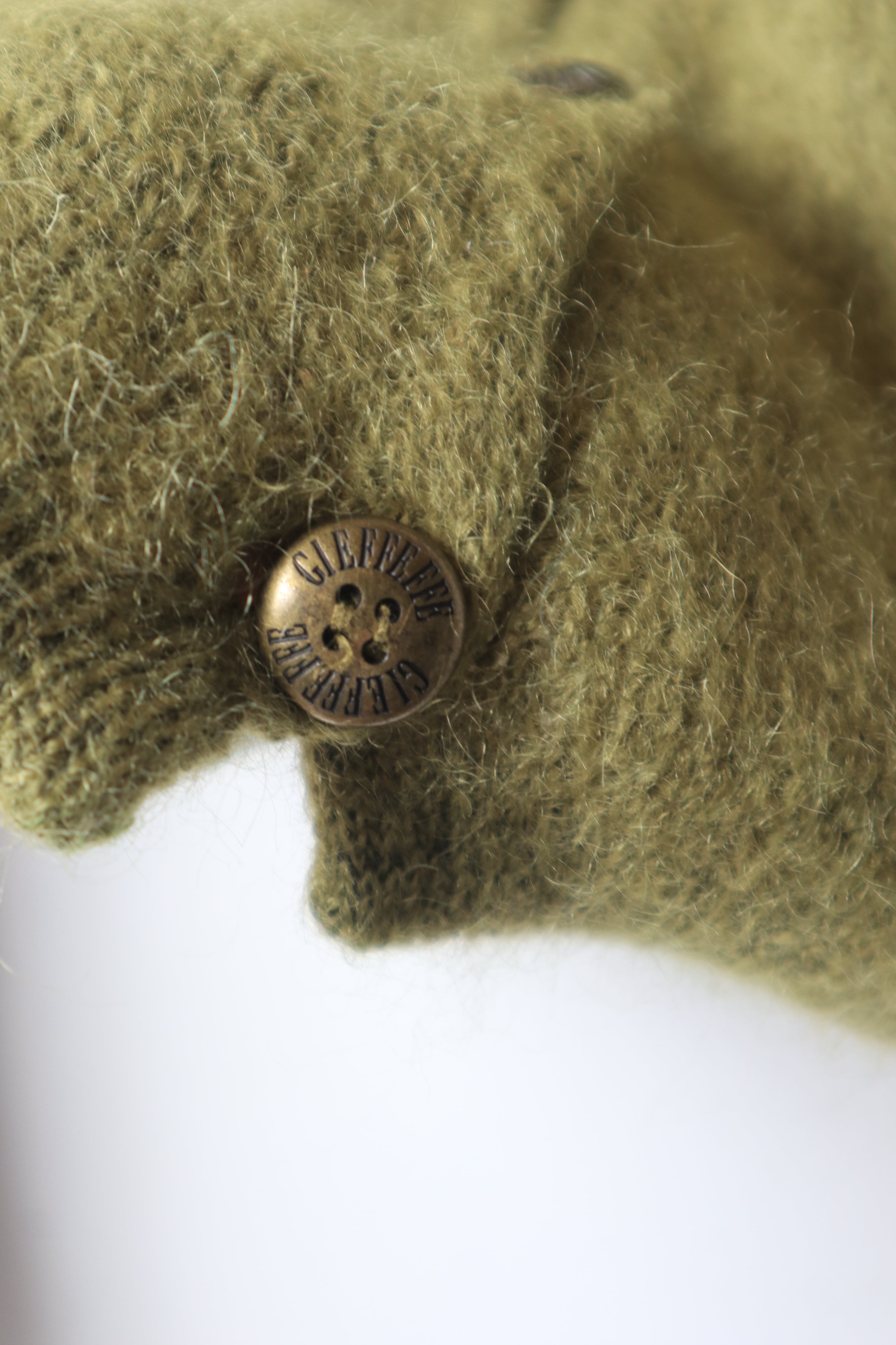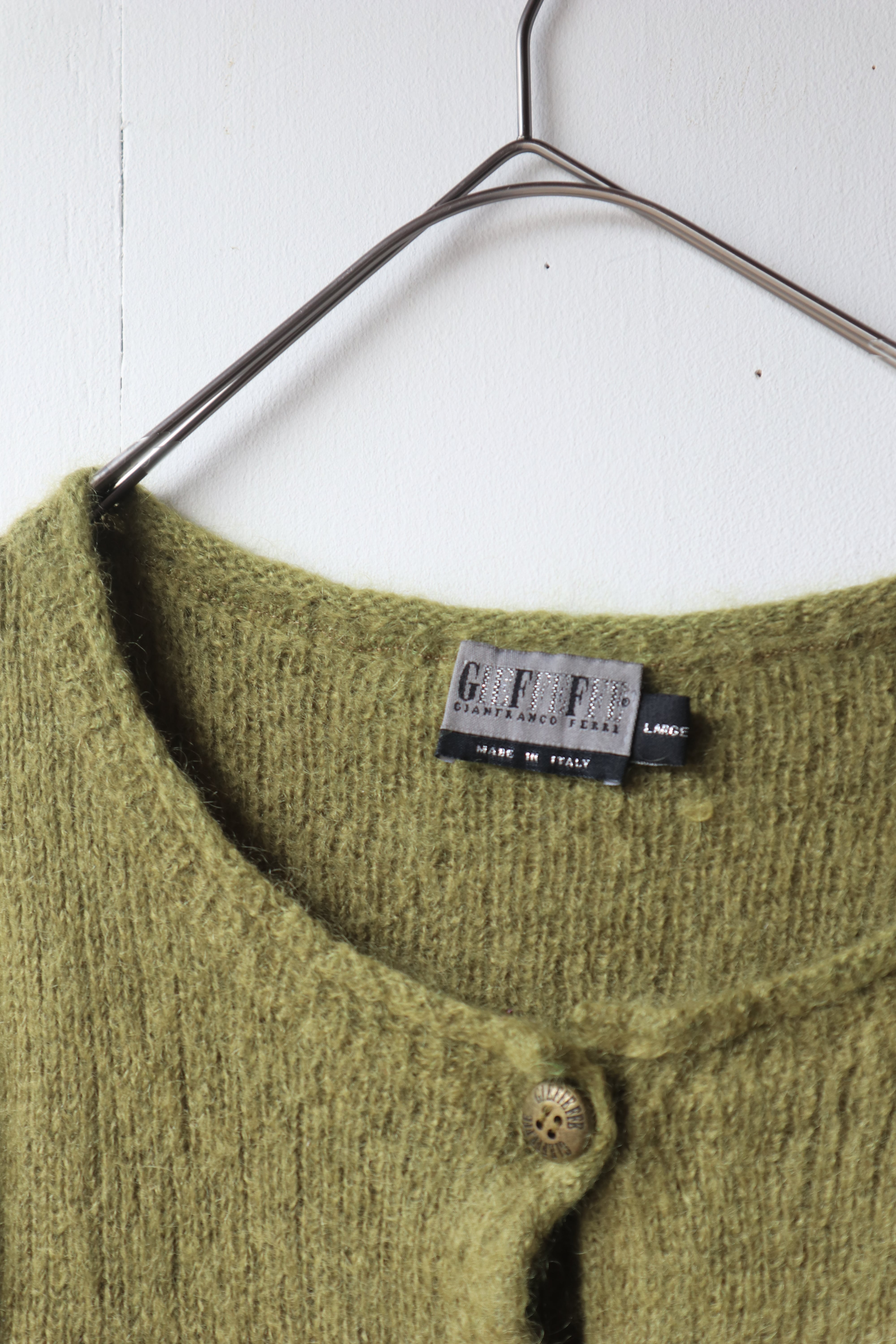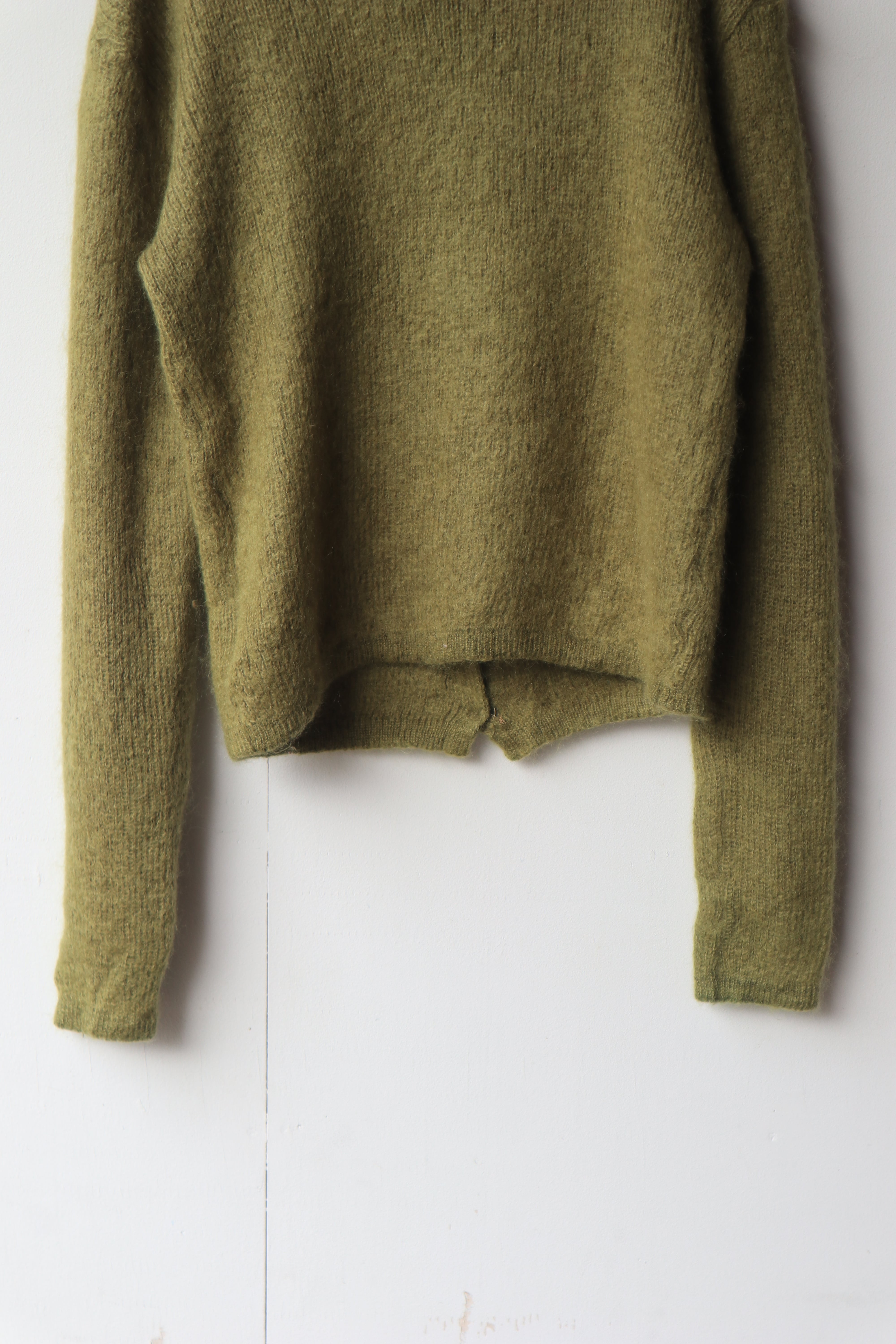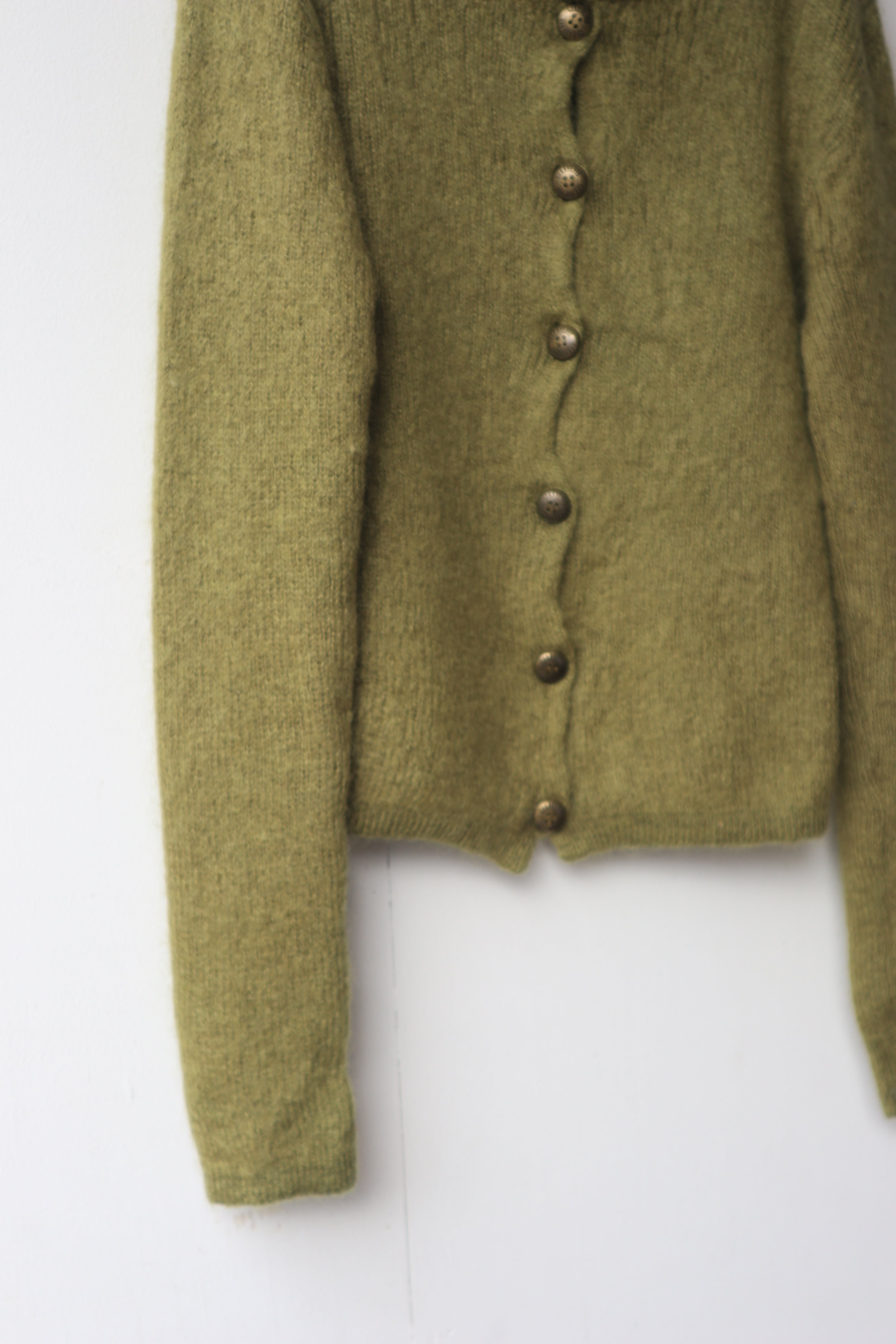 柔らかなモスグリーンの色合いと、毛足の長いモヘア素材が魅力のニットカーディガン