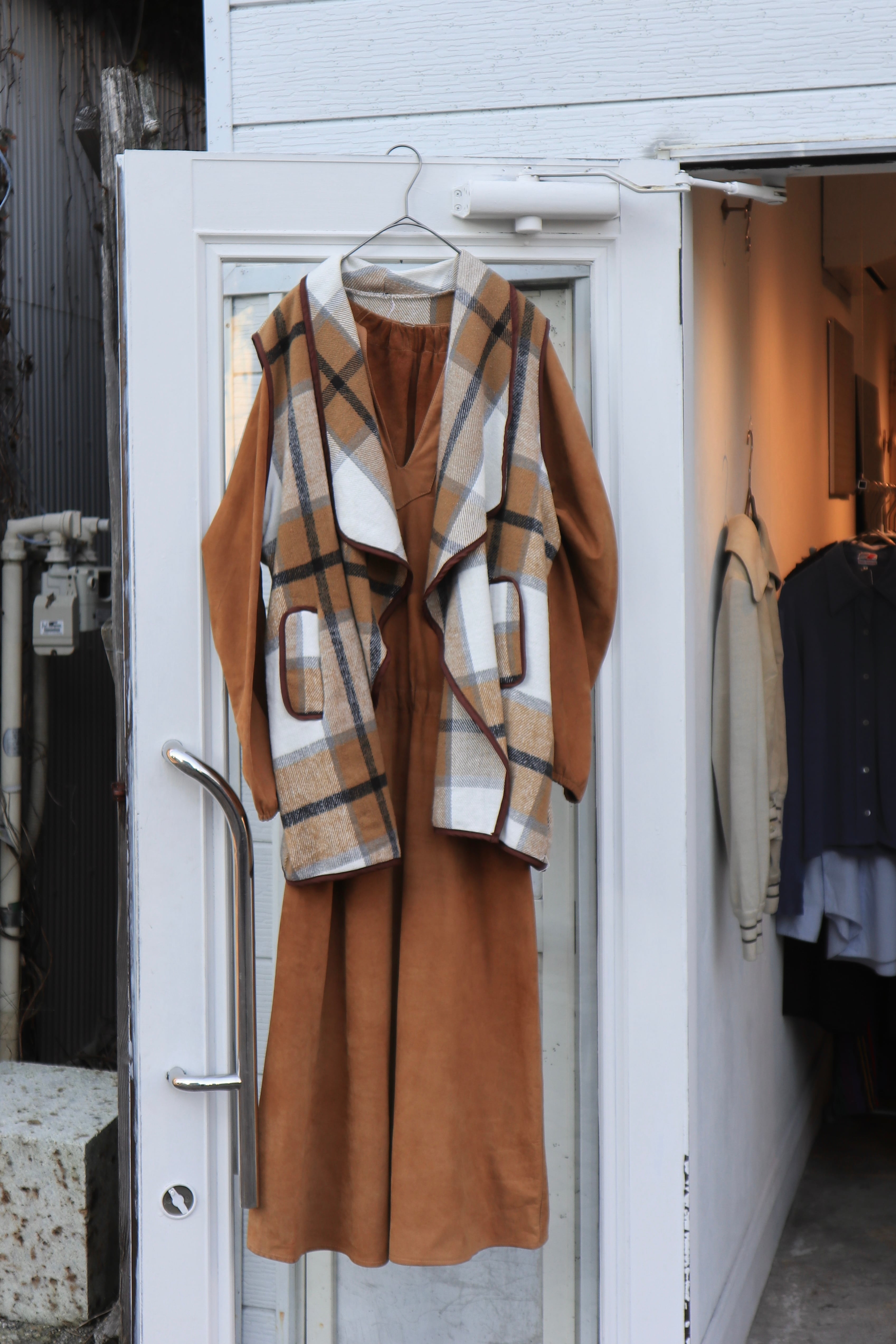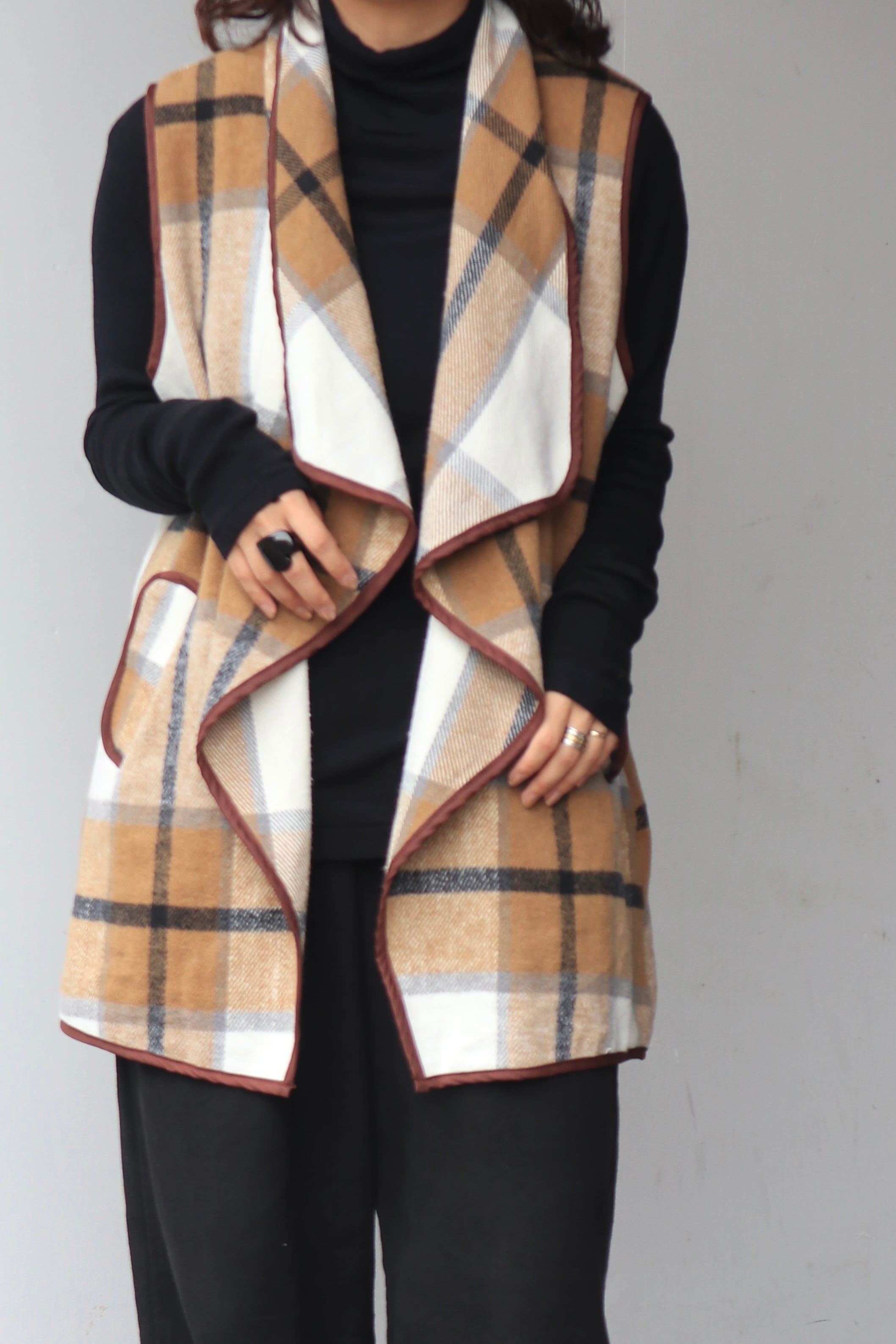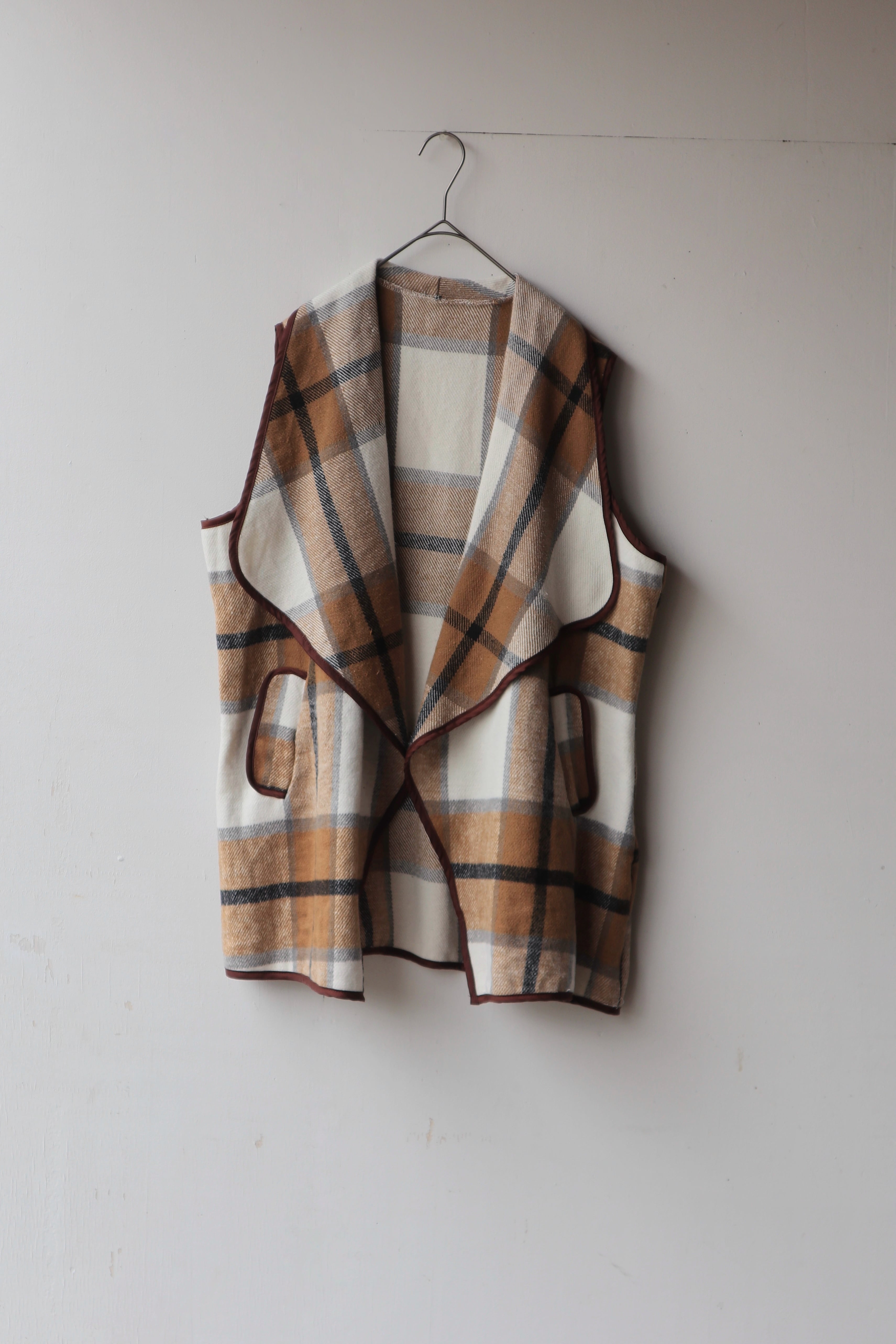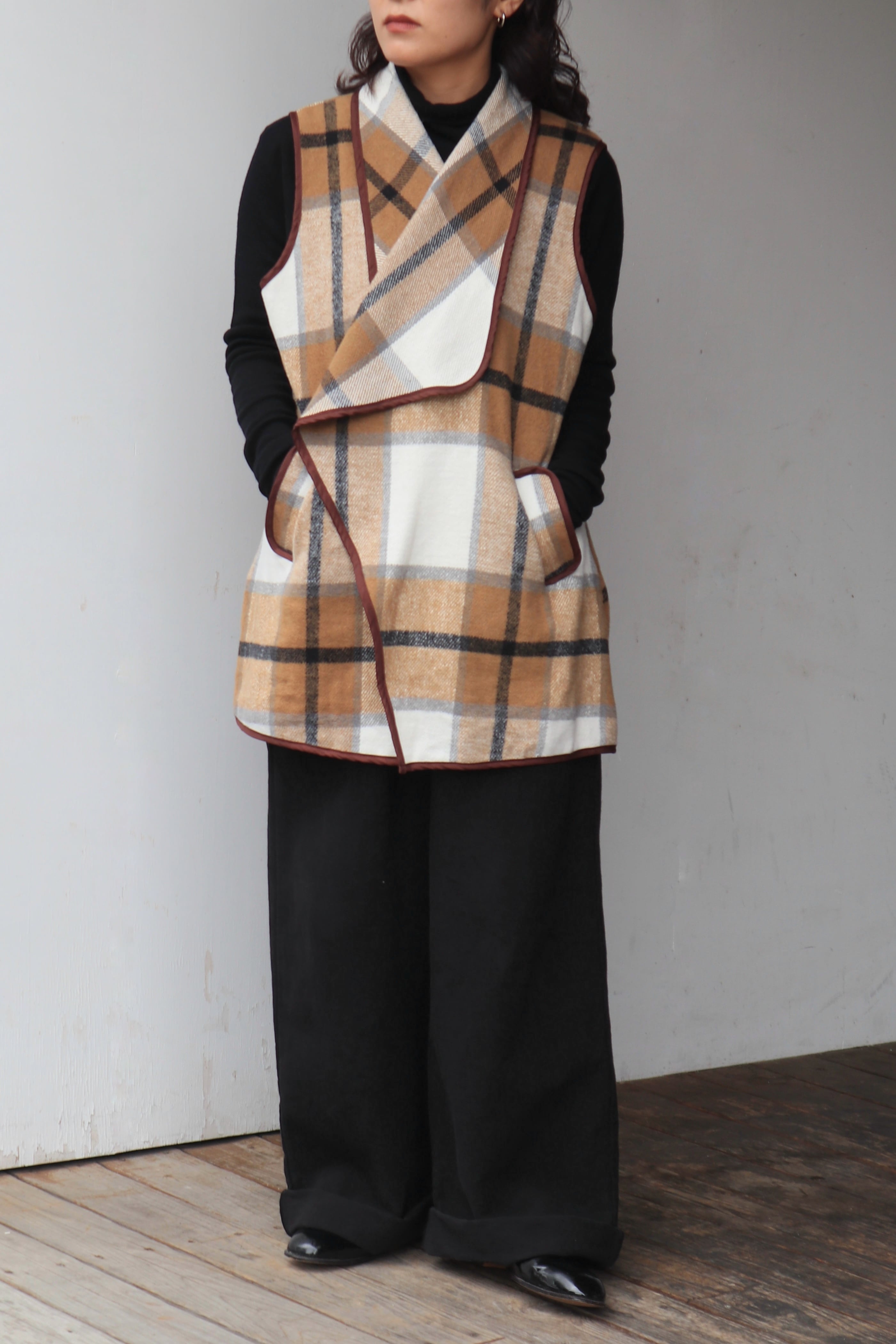 秋冬のムードを高めてくれる配色のチェック柄ラップベスト