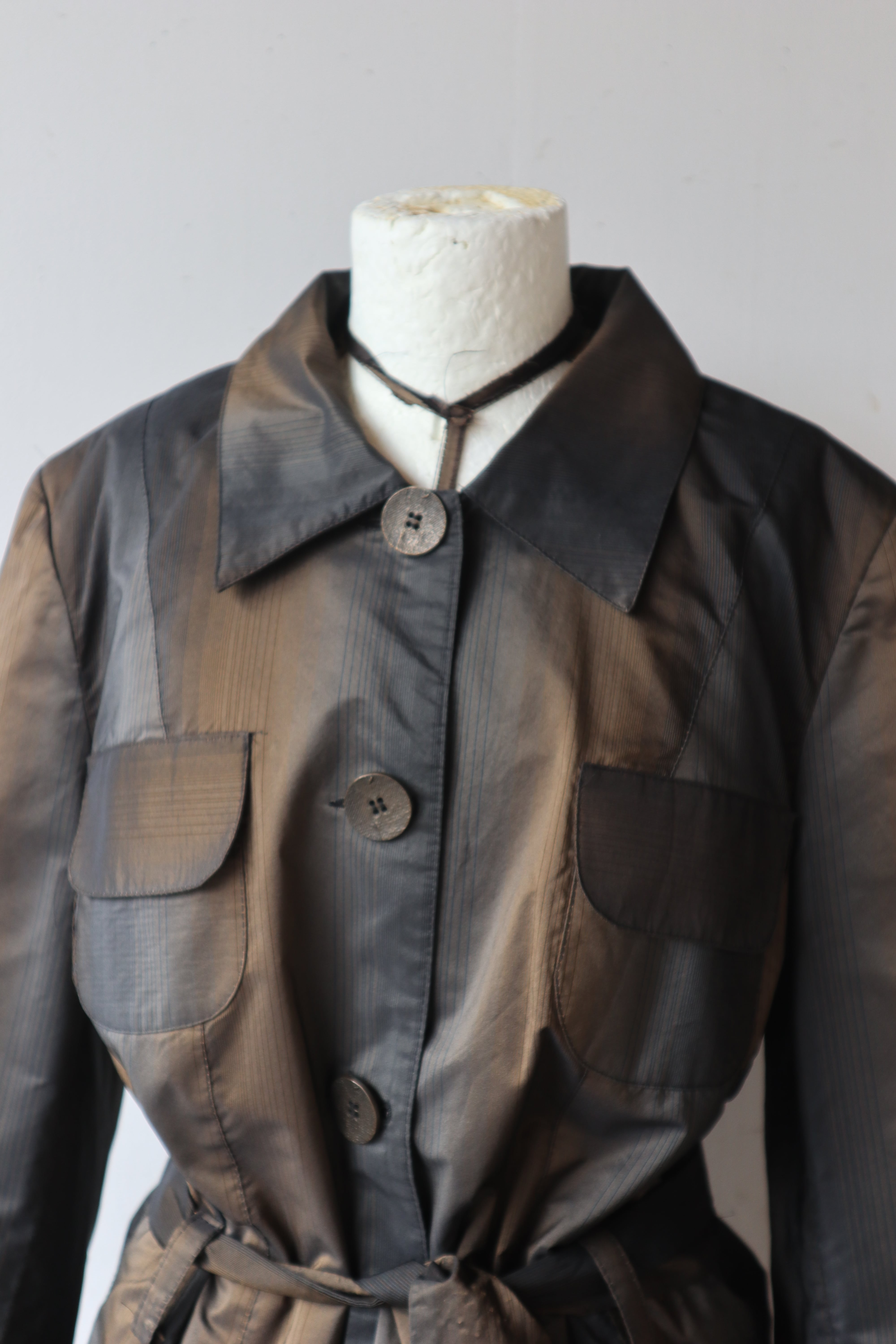 襟付きのデザイン、フロントのボタン、胸元の大きなフラップポケットが、トレンチコートやサファリジャケットのようなクラシックで機能的な雰囲気をプラス