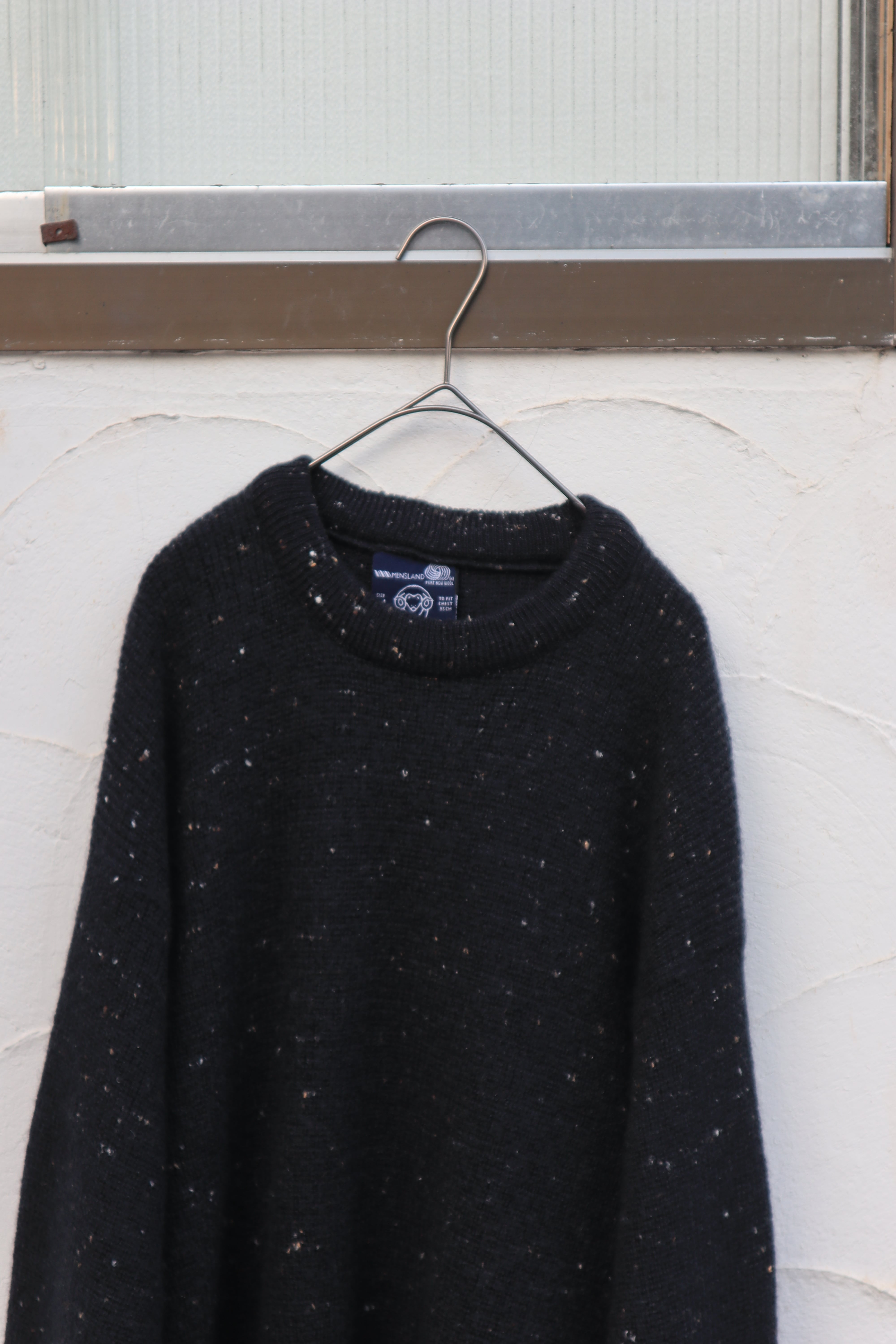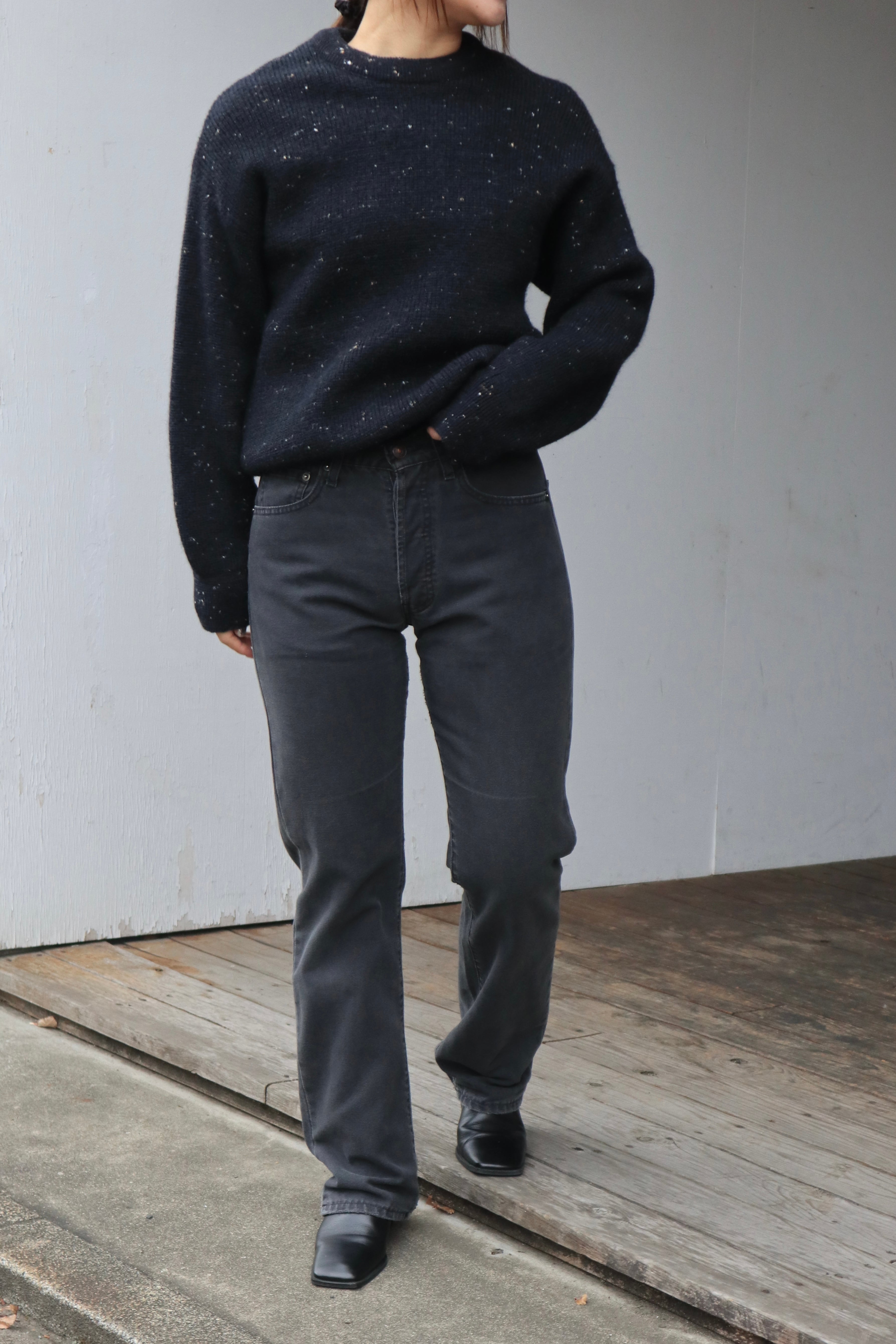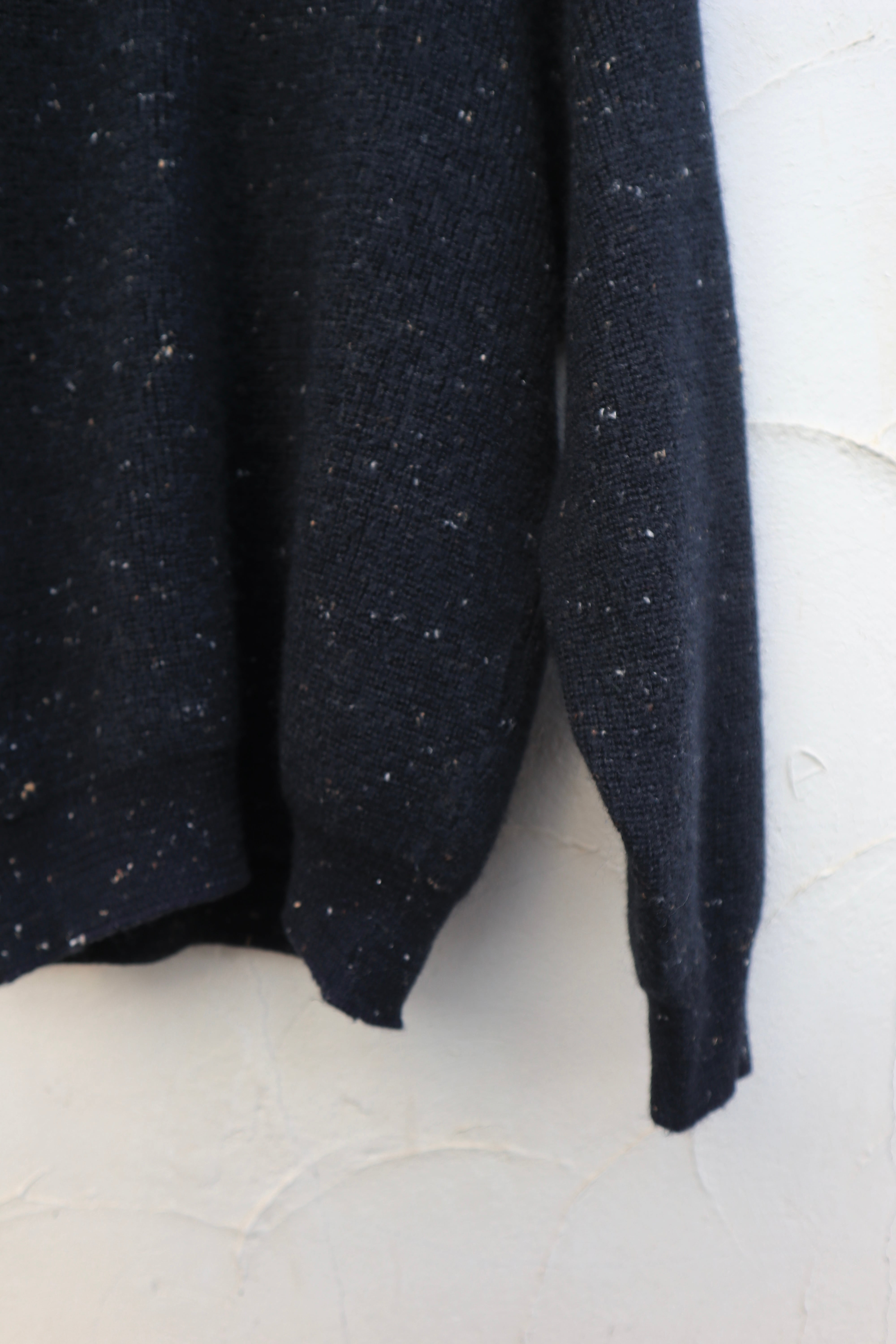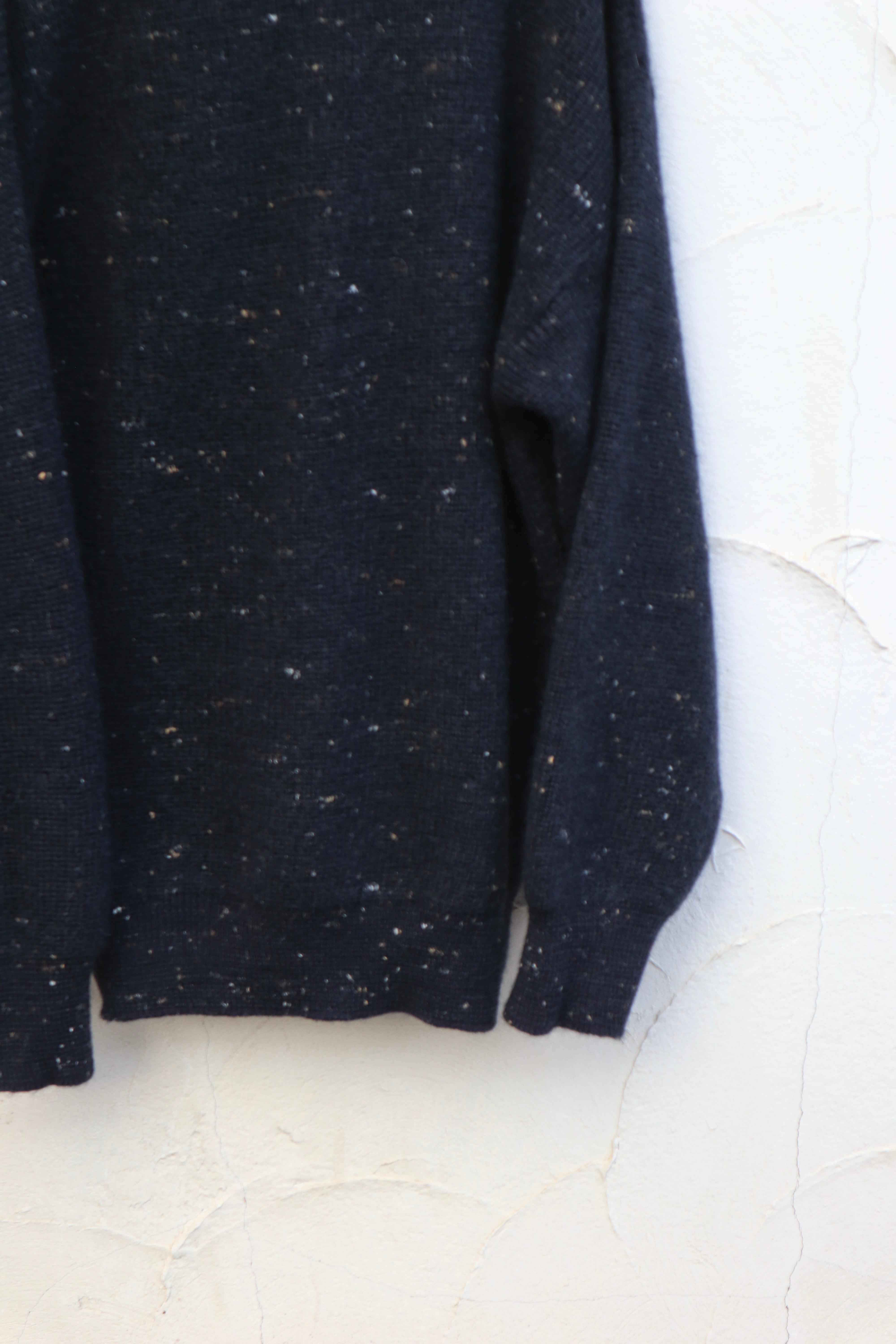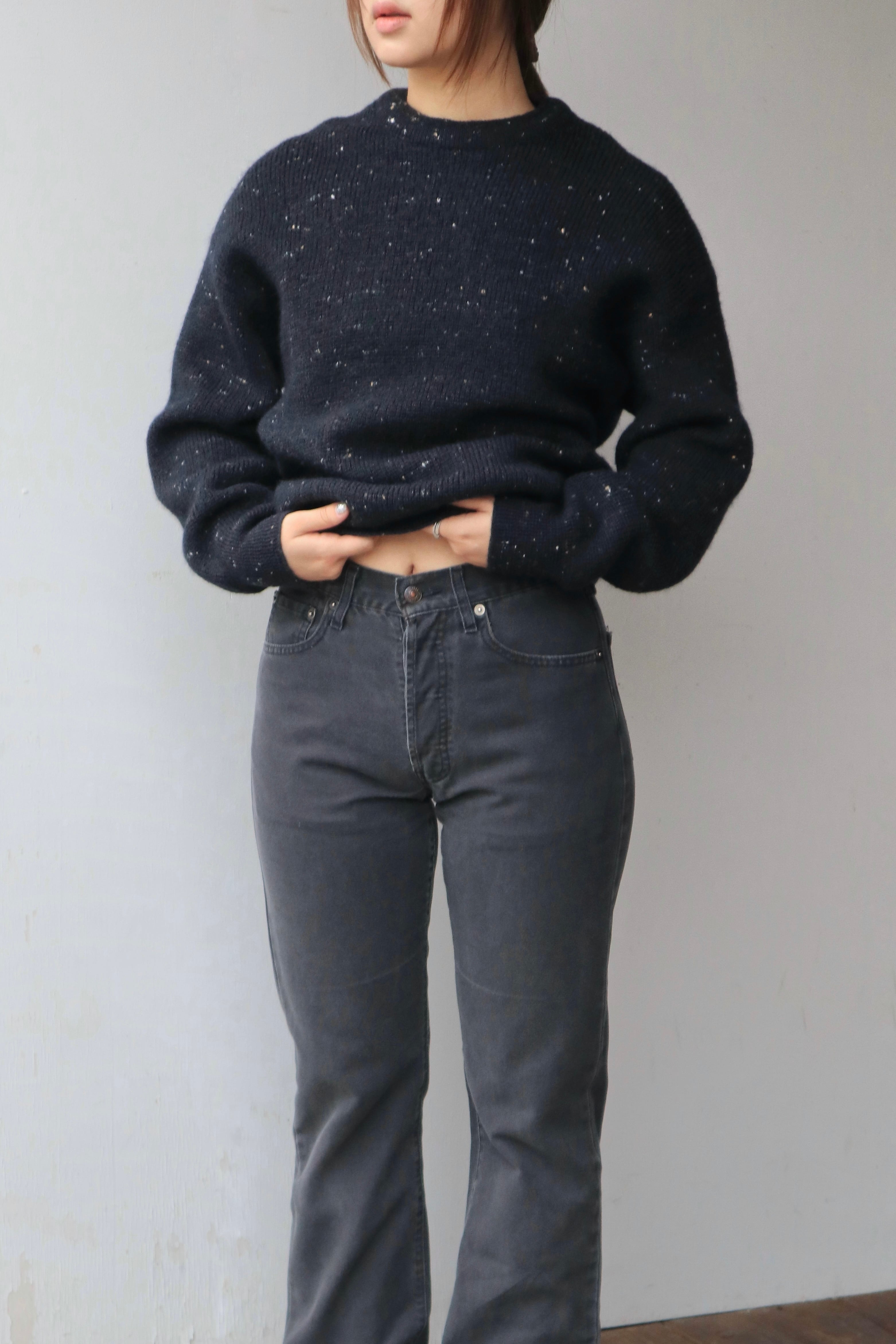 深いブラックのウールニットに、ネップのような細かな糸が散り、ラメは入っていないのに光を受けてほのかにきらめく一着
