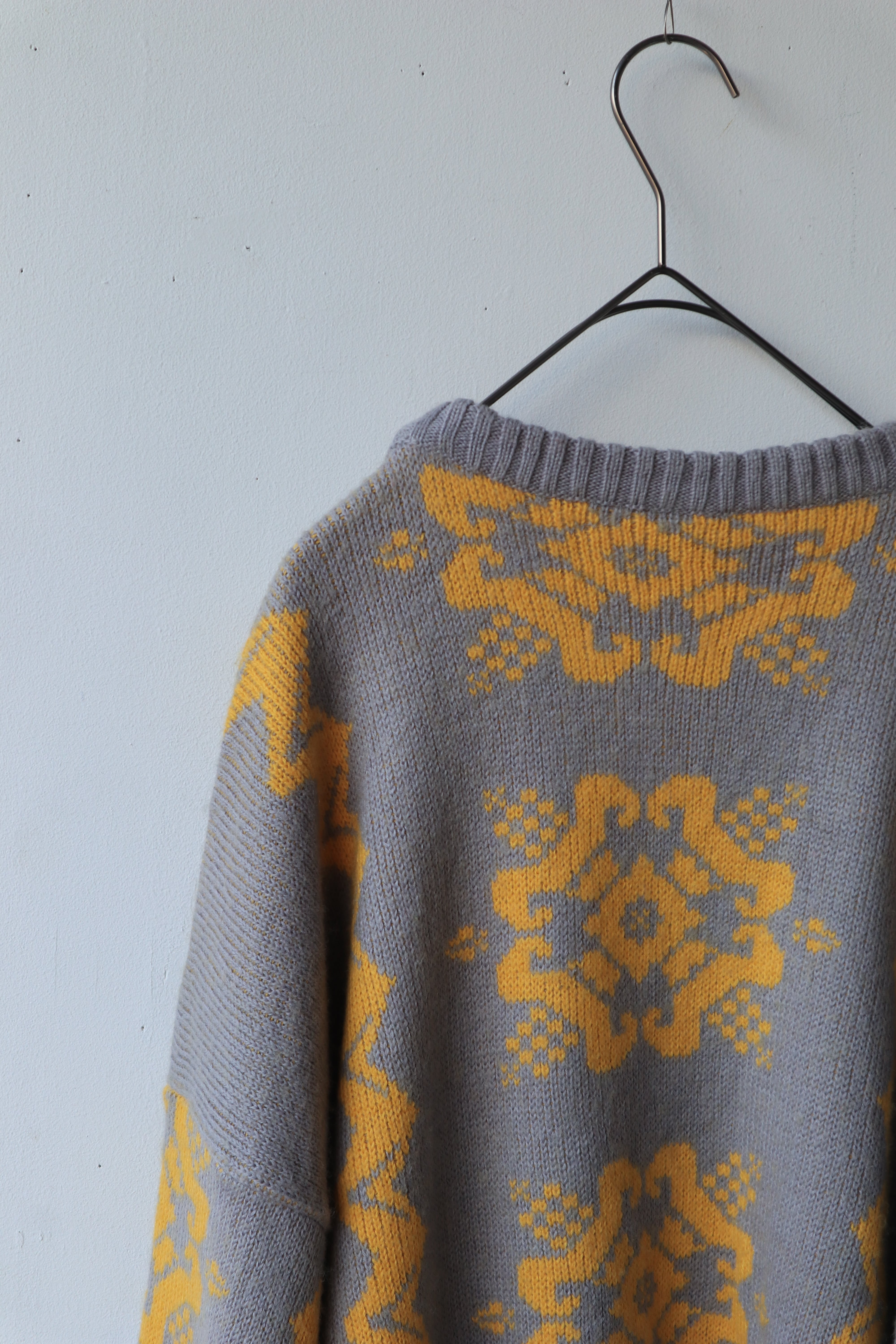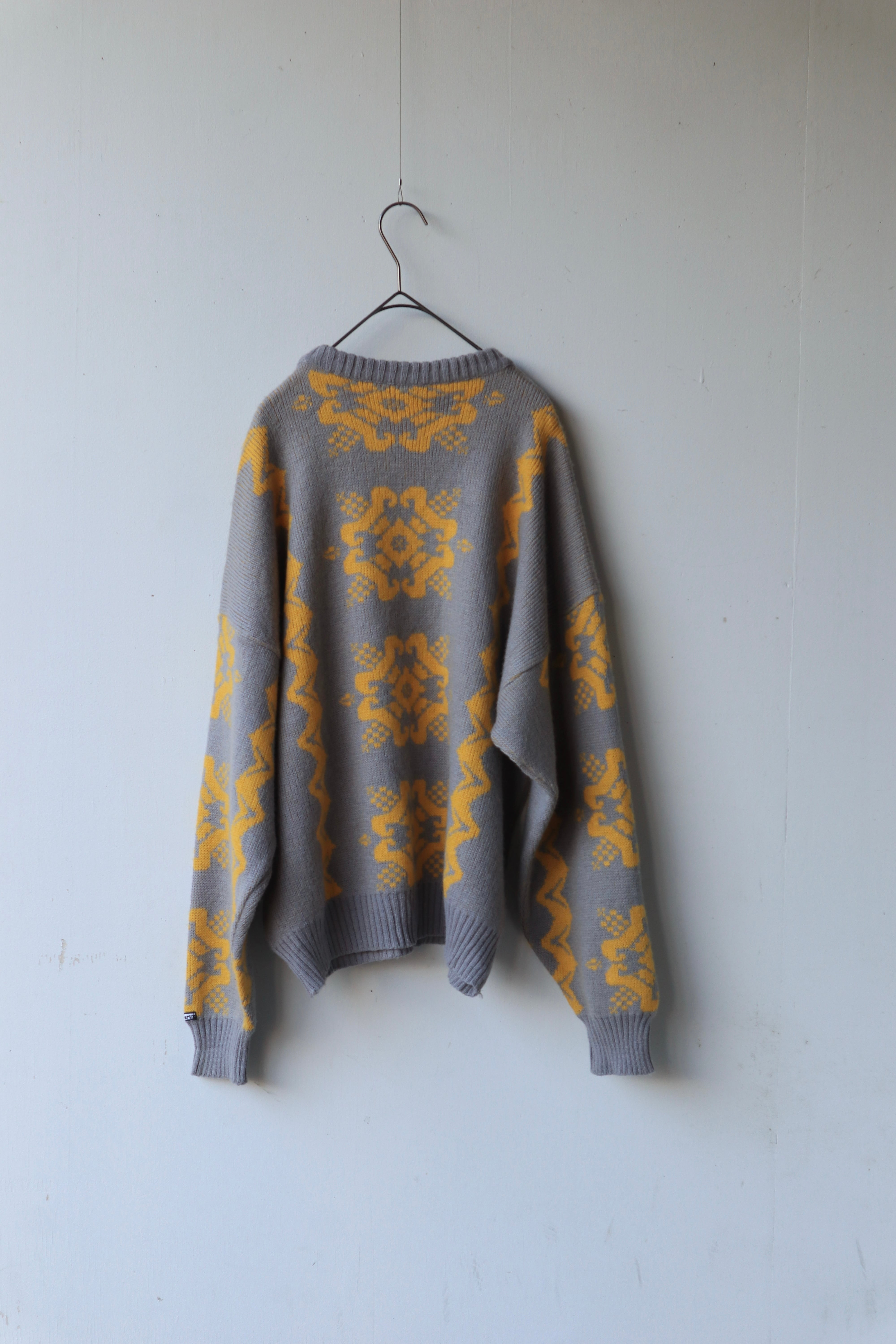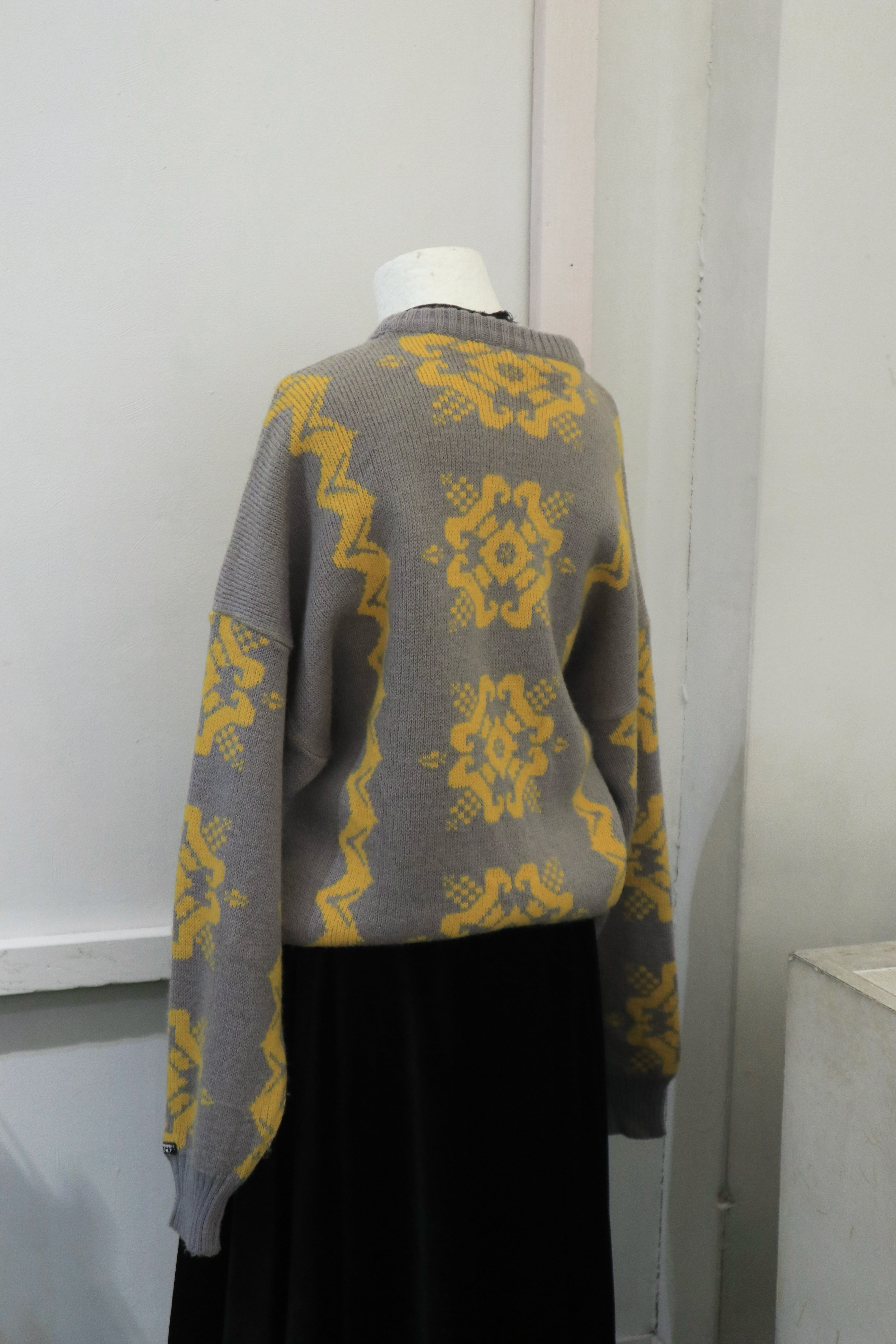 グレーをベースに、イエローのジオメトリックフラワー柄が映える、90年代らしいムードの一枚です
