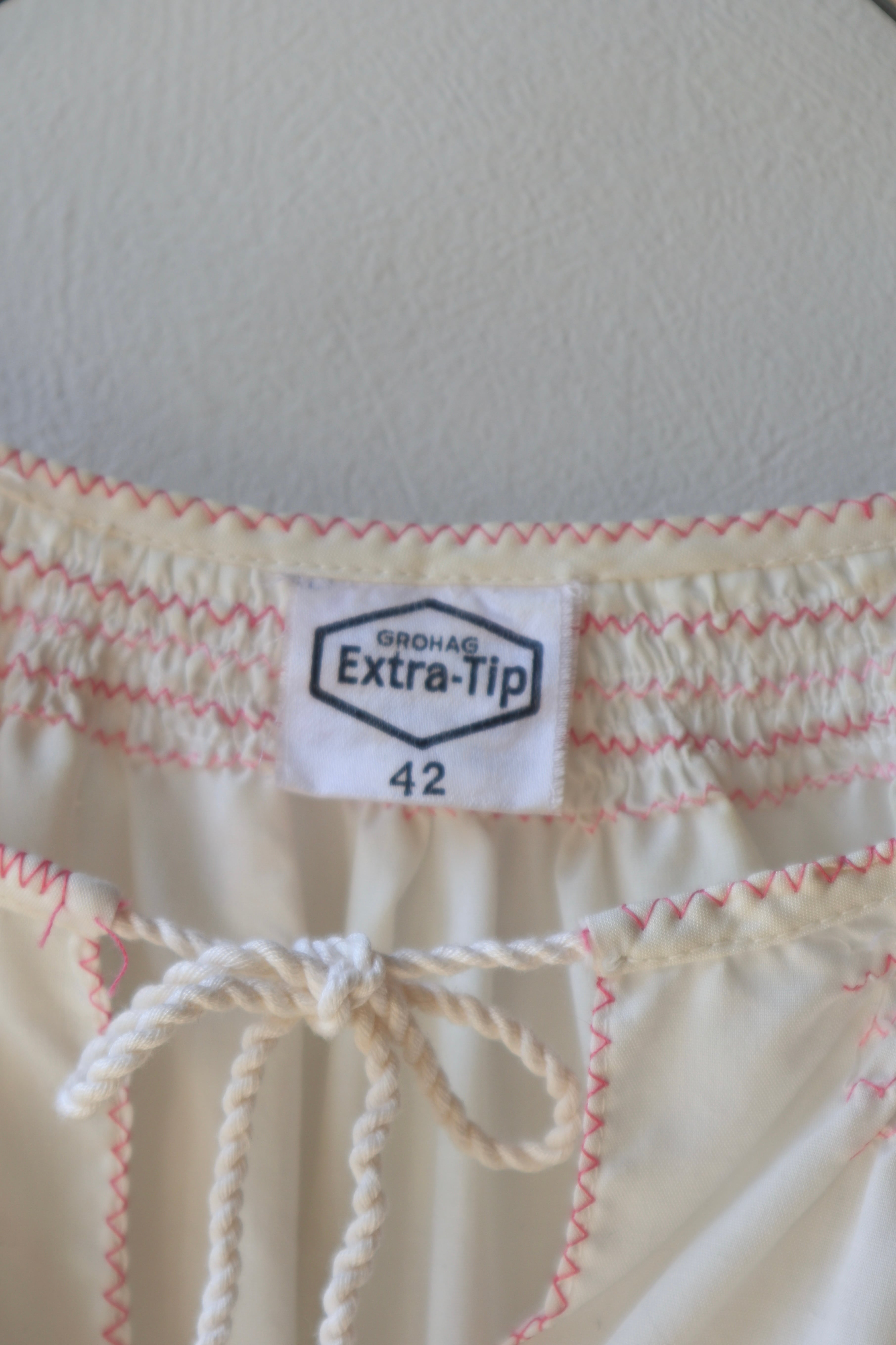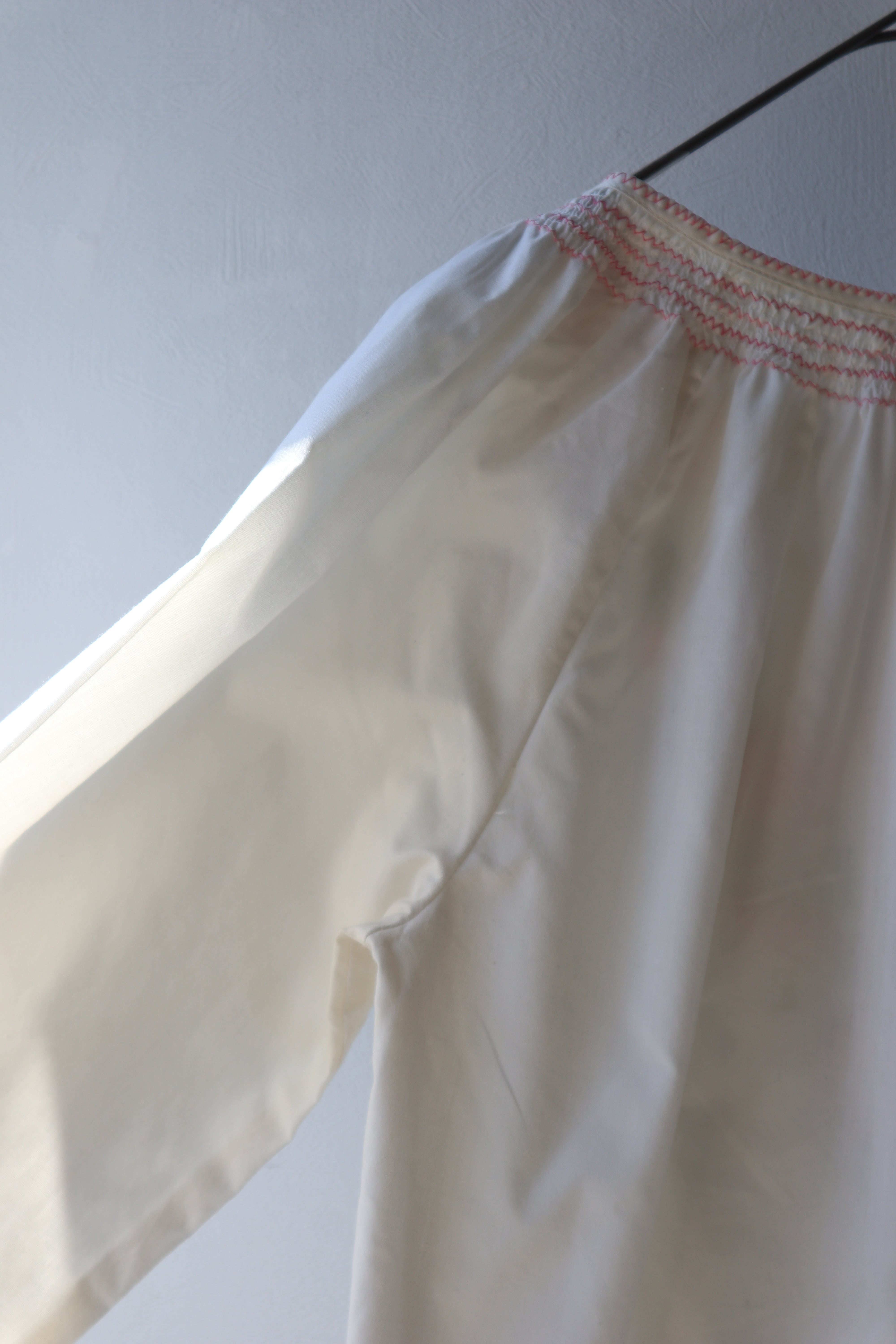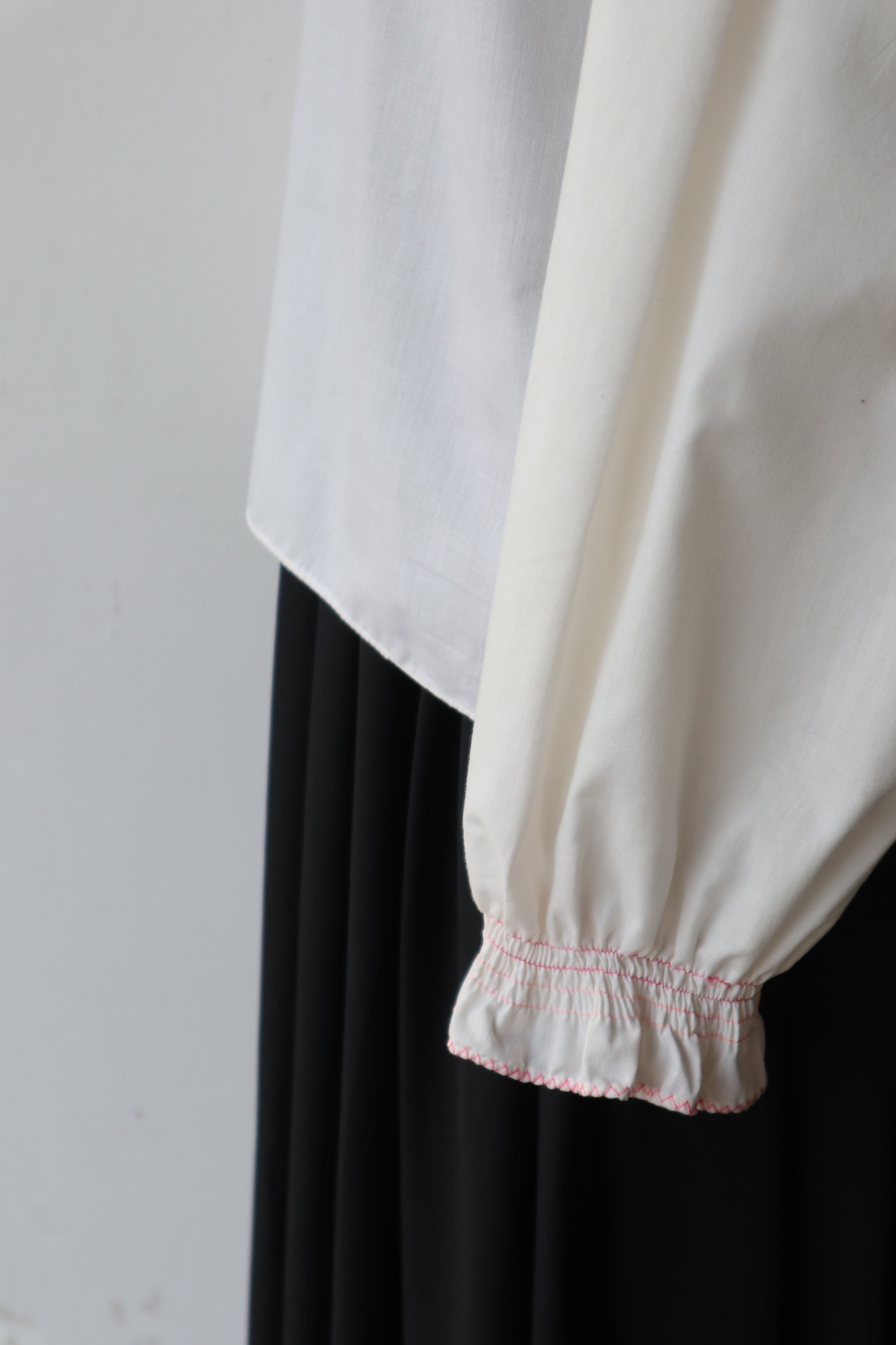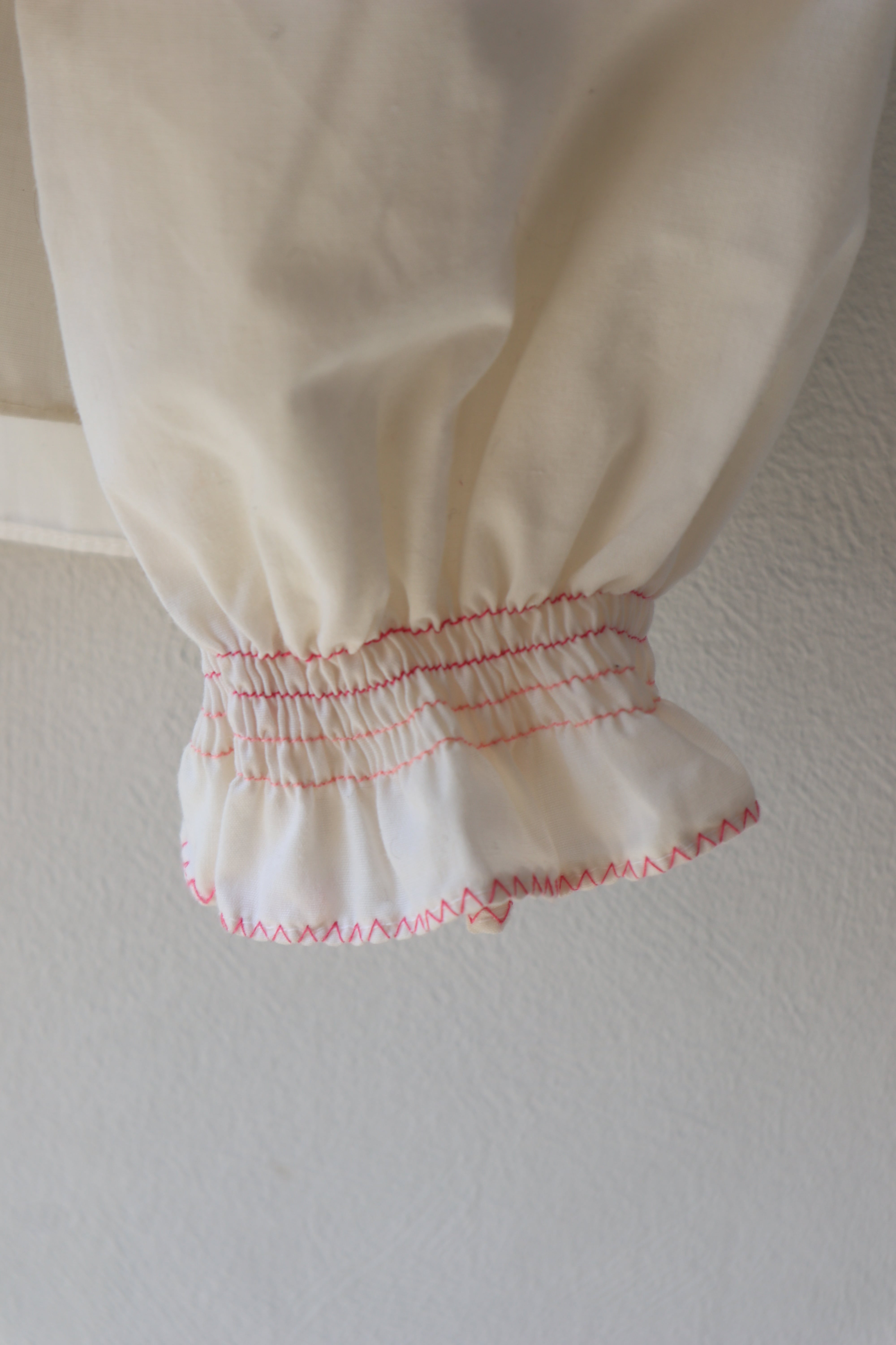 縁を彩るピンクのジグザグステッチが目を引く一着。