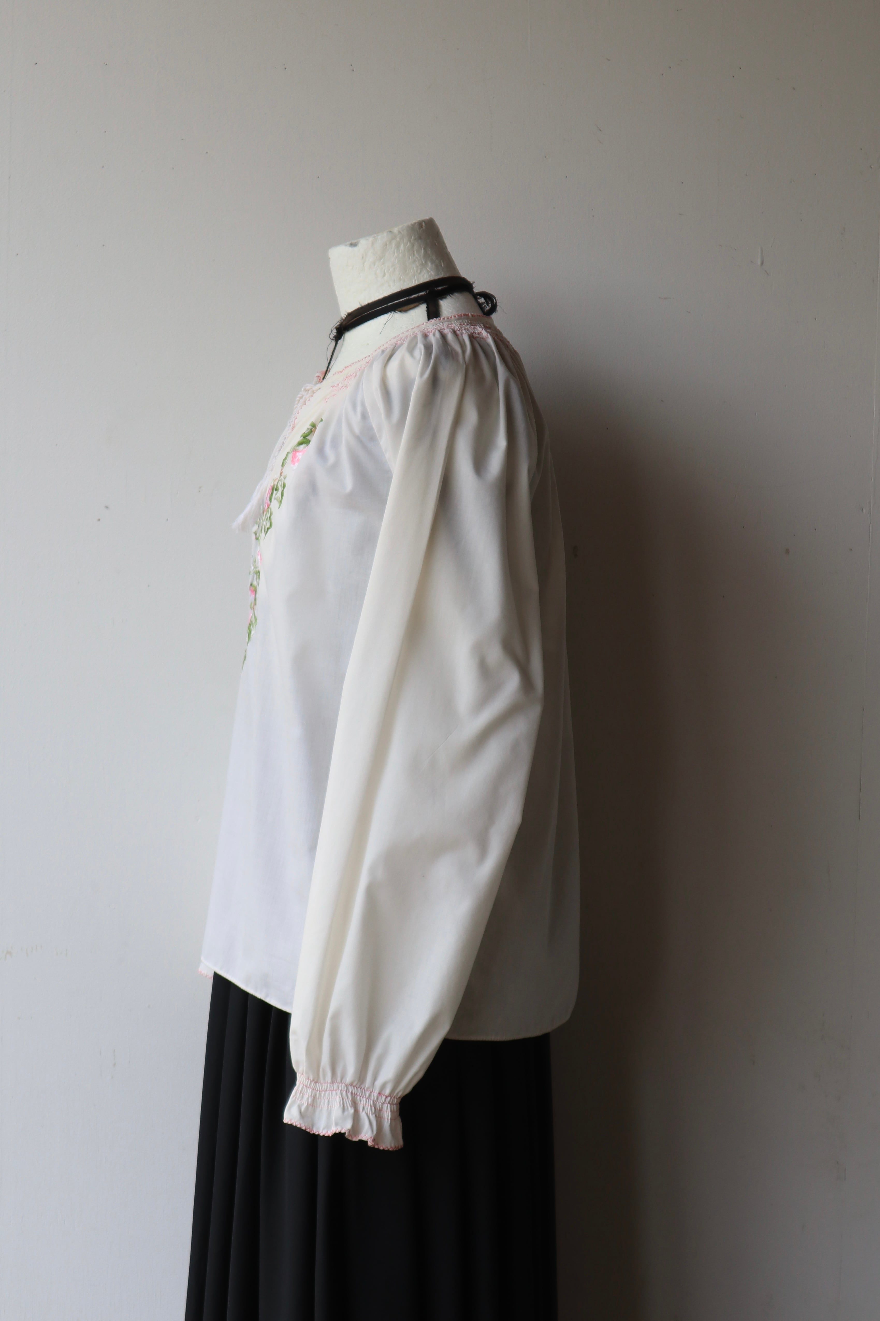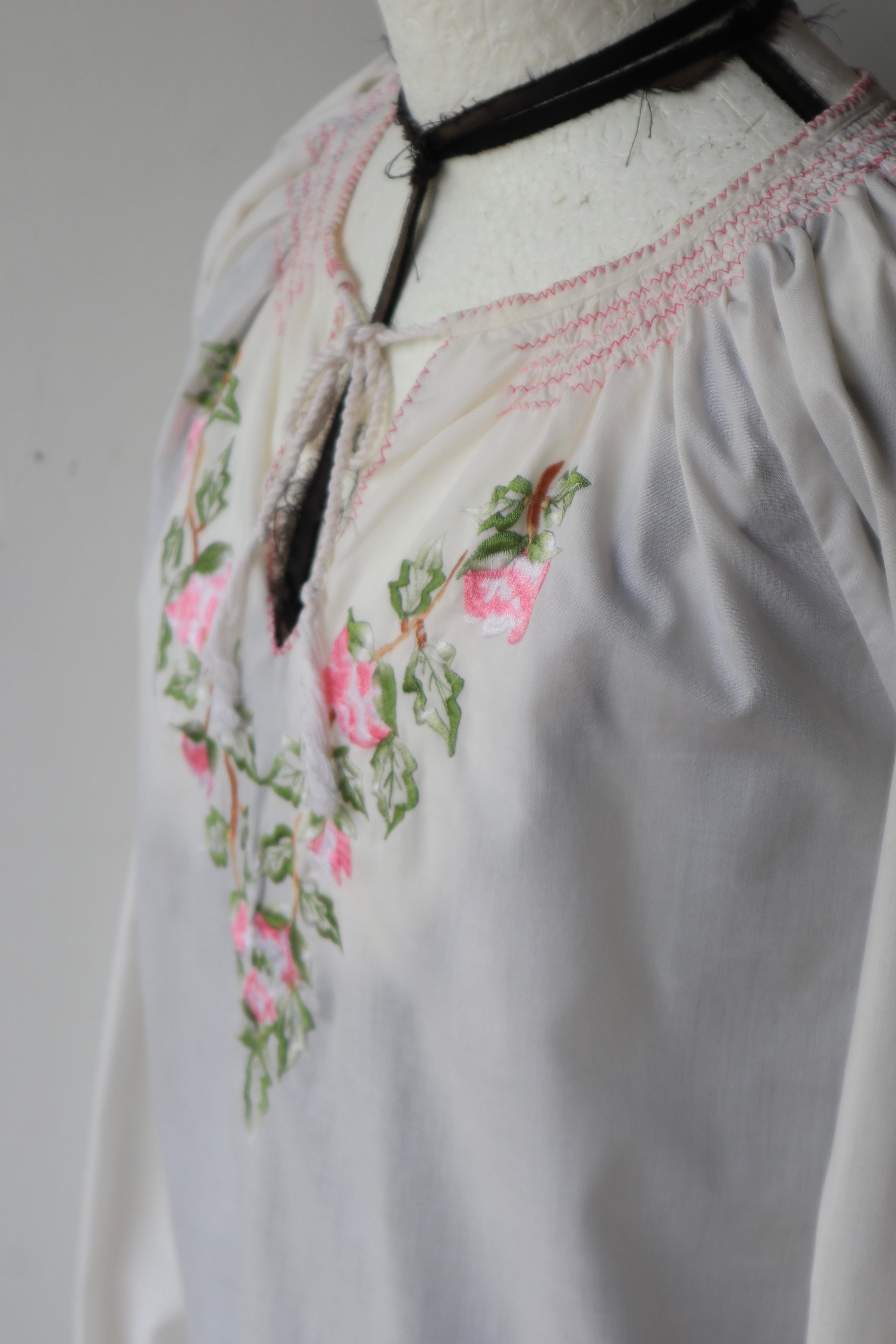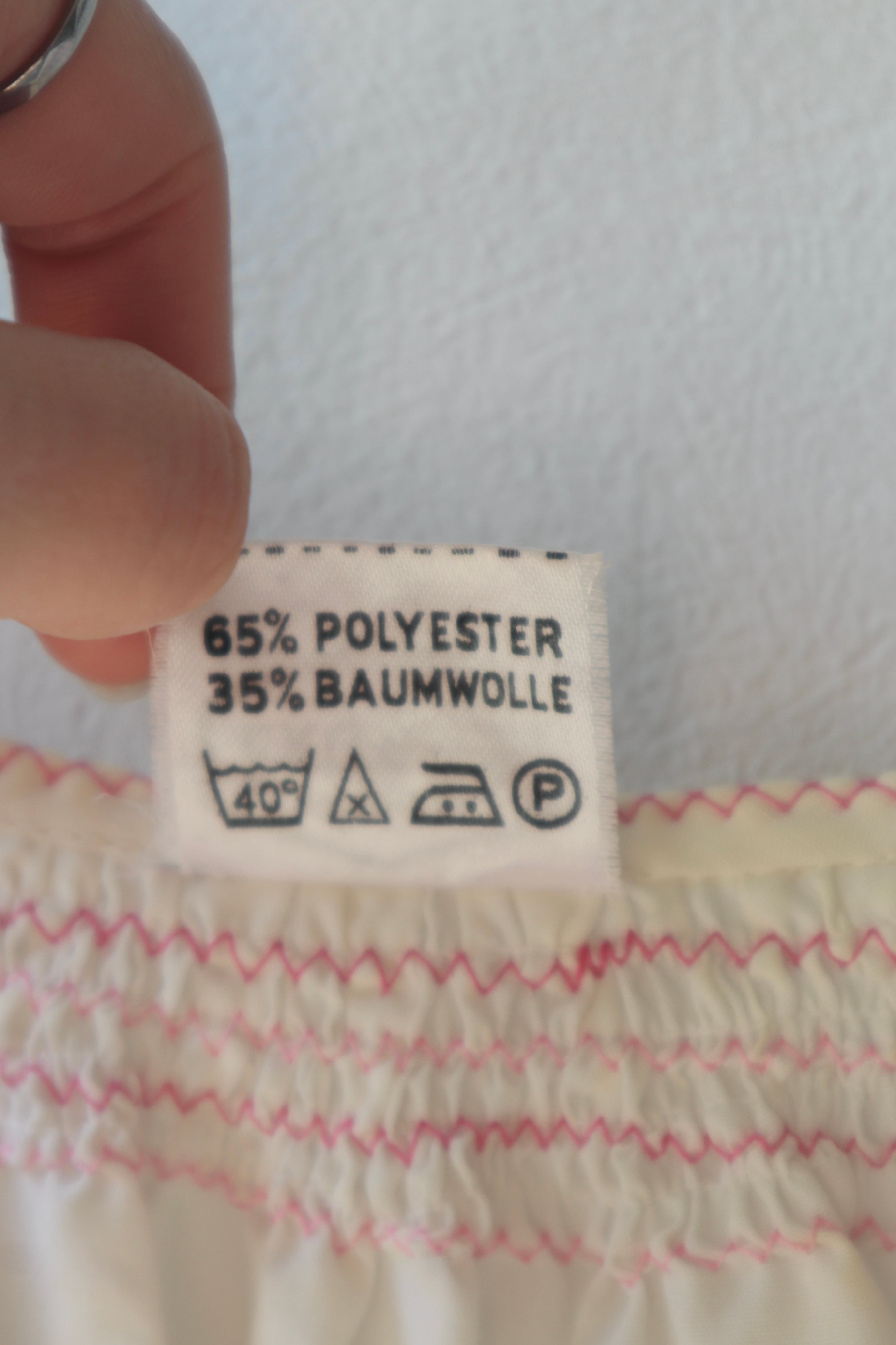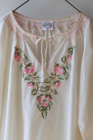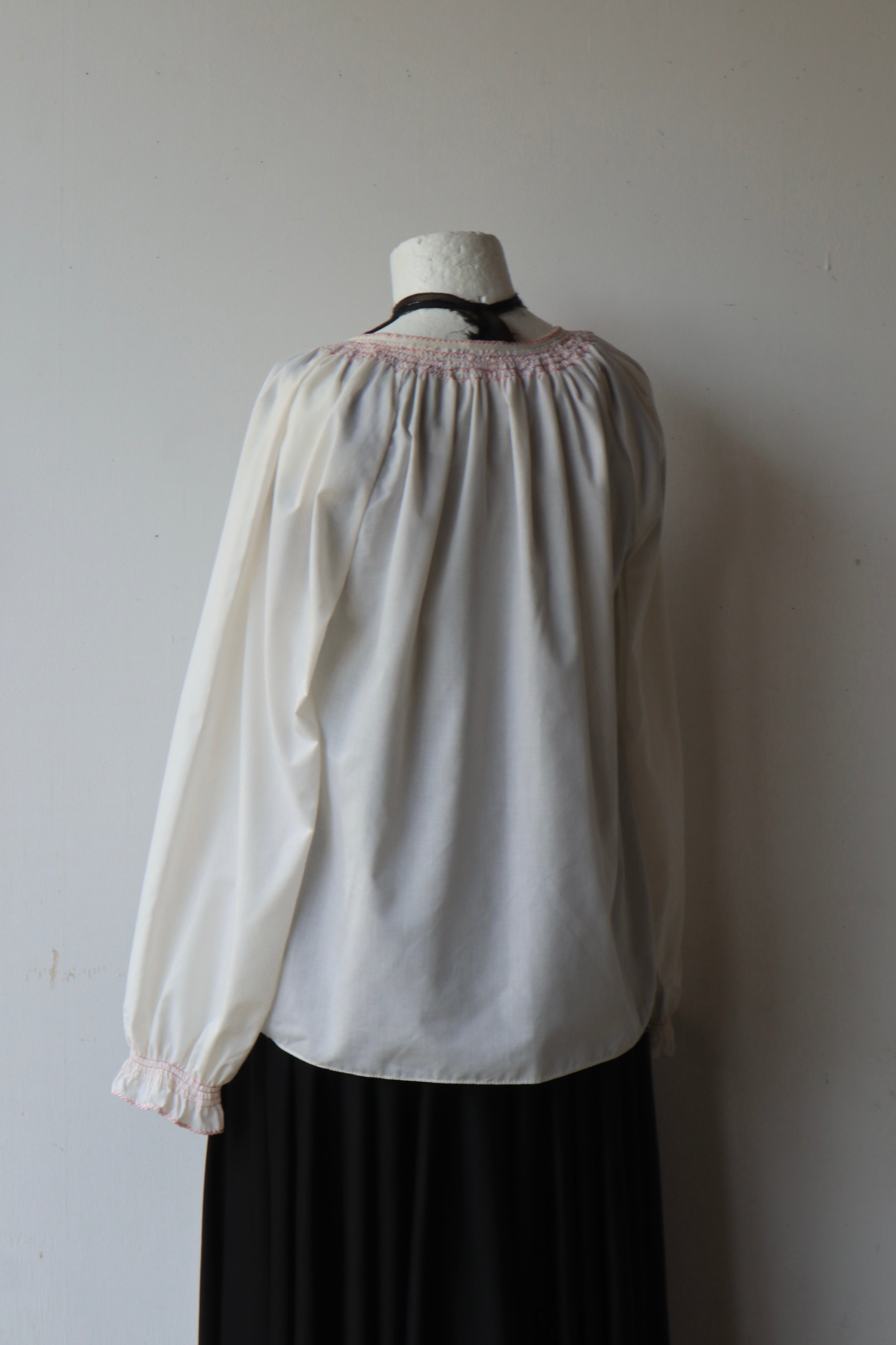 縁を彩るピンクのジグザグステッチが目を引く一着。