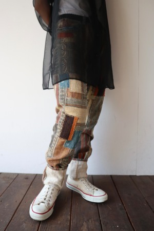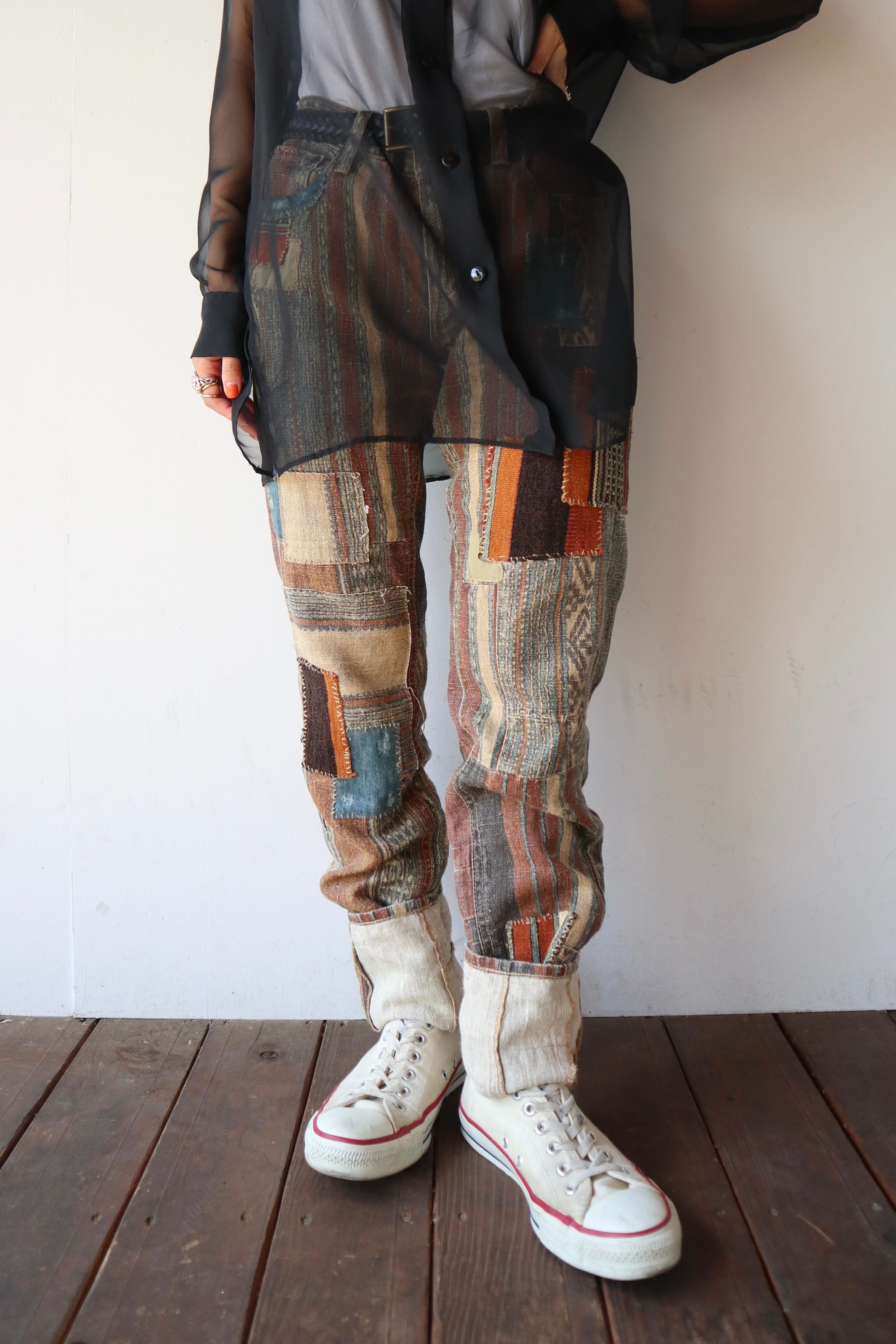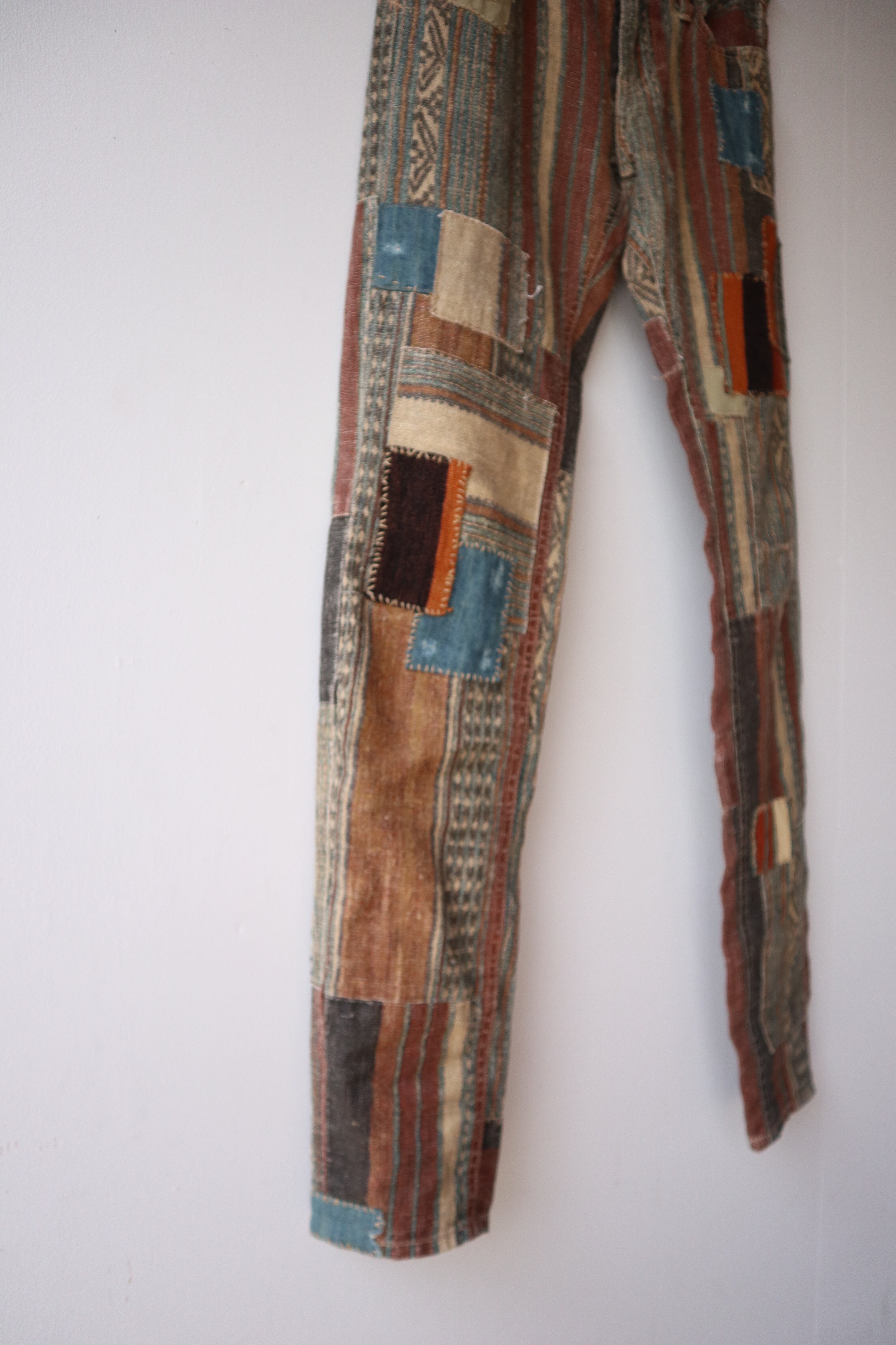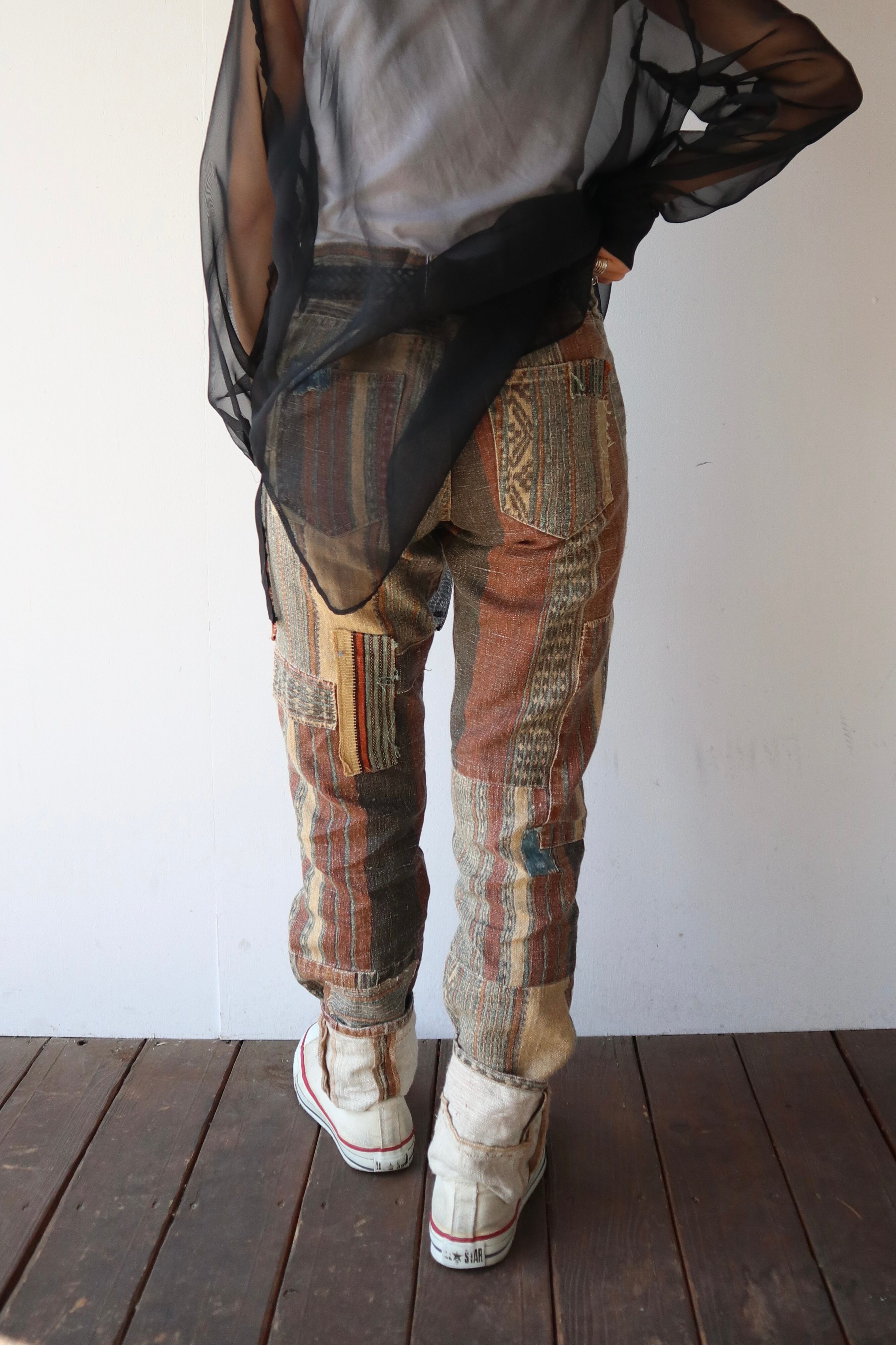 パッチワークのようなつぎはぎされたデザイン性の高い細身のパンツ