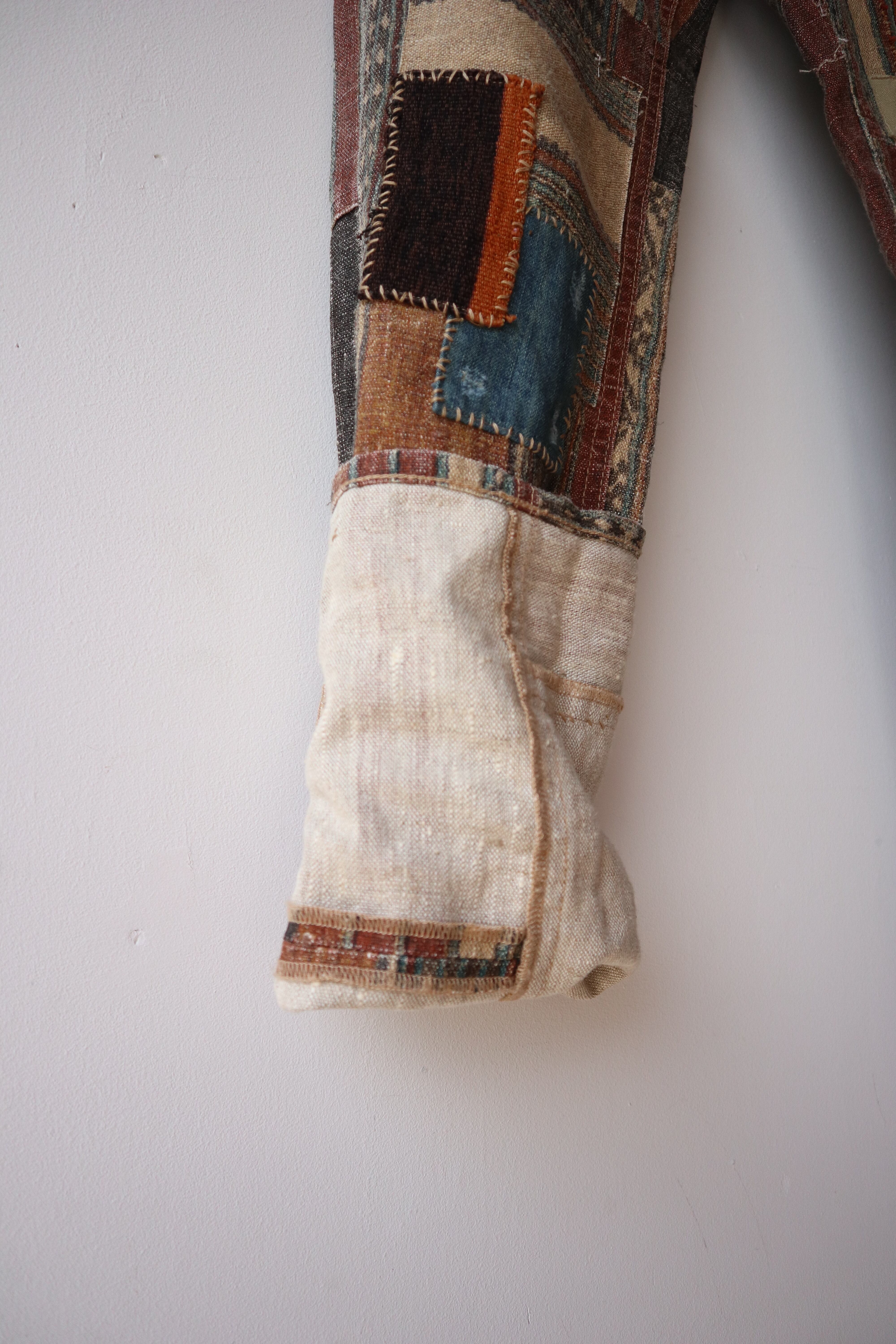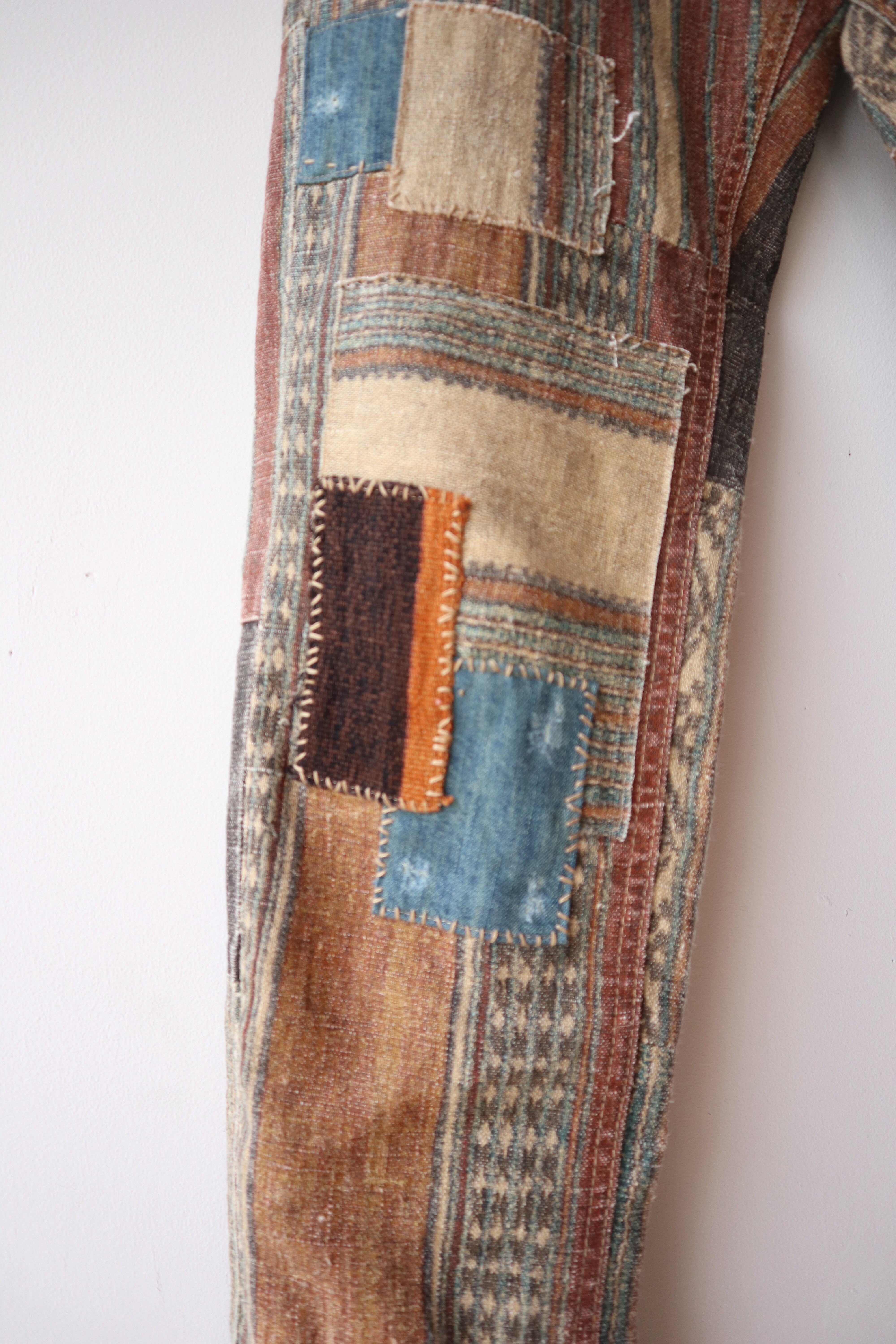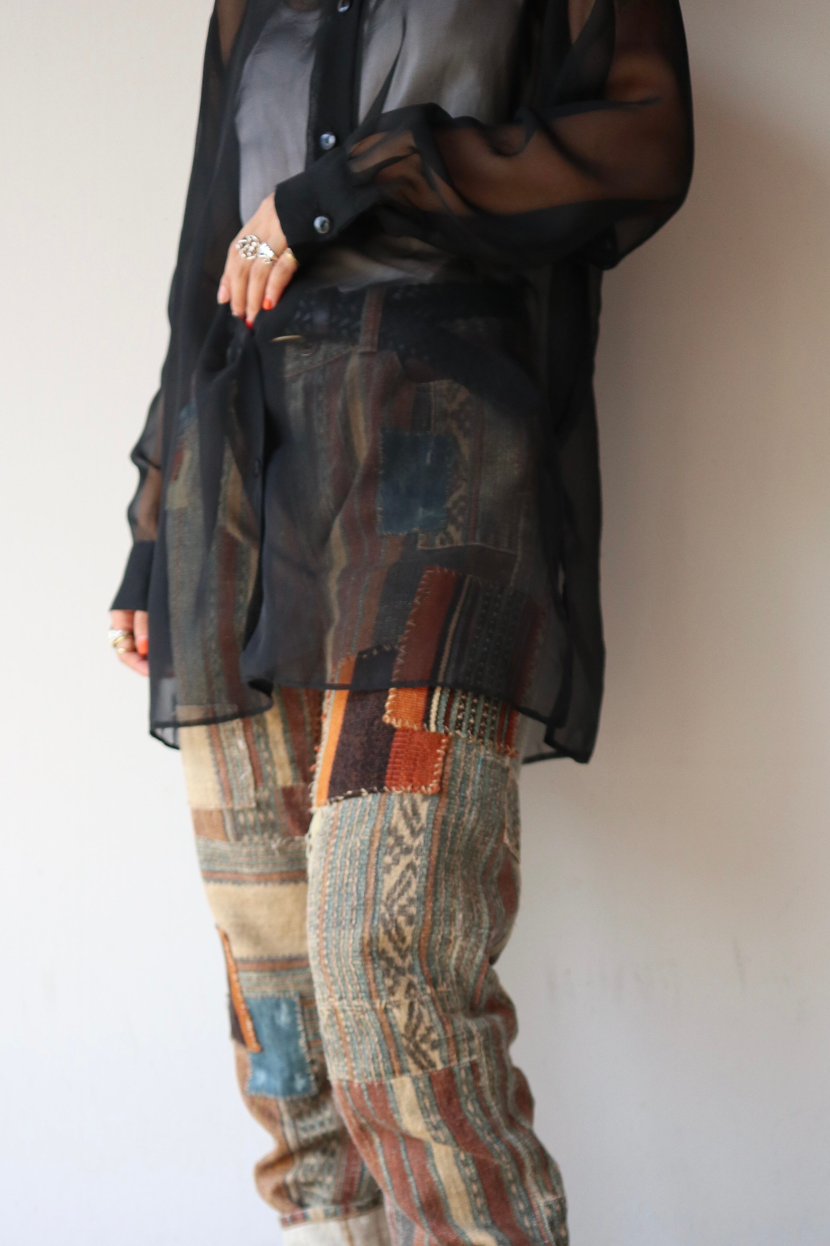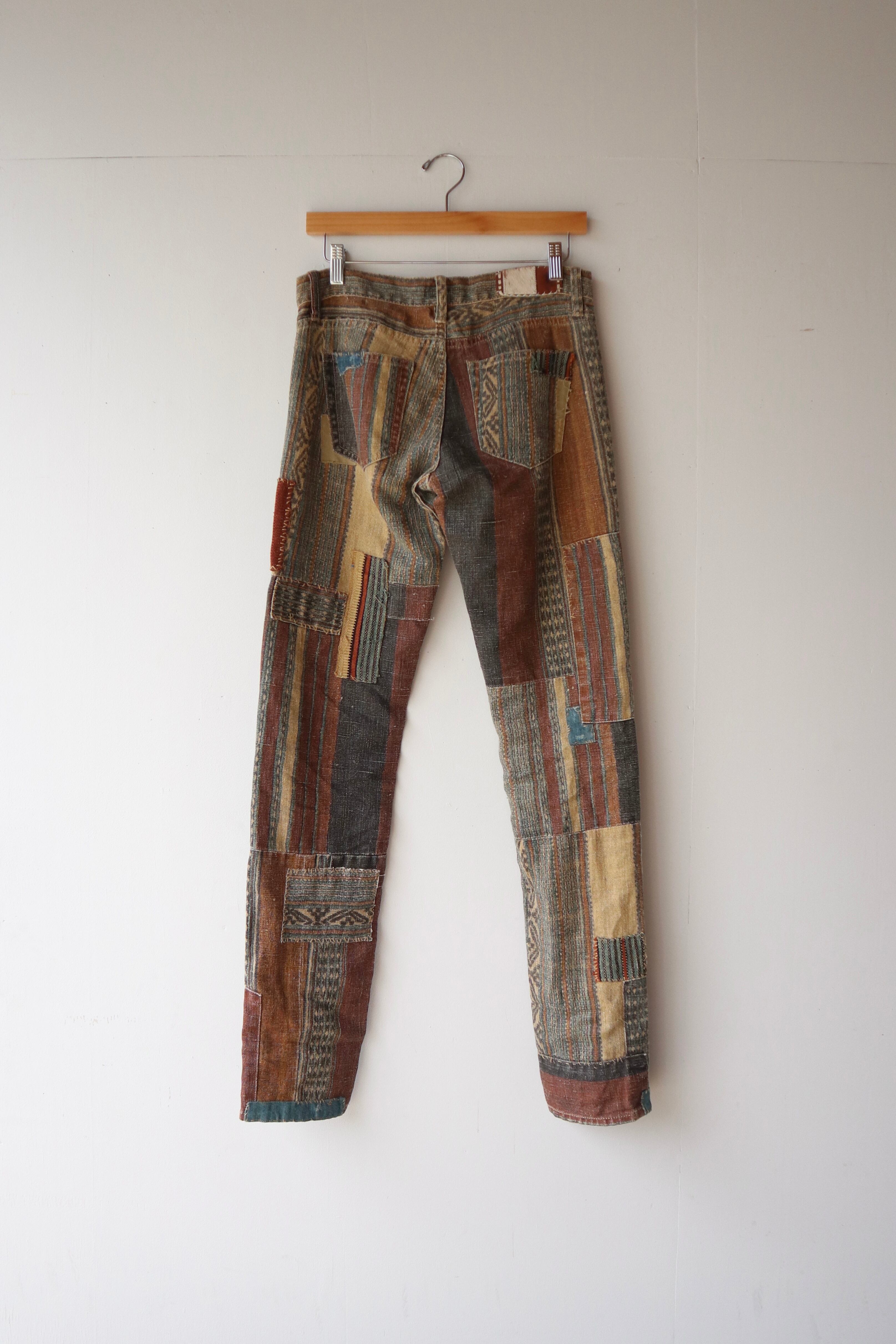 パッチワークのようなつぎはぎされたデザイン性の高い細身のパンツ