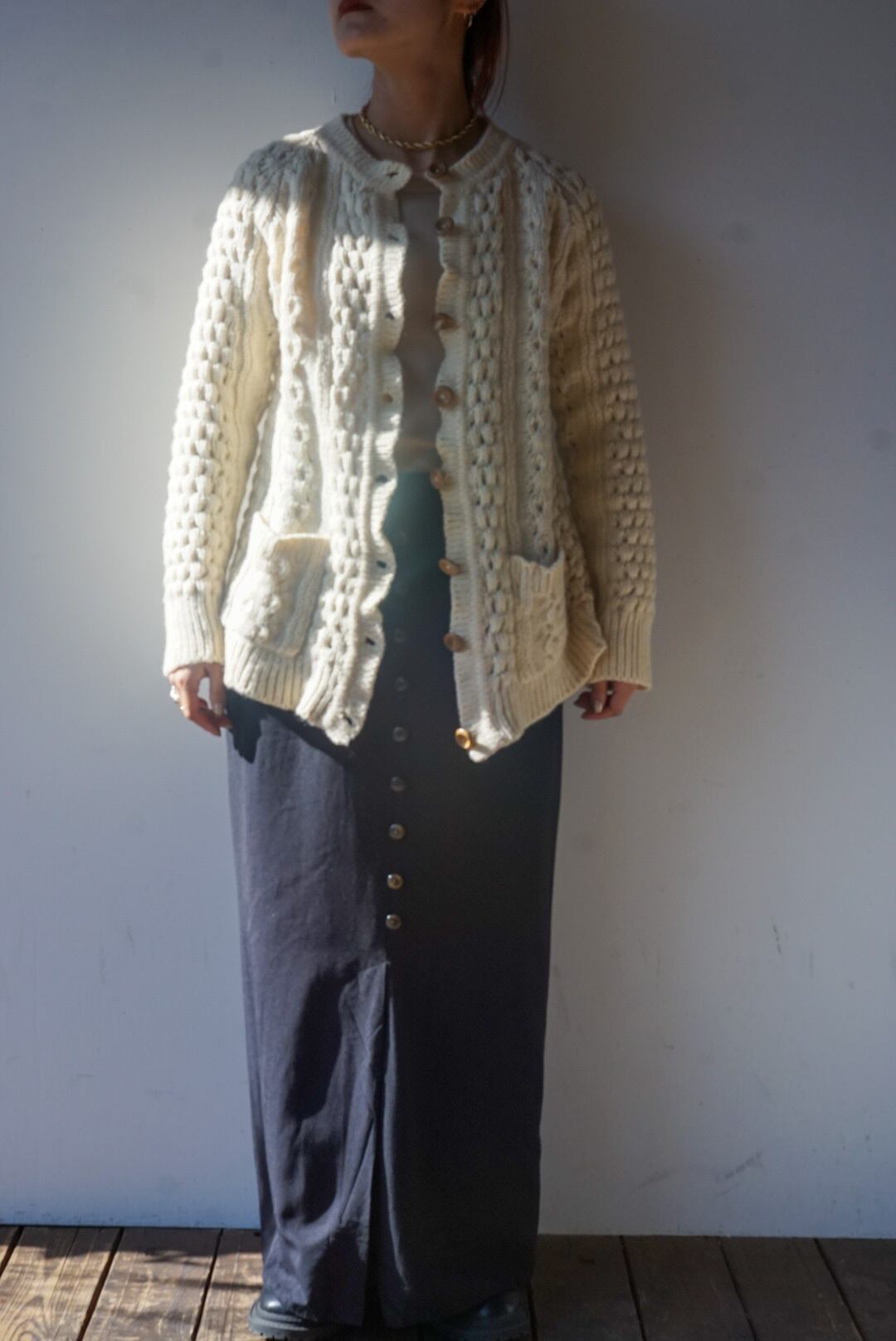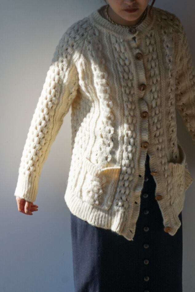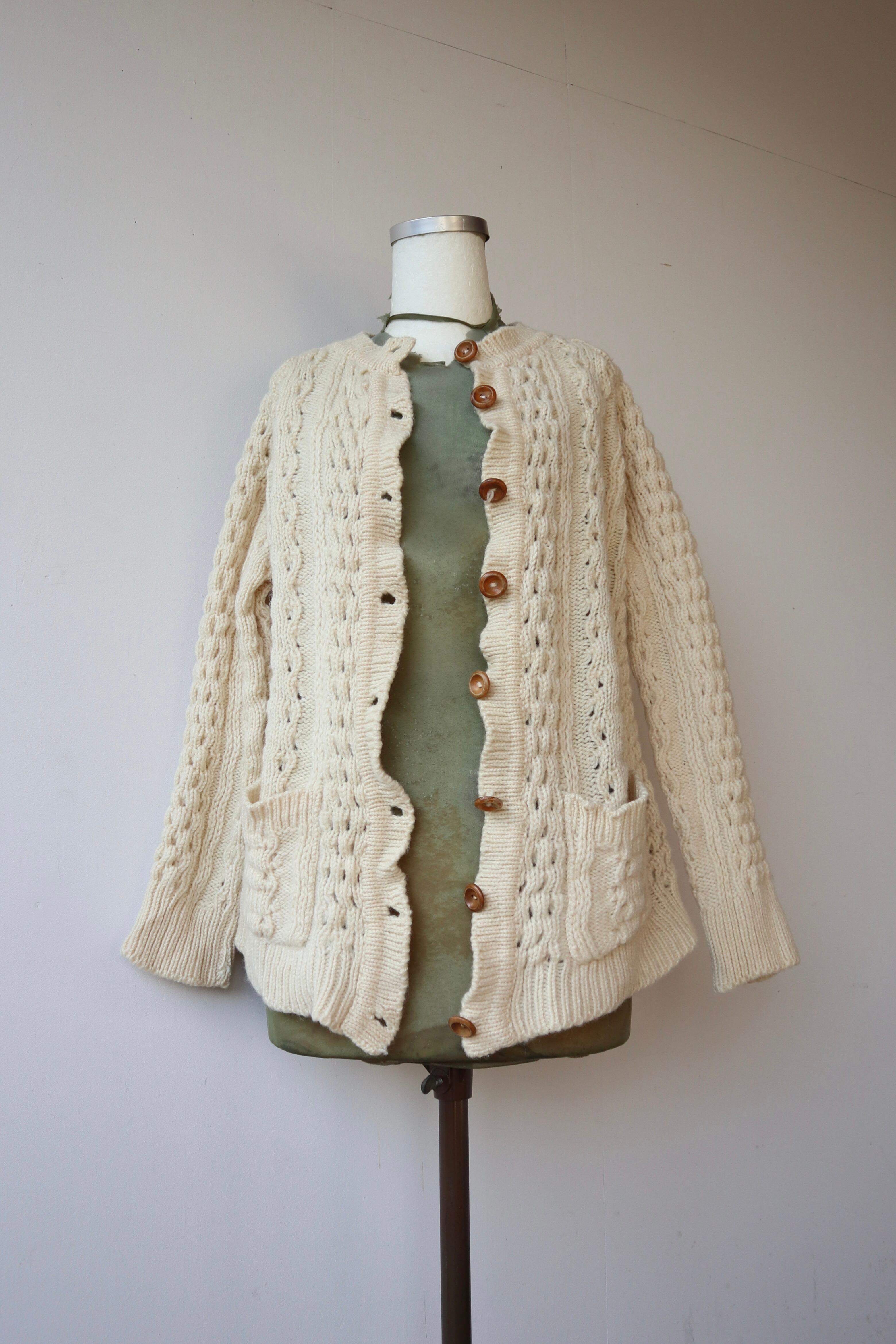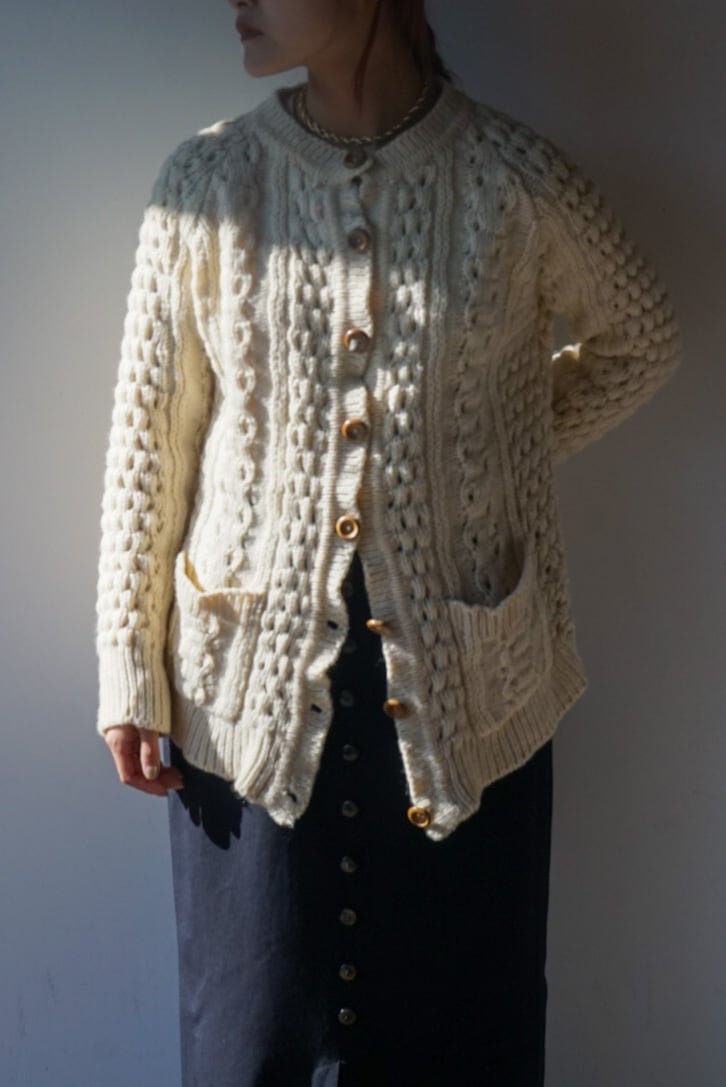 様々なスタイルに馴染みやすく、ウッドボタンが可愛らしい透かし編みのようなデザイン
