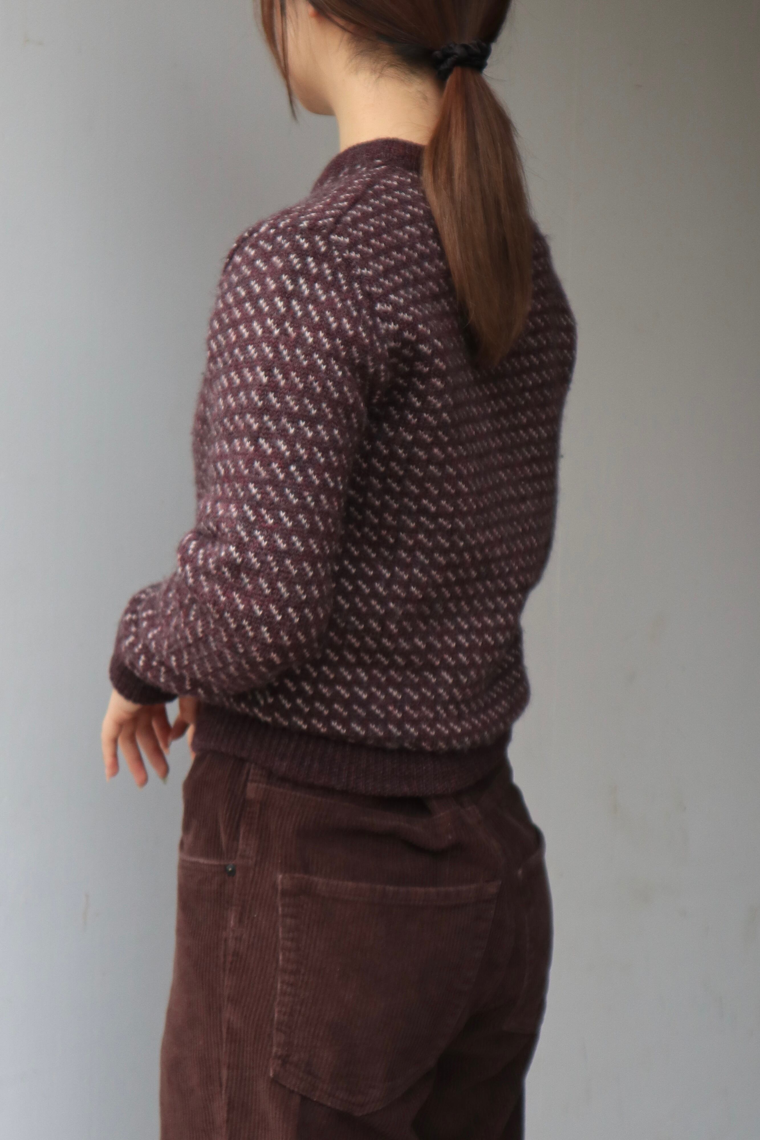 少し赤みのあるブラウンカラーに、細かなバーズアイ調の編み柄が映えるウールニットセーター