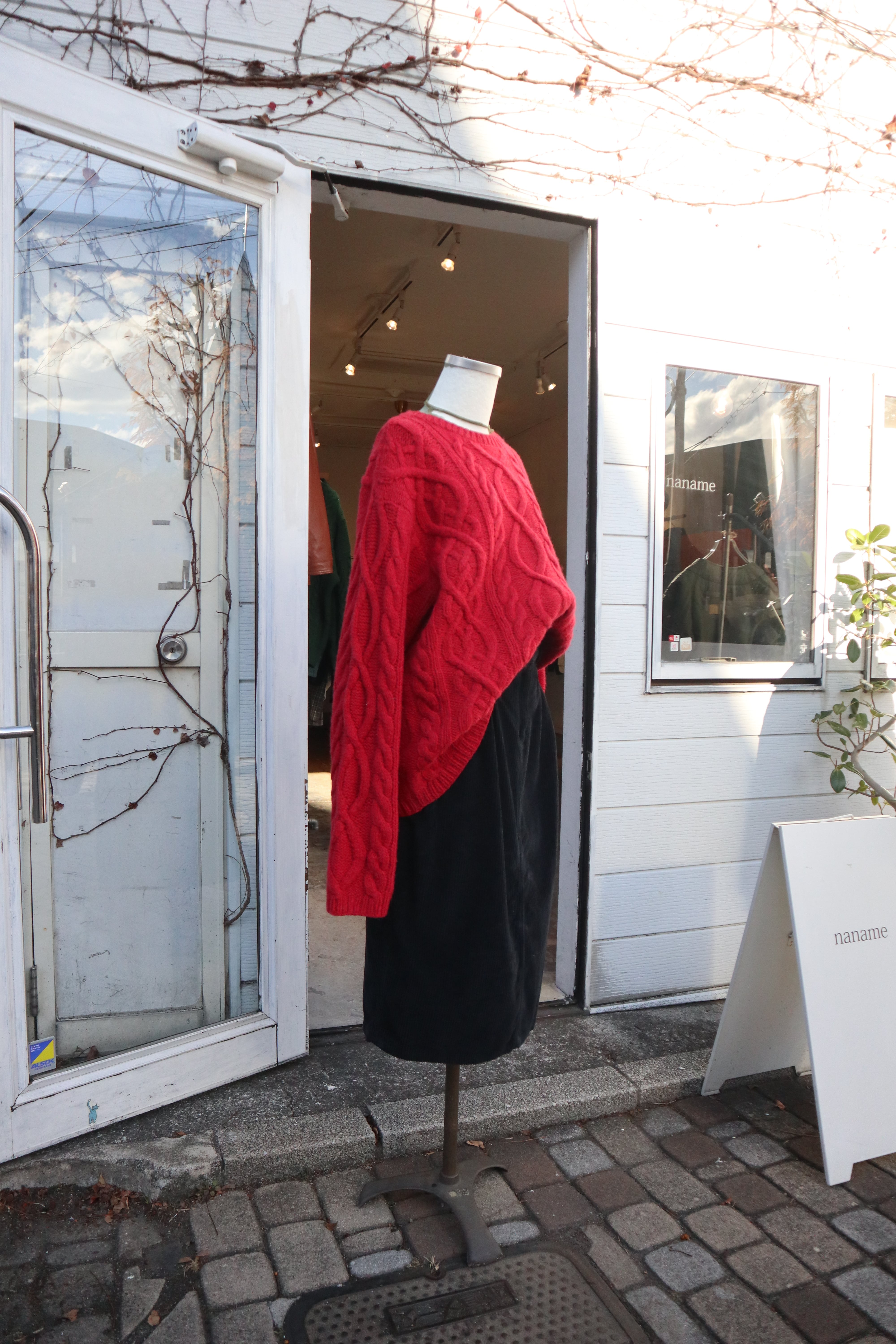 ゆったりサイズでインナーなども着込みやすく鮮やかなレッドカラーやケーブル編み模様がポイントになります