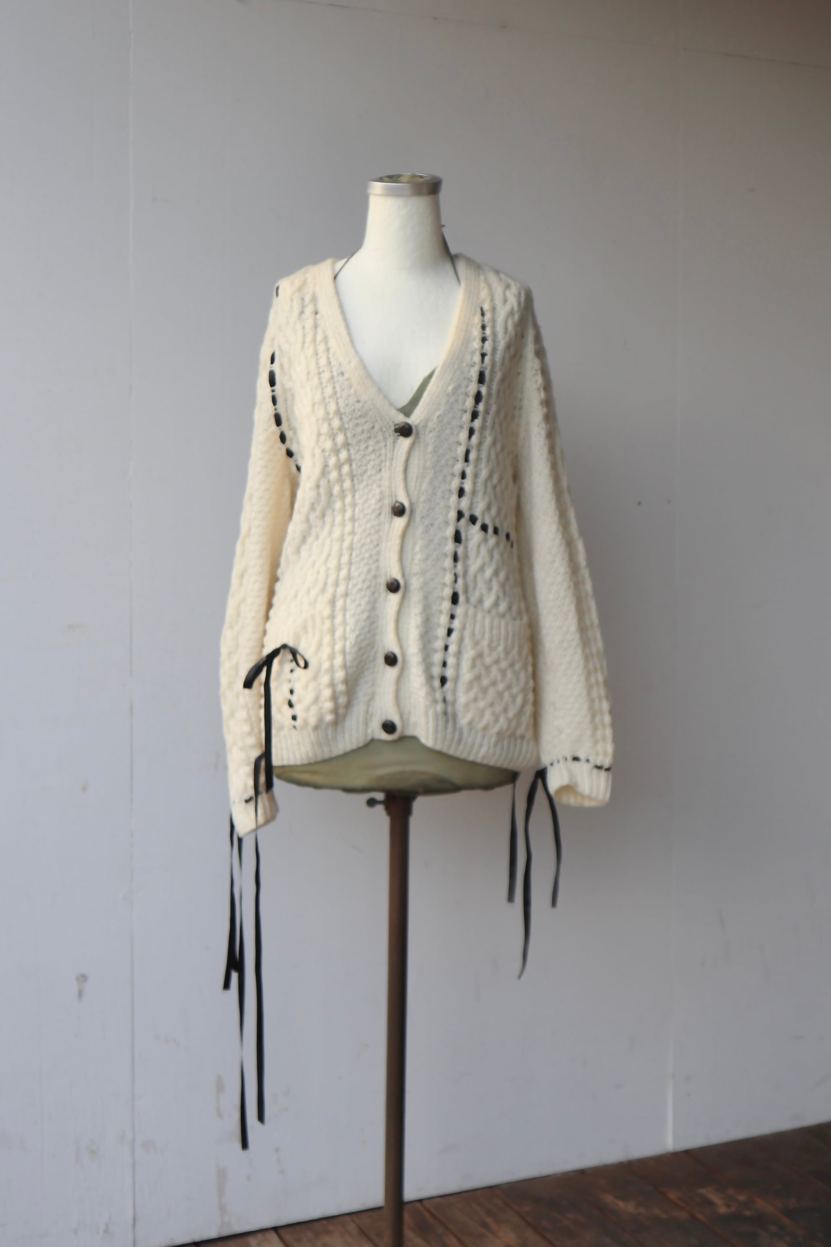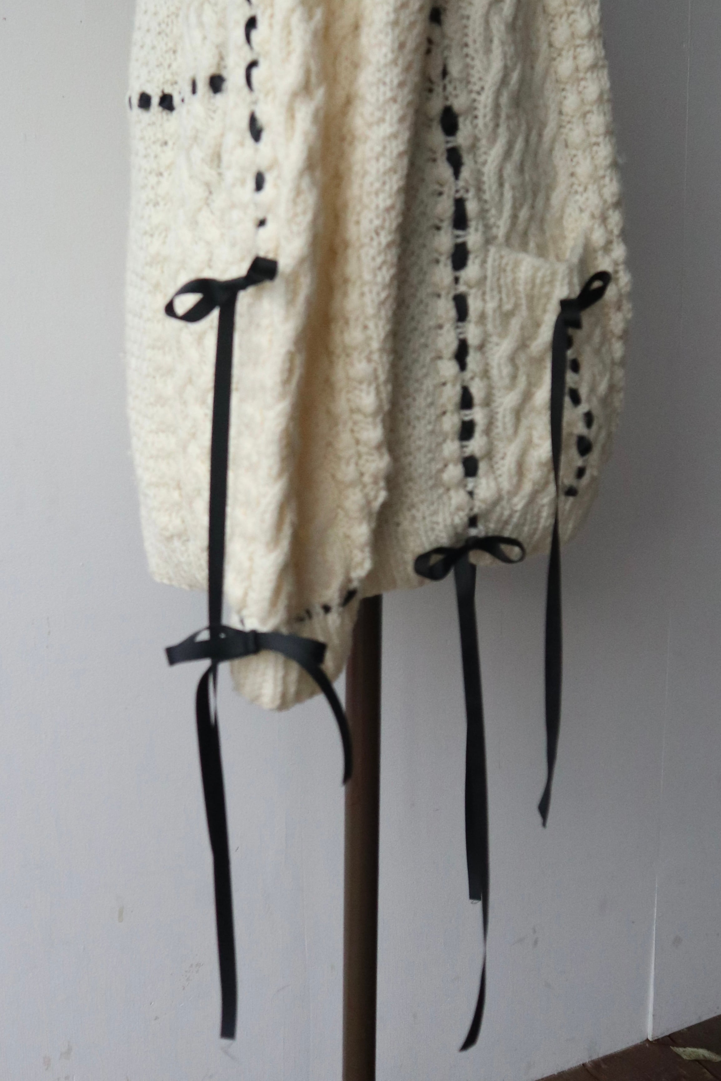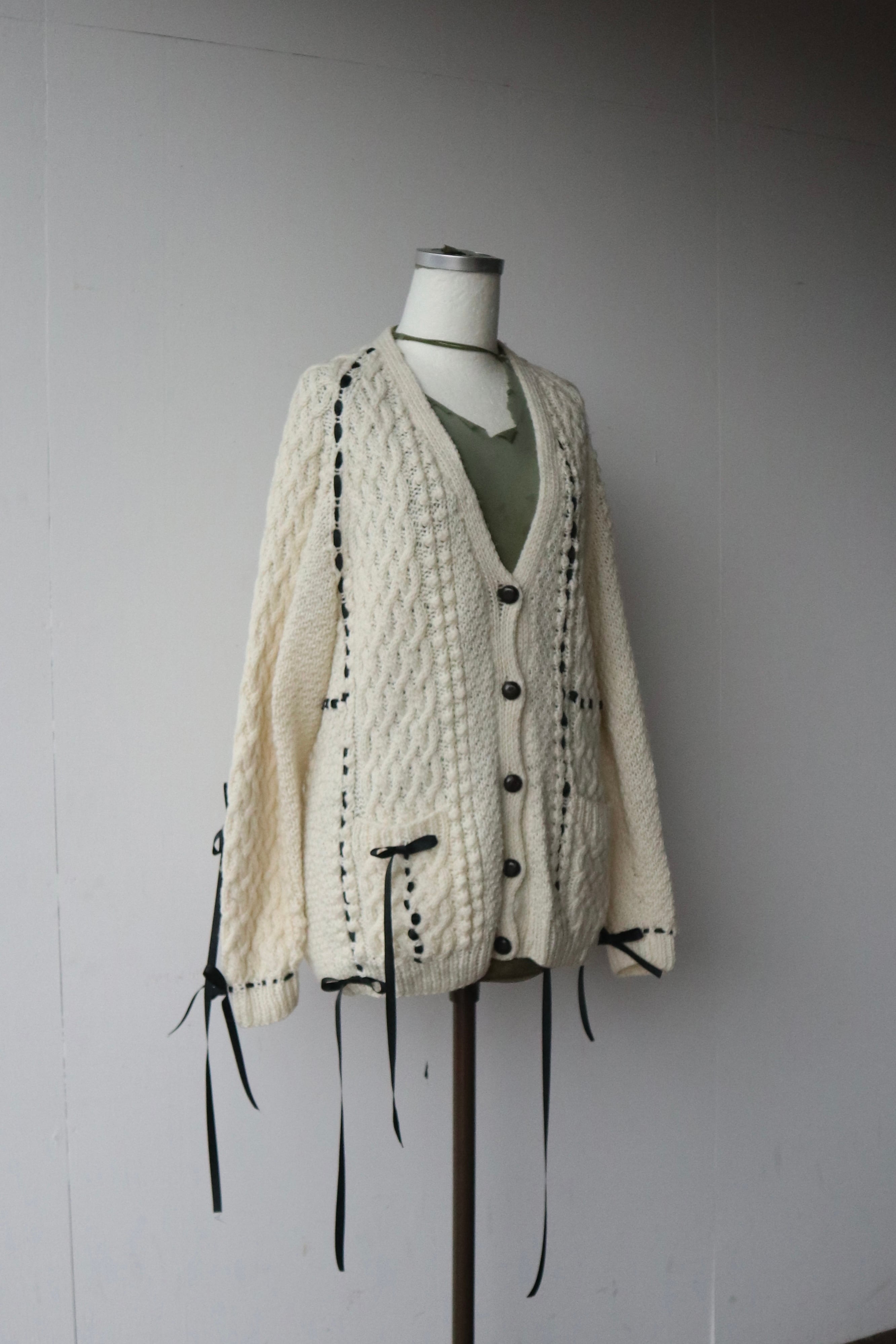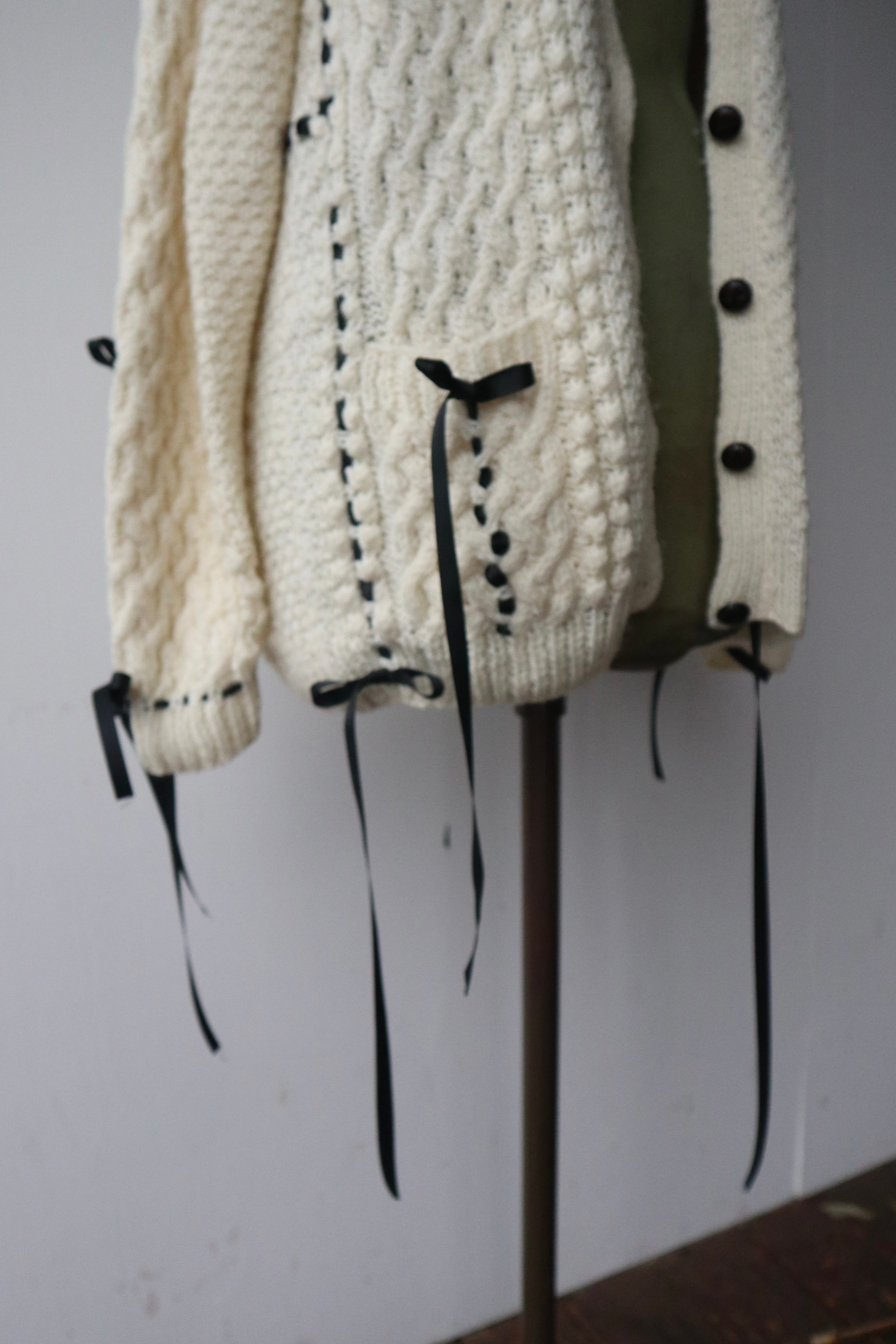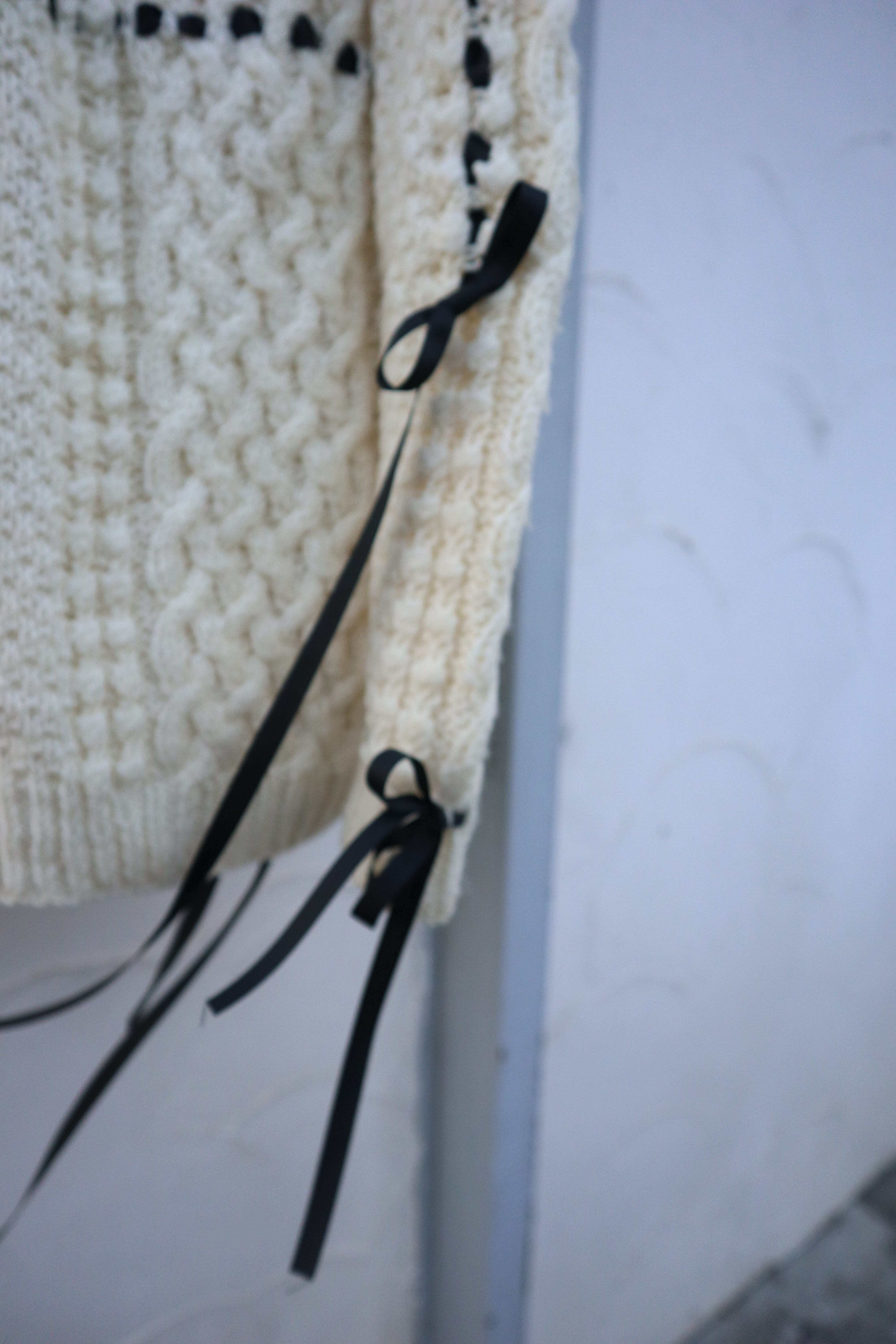 フィッシャーマンニットセーターにリボンを通したリメイクカーディガン