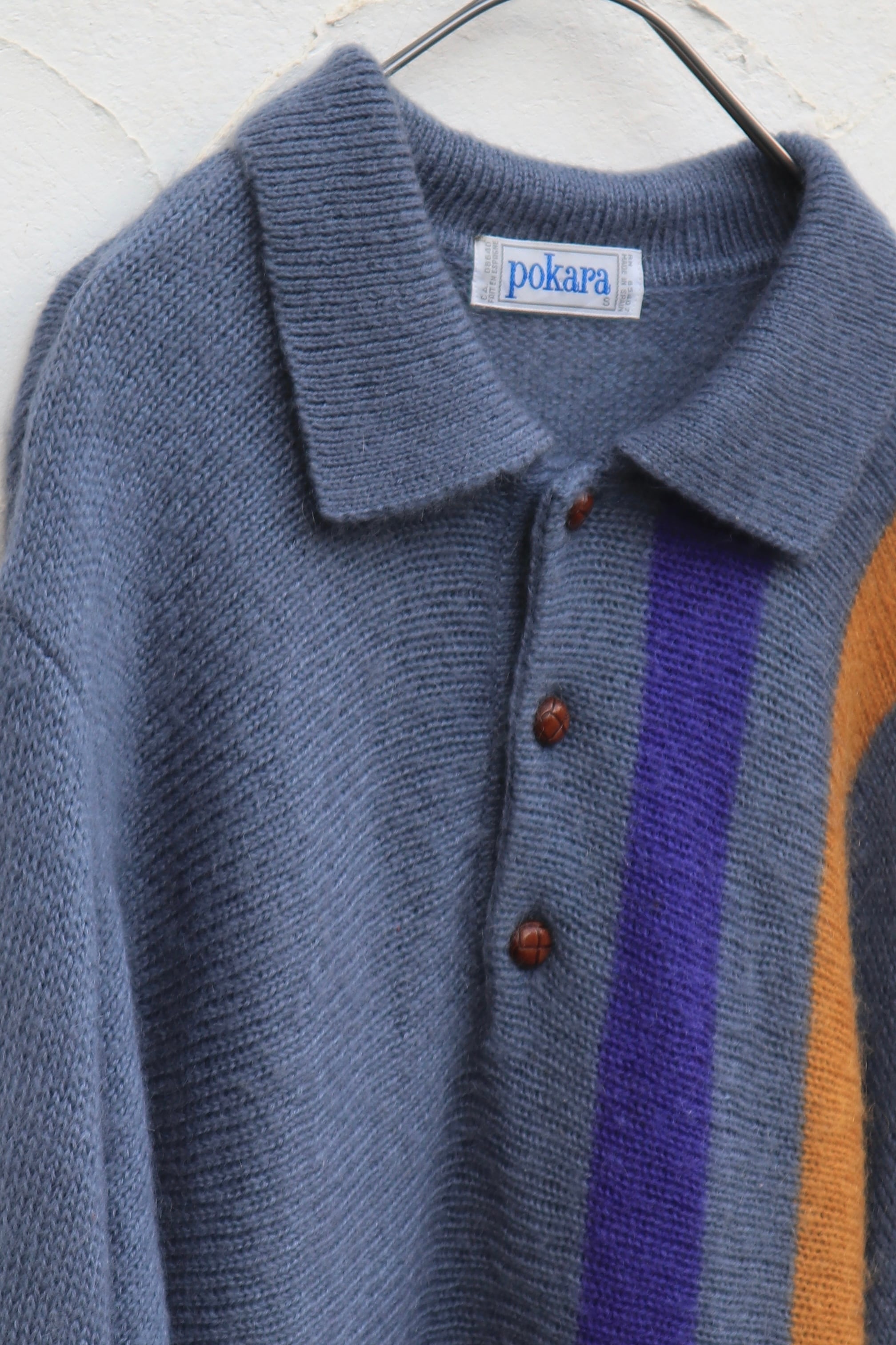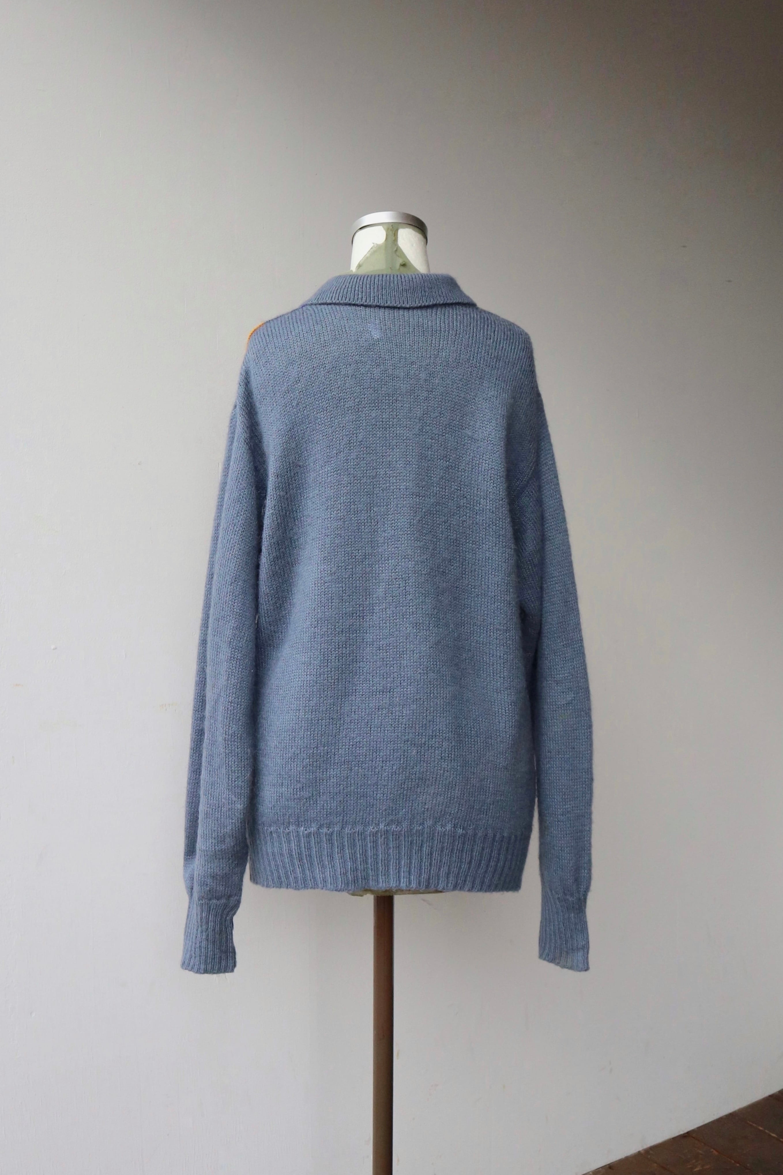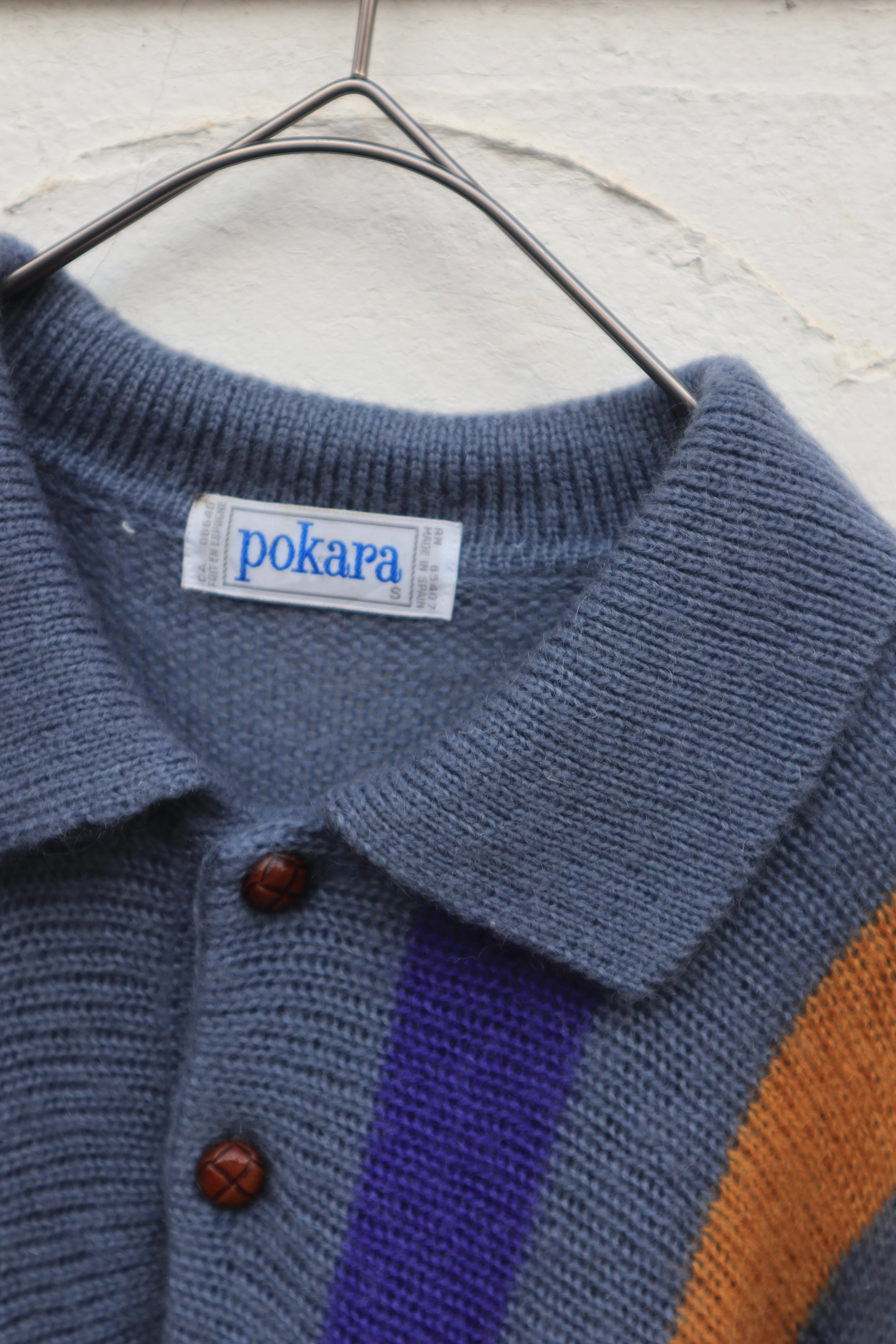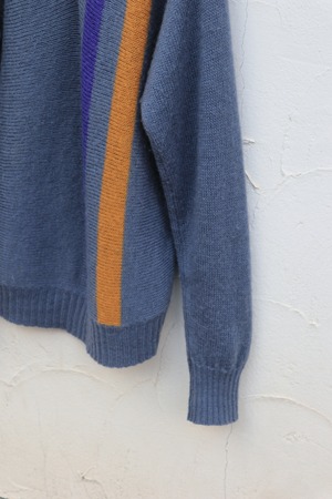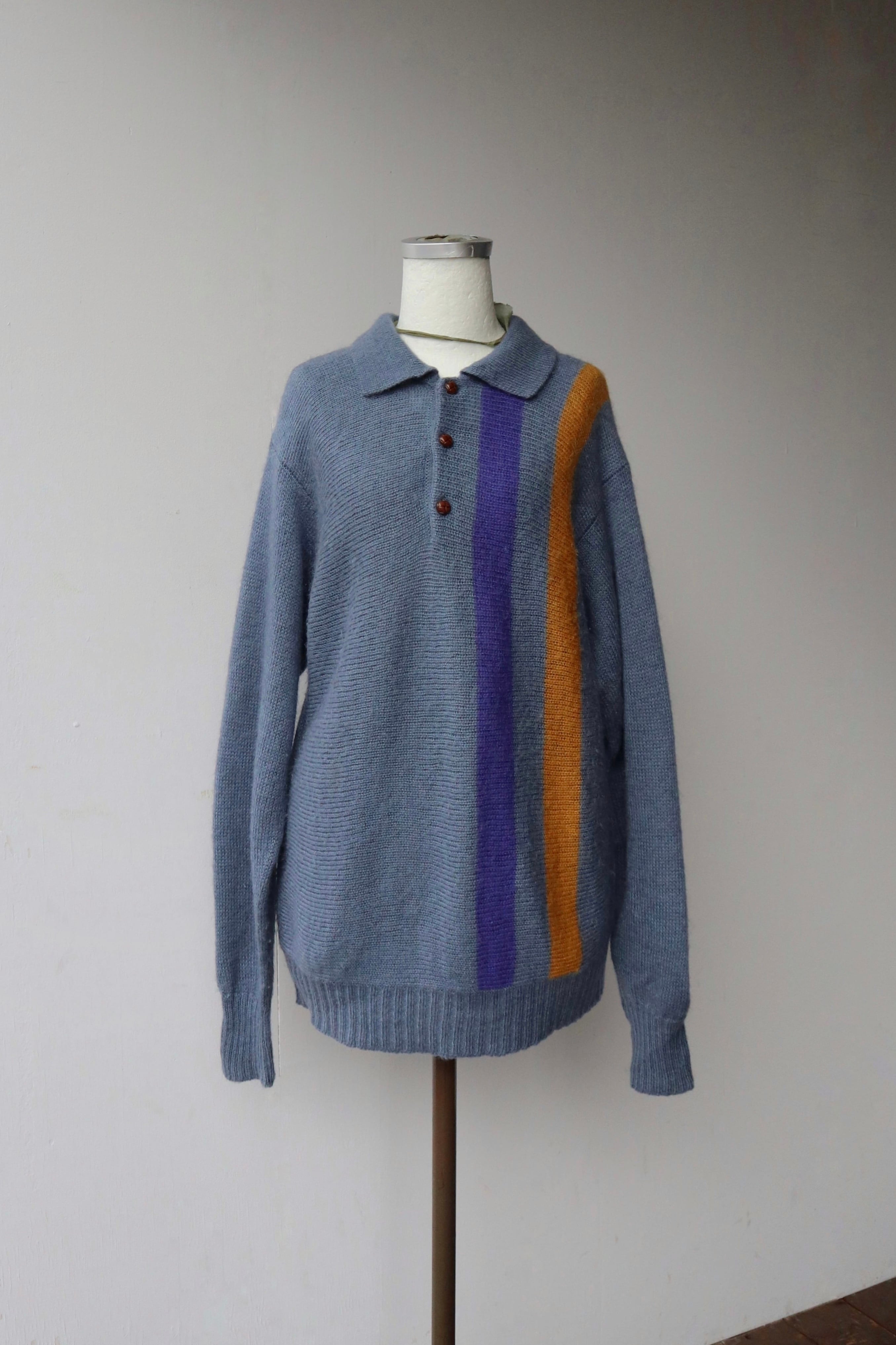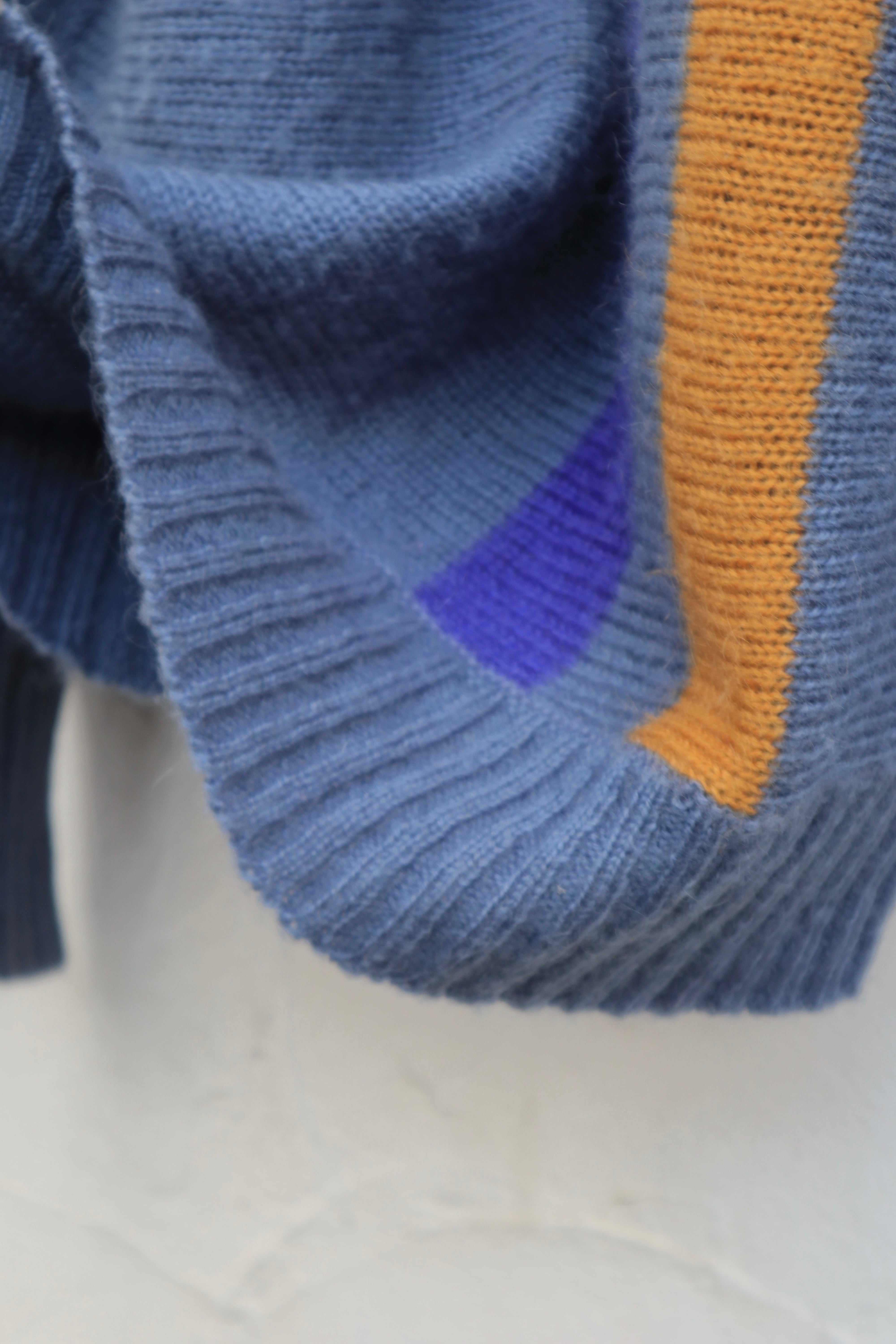 落ち着いた水色をベースに、ブルーとマスタードのストライプが映えるレトロな一枚です