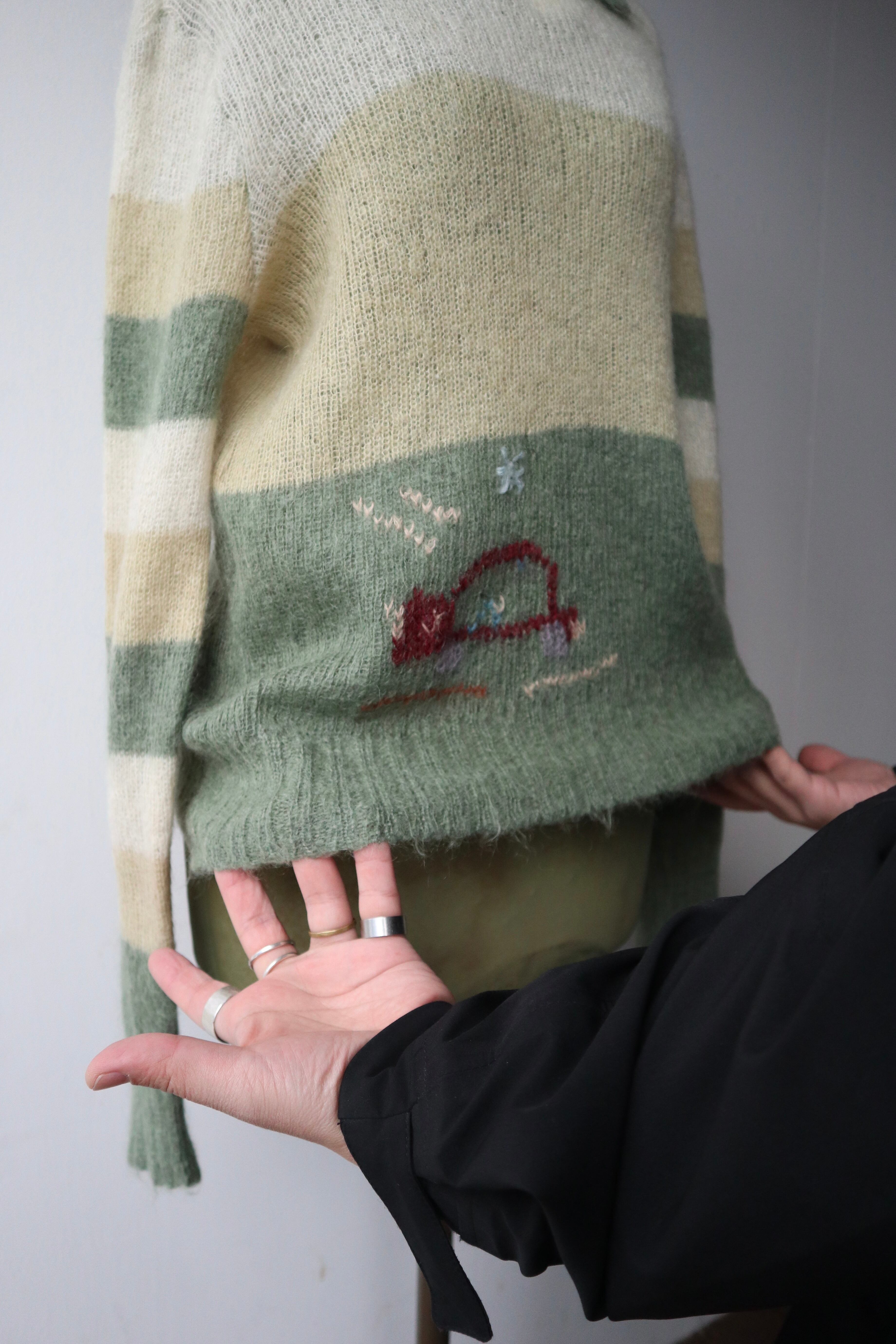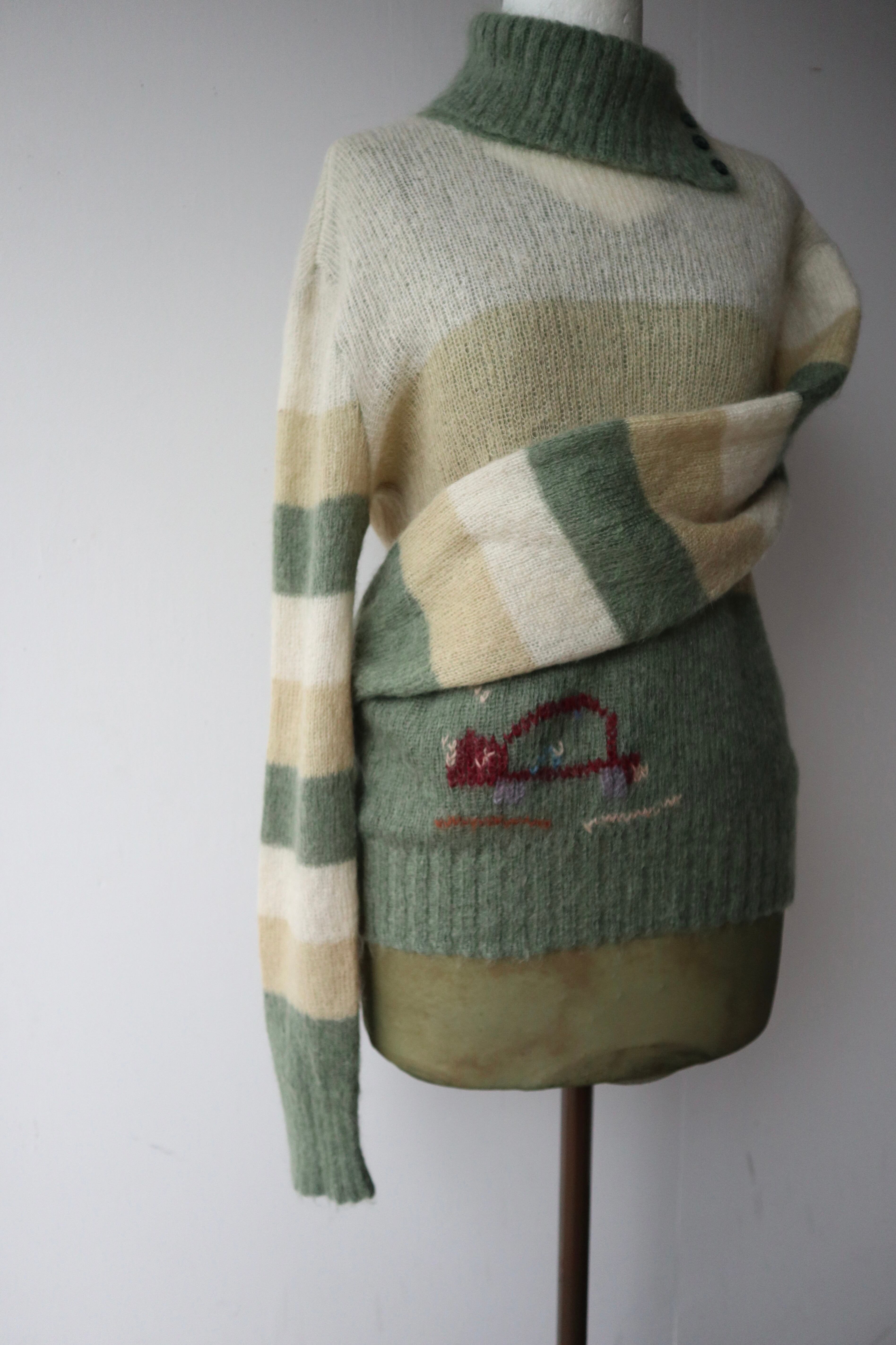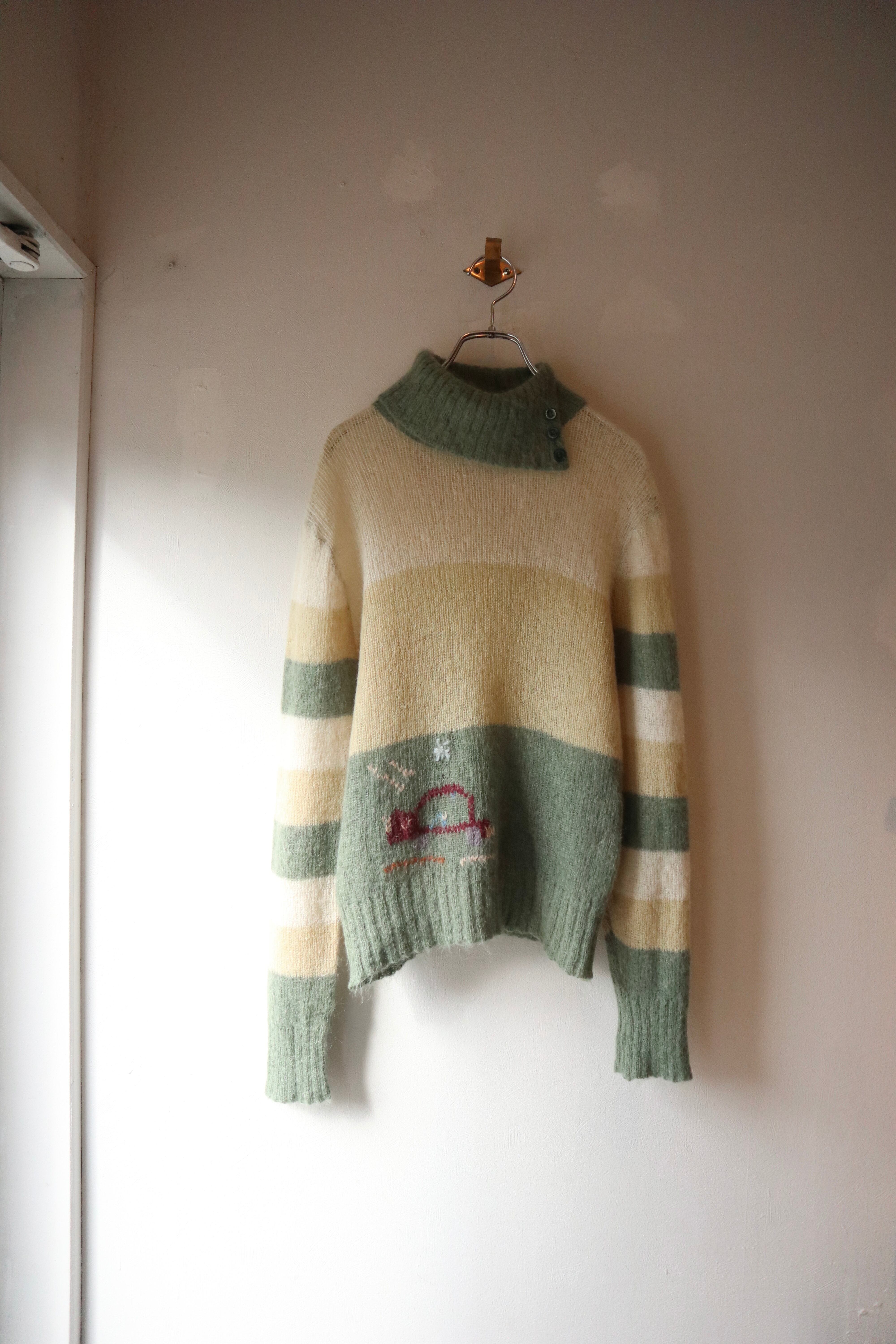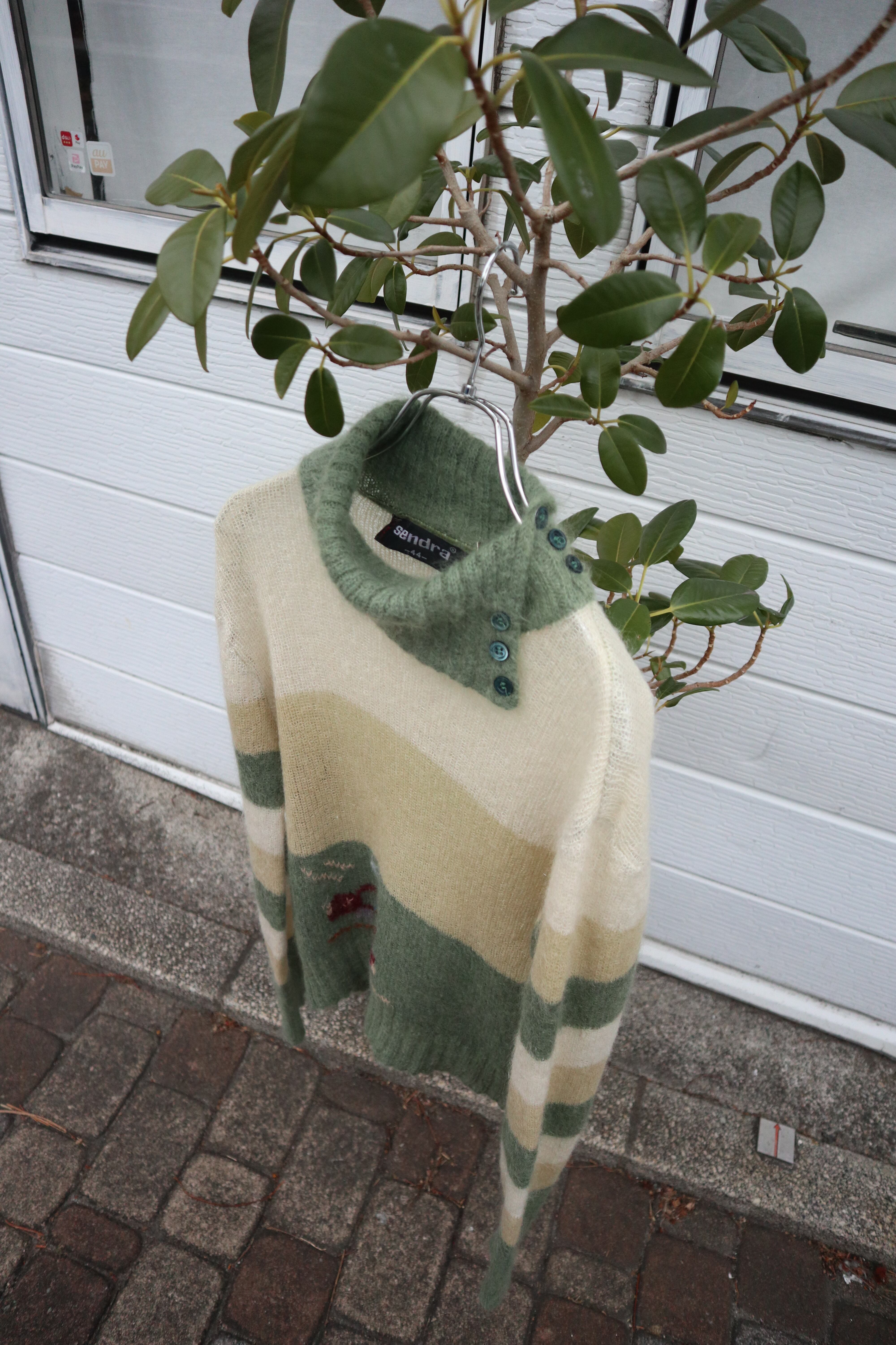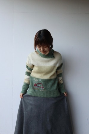 伸縮性のある柔らかい肌触りのモヘアニットセーター 裾には動物と思われるデザインが施されていてくすみグリーンとイエローの組み合わせが可愛らしい1着