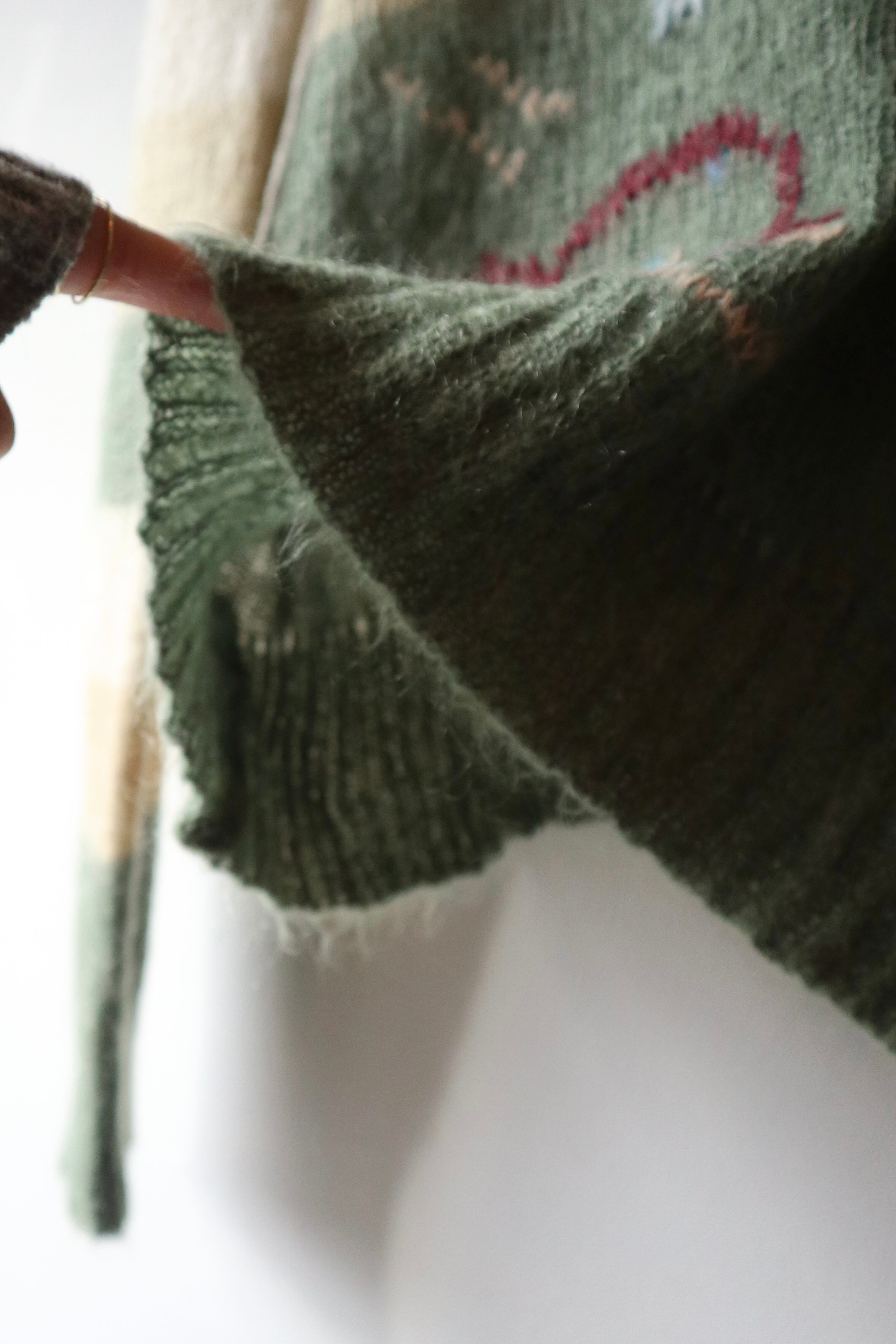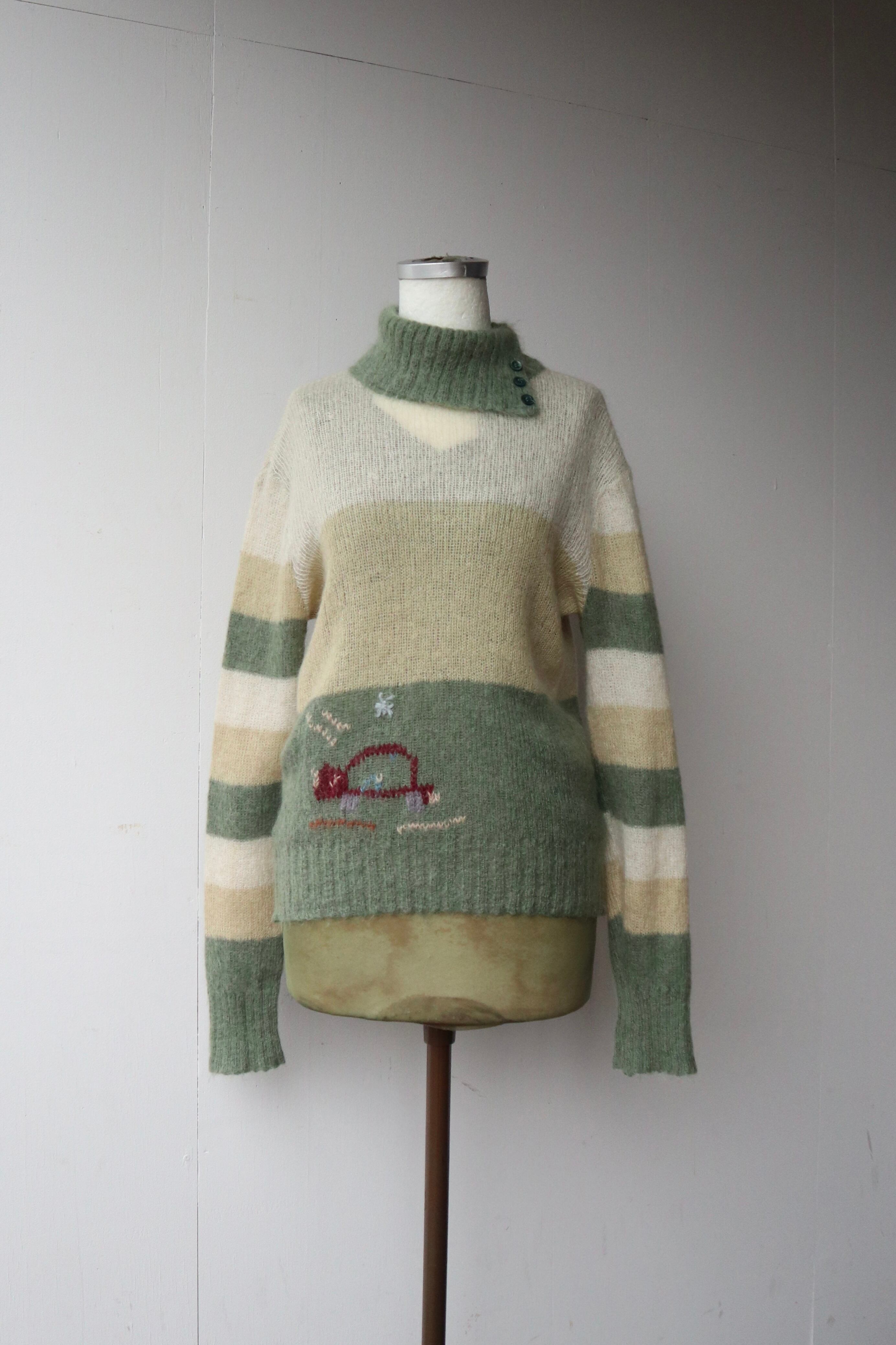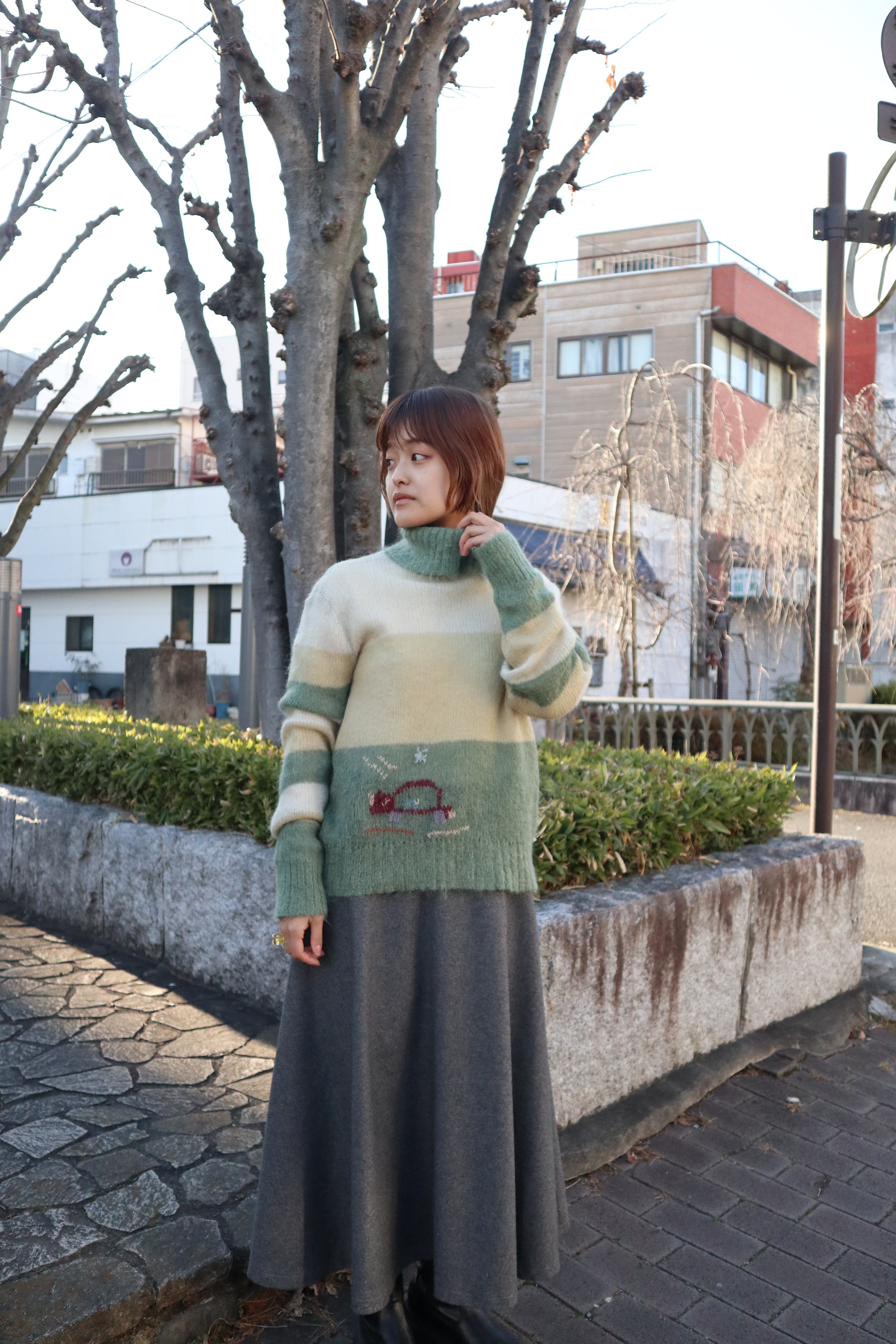 伸縮性のある柔らかい肌触りのモヘアニットセーター 裾には動物と思われるデザインが施されていてくすみグリーンとイエローの組み合わせが可愛らしい1着