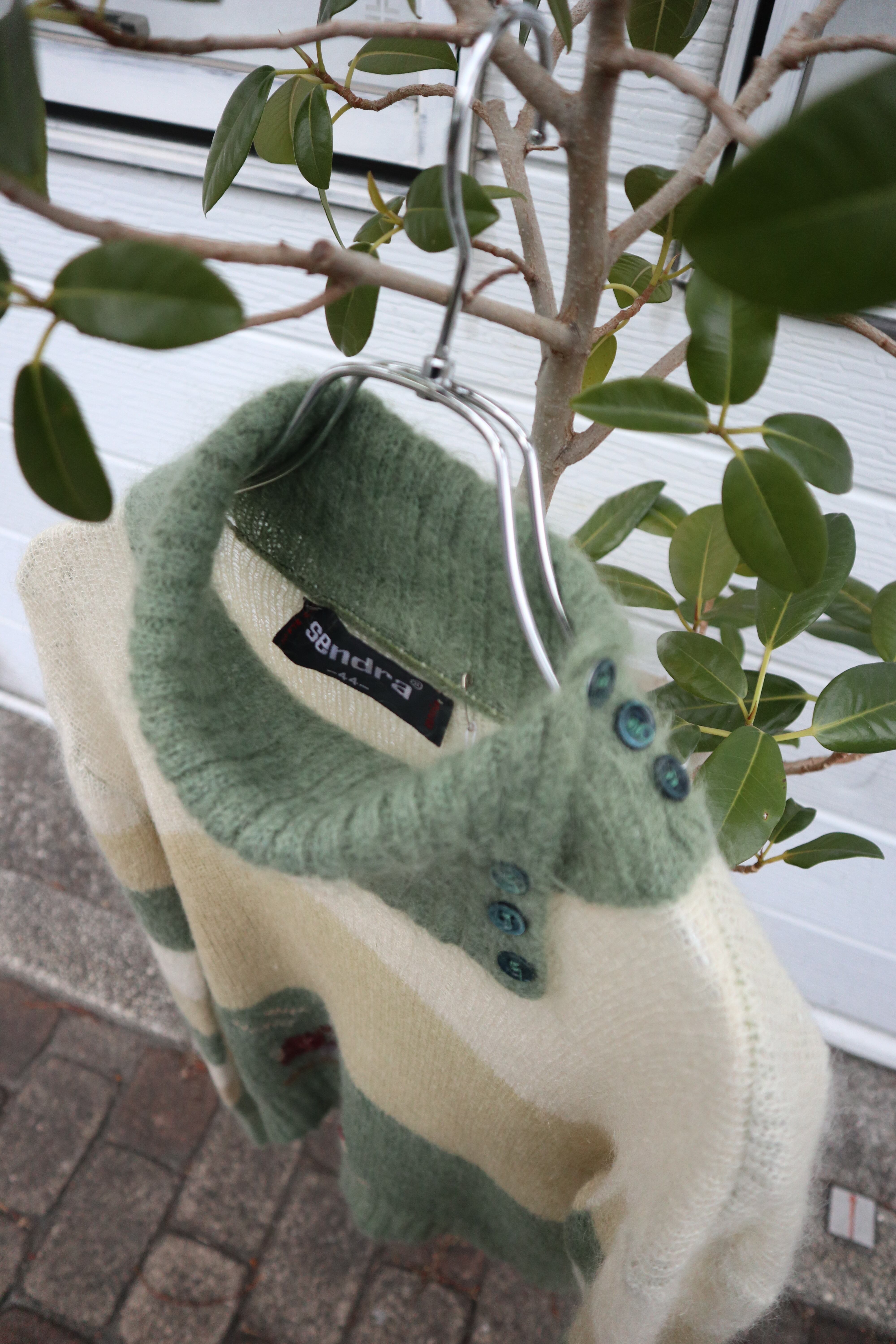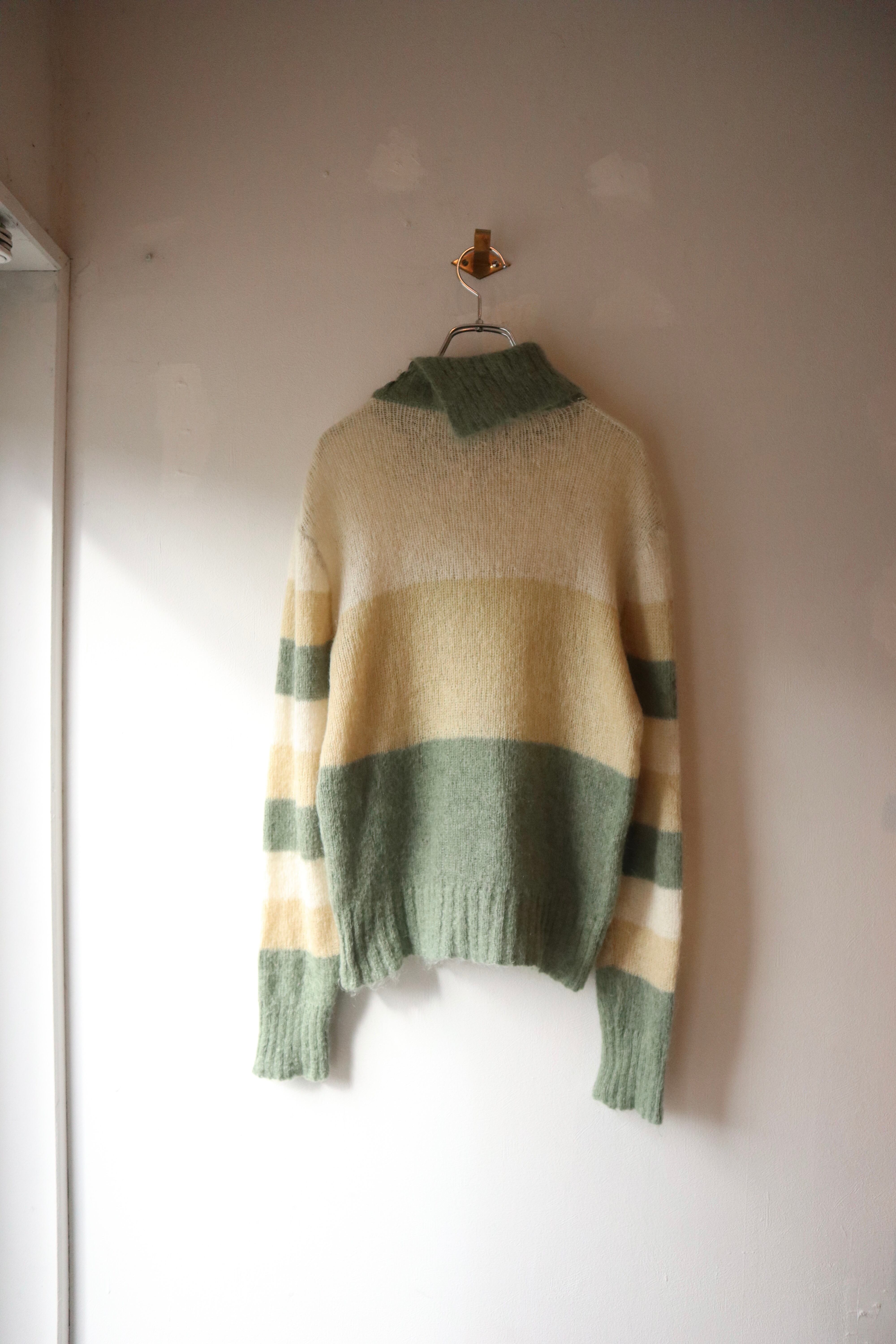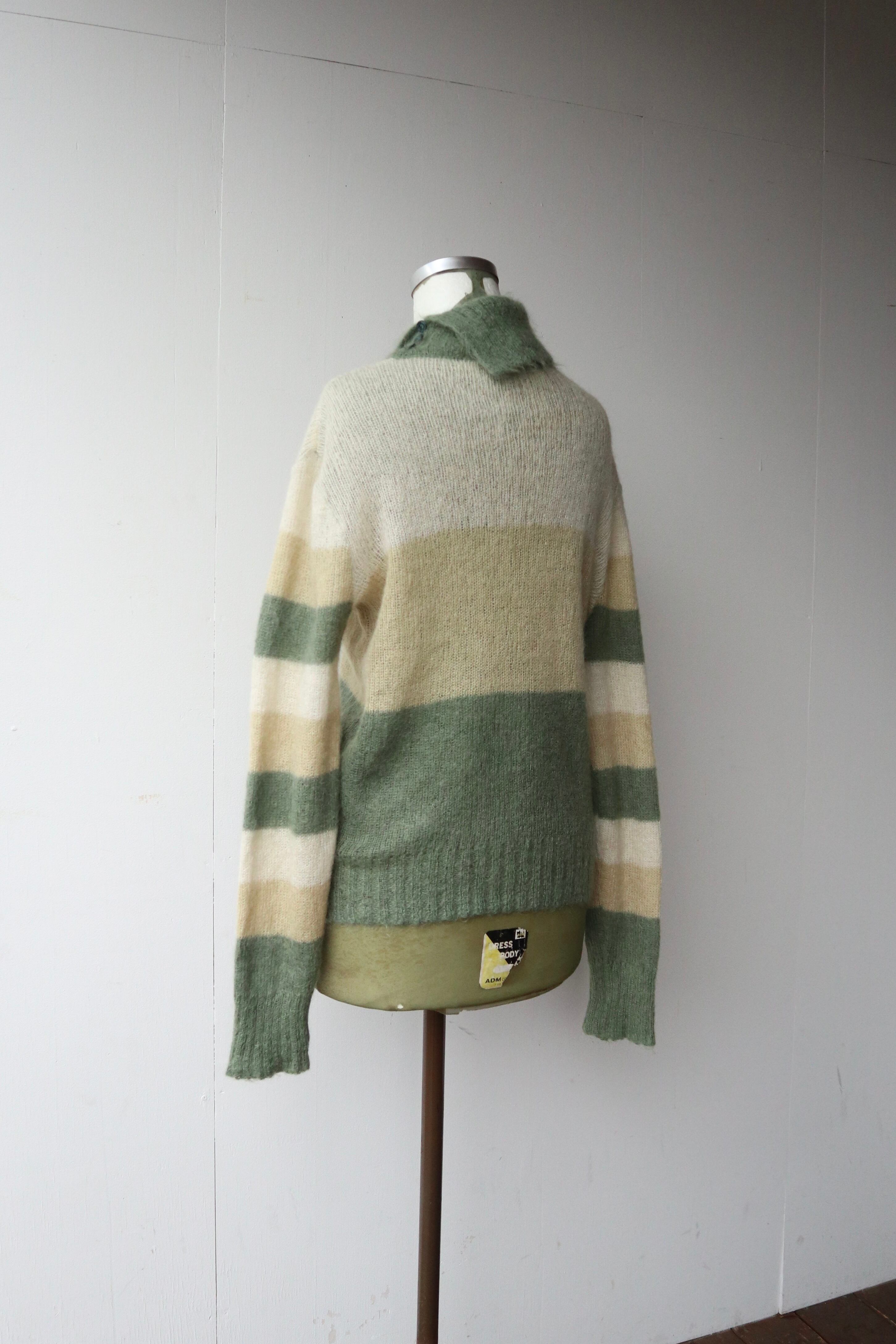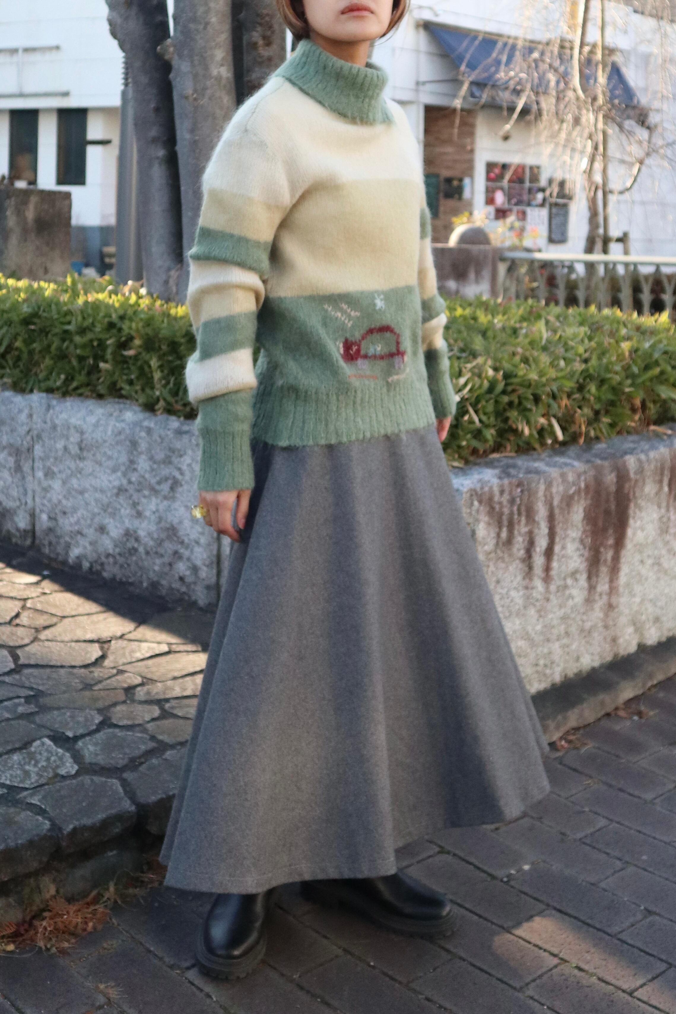 伸縮性のある柔らかい肌触りのモヘアニットセーター 裾には動物と思われるデザインが施されていてくすみグリーンとイエローの組み合わせが可愛らしい1着
