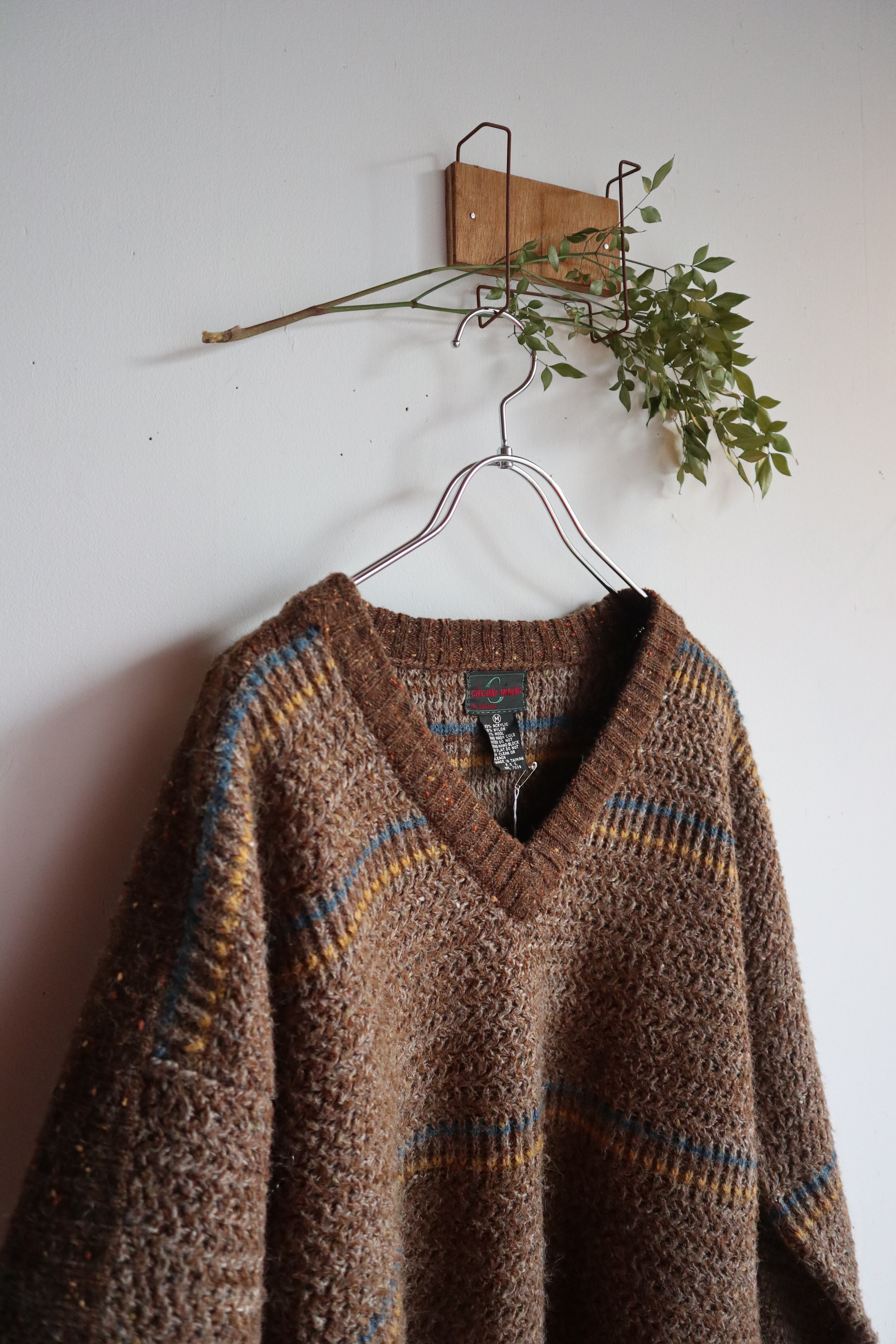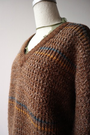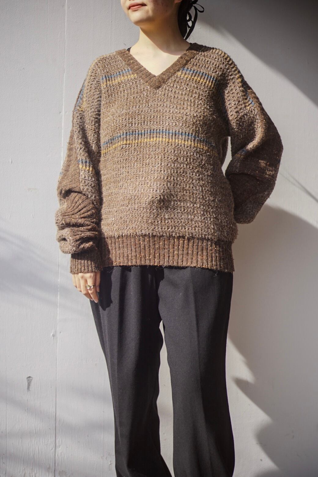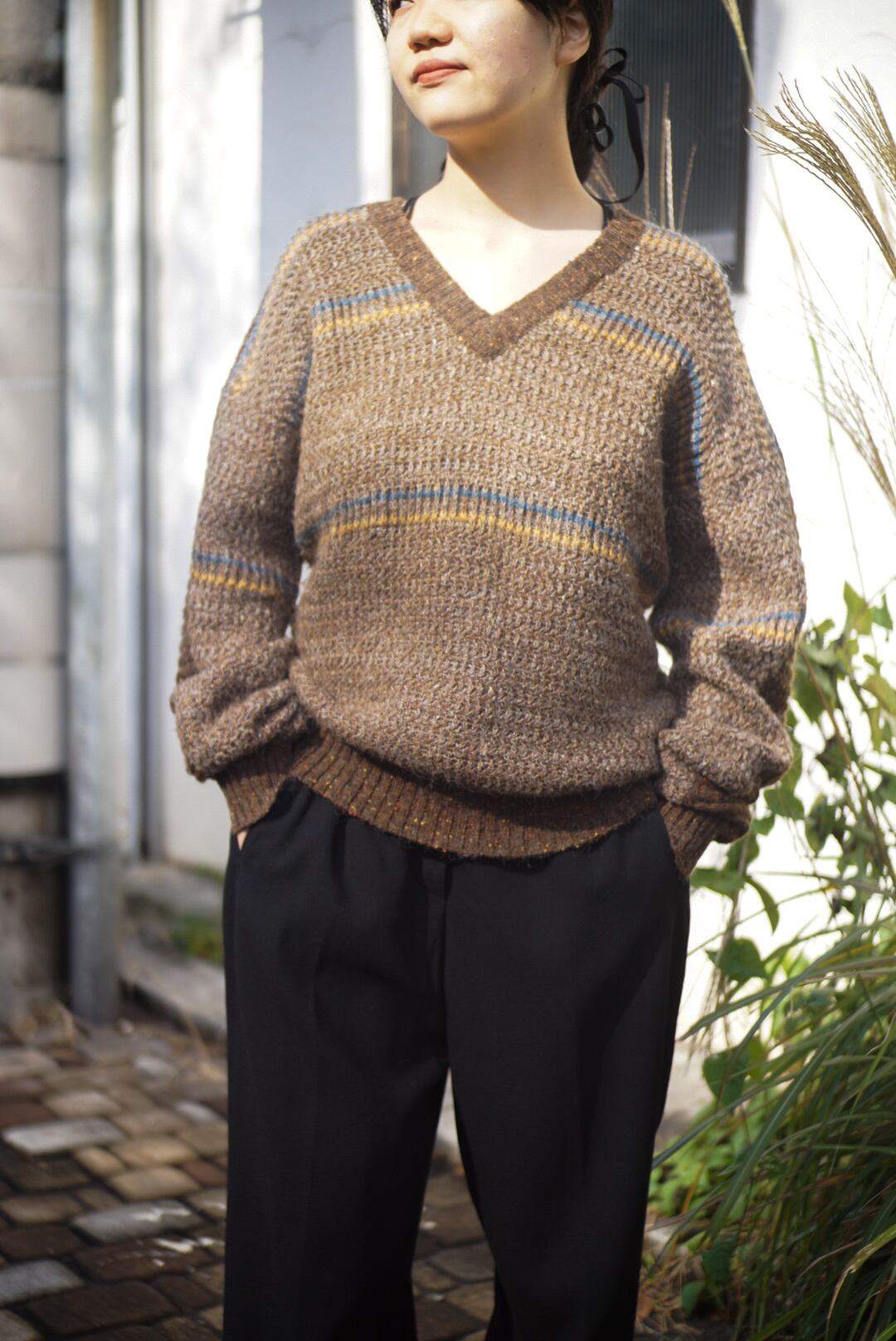 ブルーとイエローのラインがポイントになるVネックニットセーター