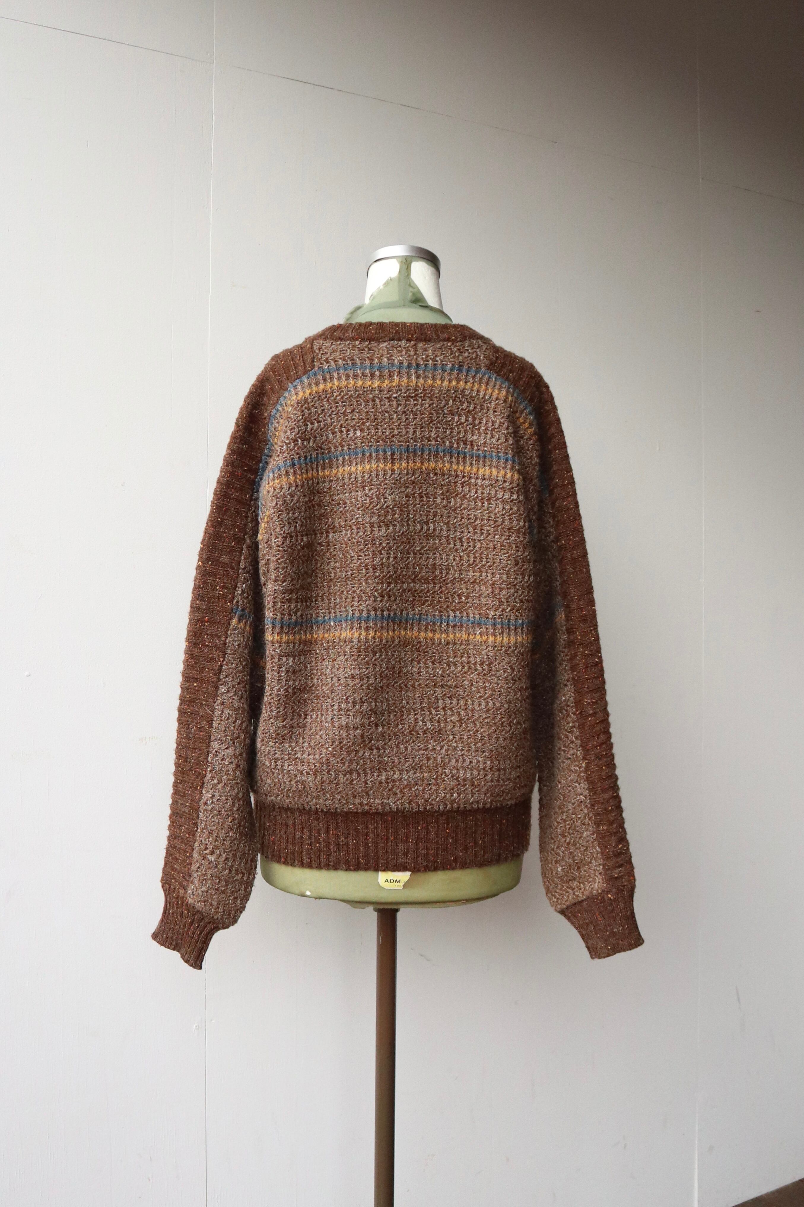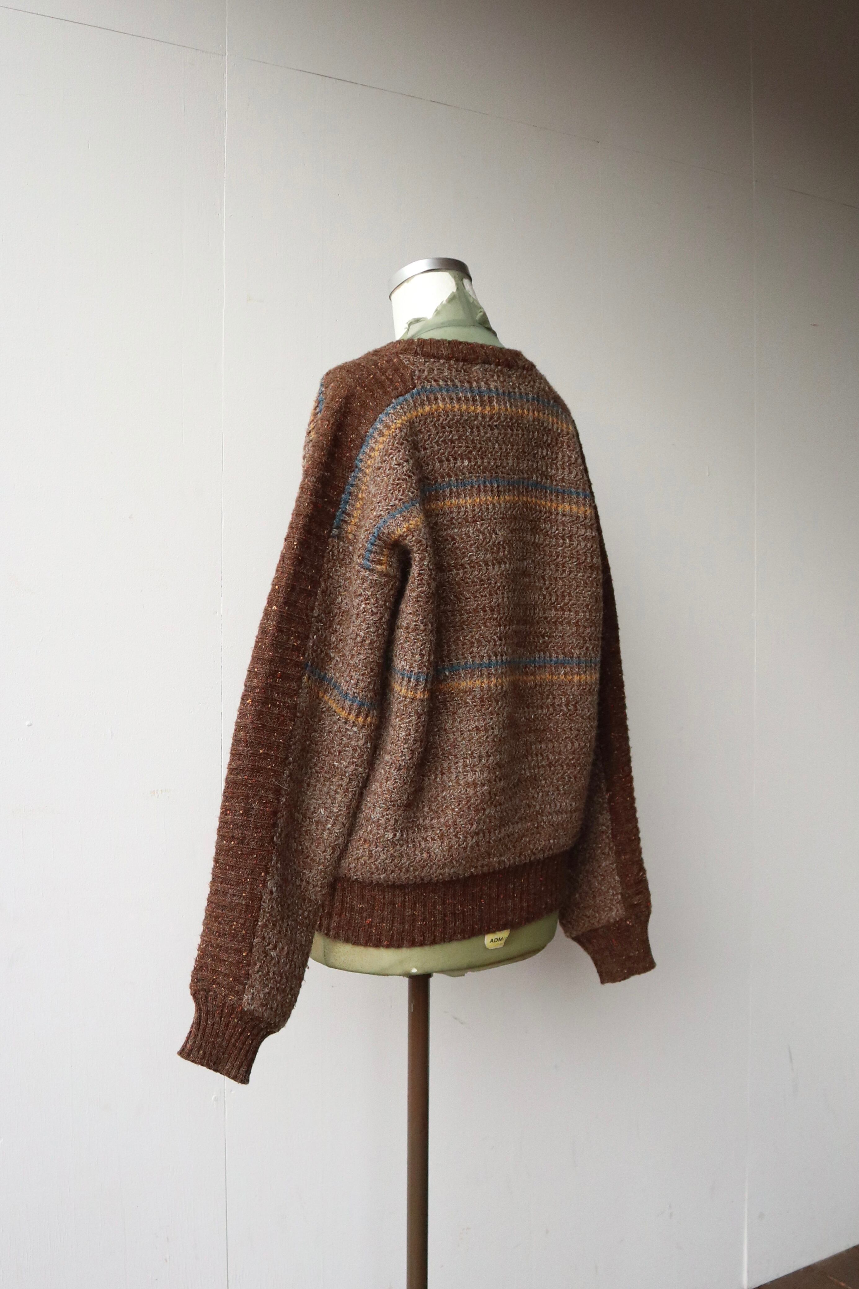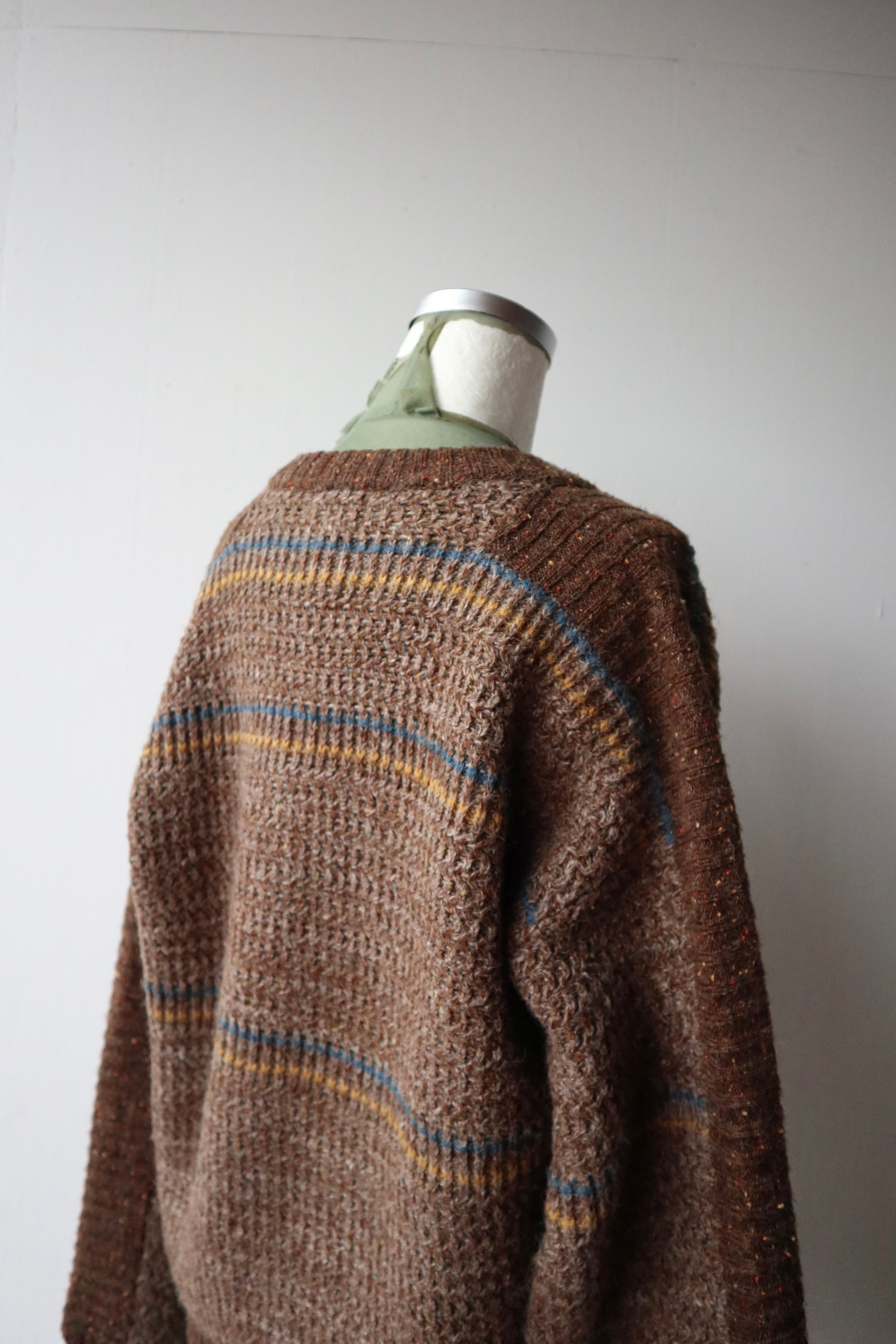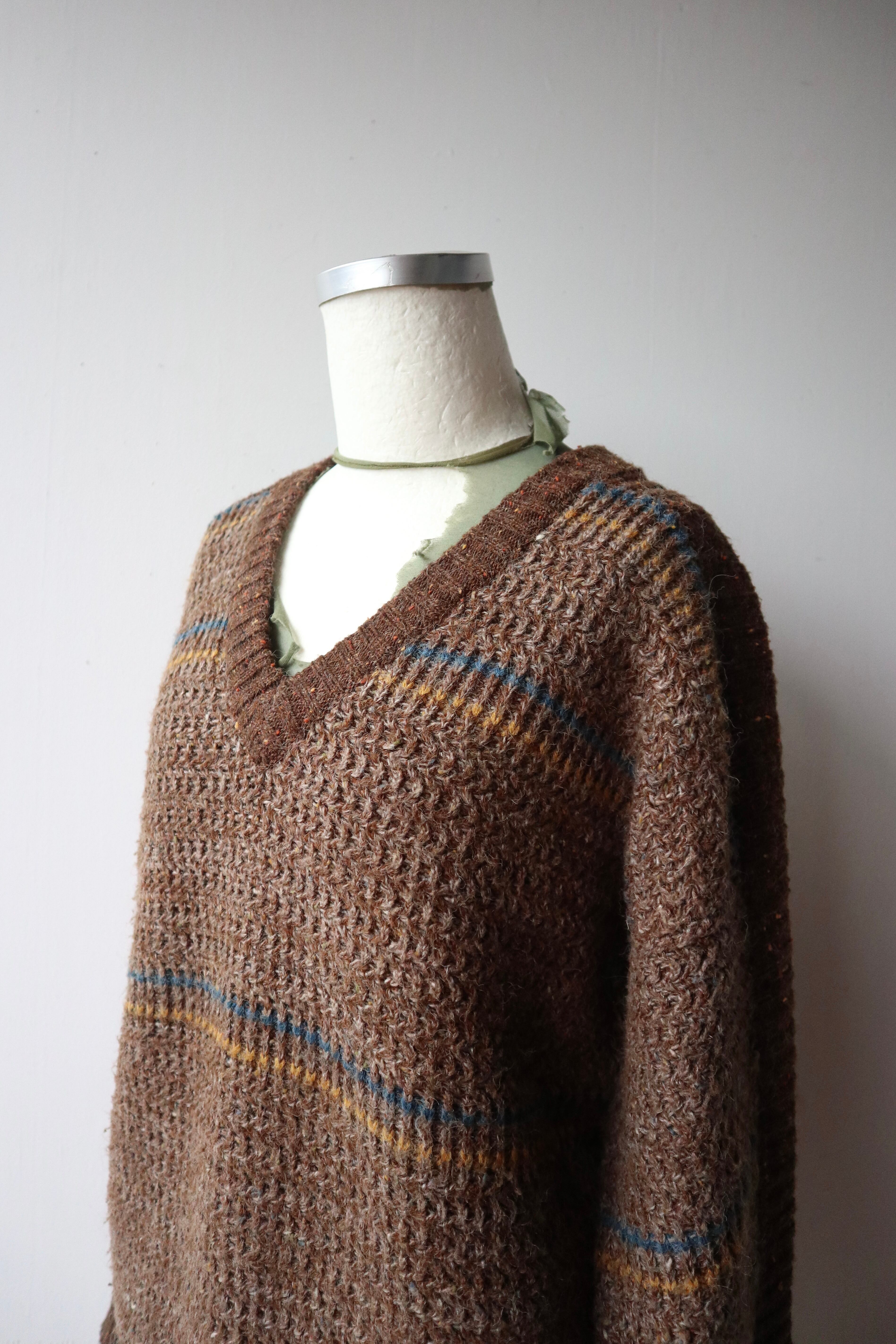 ブルーとイエローのラインがポイントになるVネックニットセーター
