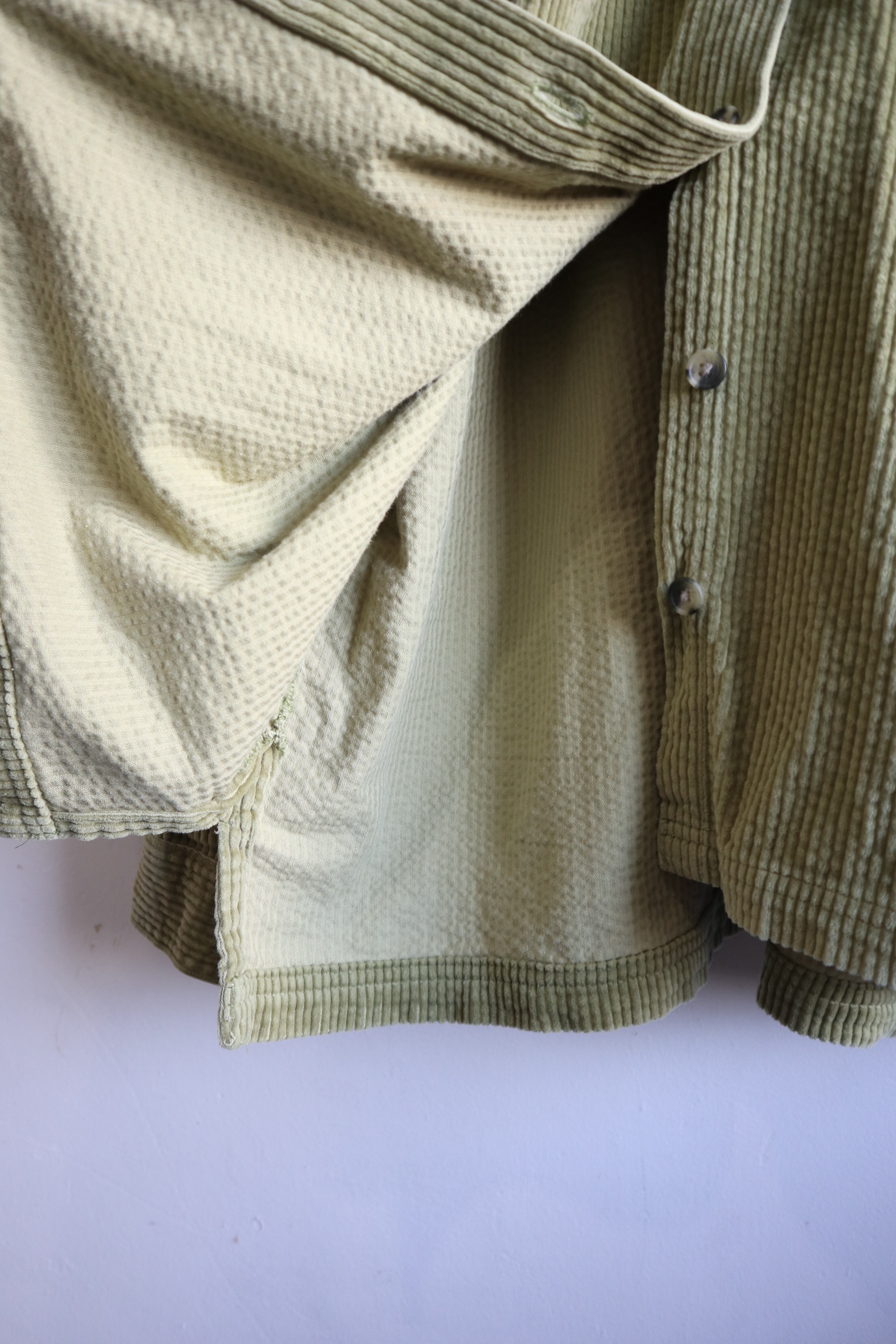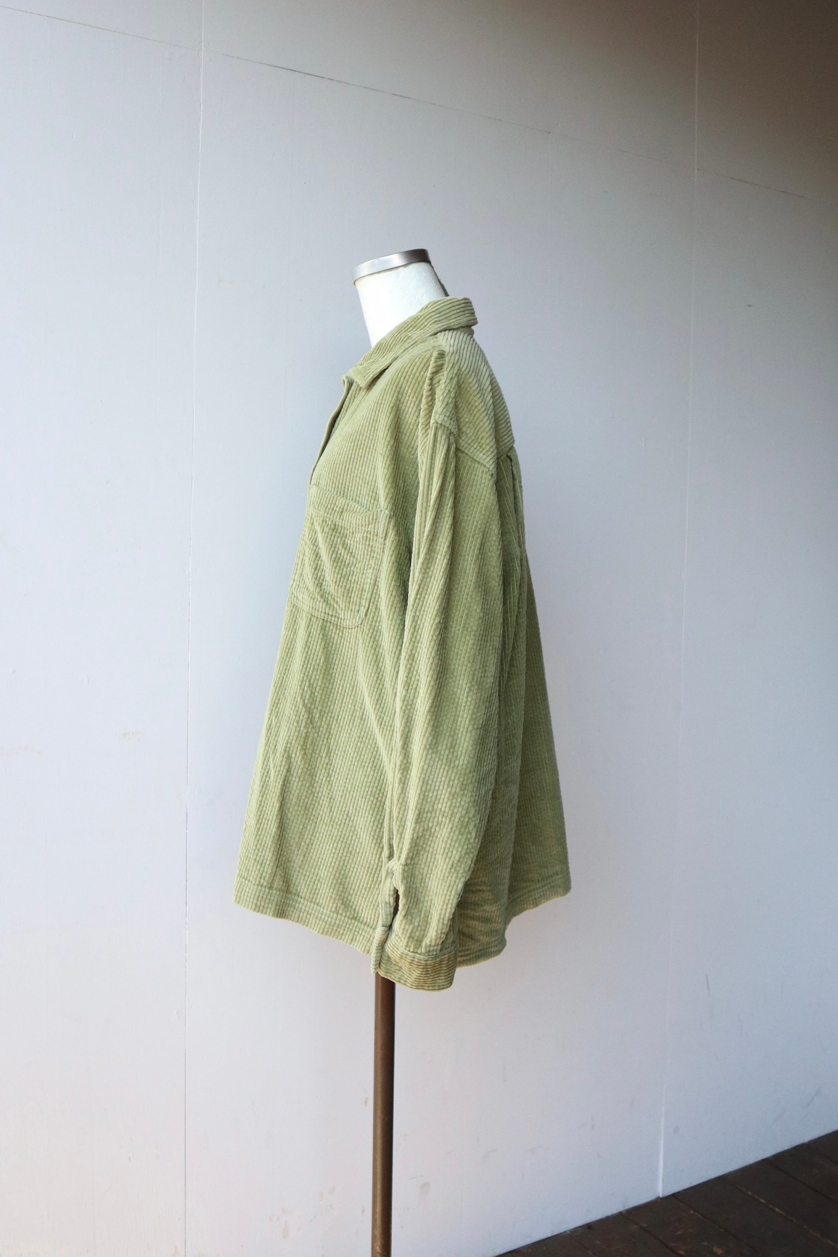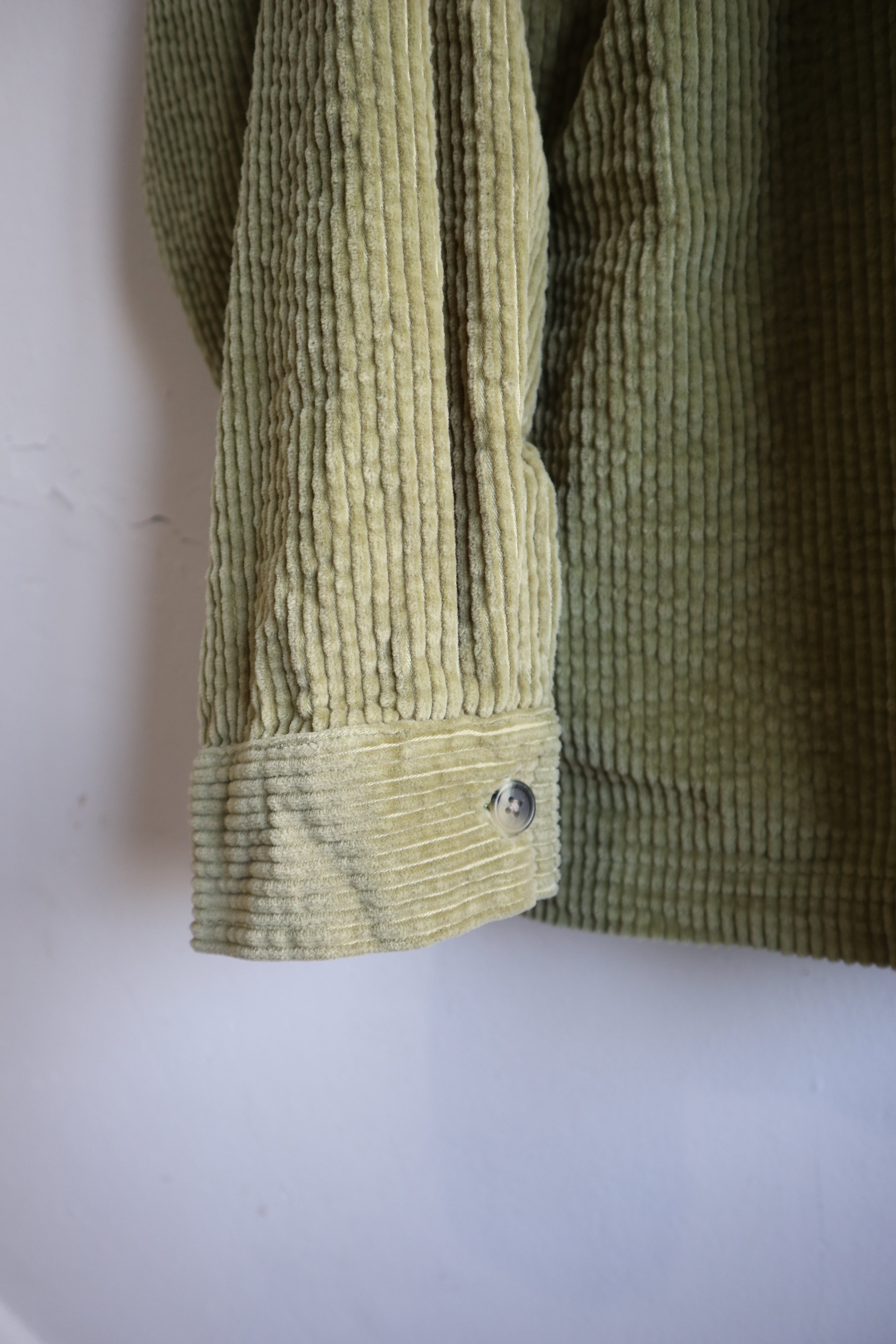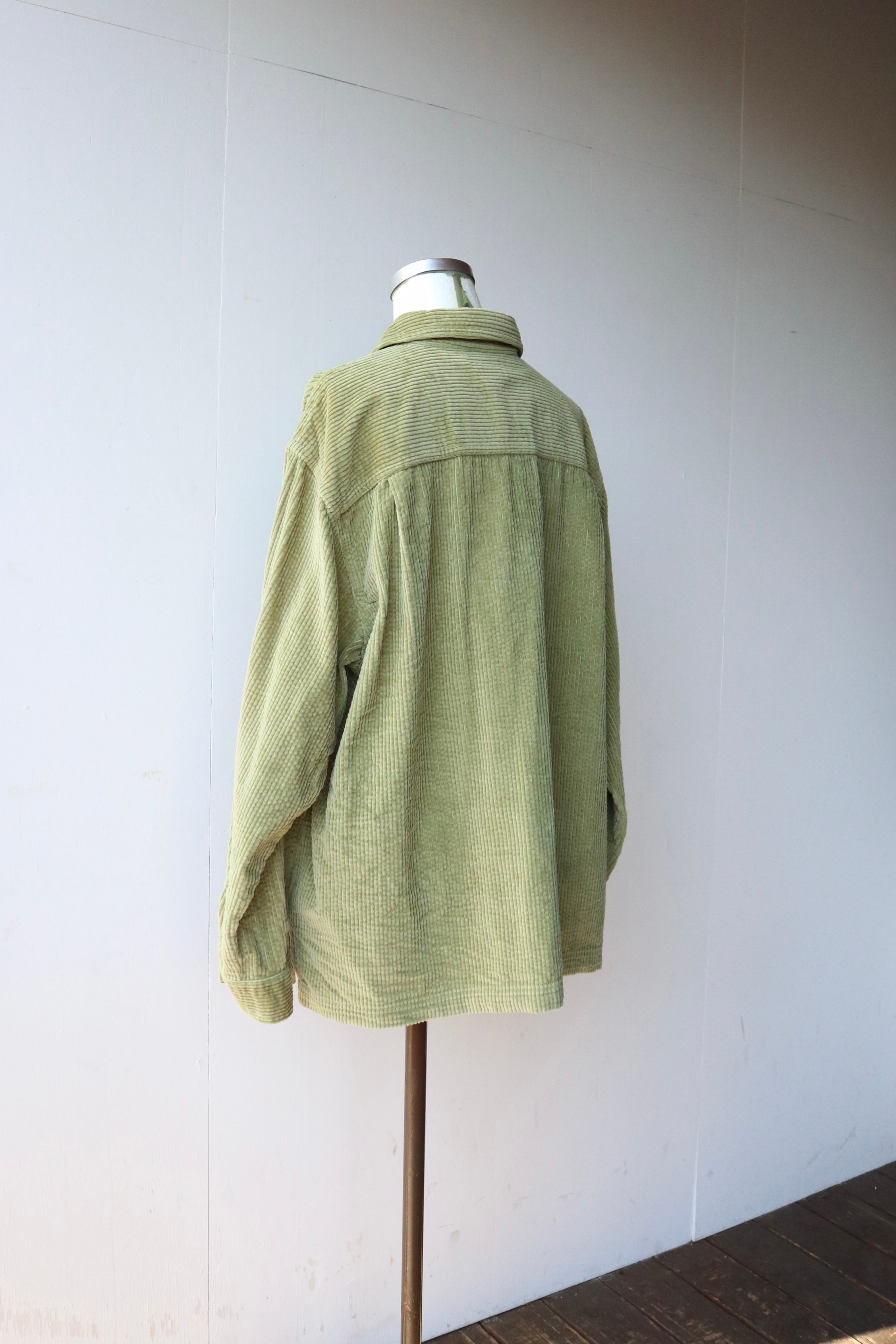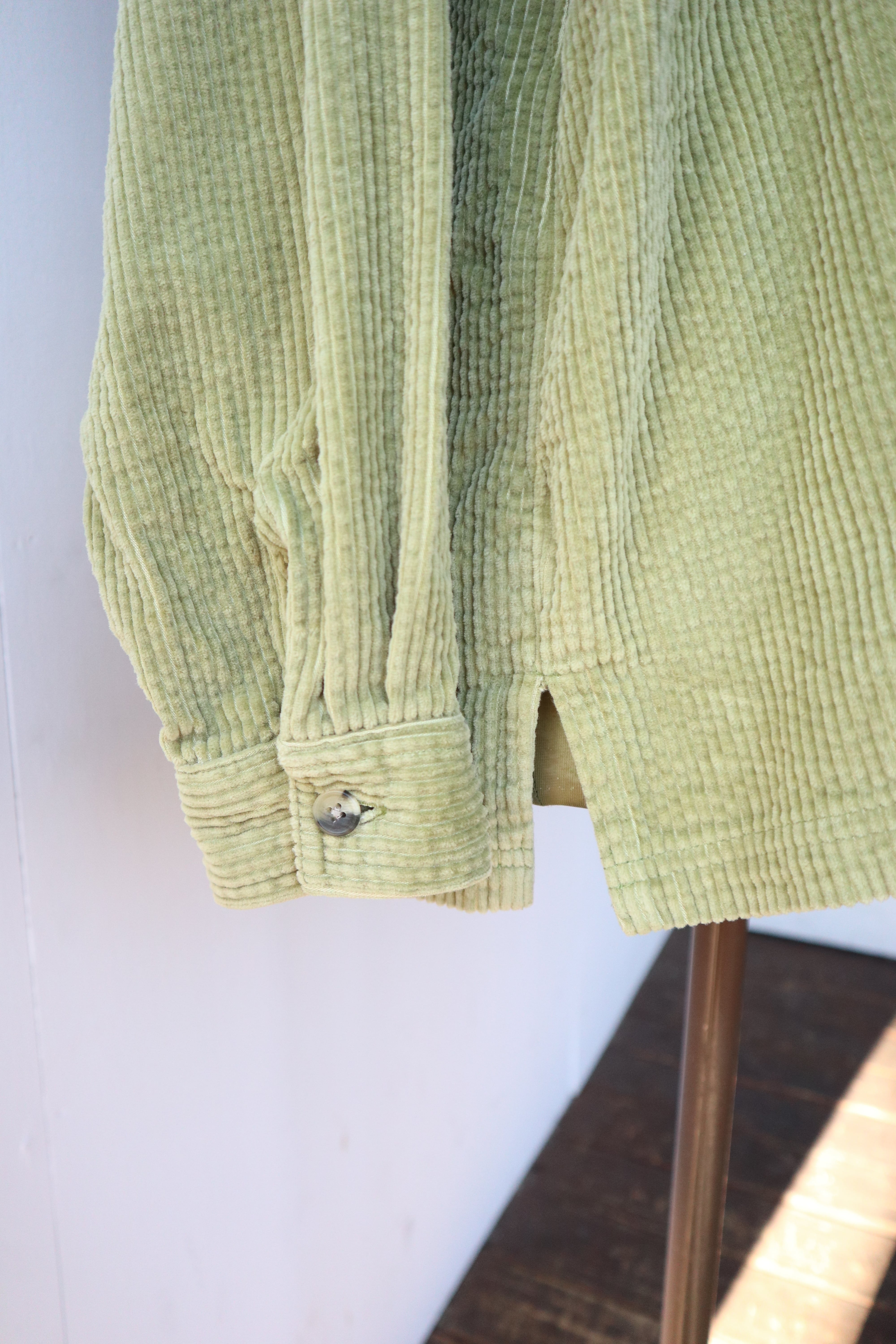 淡いグリーンがトレンドライクなコーデュロイシャツ。身幅がゆったりしているので軽い羽織にもお使い頂けます。
