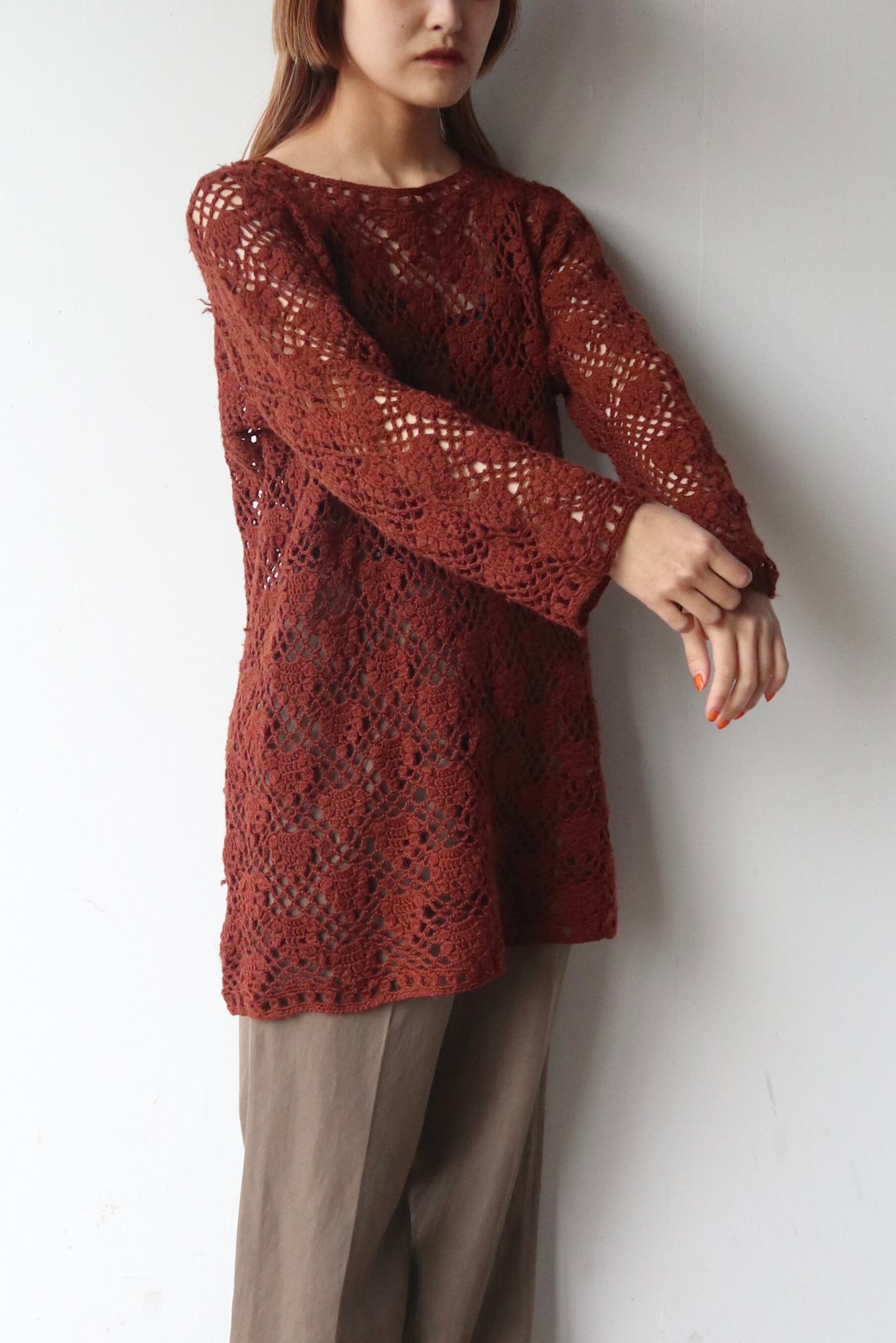 編み模様から程よく肌見せになるクロシェニット