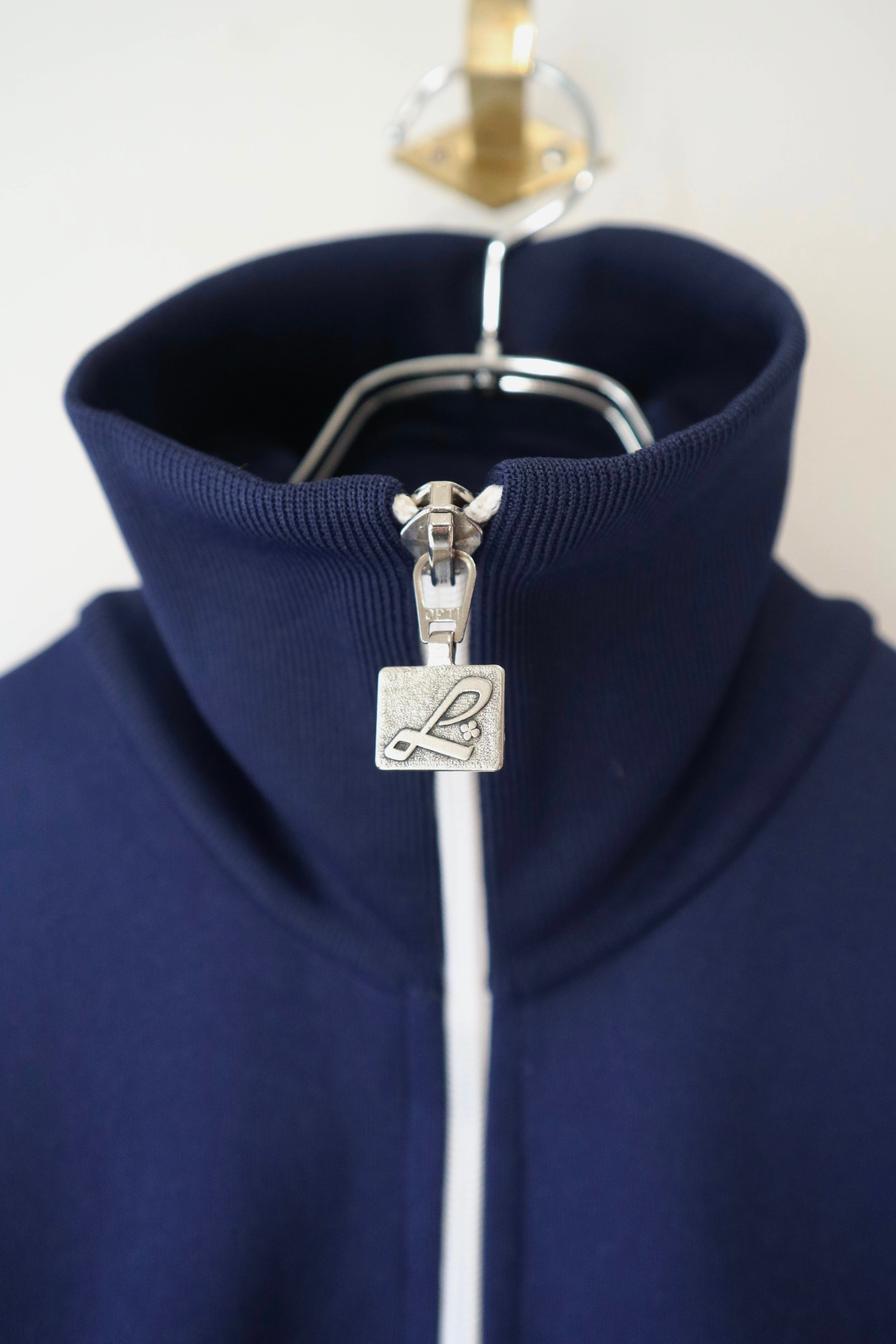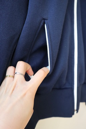 やや肉厚でしっかりとした生地感、スタンドカラーやホワイトジップがクラシックな雰囲気を引き立てます