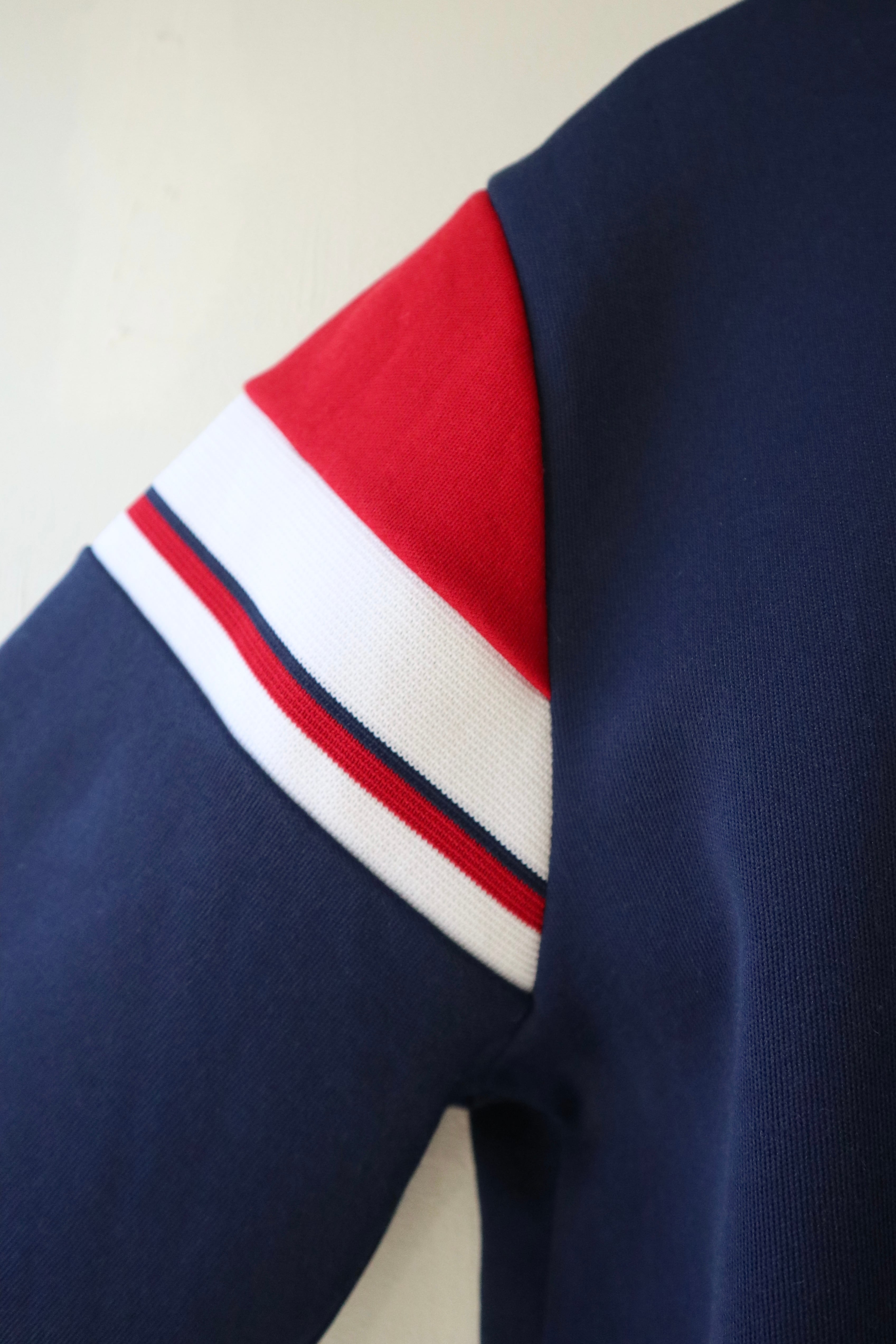 ネイビーをベースに、袖のレッド×ホワイトラインが印象的なデザイン