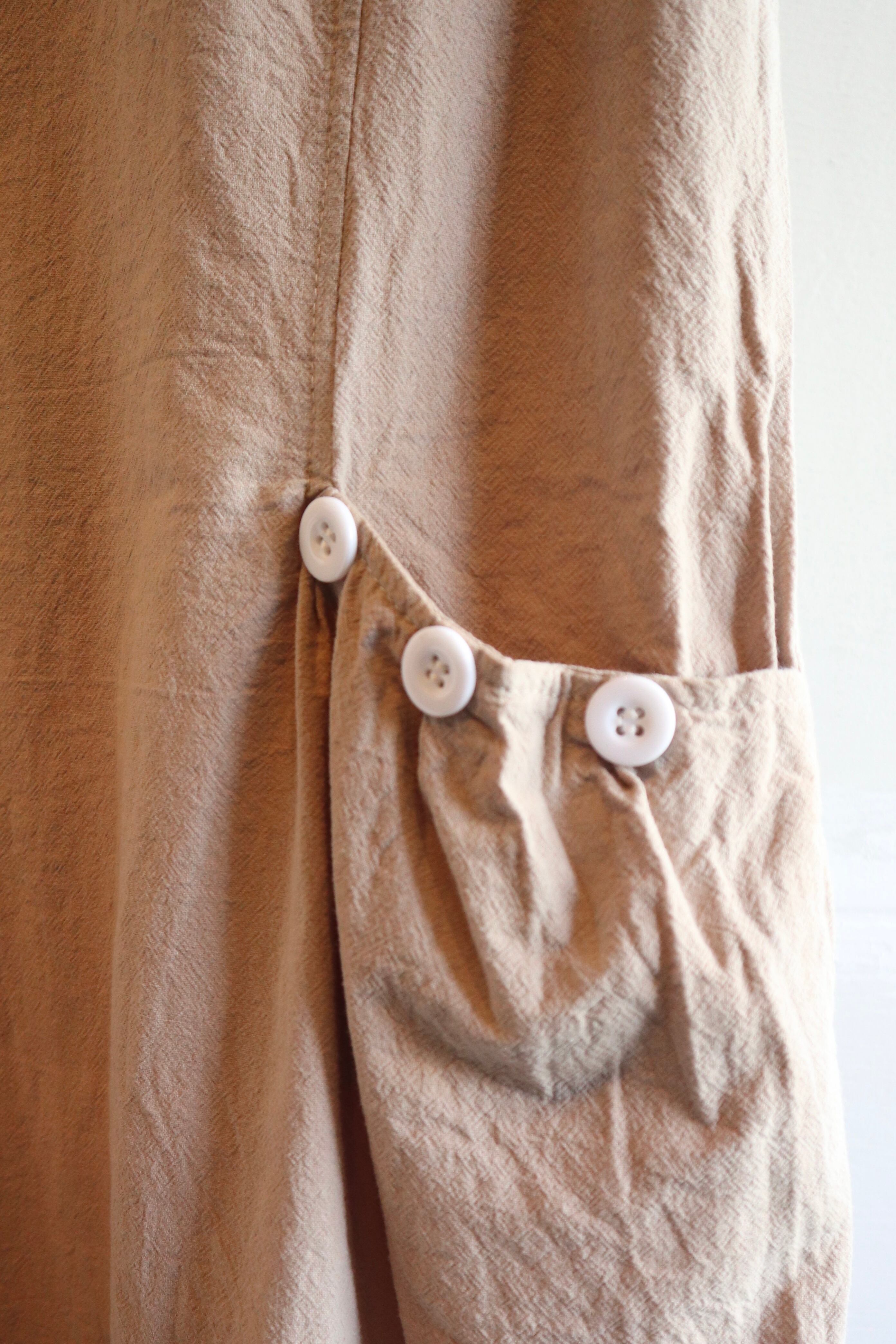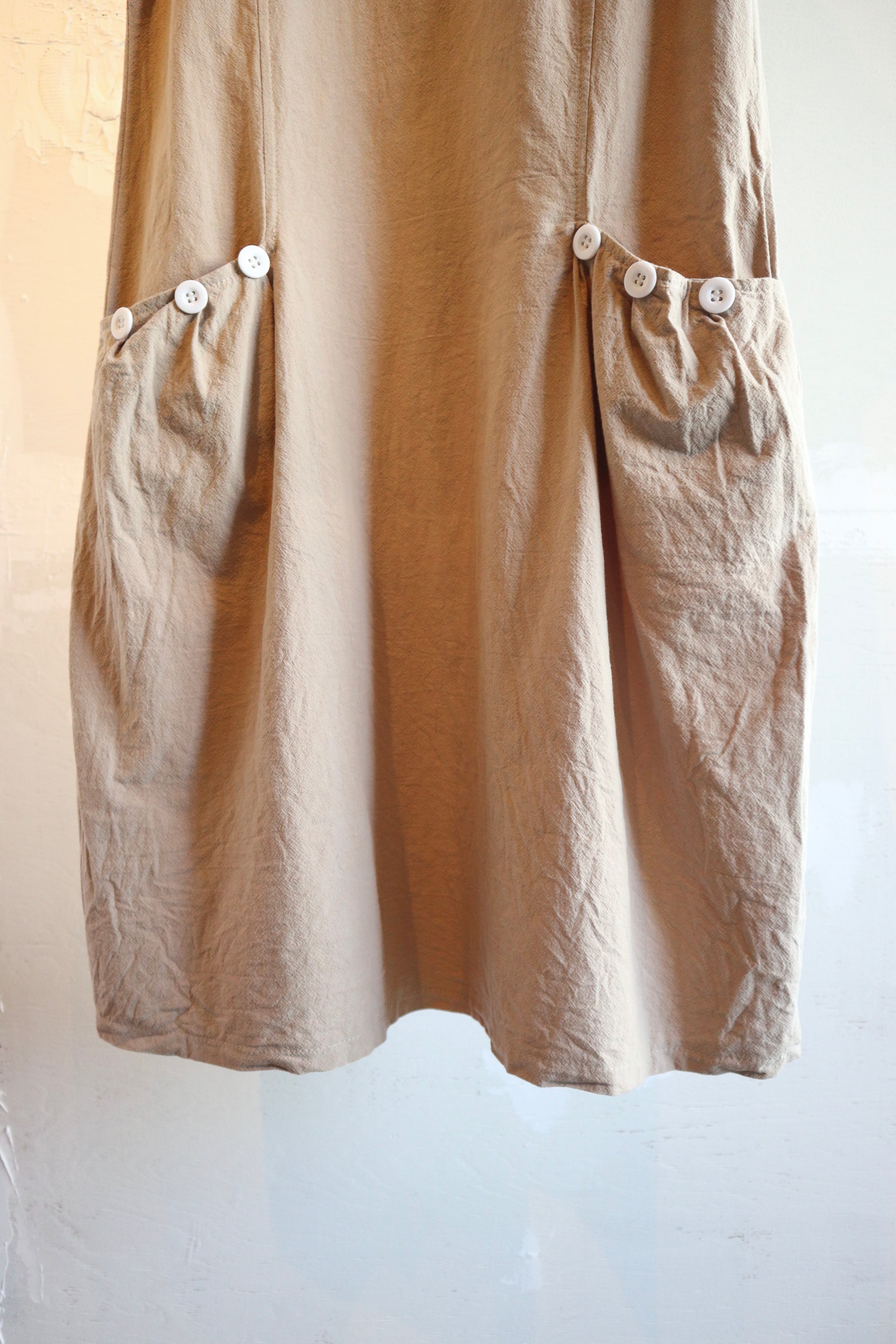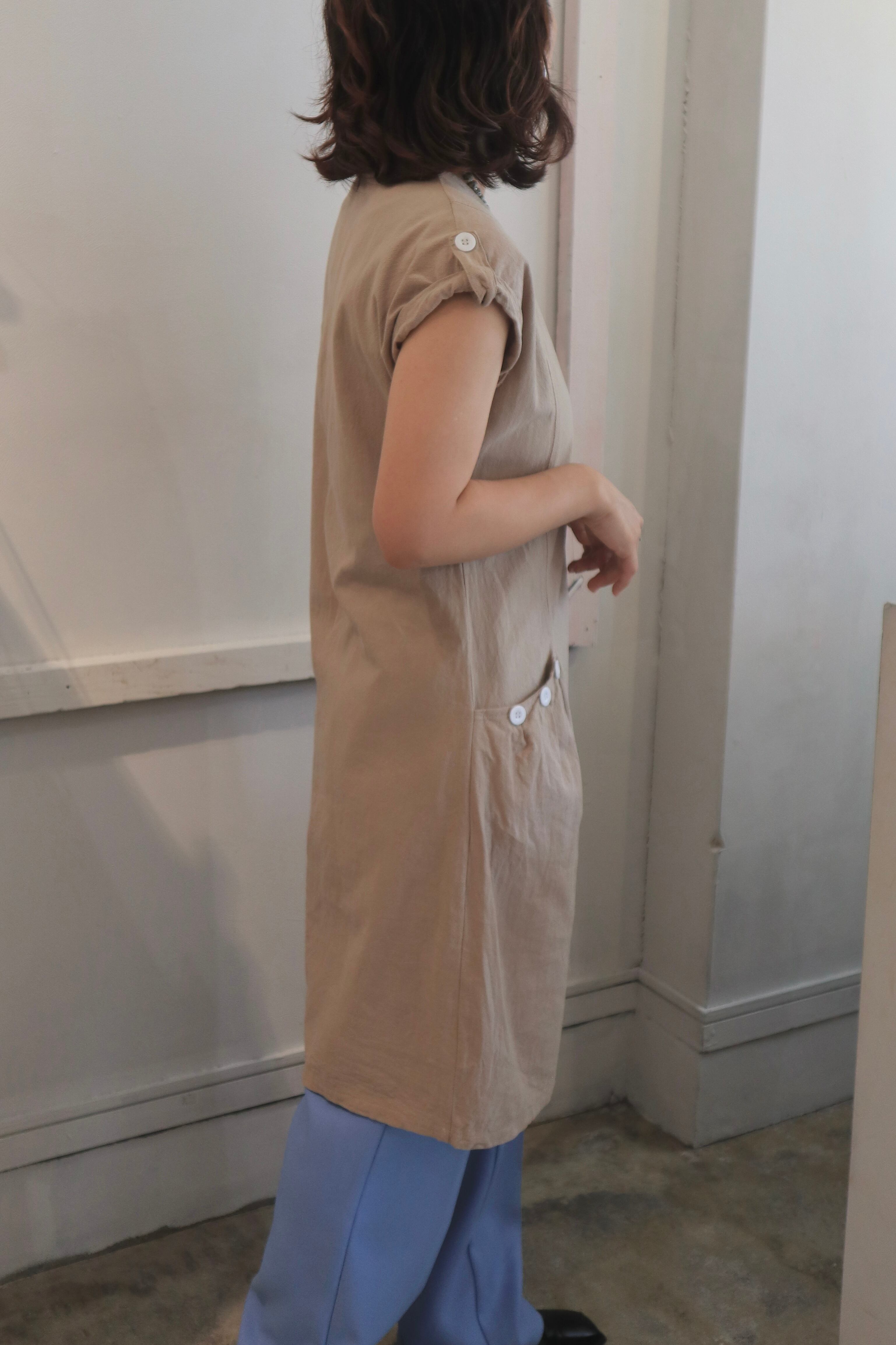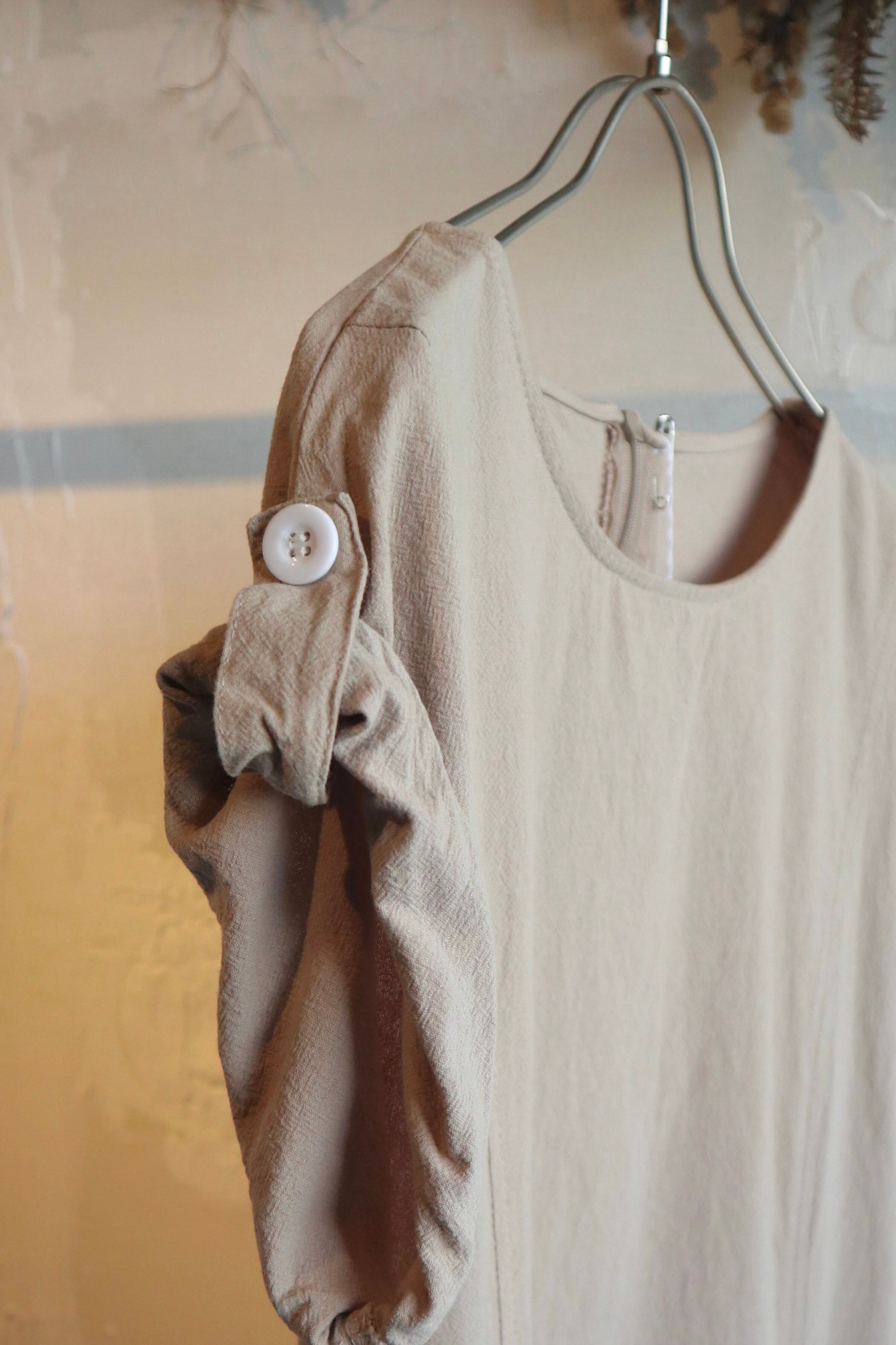 肌馴染みのいいベージュカラーにホワイトボタンがアクセントになるデザインワンピース