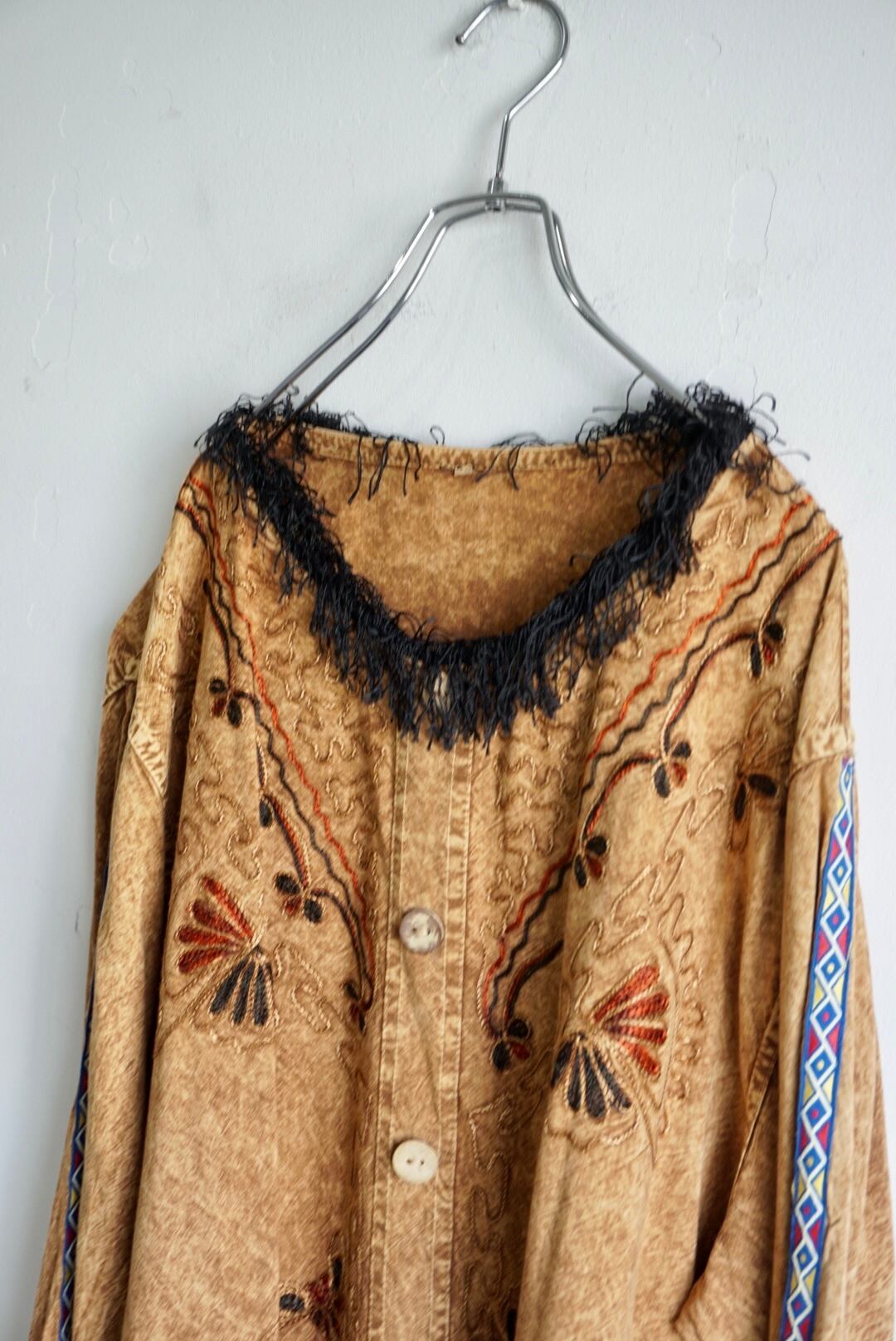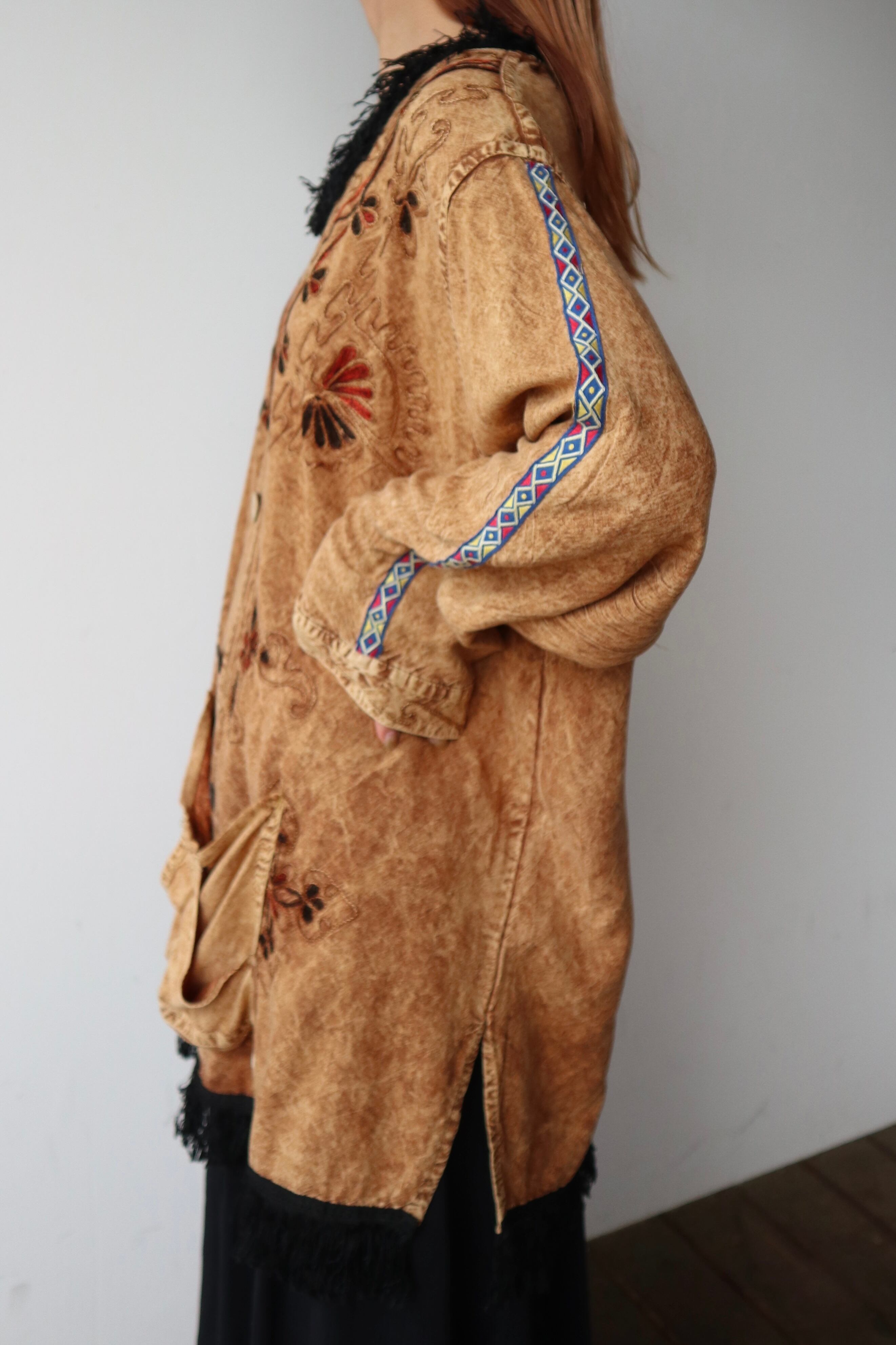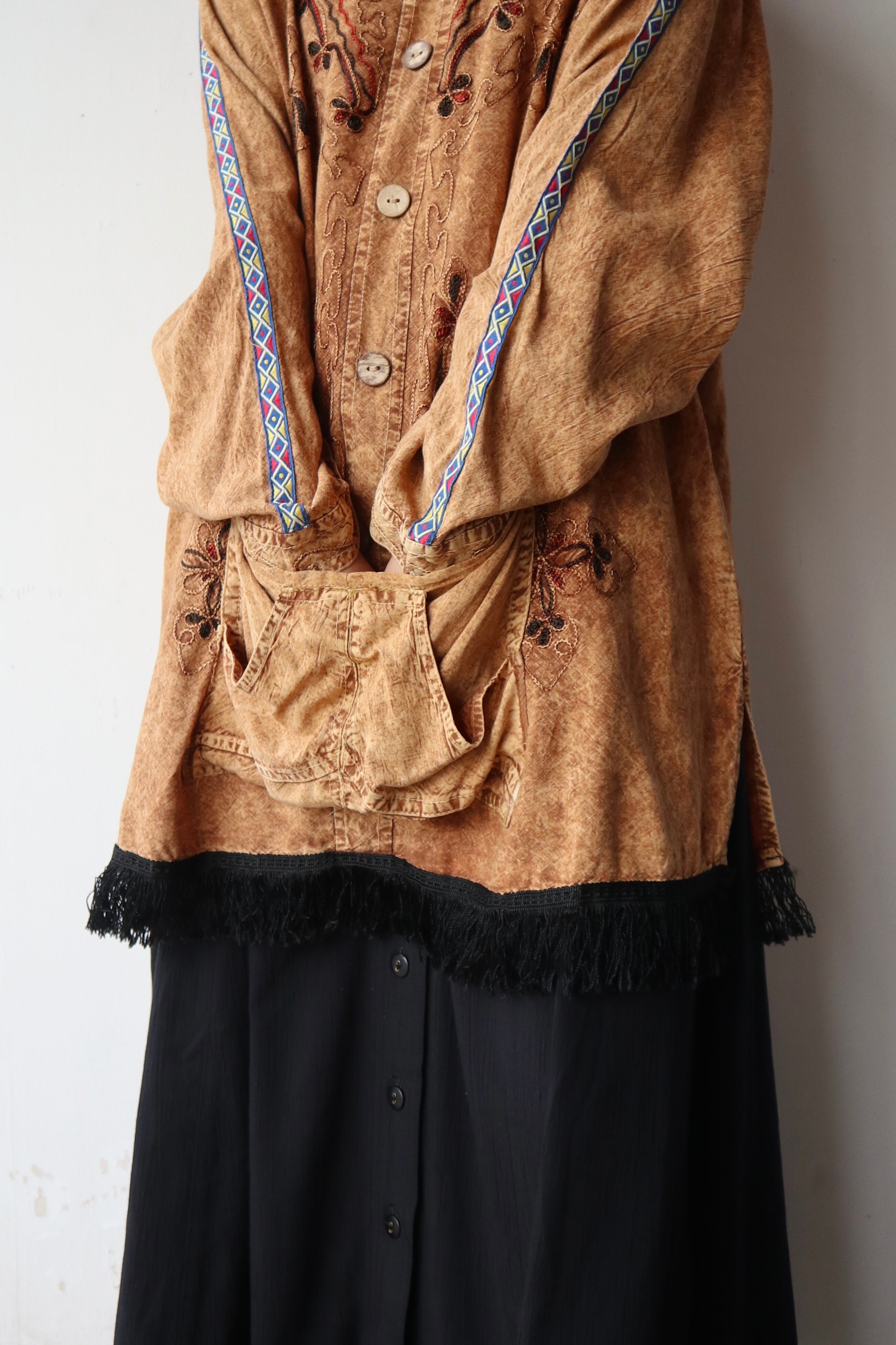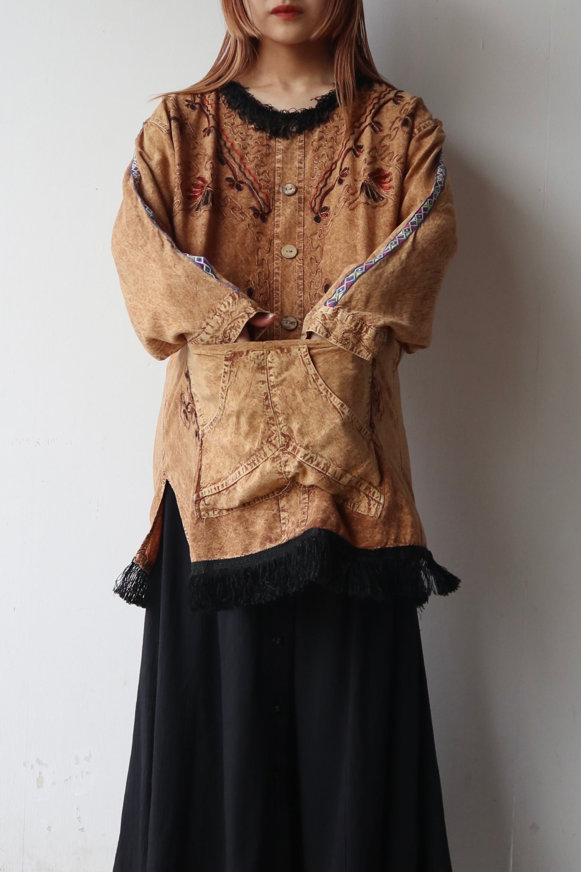 襟や裾のフリンジ、刺繍や前開きにはならないボタンや大きいポケットなどディテールたっぷりでユニークな1着