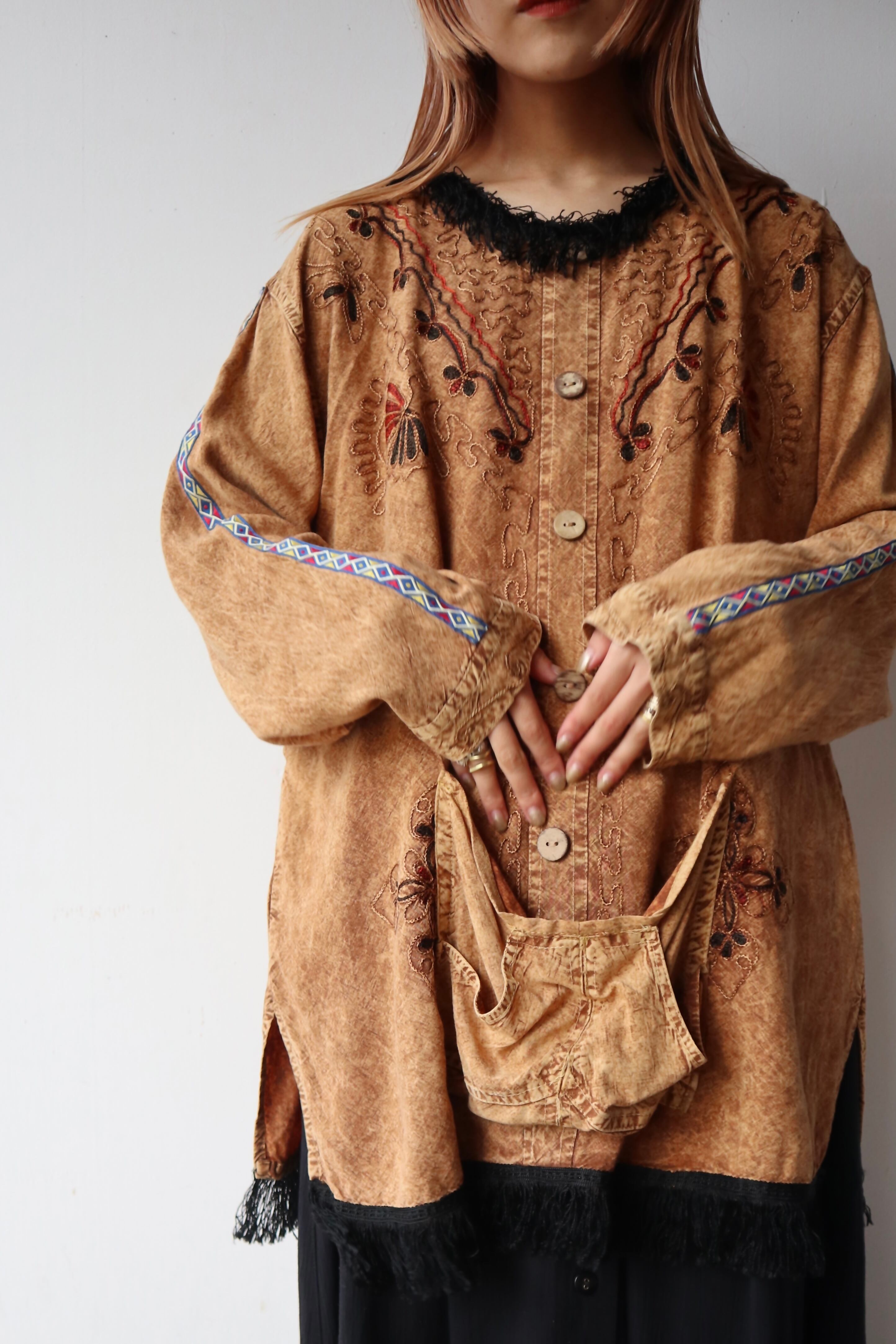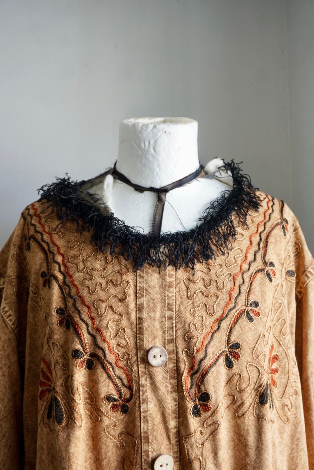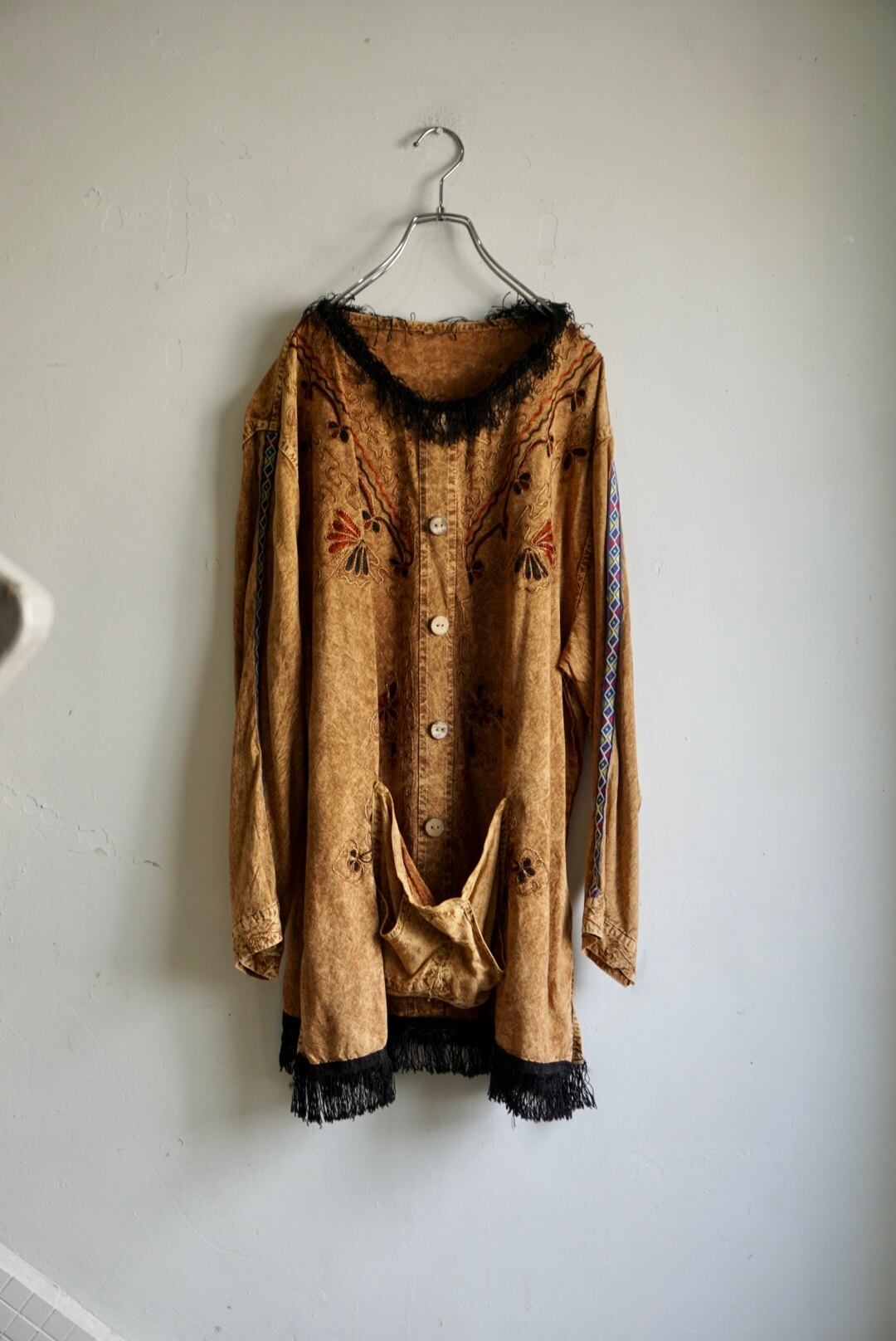 襟や裾のフリンジ、刺繍や前開きにはならないボタンや大きいポケットなどディテールたっぷりでユニークな1着