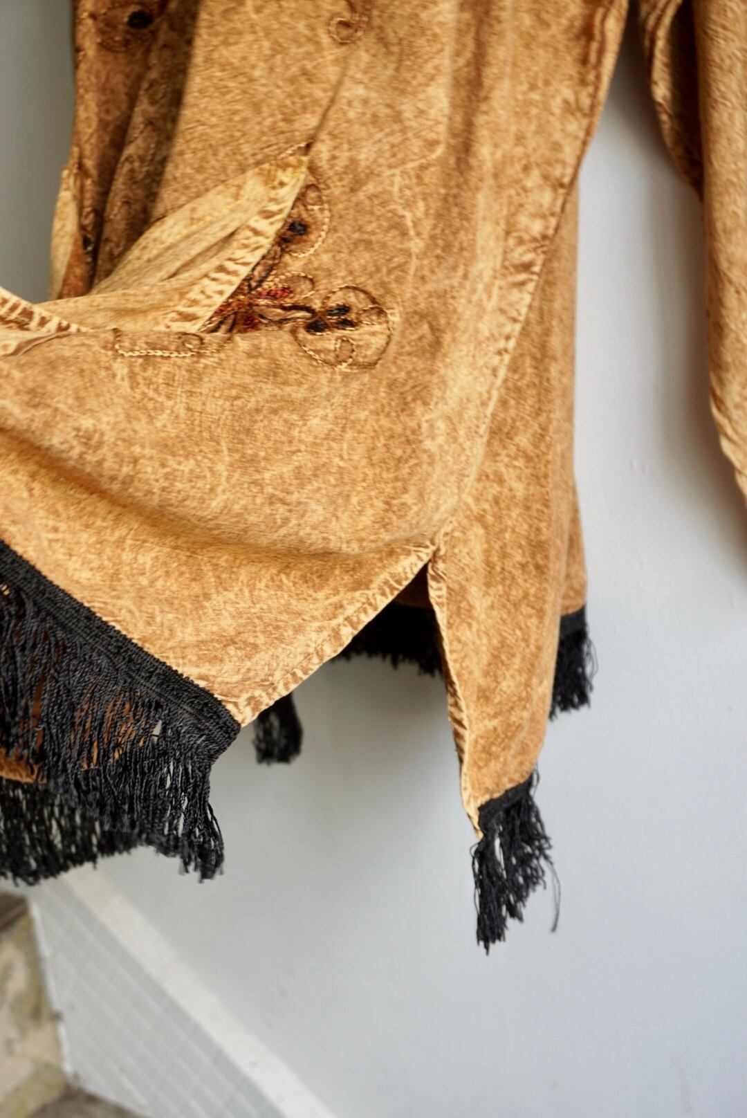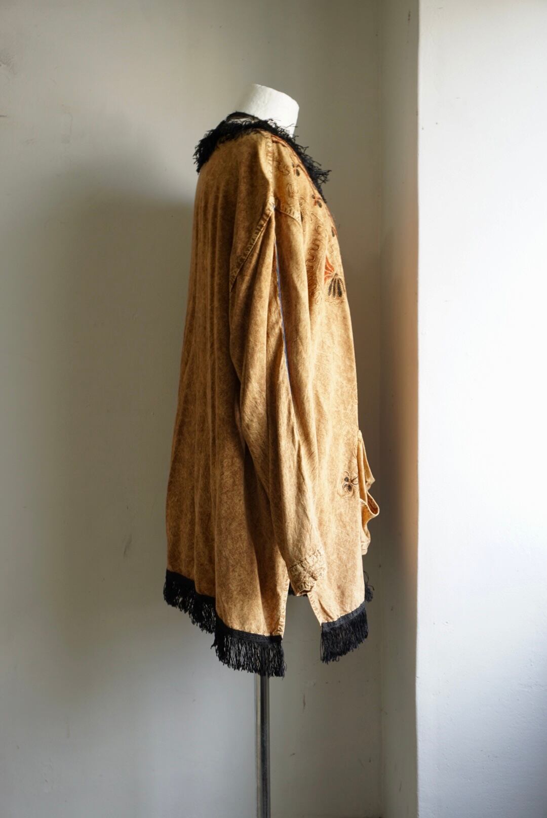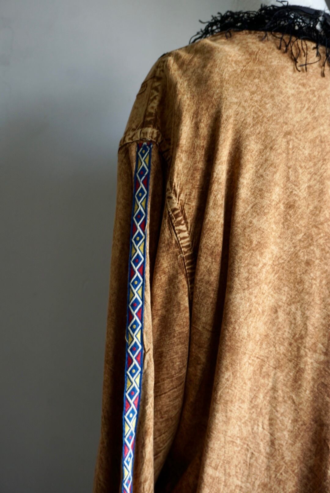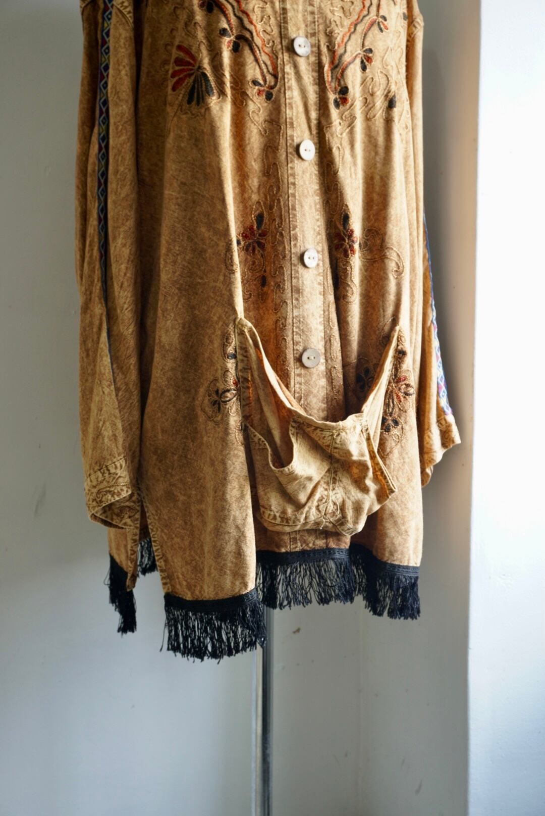 襟や裾のフリンジ、刺繍や前開きにはならないボタンや大きいポケットなどディテールたっぷりでユニークな1着