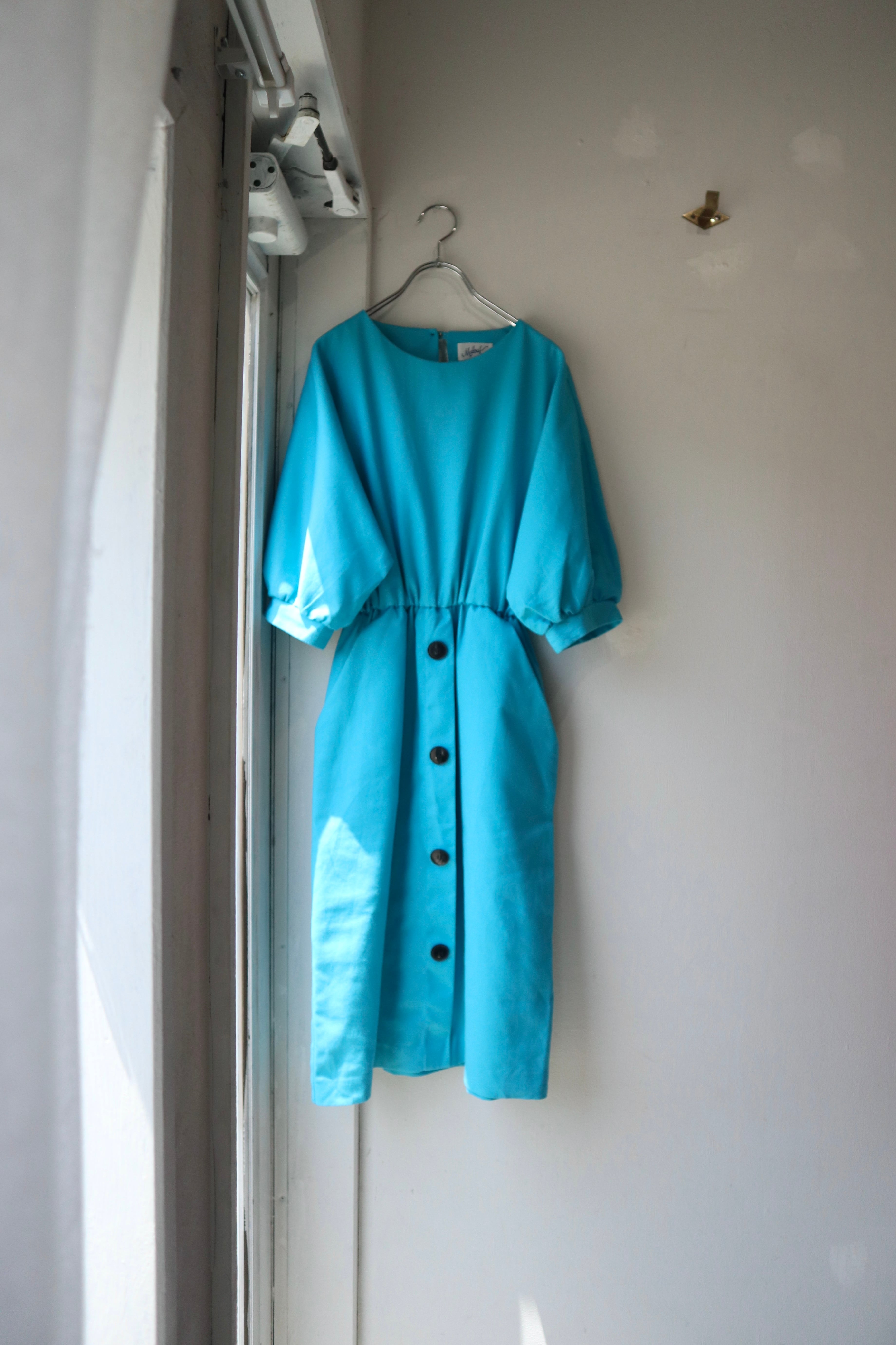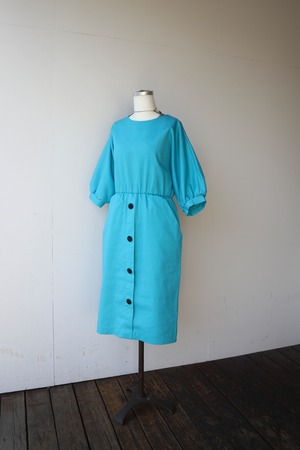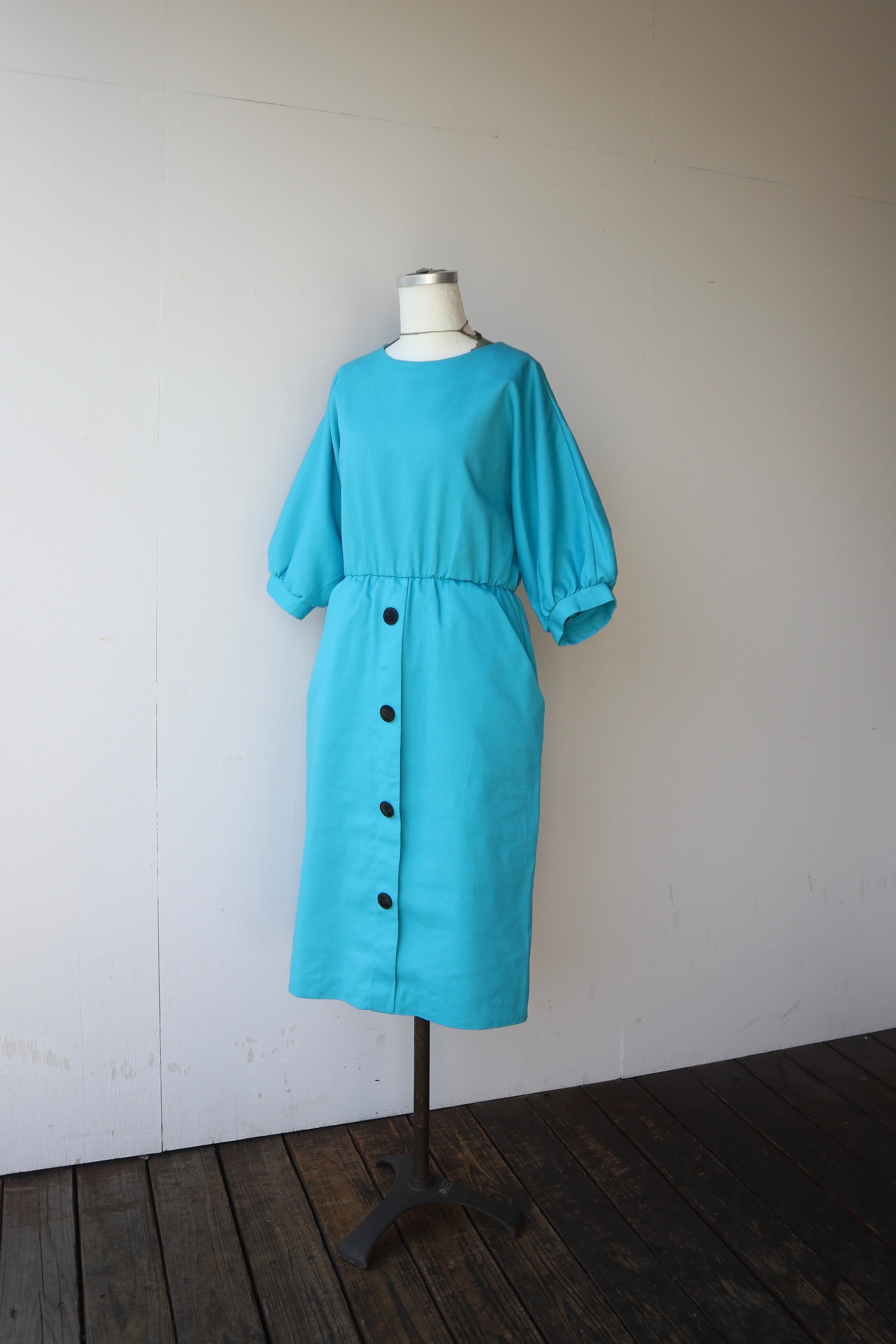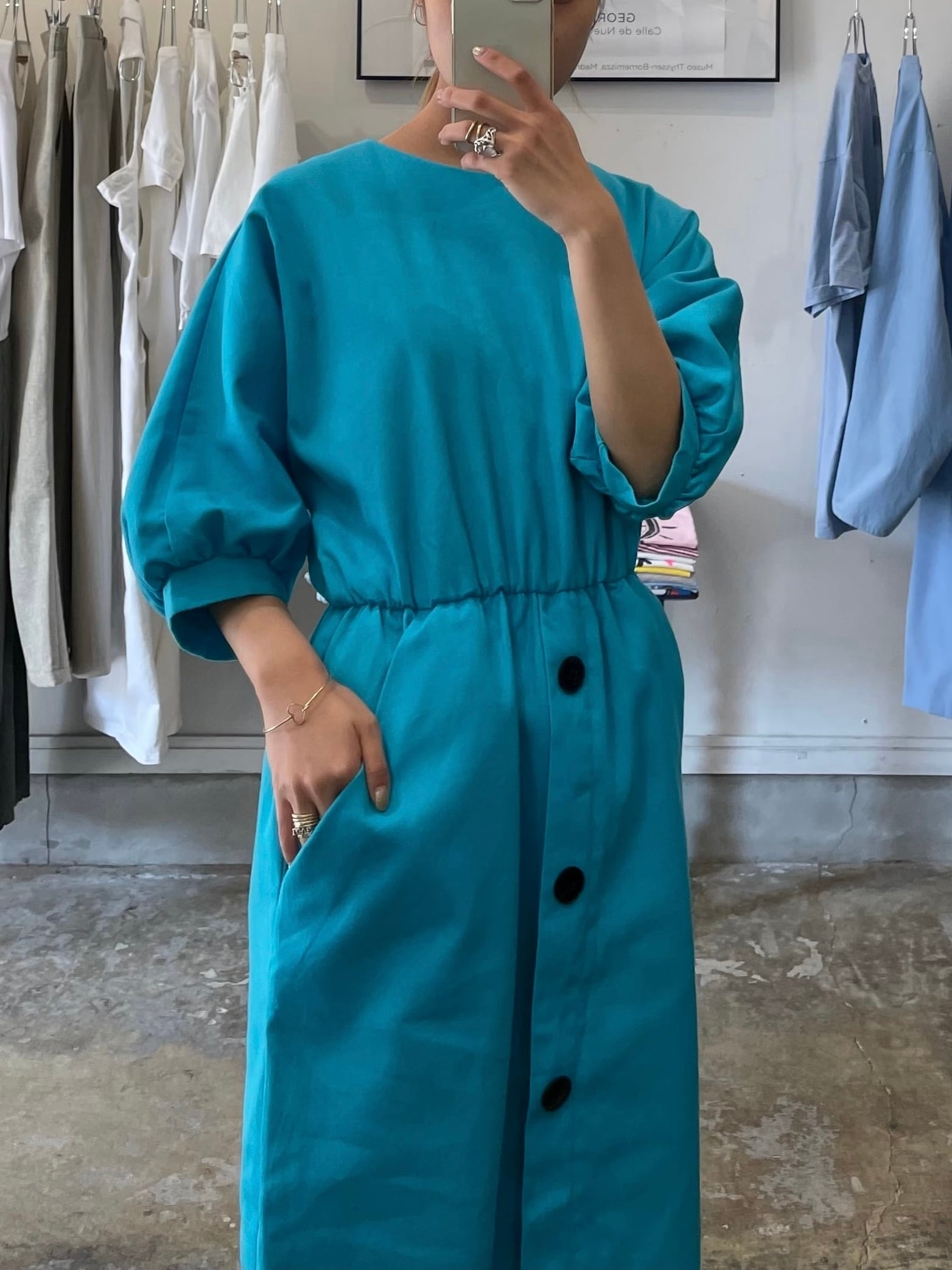 袖は脇下からゆったり広がり袖口でキュッととまるシルエット。ウエストはゴムでギャザーになっており着心地も良い1着