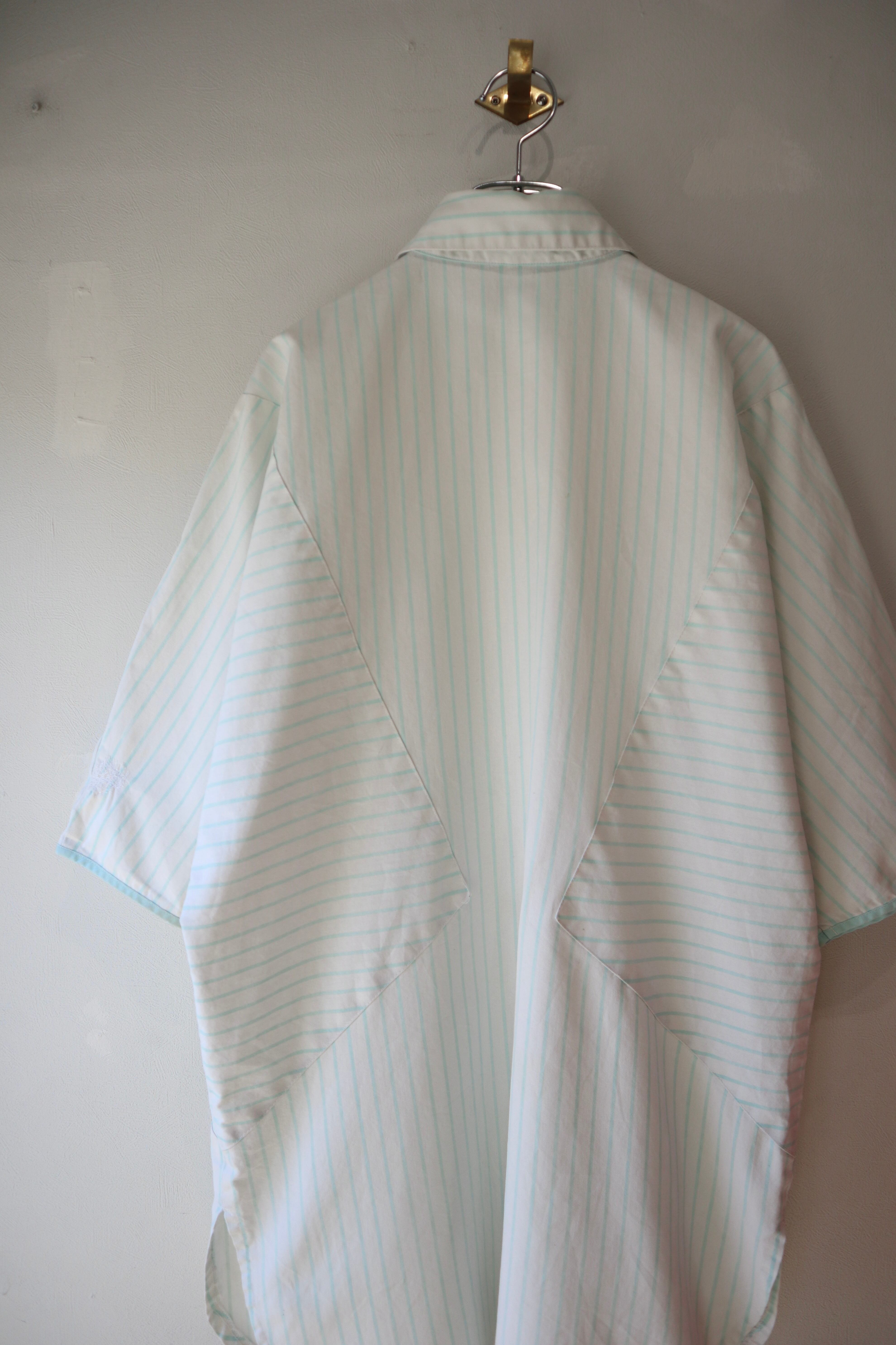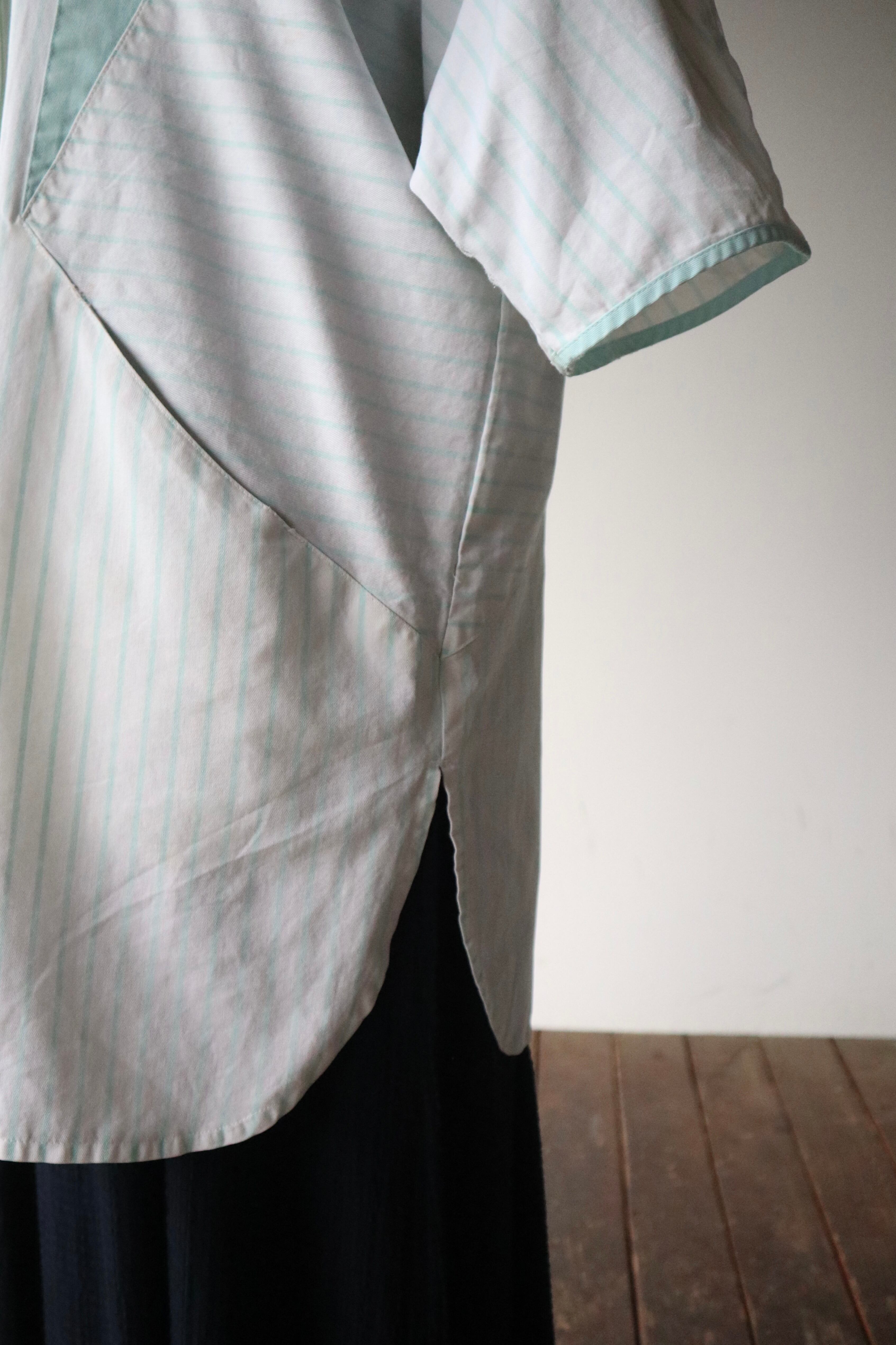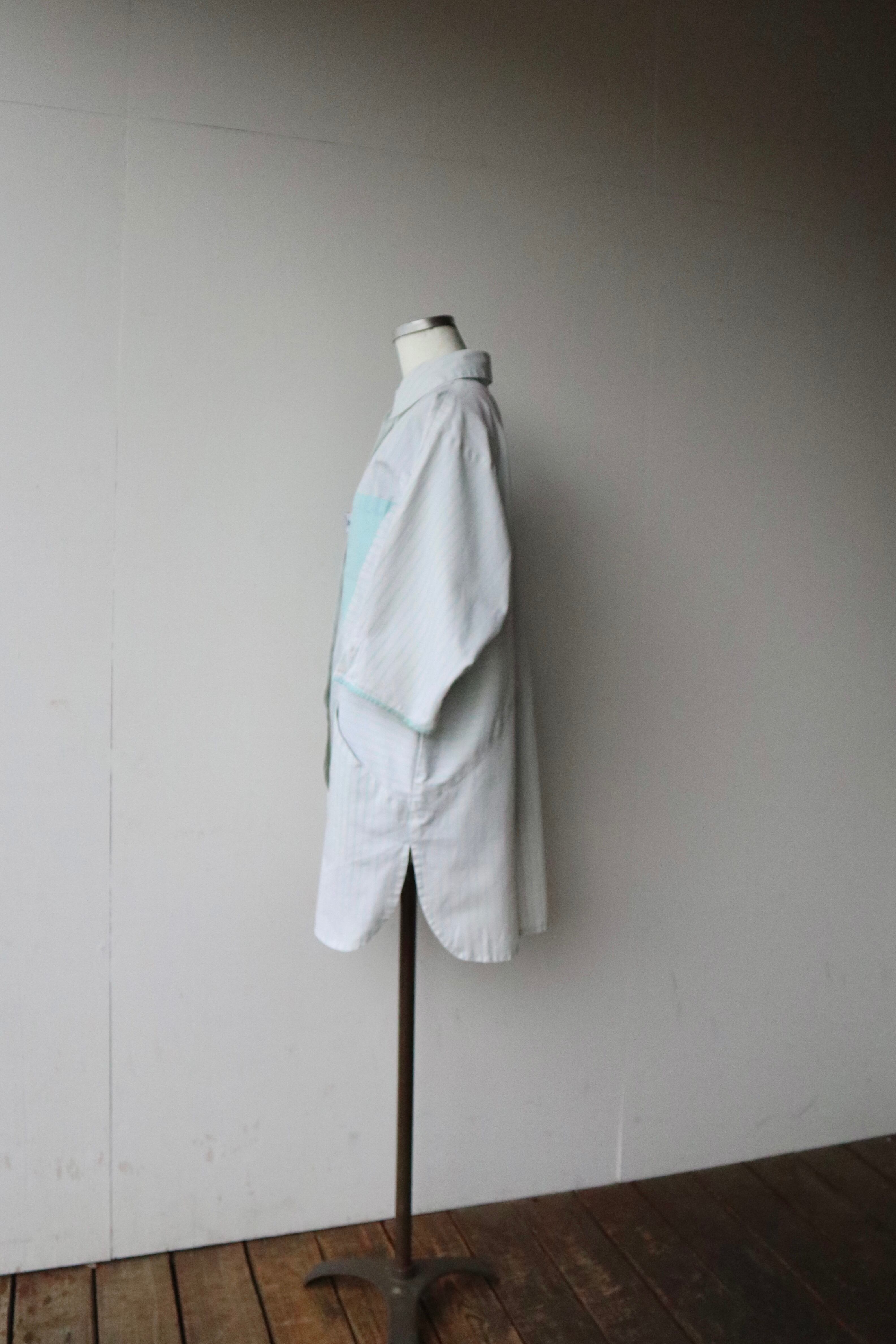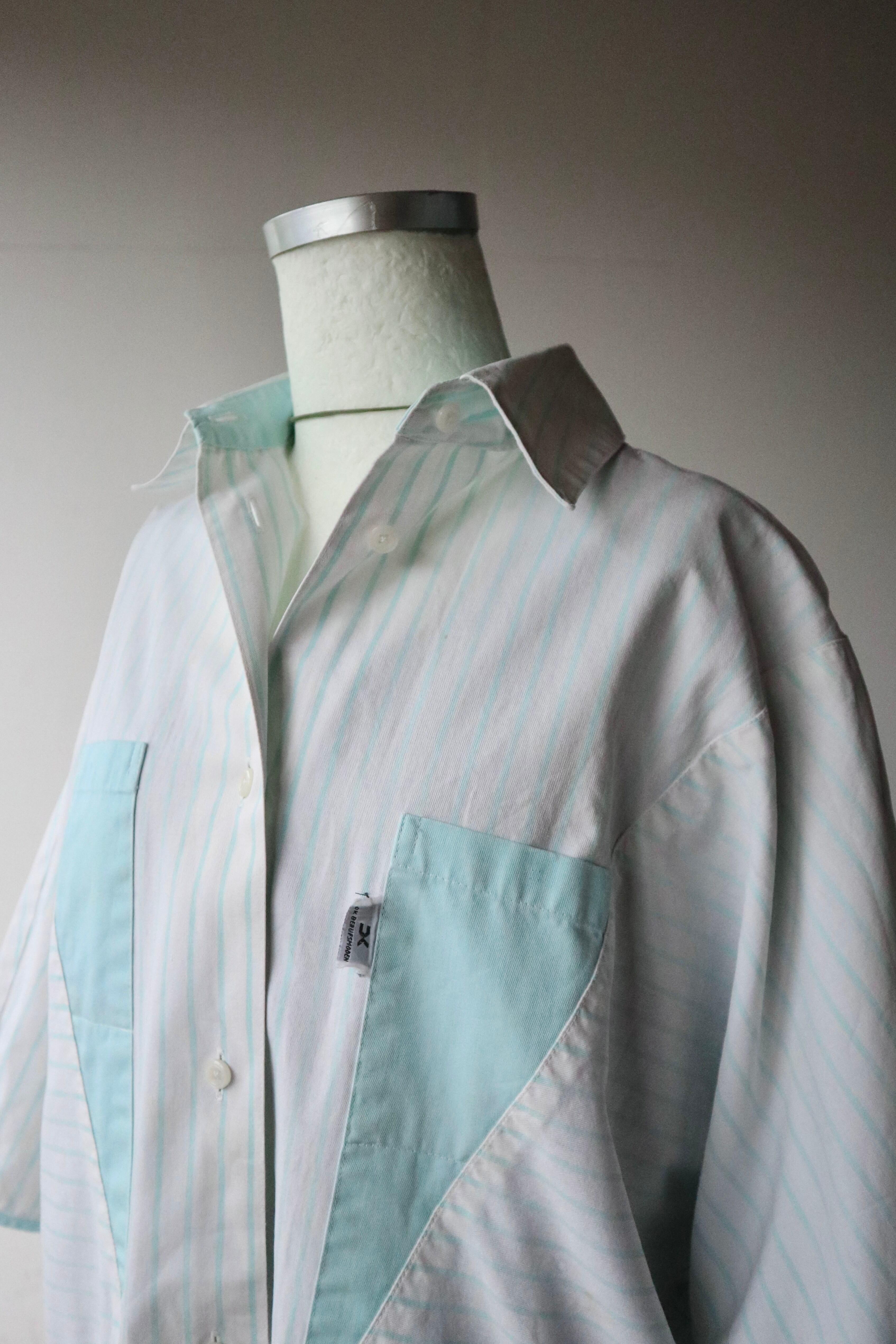 ストライプ柄の切替と三角形の4つポケットのデザインが特徴的なシャツ