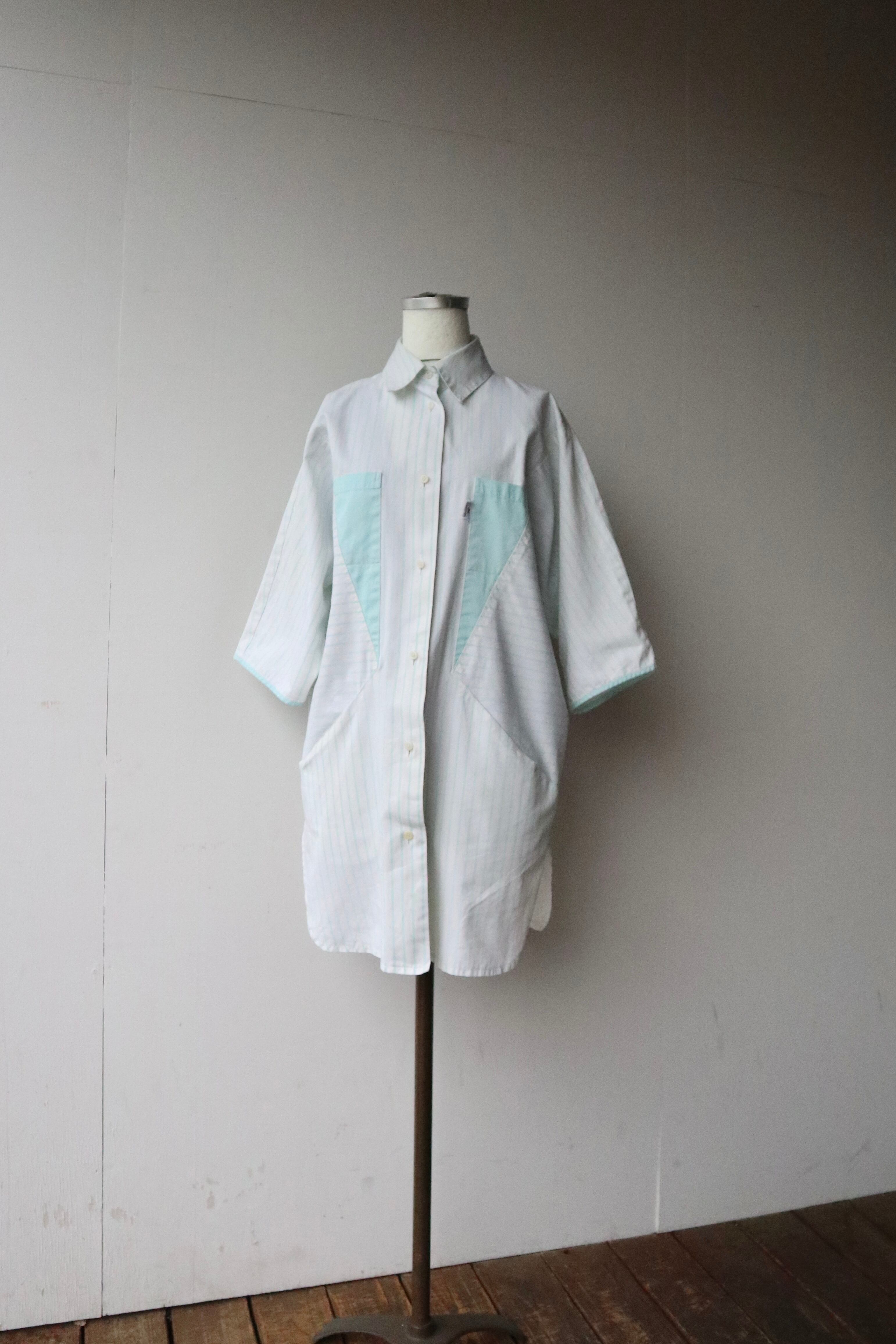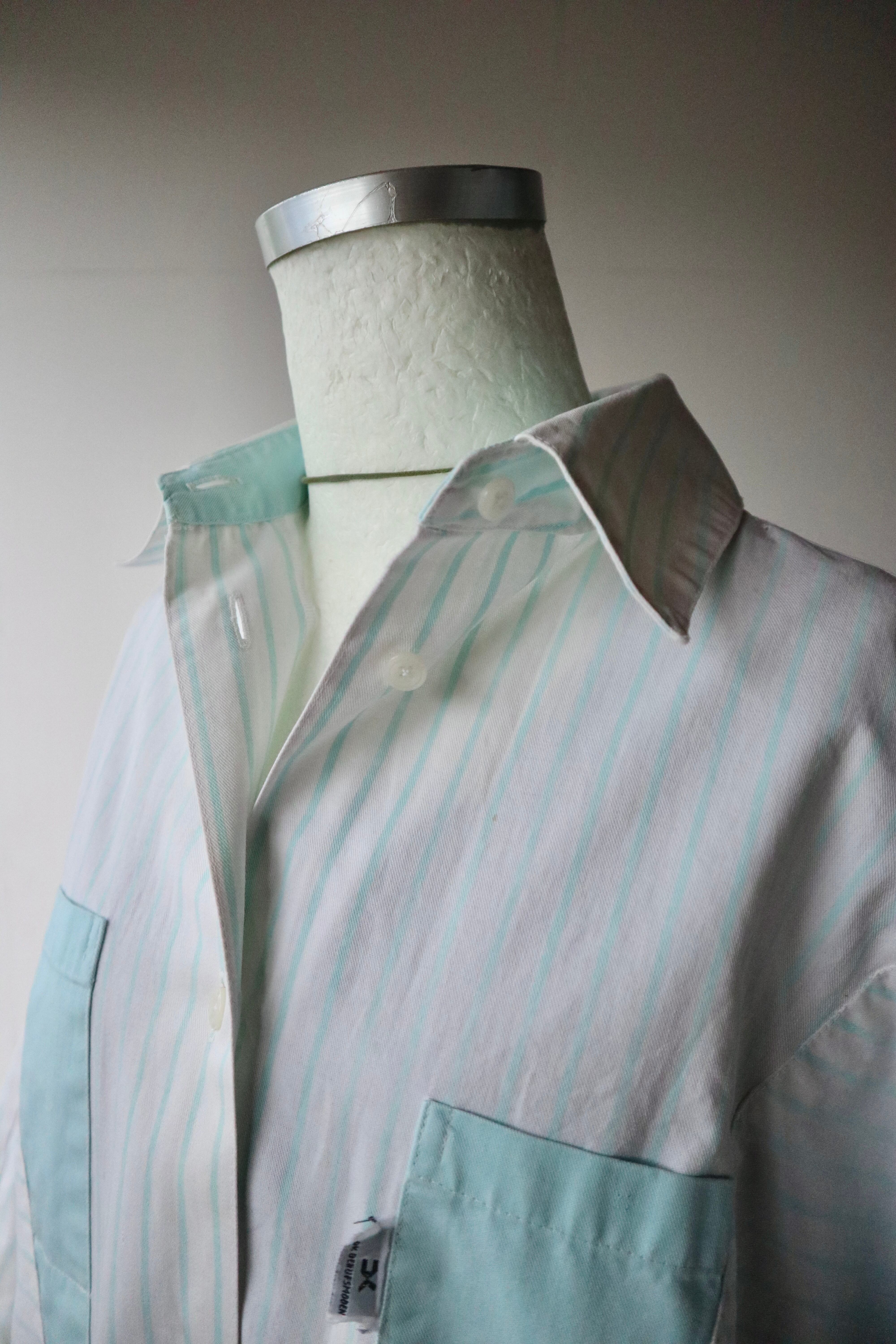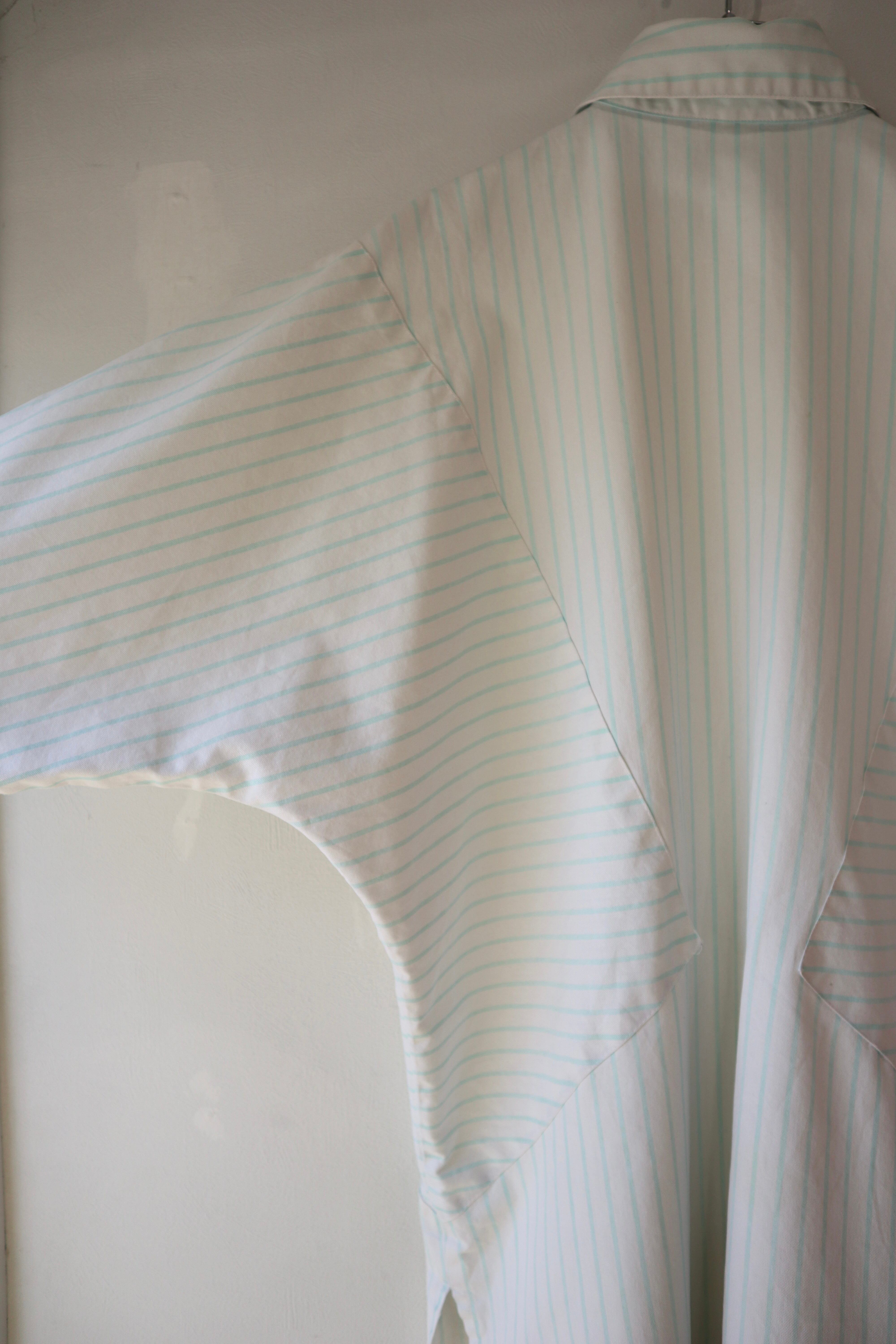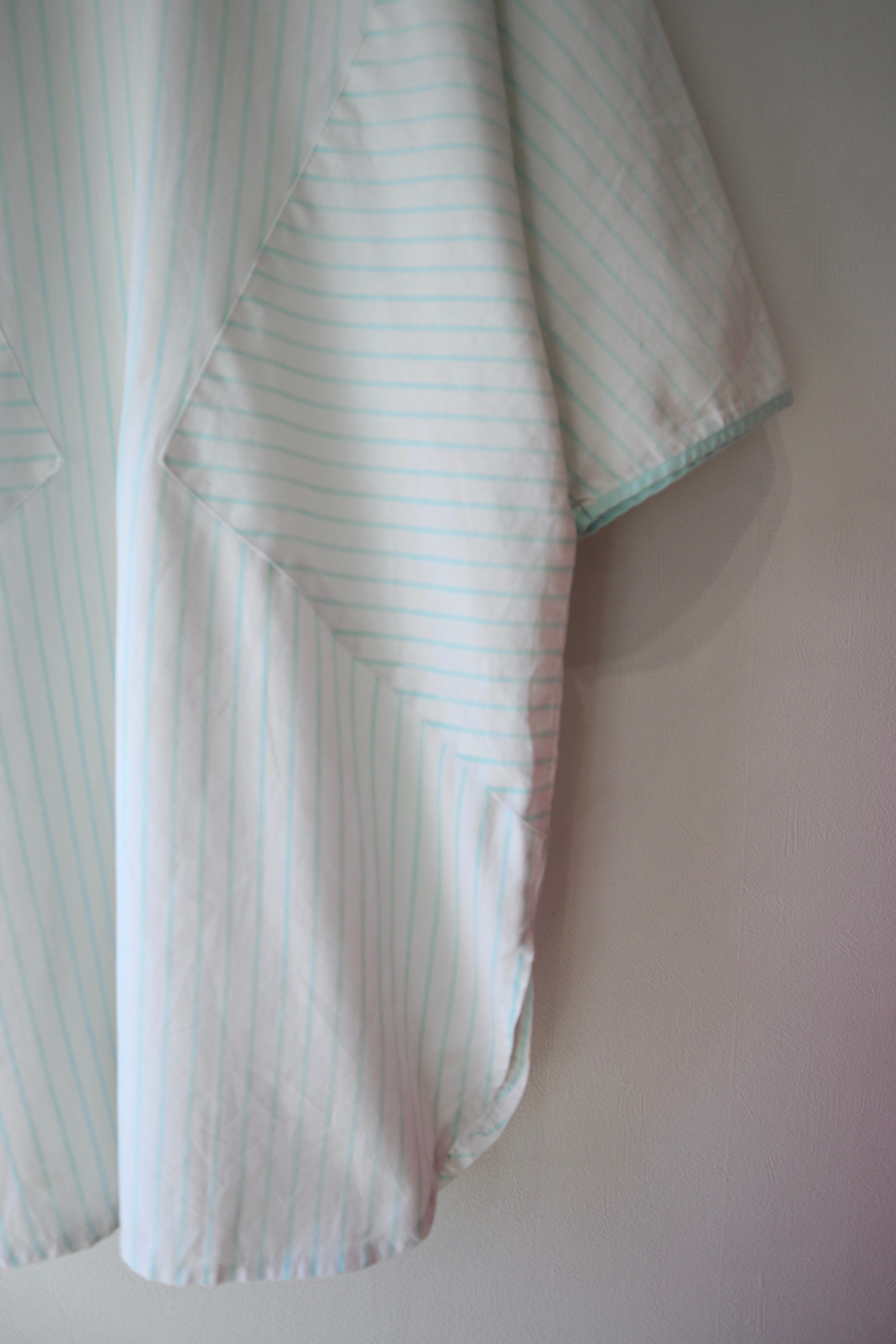ストライプ柄の切替と三角形の4つポケットのデザインが特徴的なシャツ