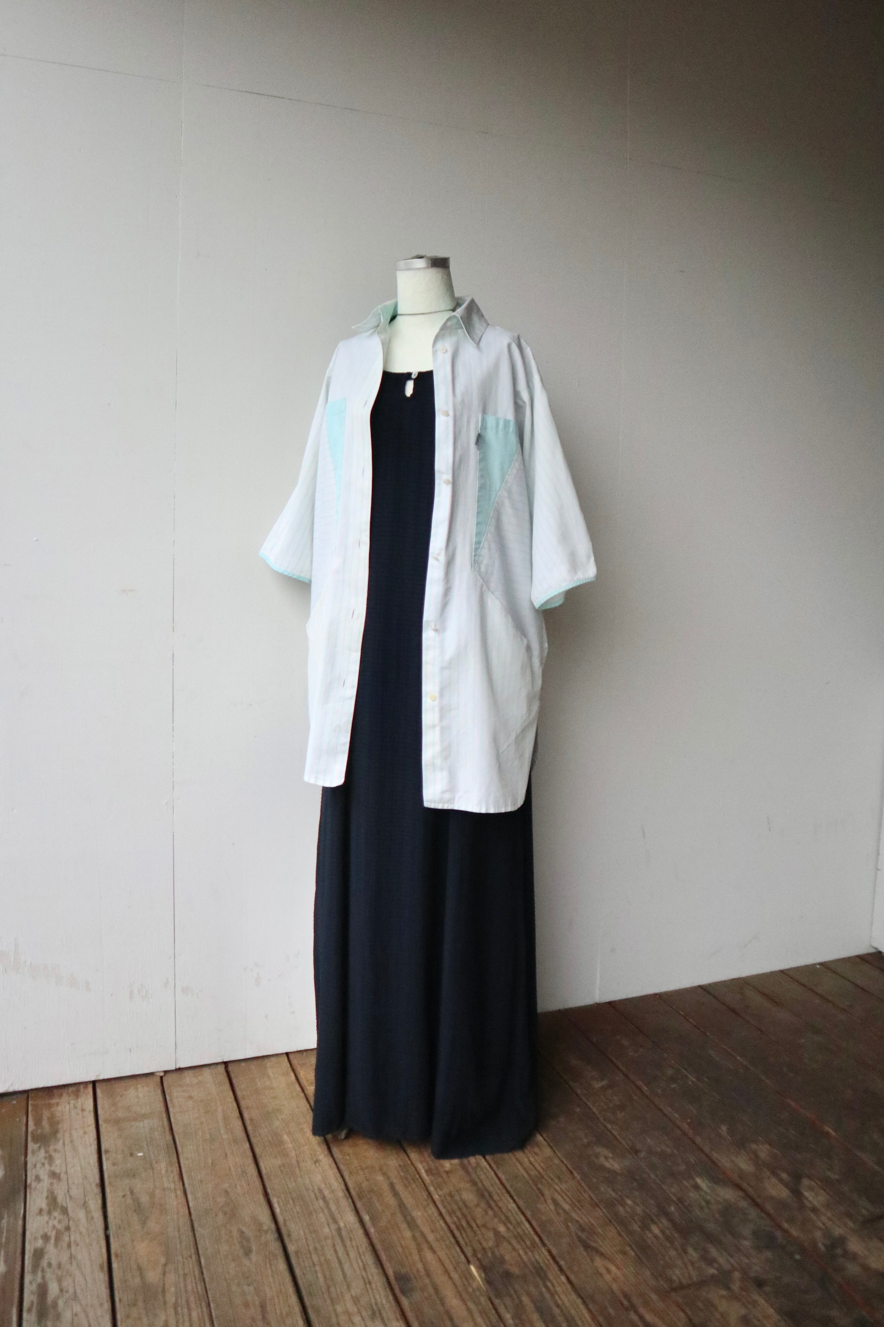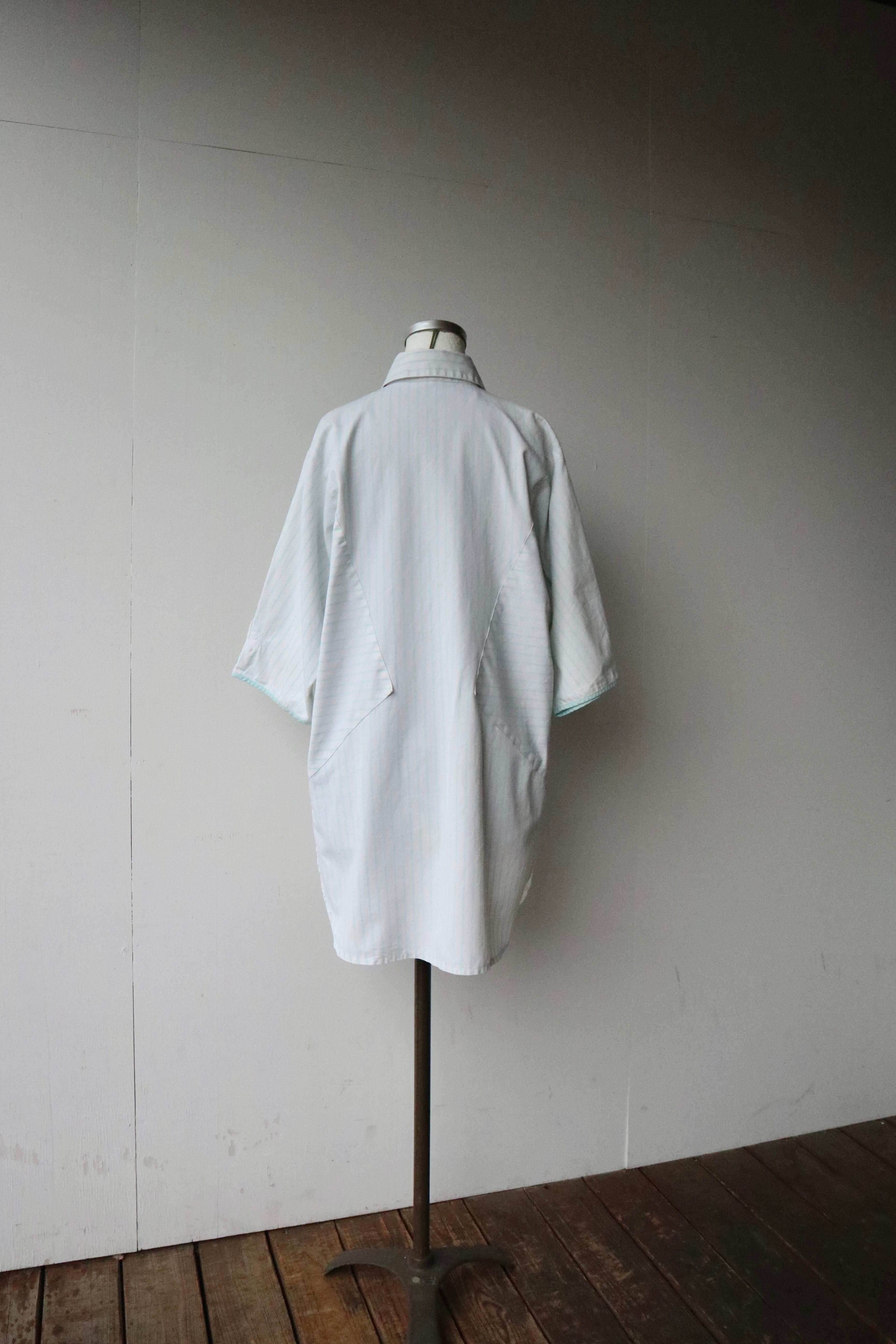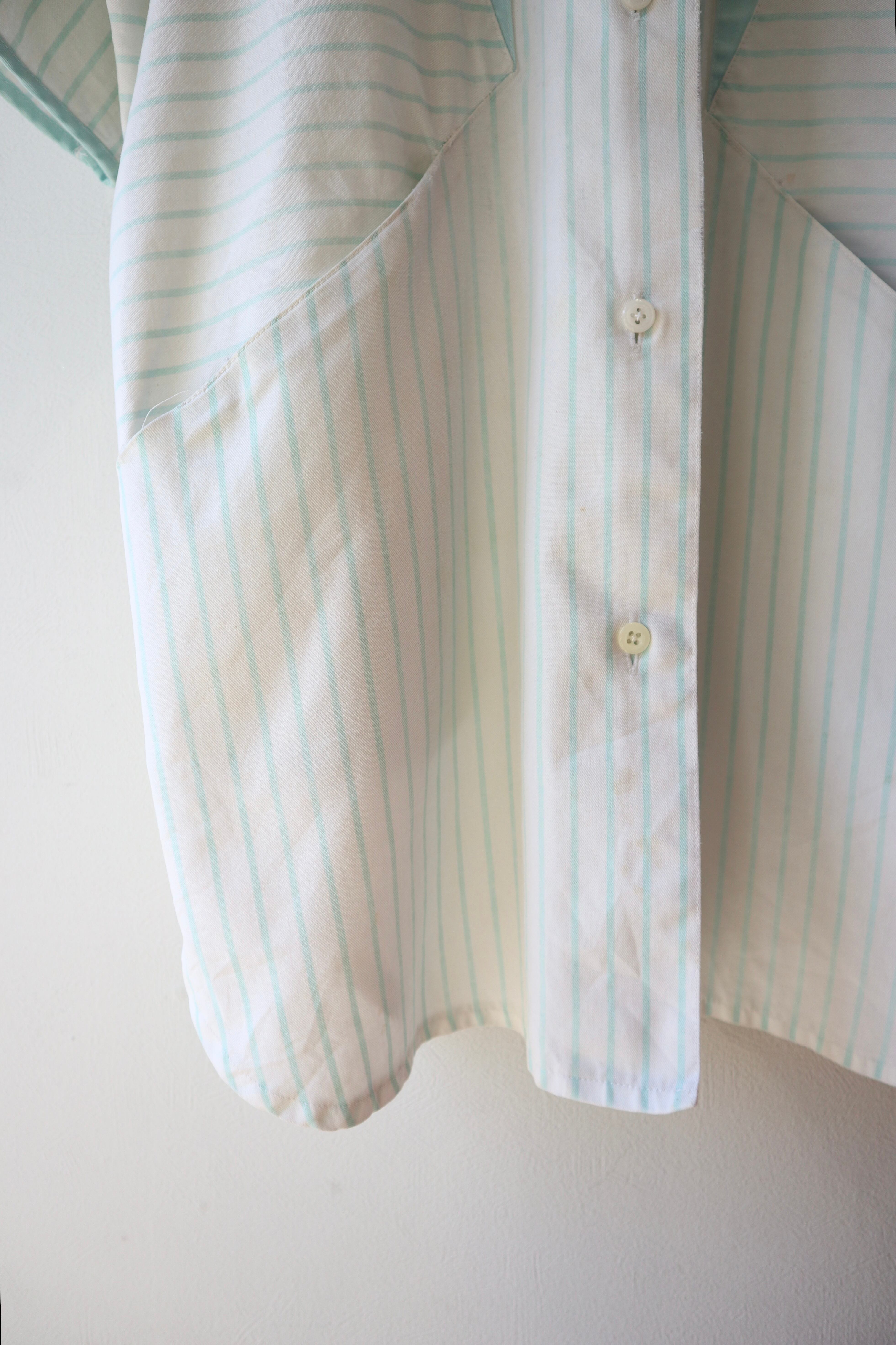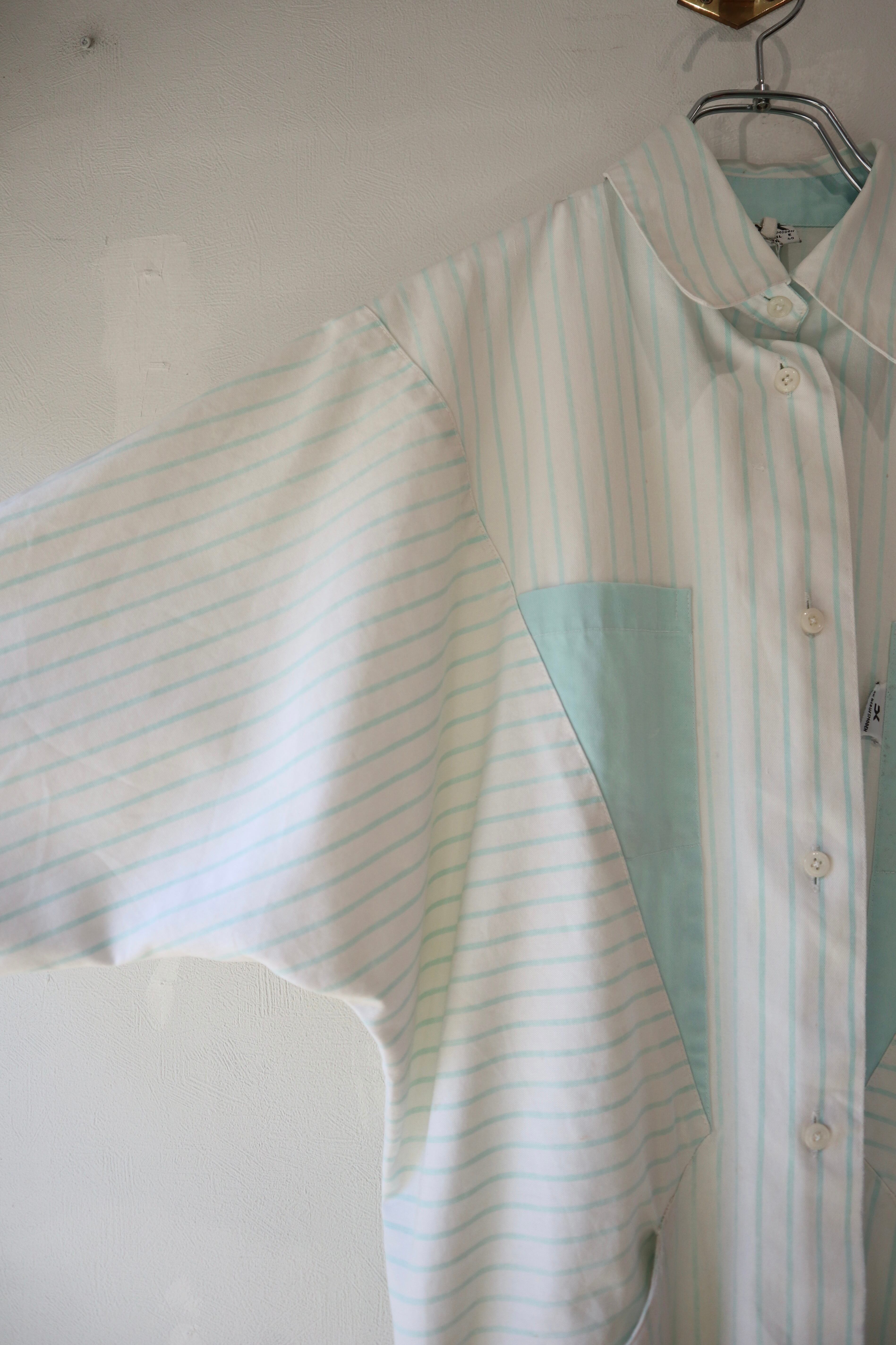 ストライプ柄の切替と三角形の4つポケットのデザインが特徴的なシャツ