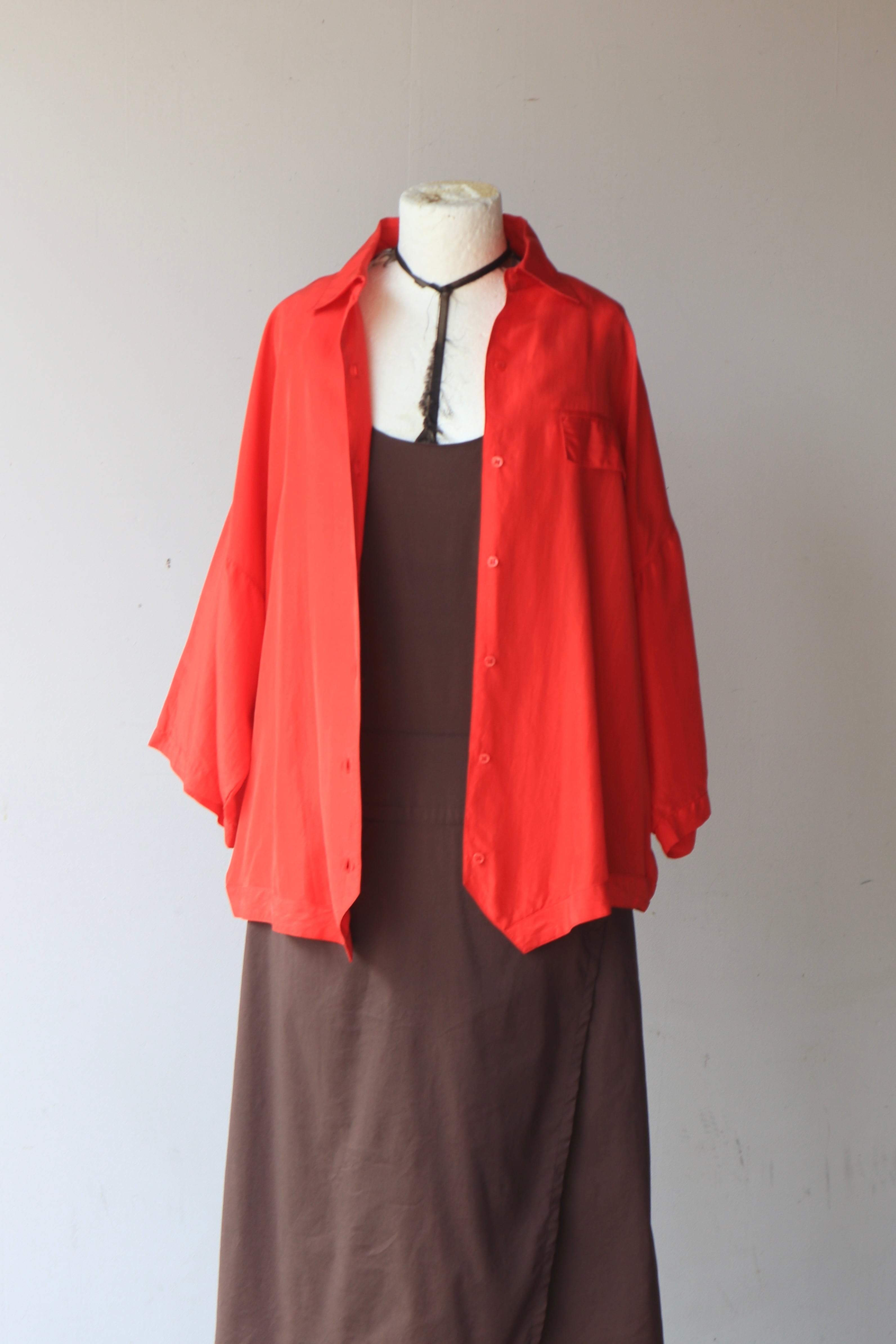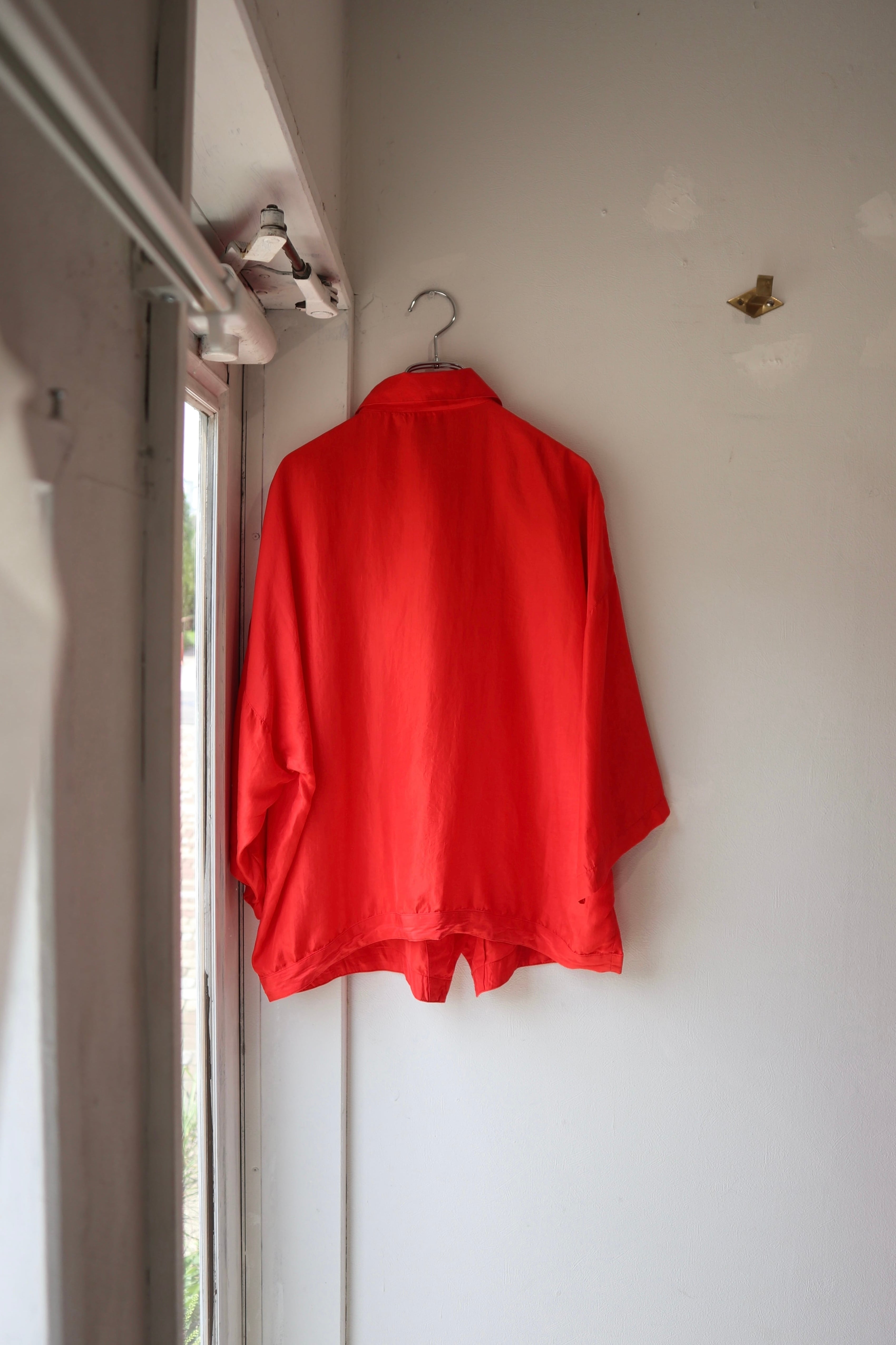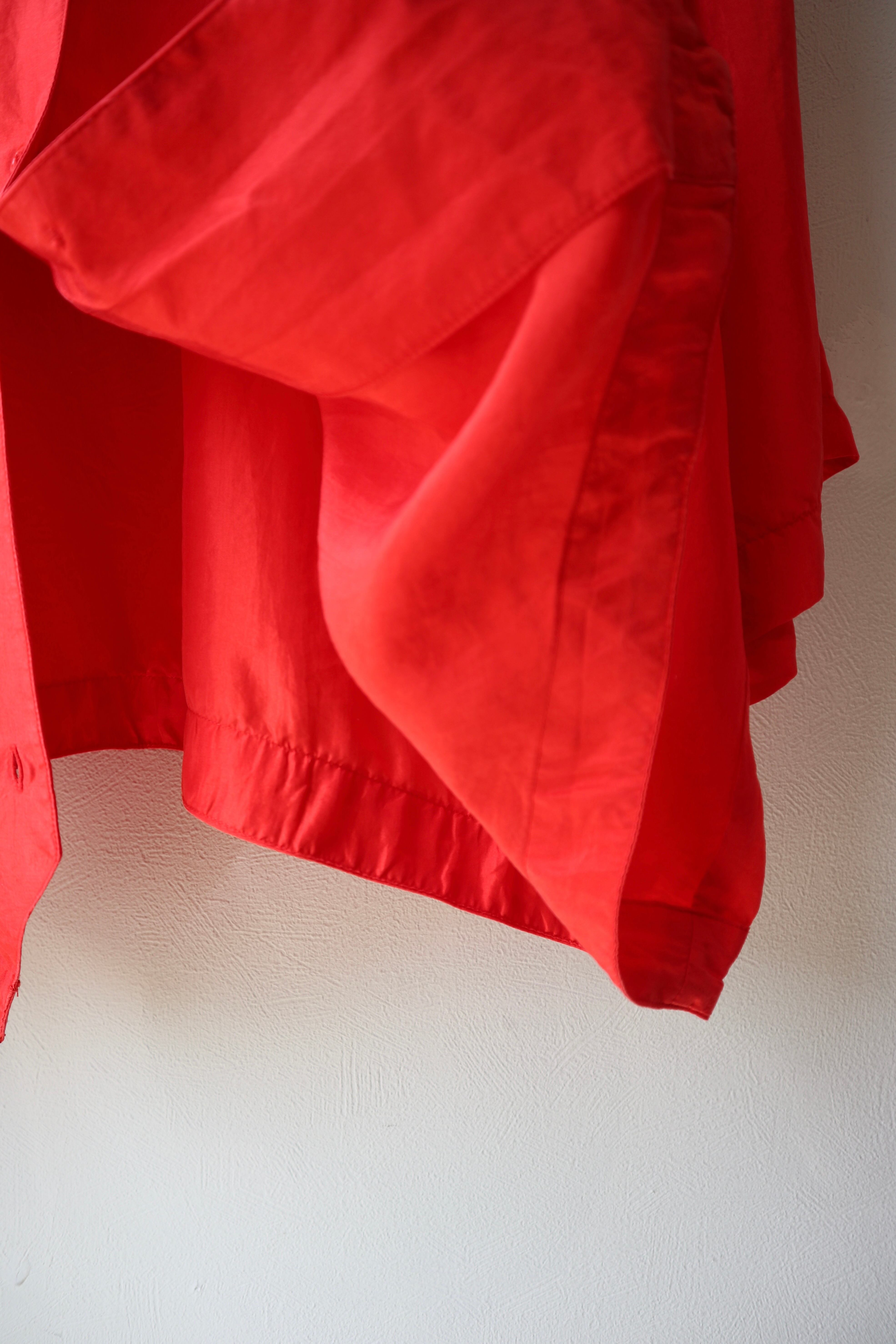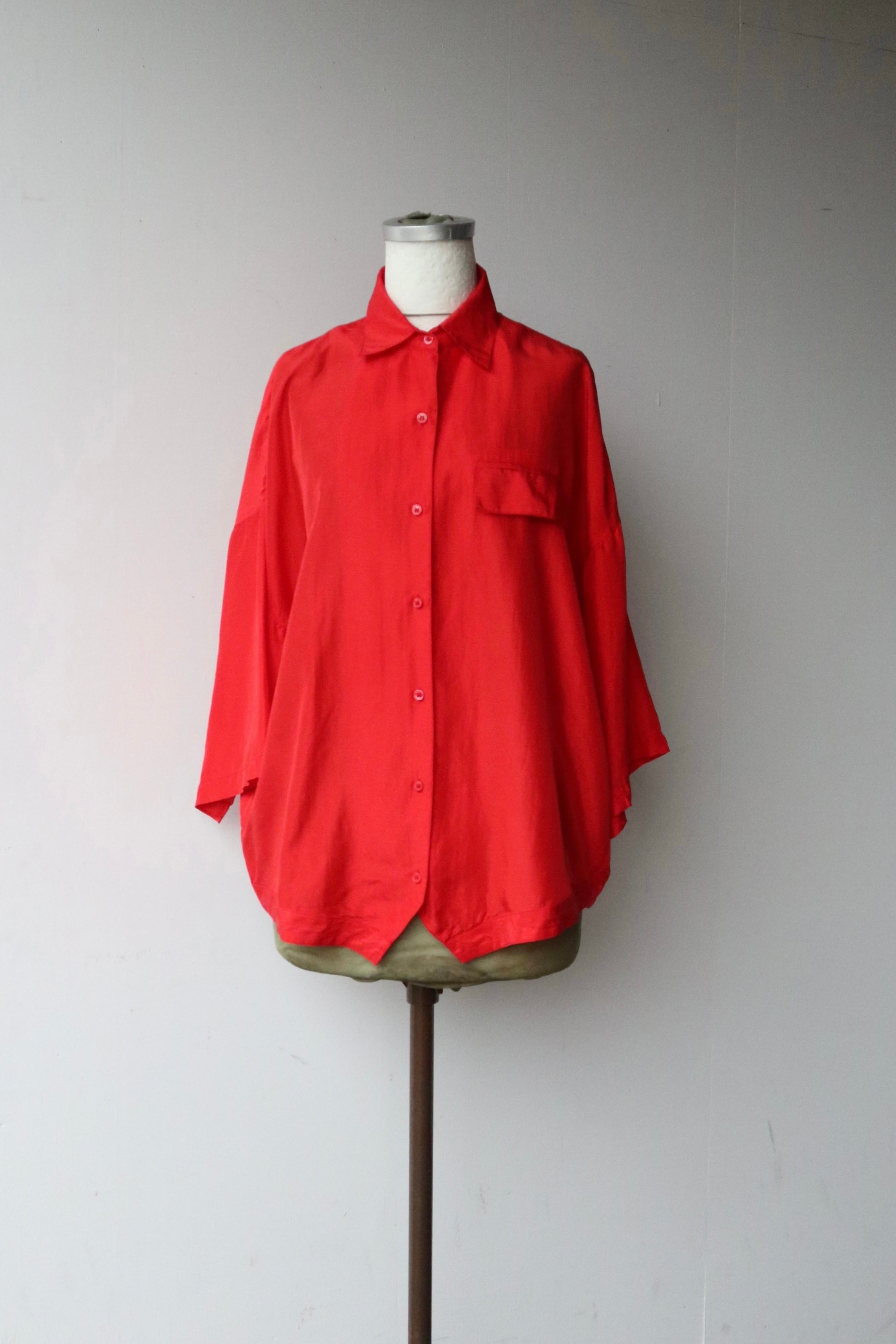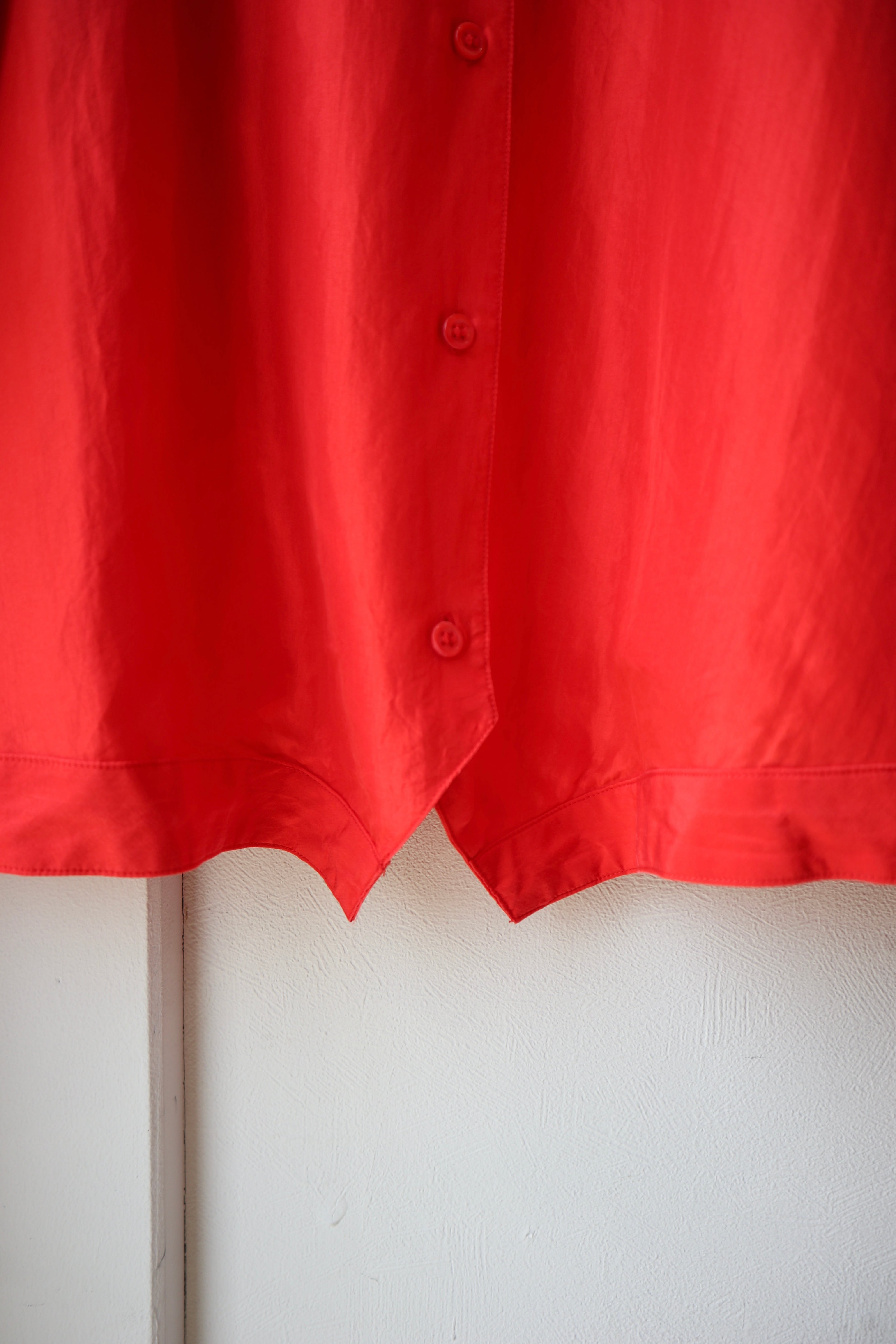 シルクのほどよい光沢感とビビットなレッドカラーがコーディネートの主役になるシルクシャツ