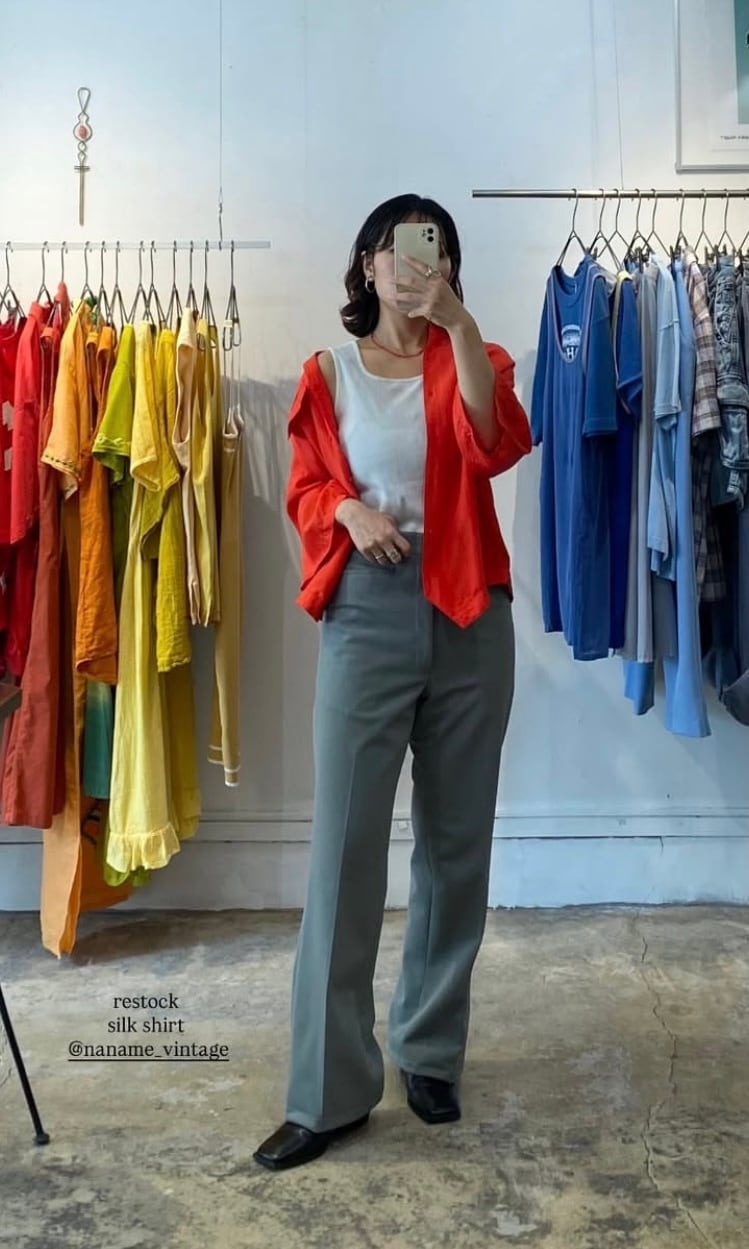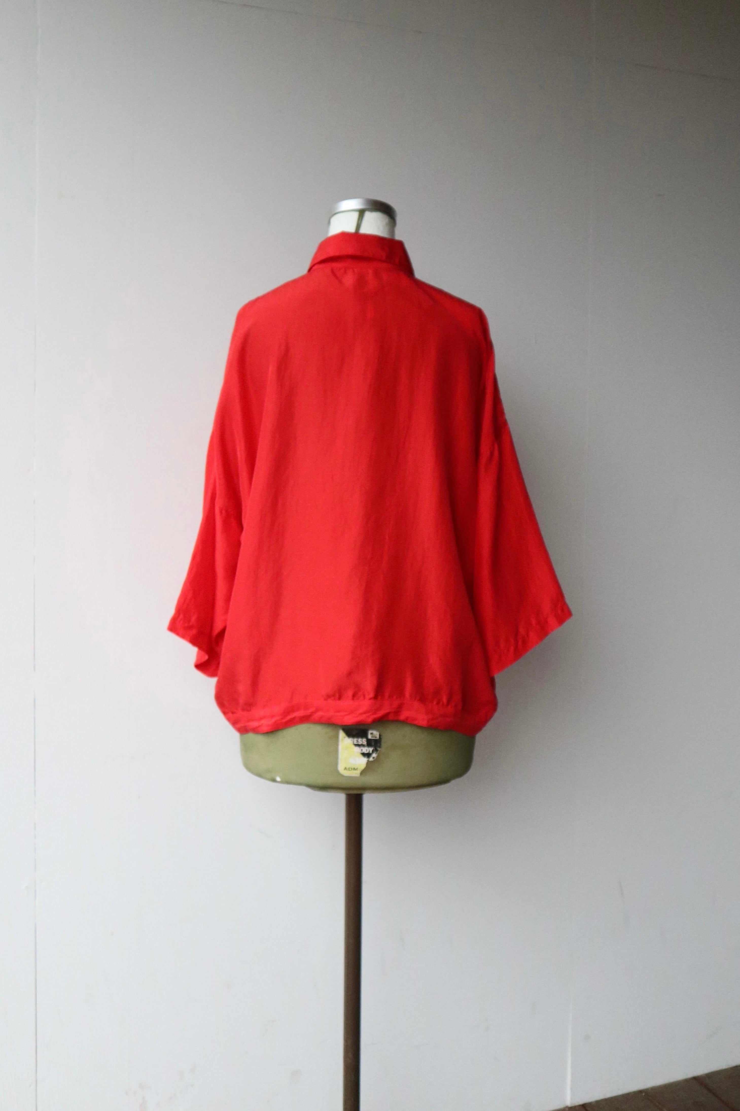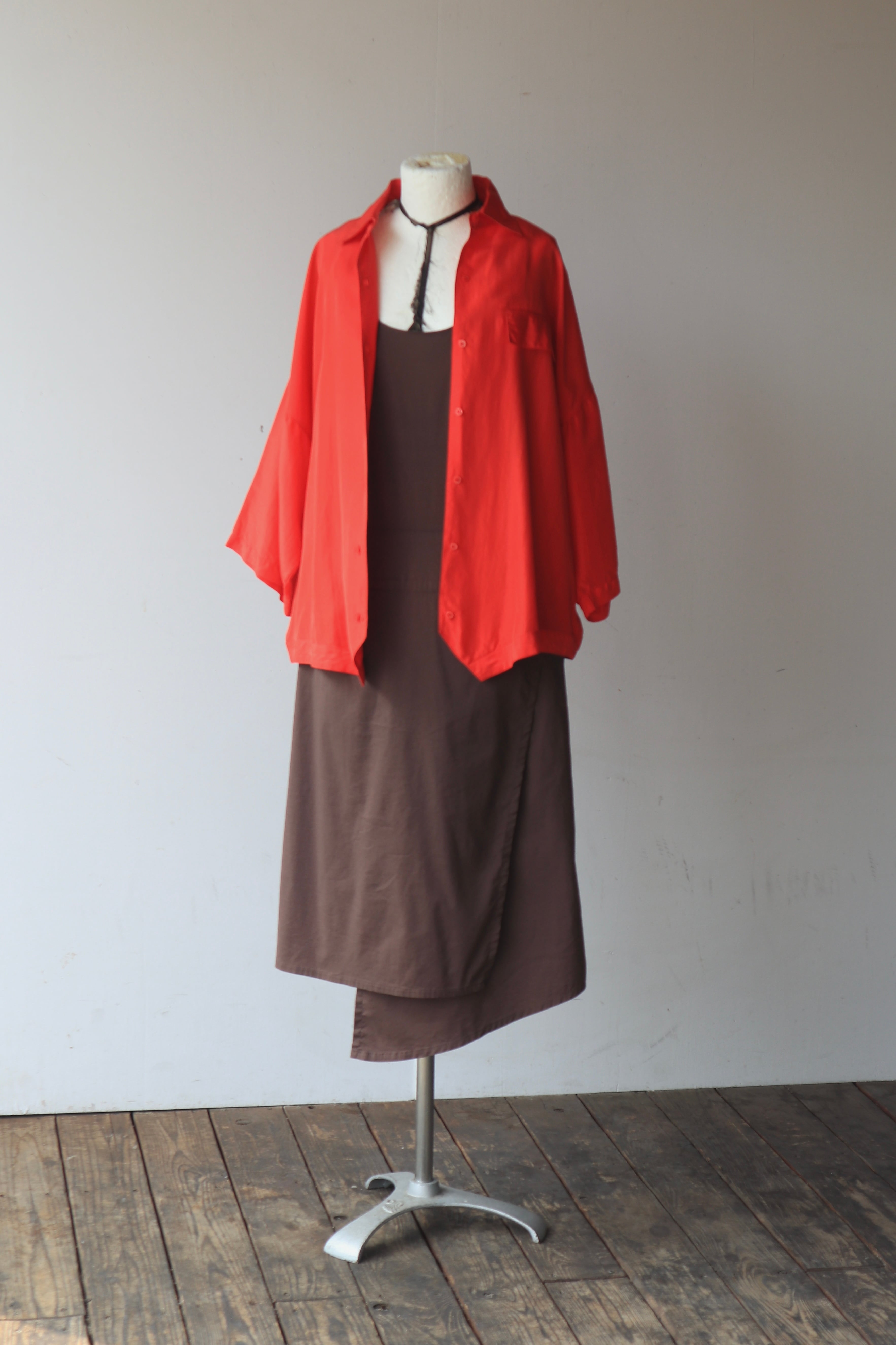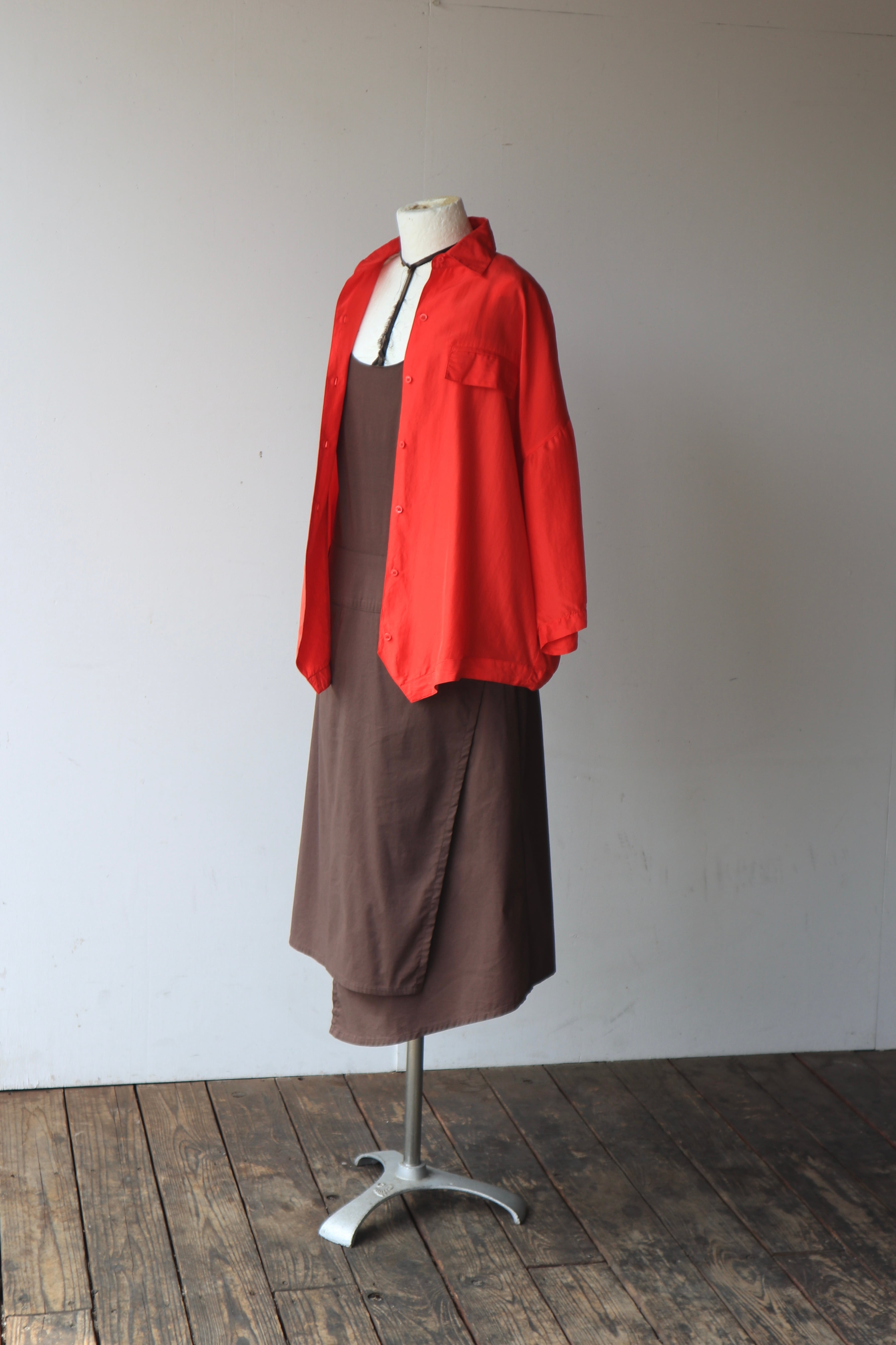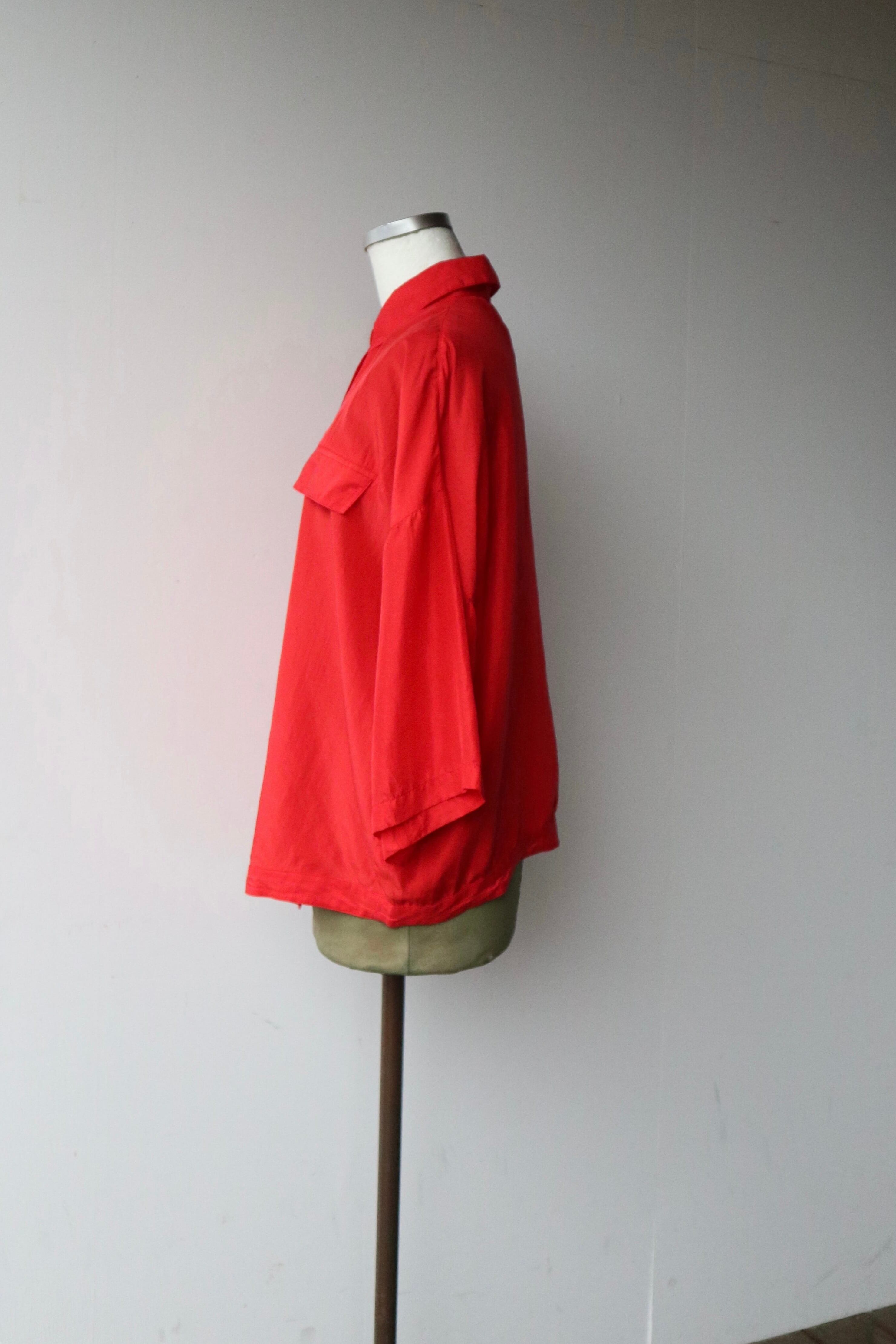 シルクのほどよい光沢感とビビットなレッドカラーがコーディネートの主役になるシルクシャツ
