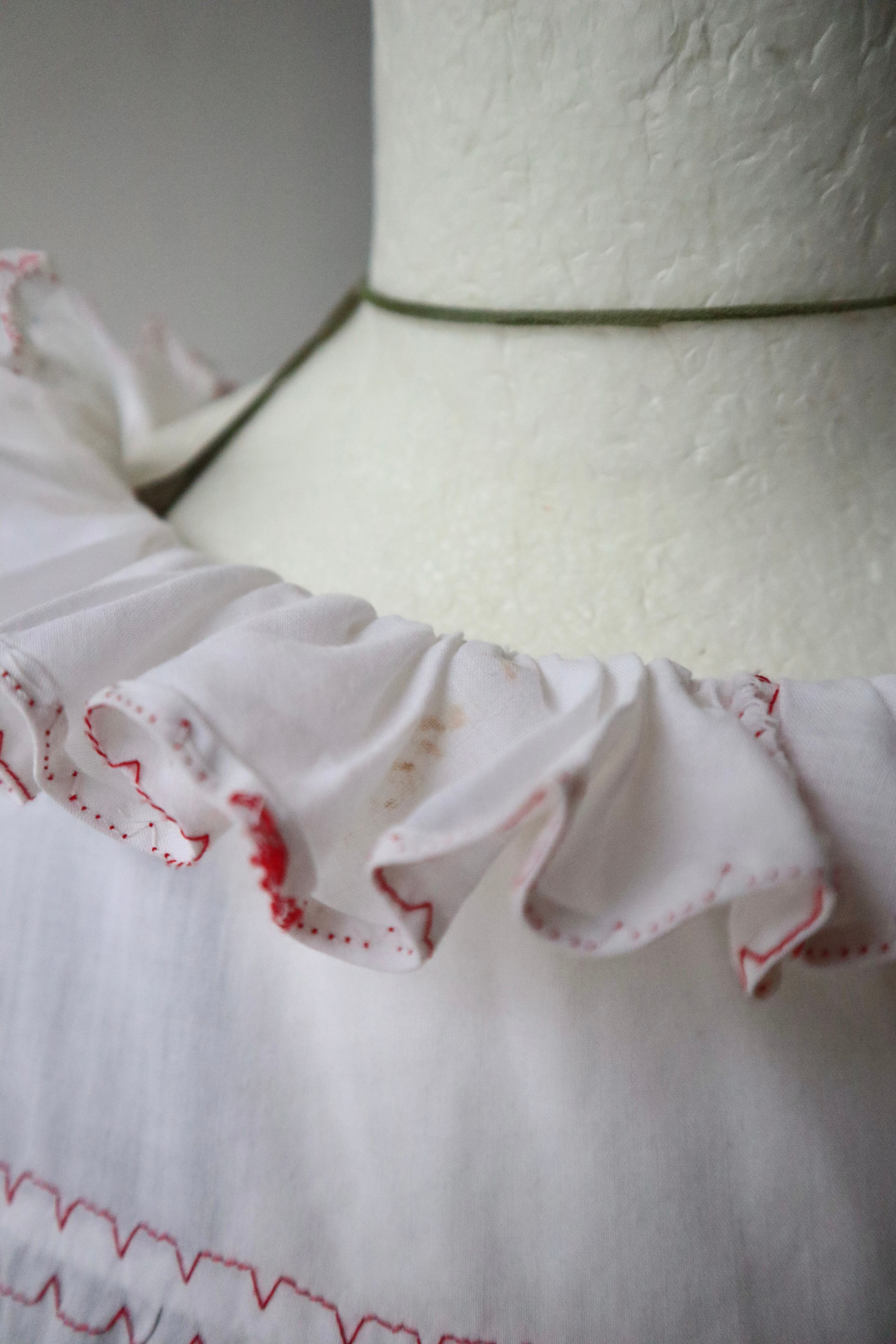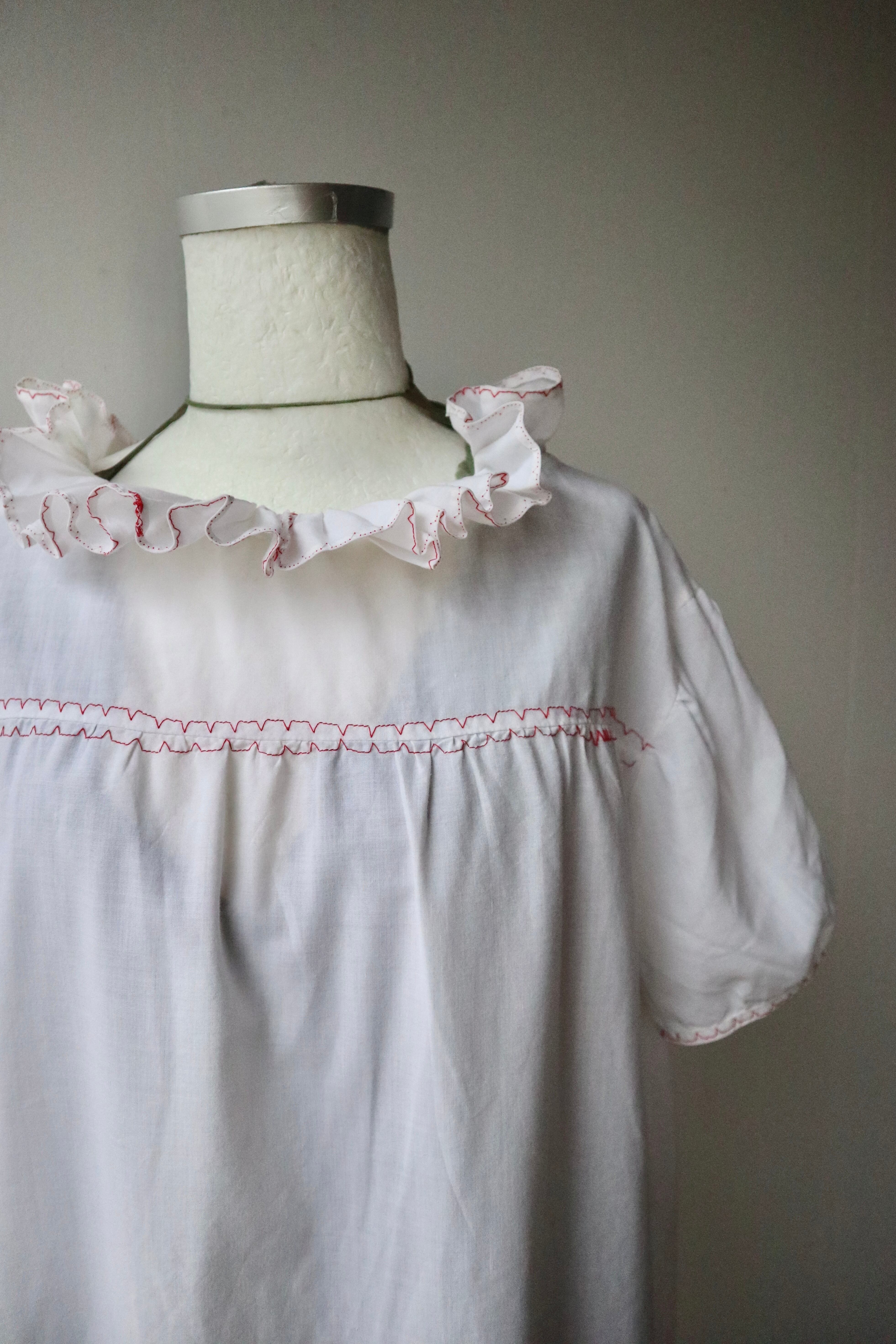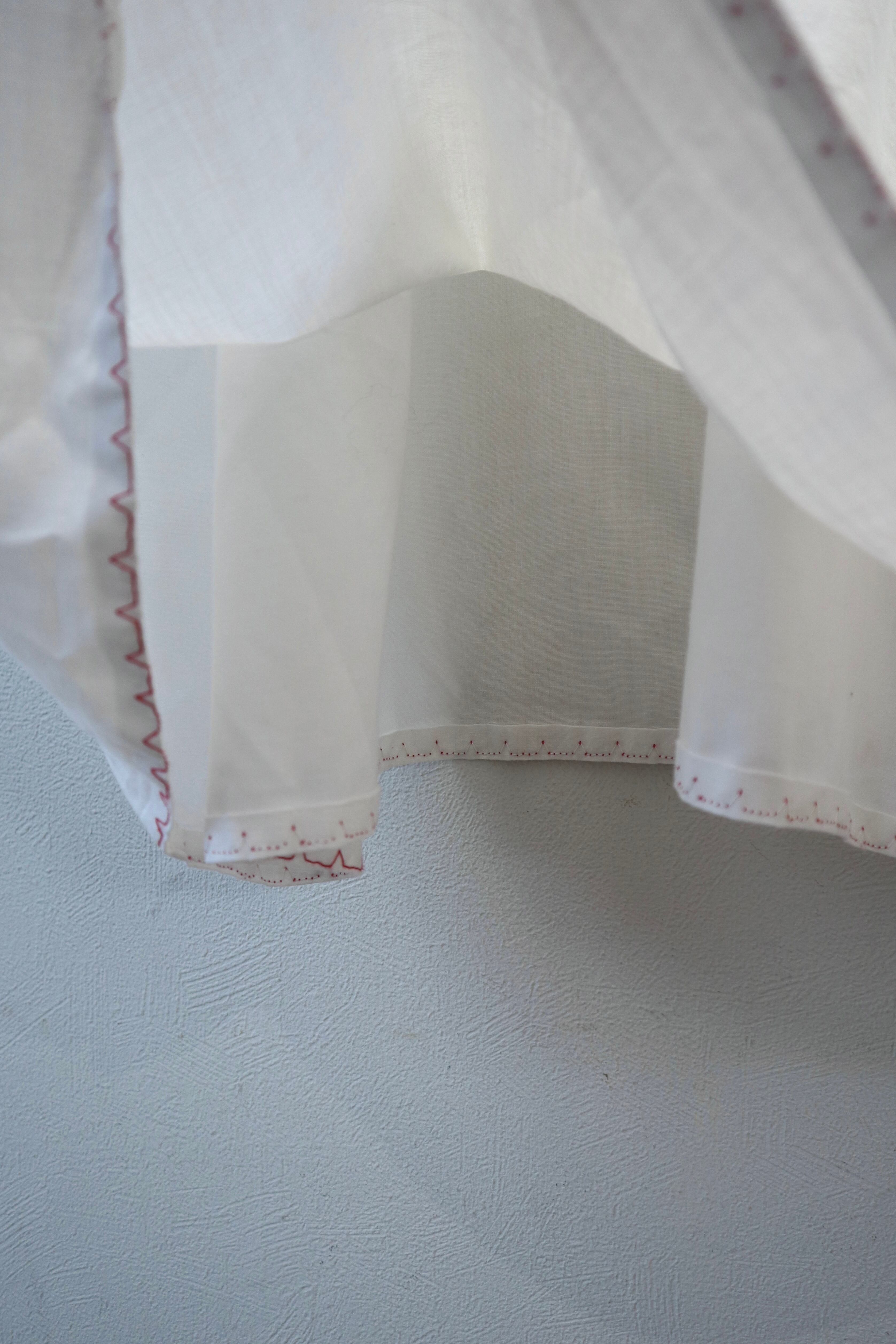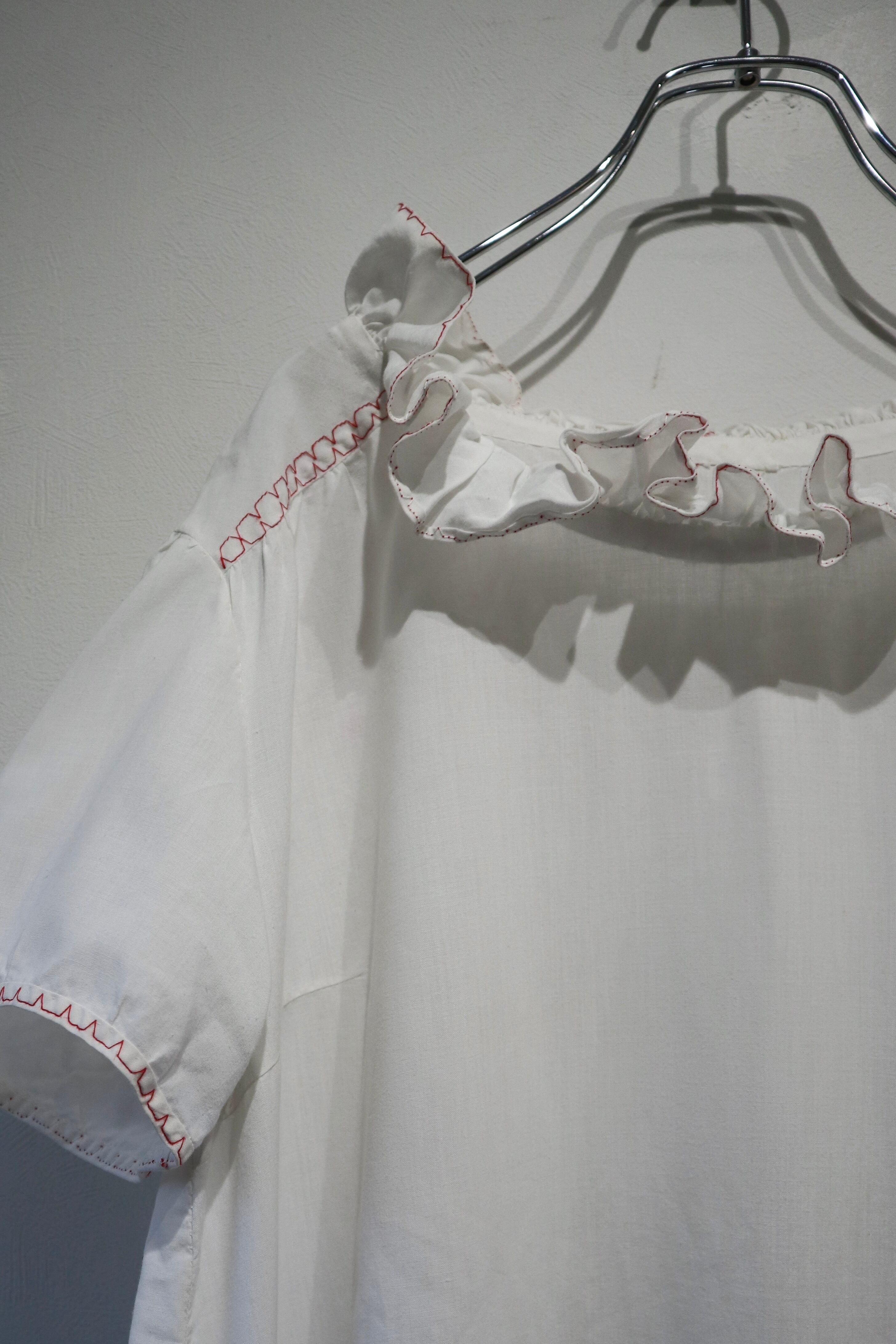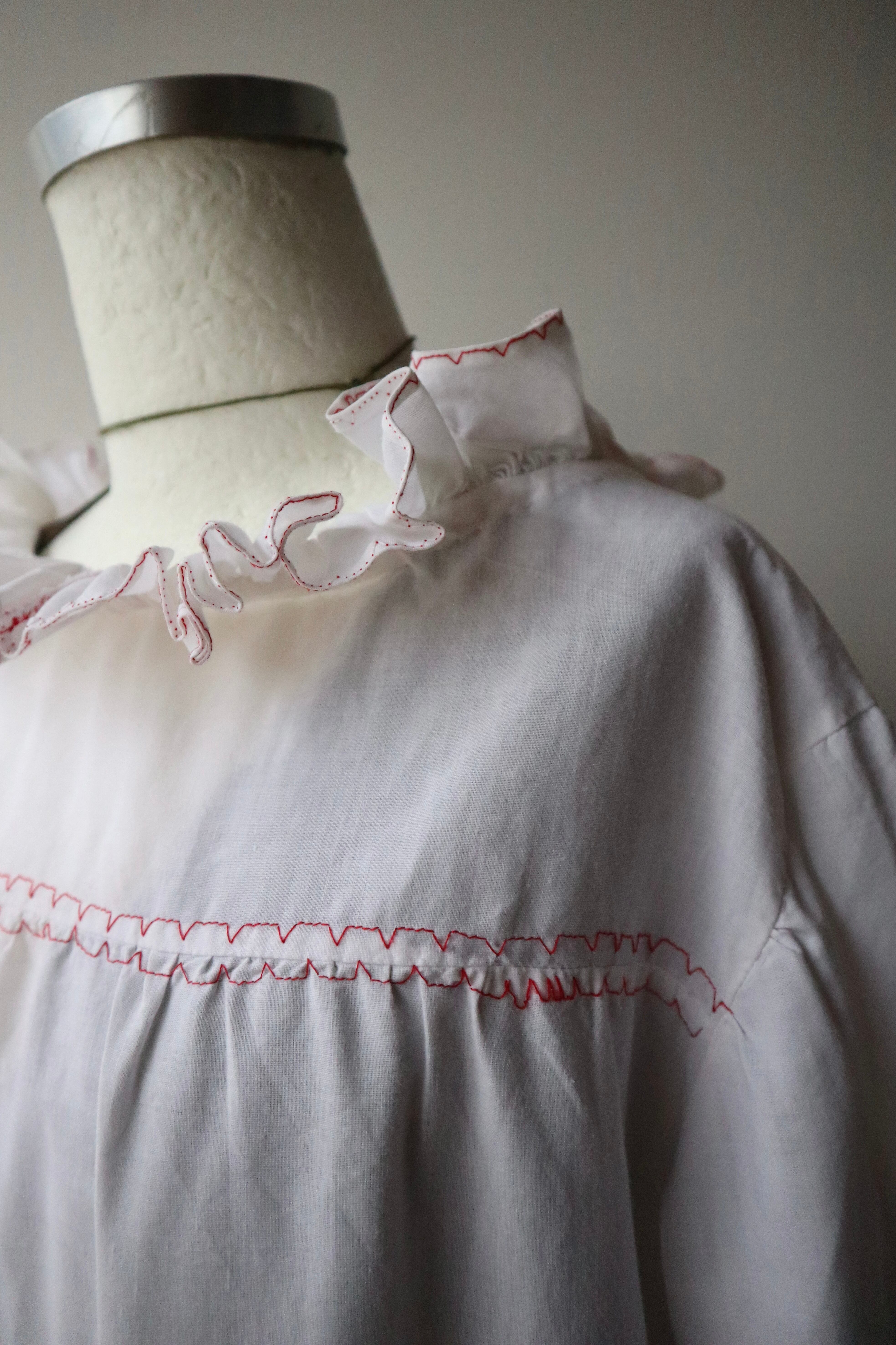 ギャザーからゆったり広がるシルエットとフリルの襟が可愛らしく