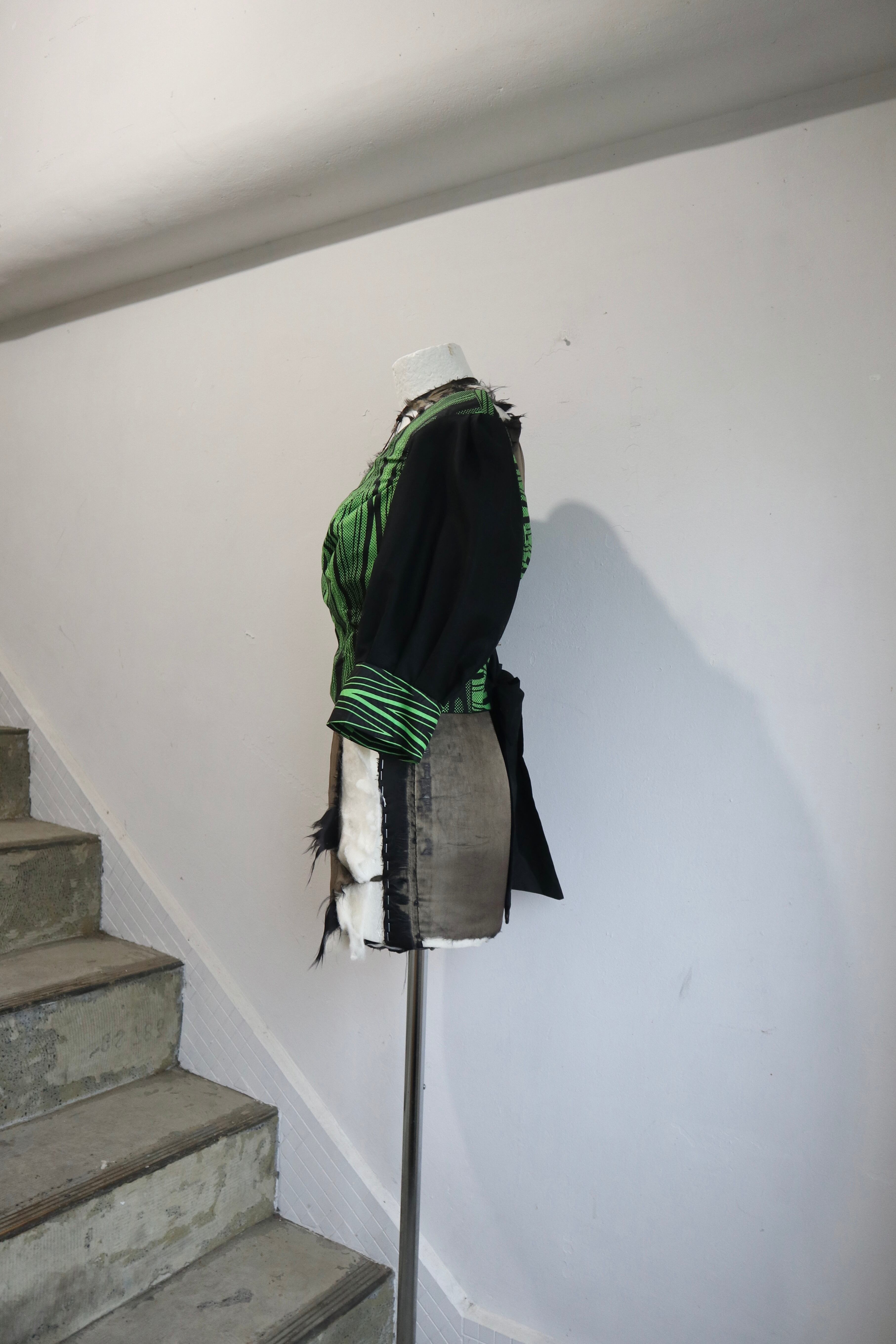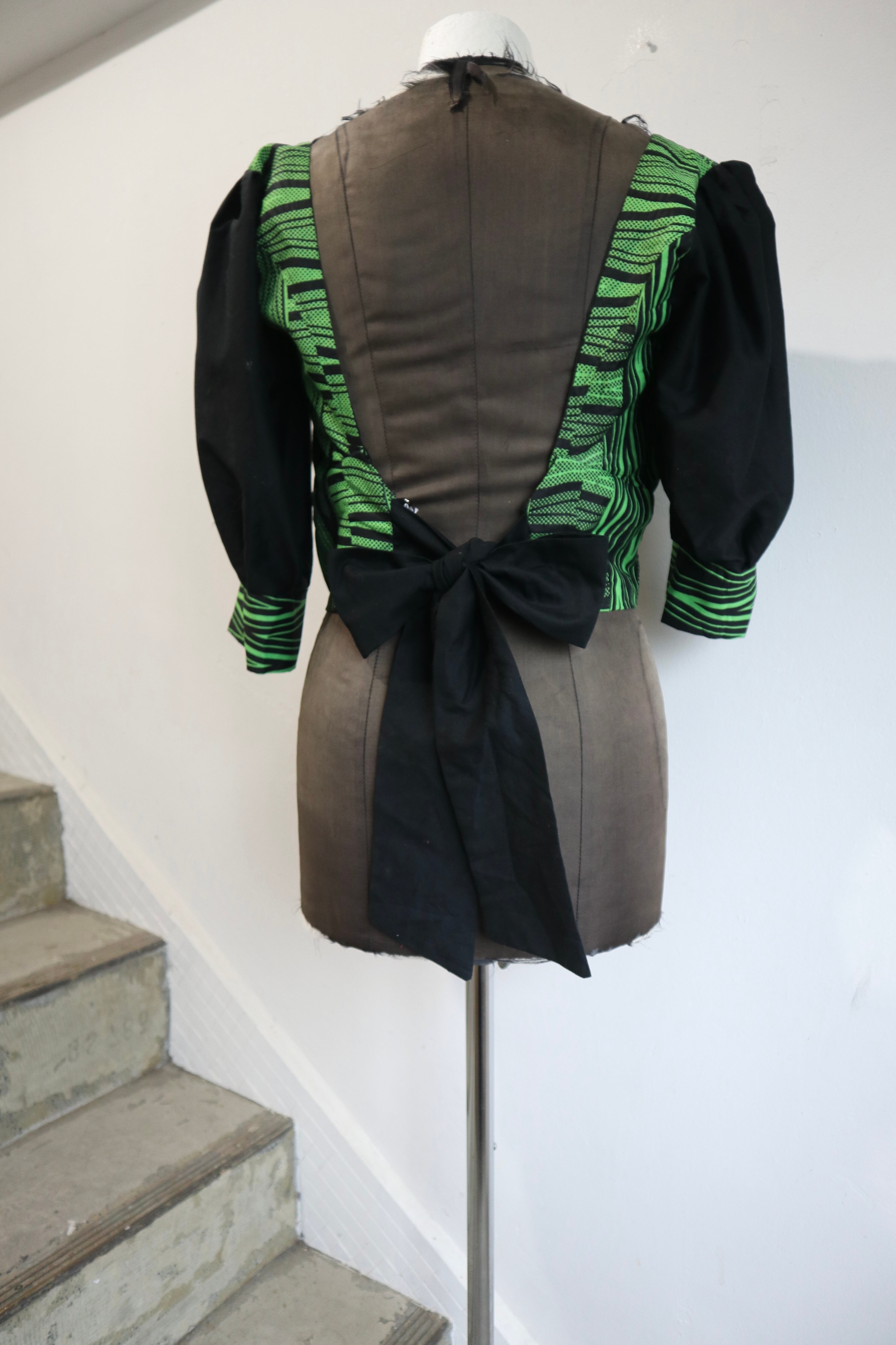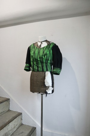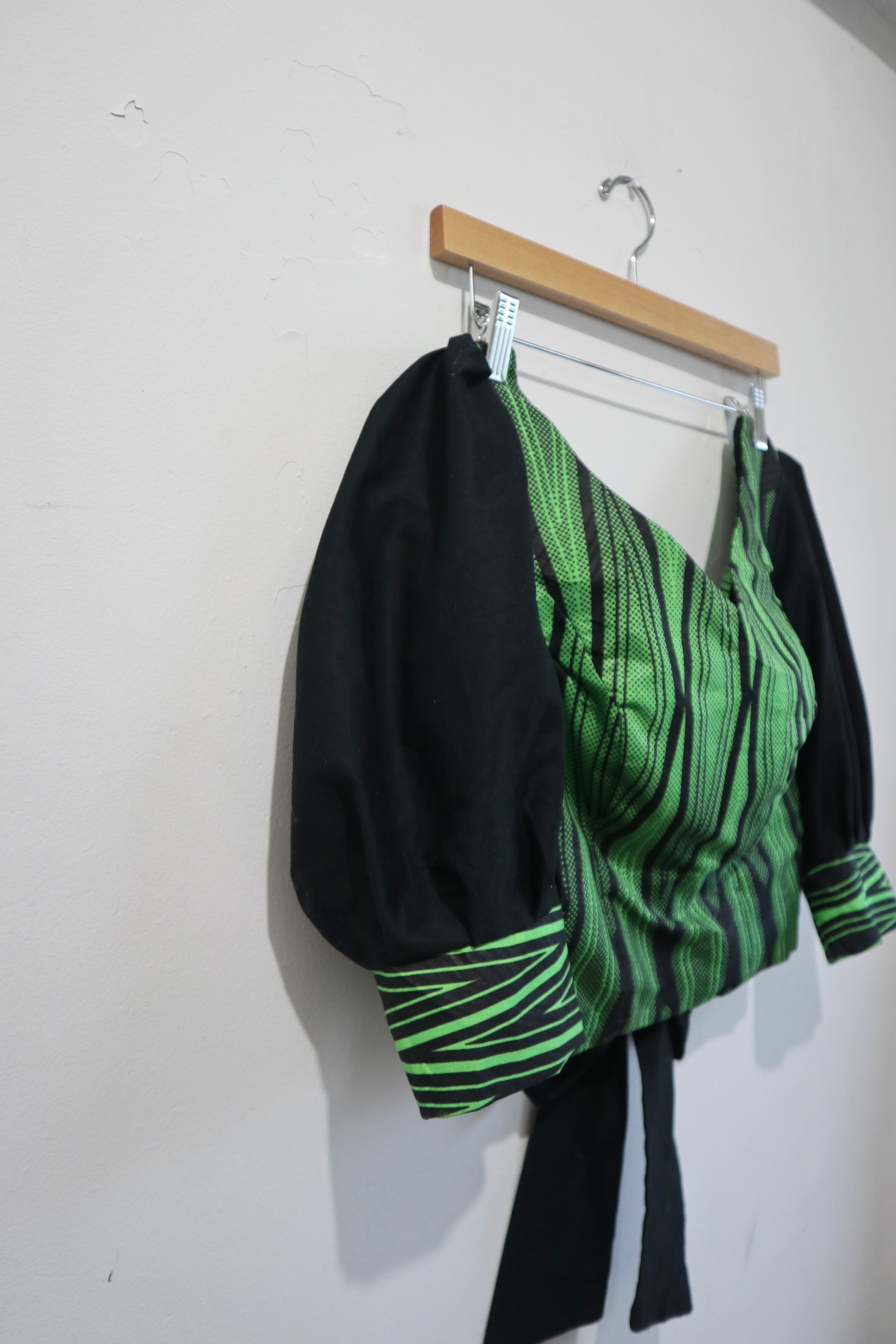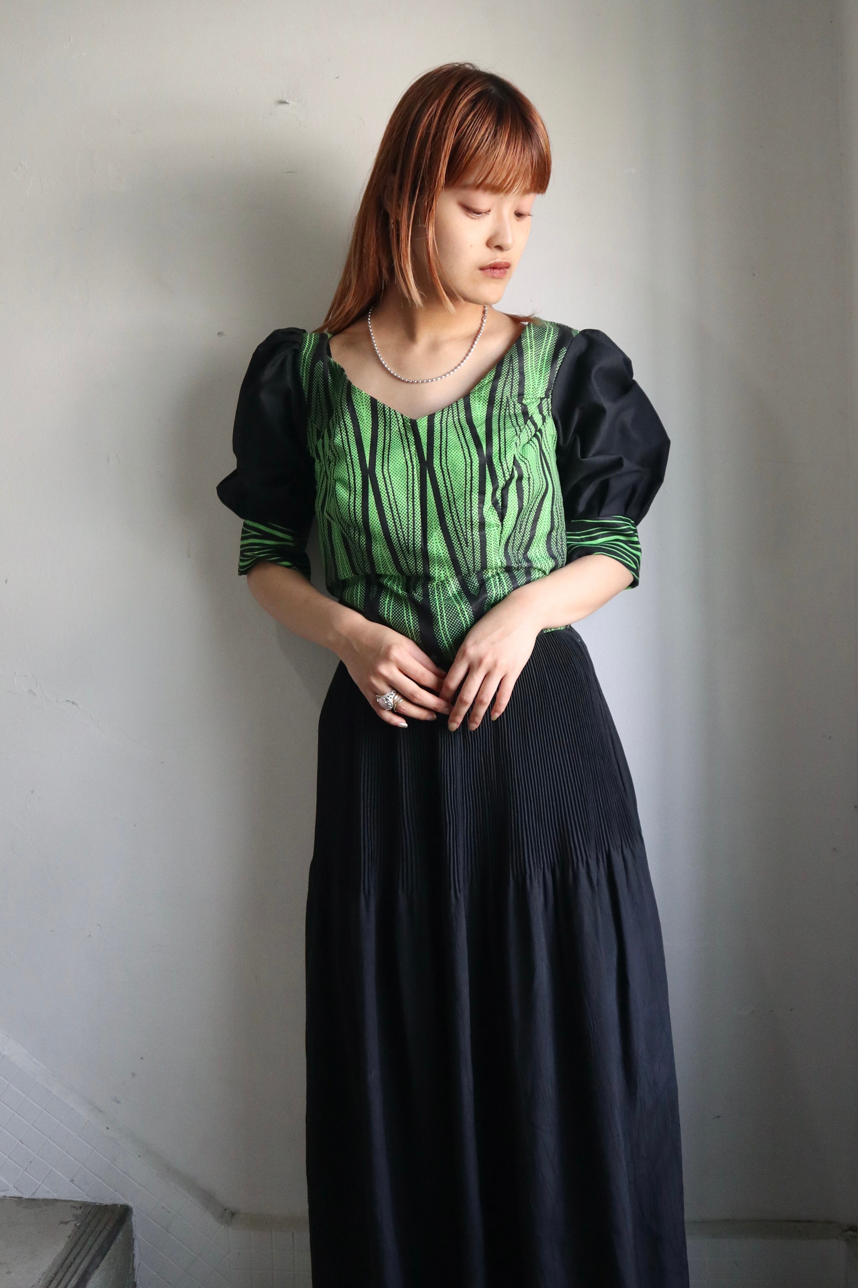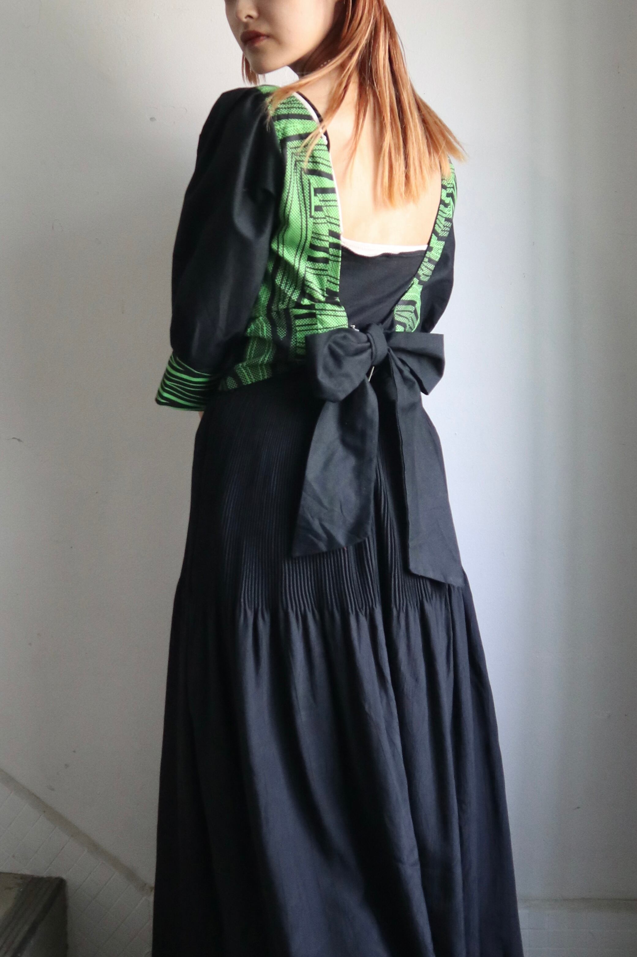 ゆったりとした肩幅にボリュームのあるパフスリーブと、大胆な背中開きのデザインが上品