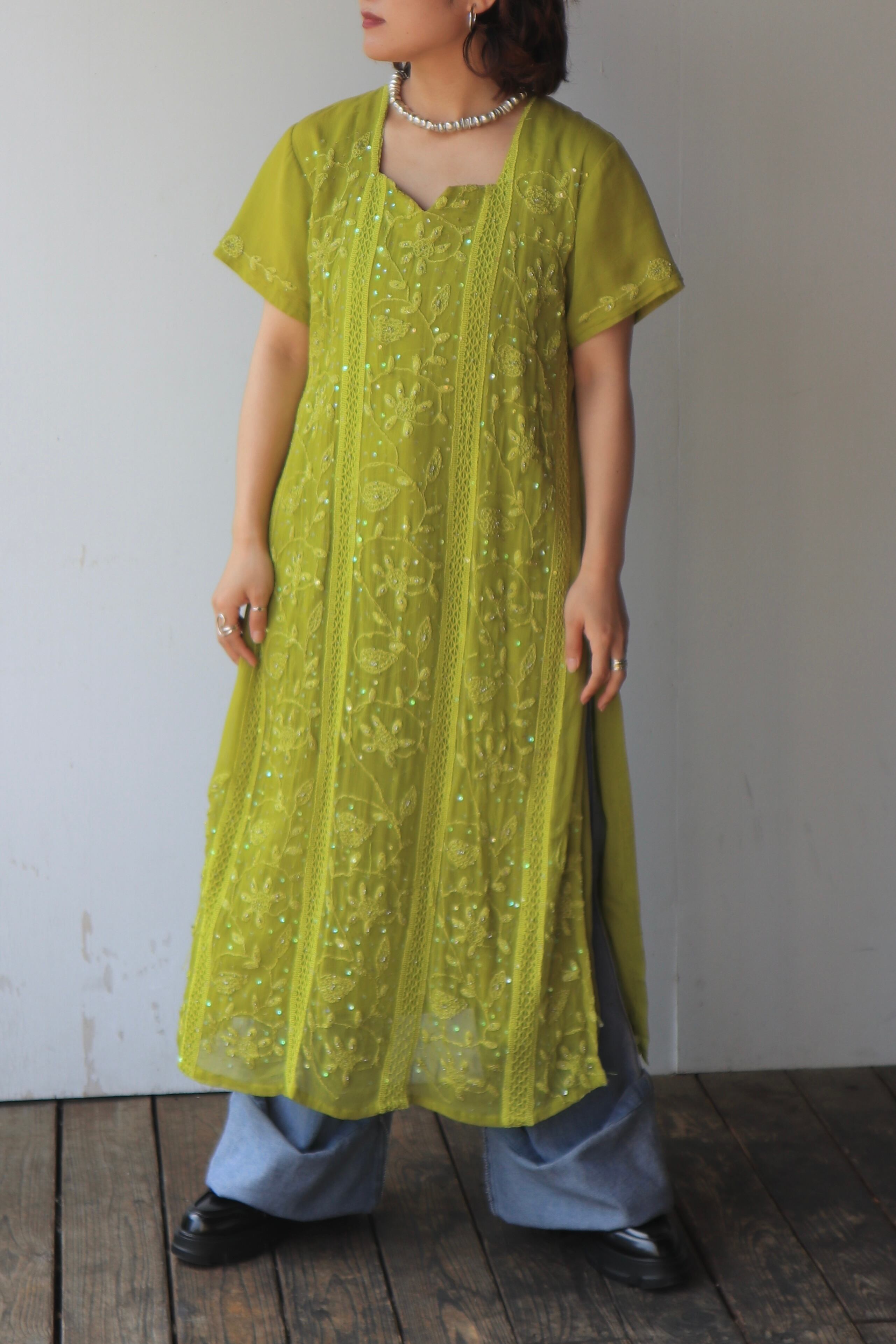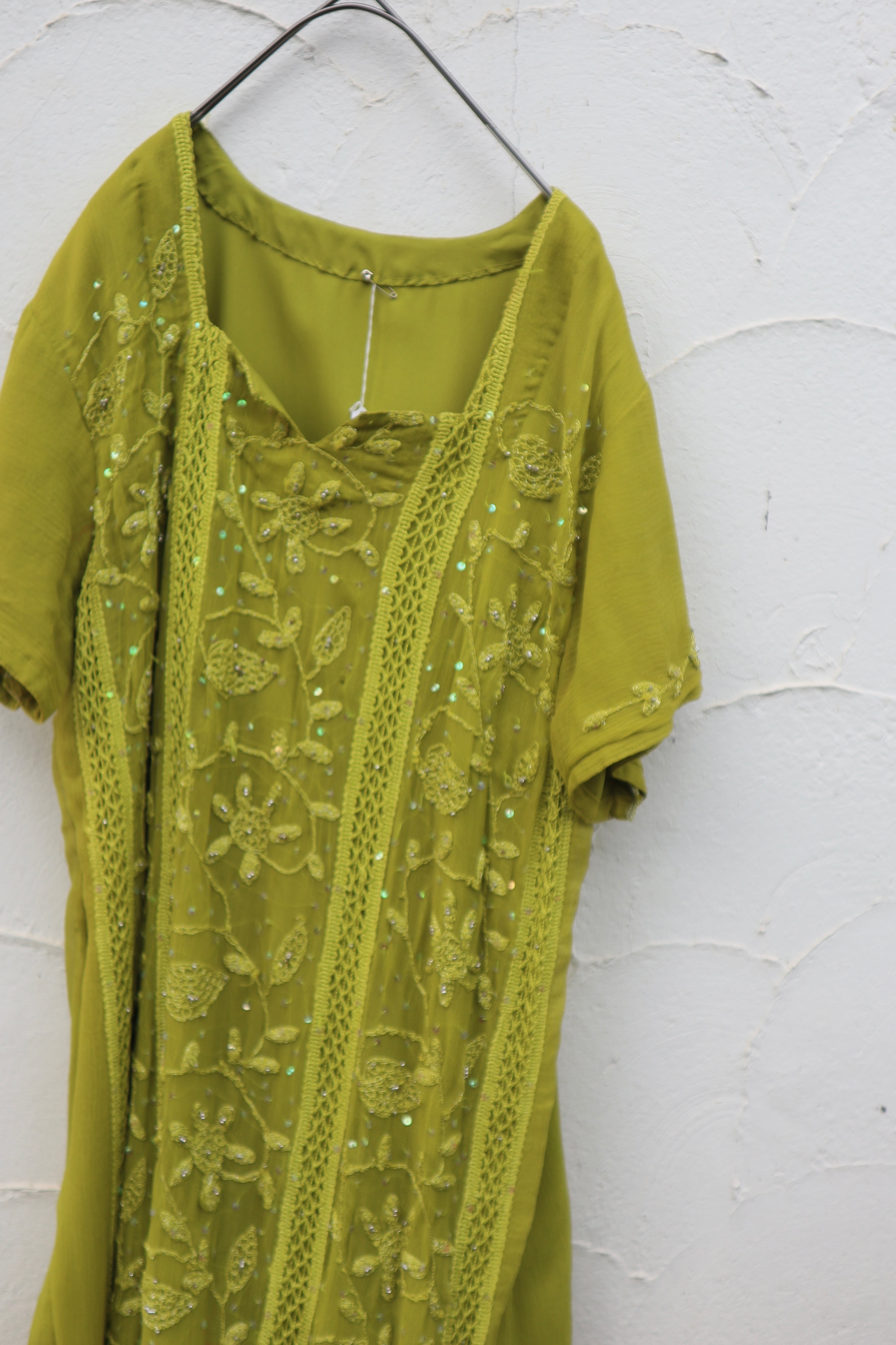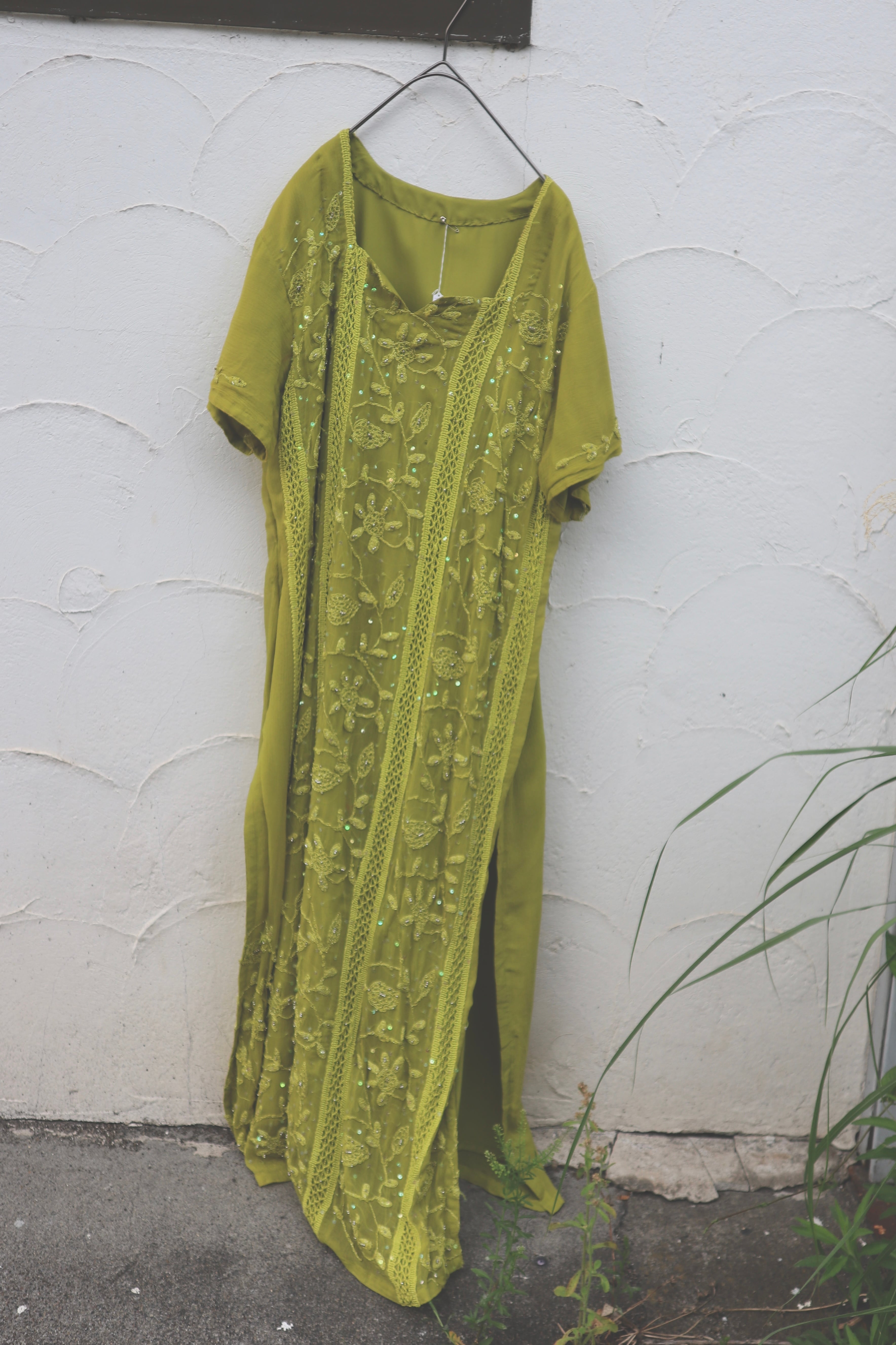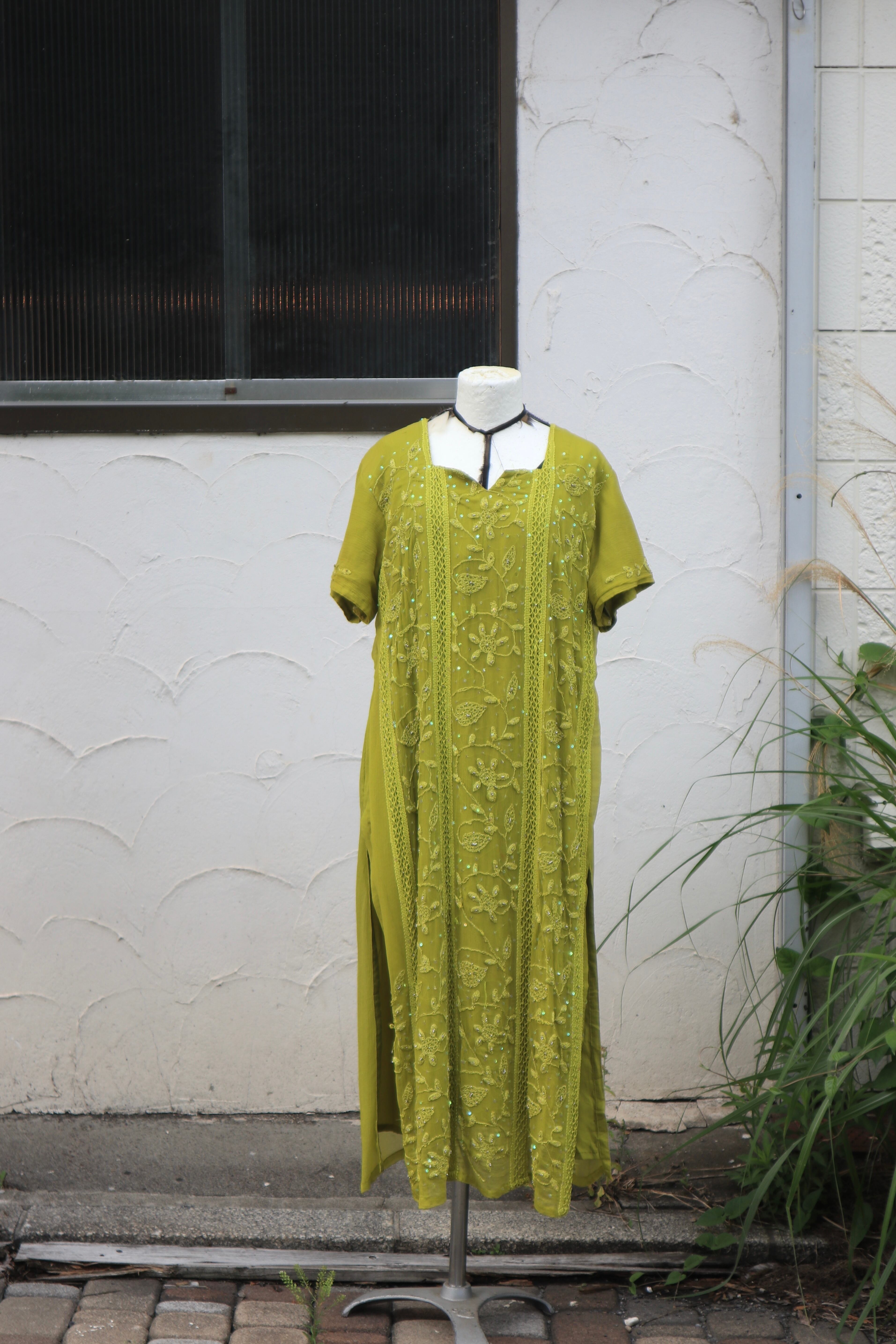 スパンコールやビーズ、ラメの入った糸で刺繍が施された黄緑色のワンピース