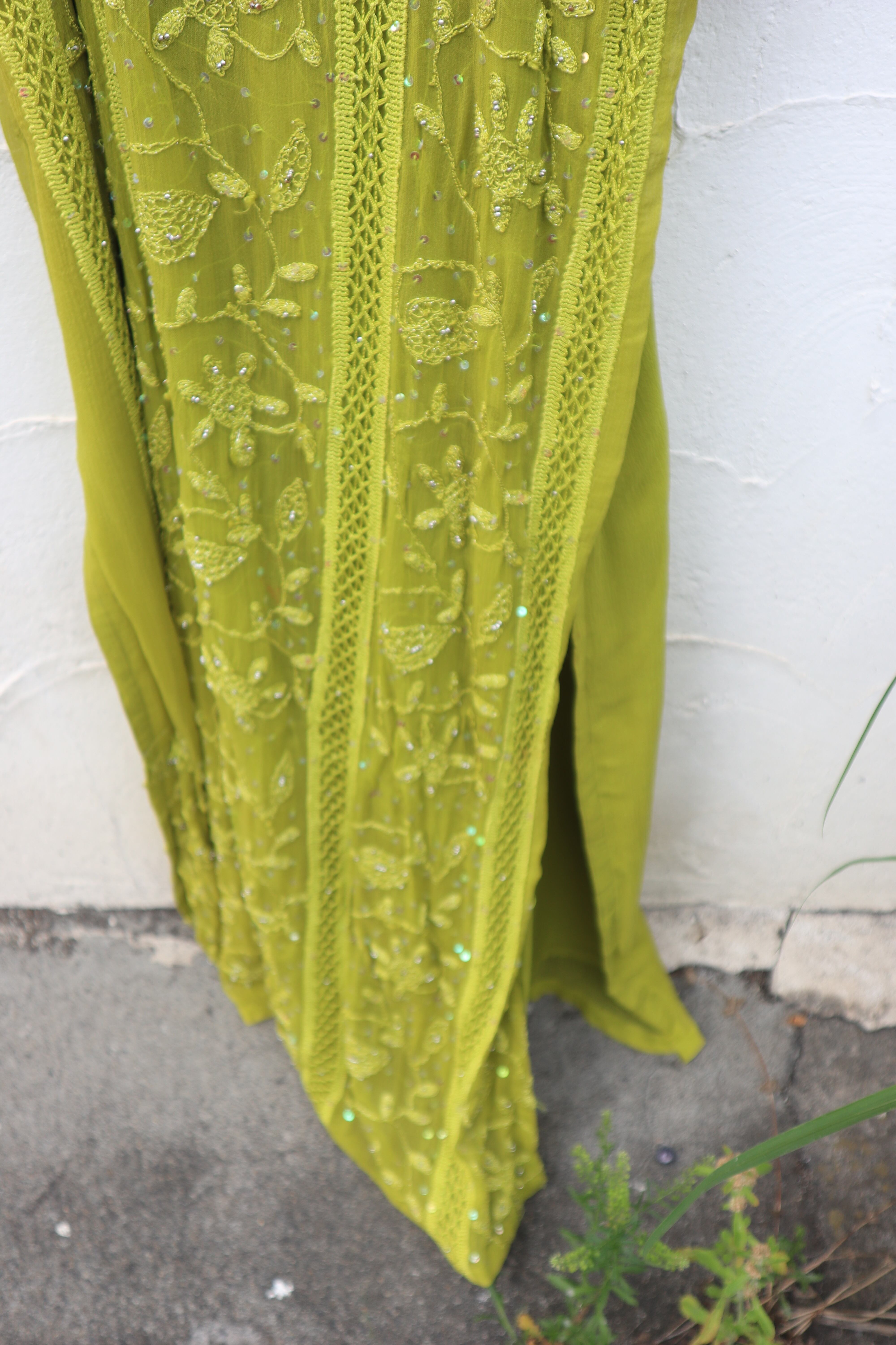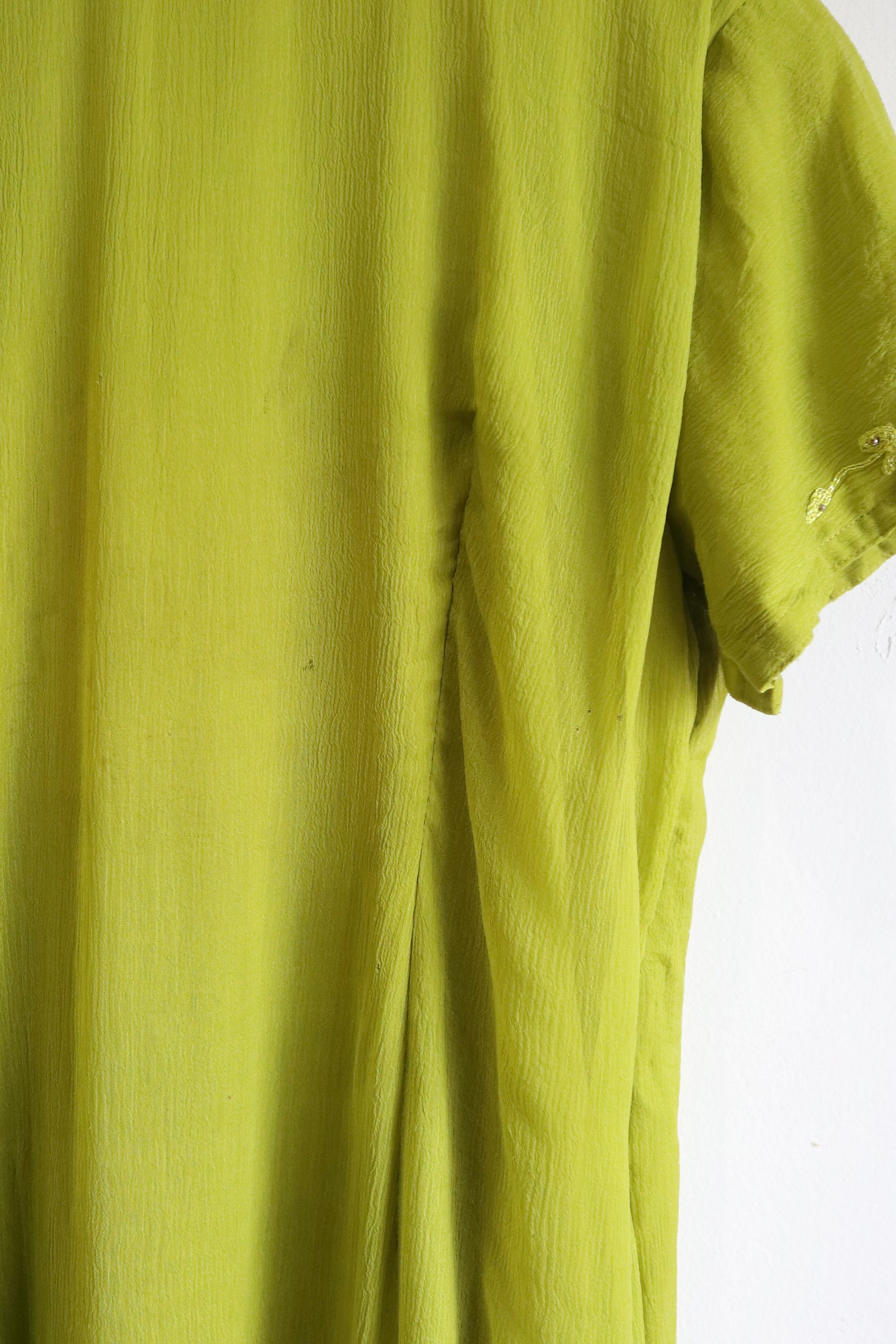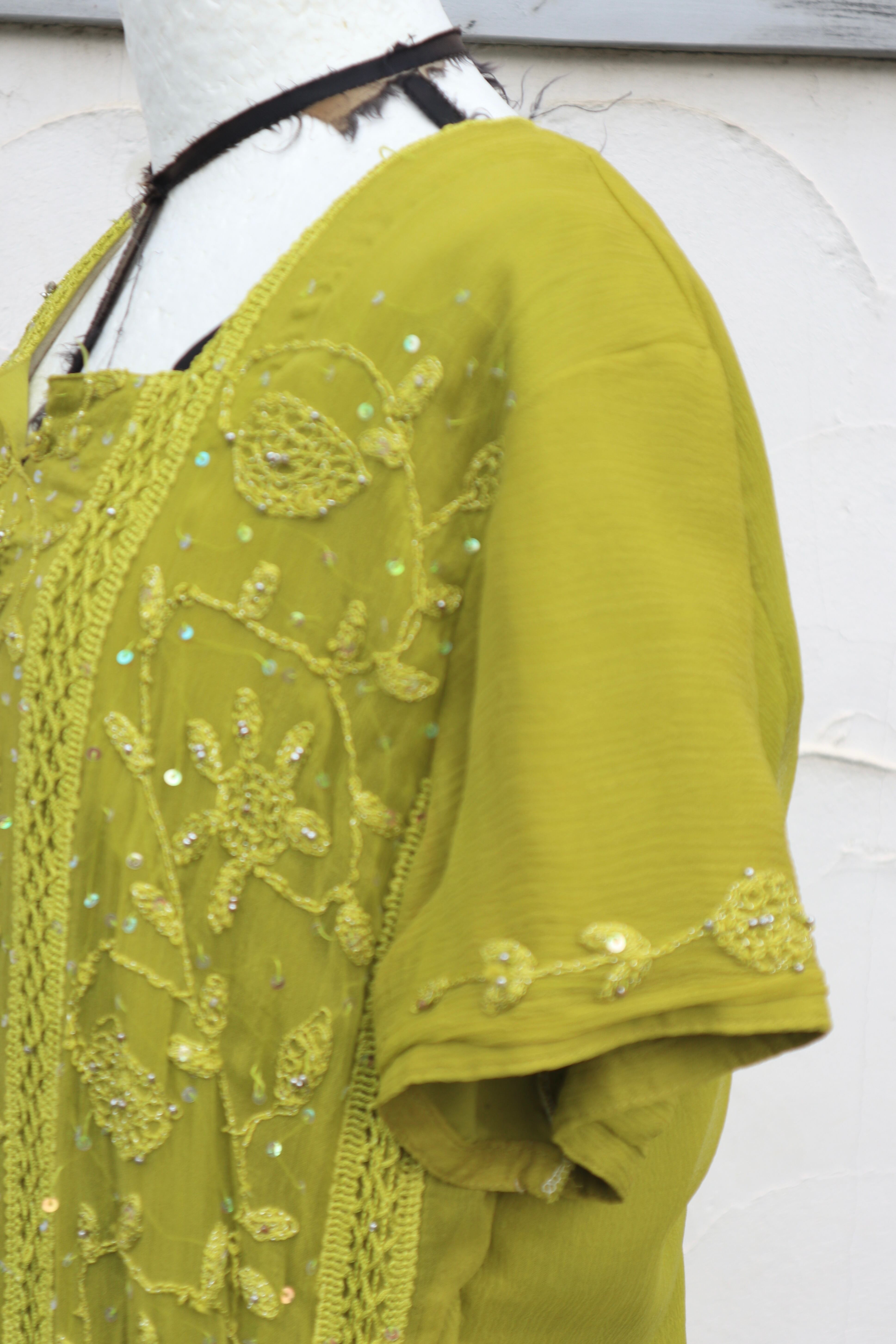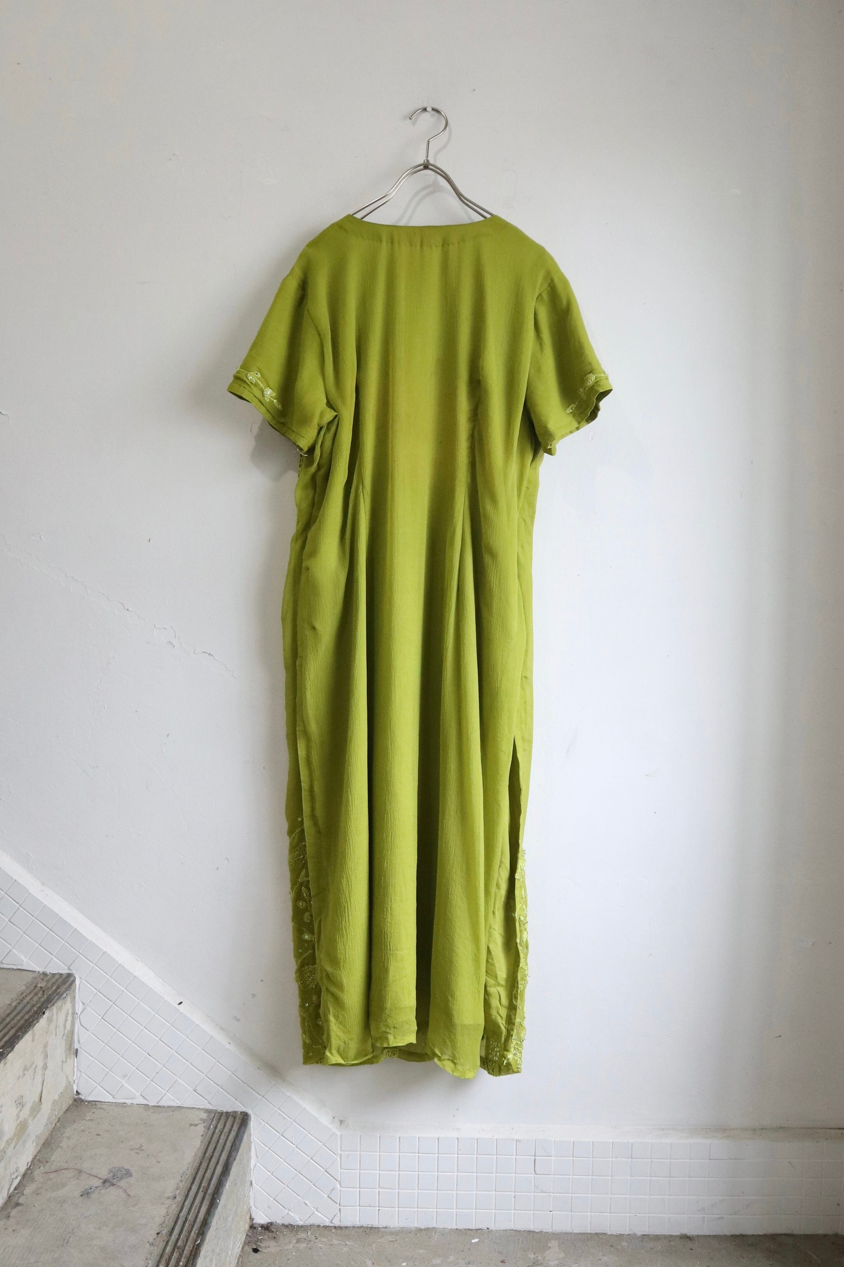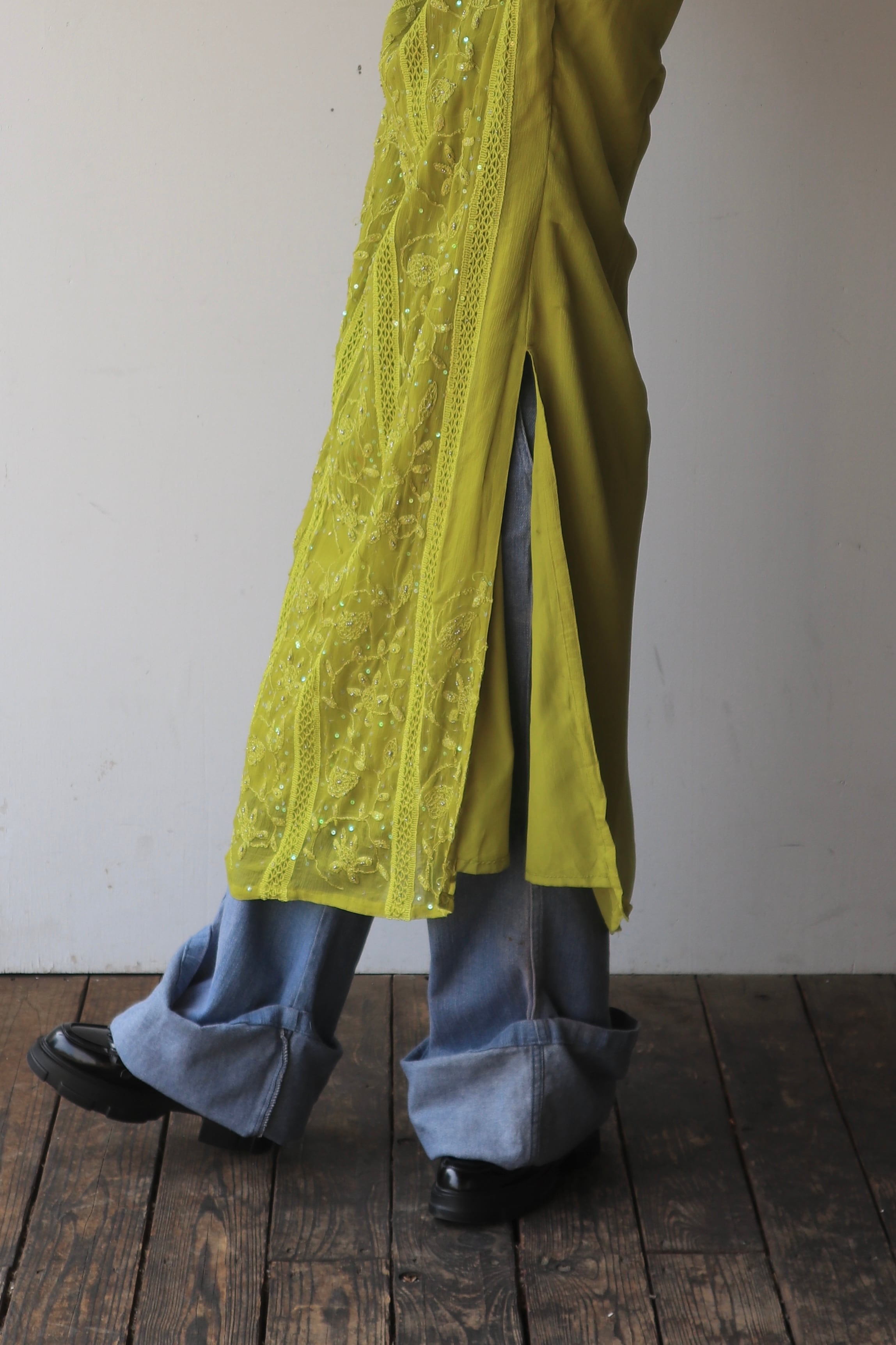 スパンコールやビーズ、ラメの入った糸で刺繍が施された黄緑色のワンピース